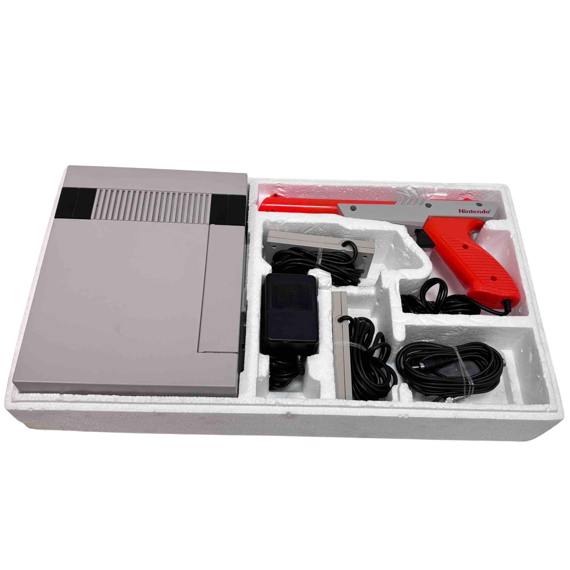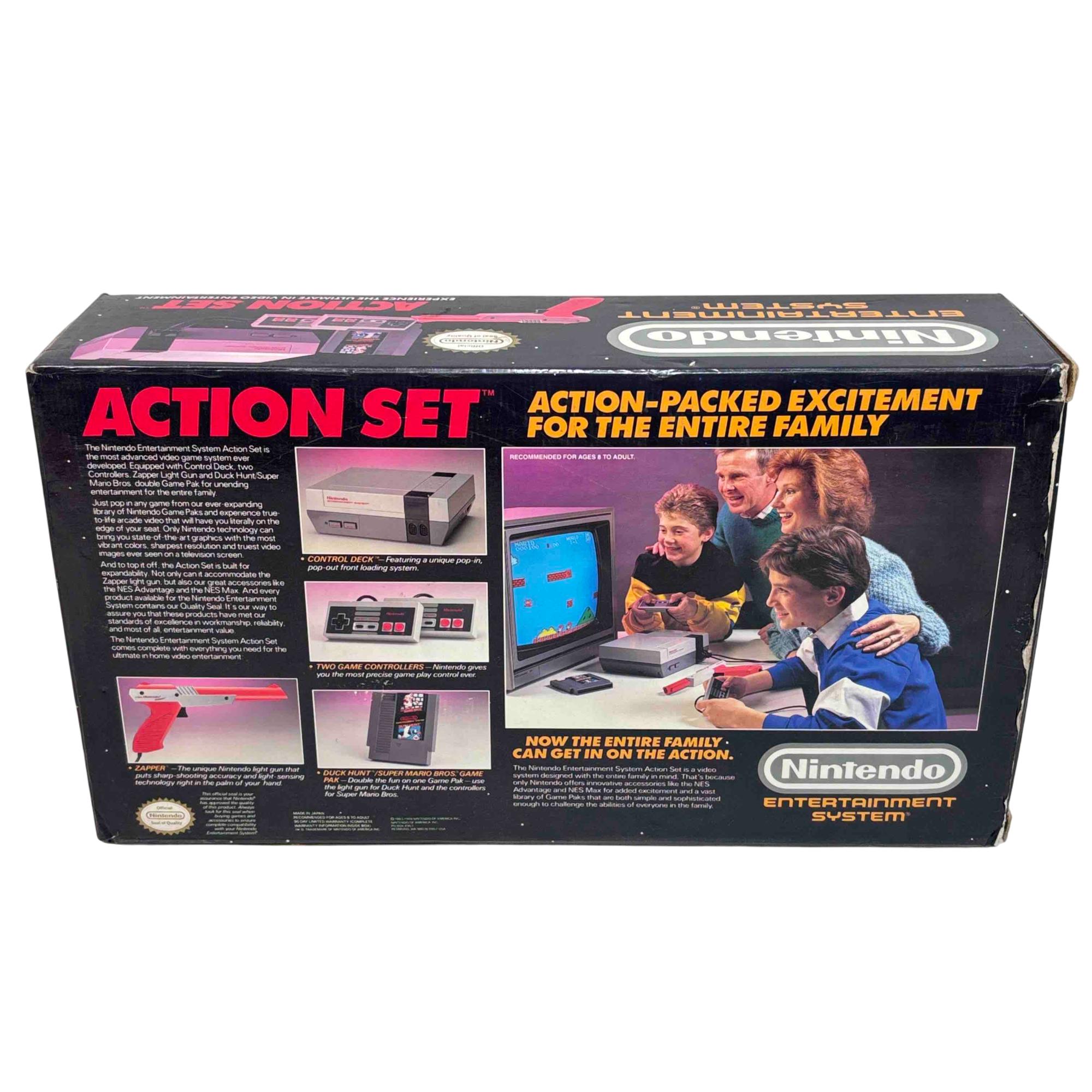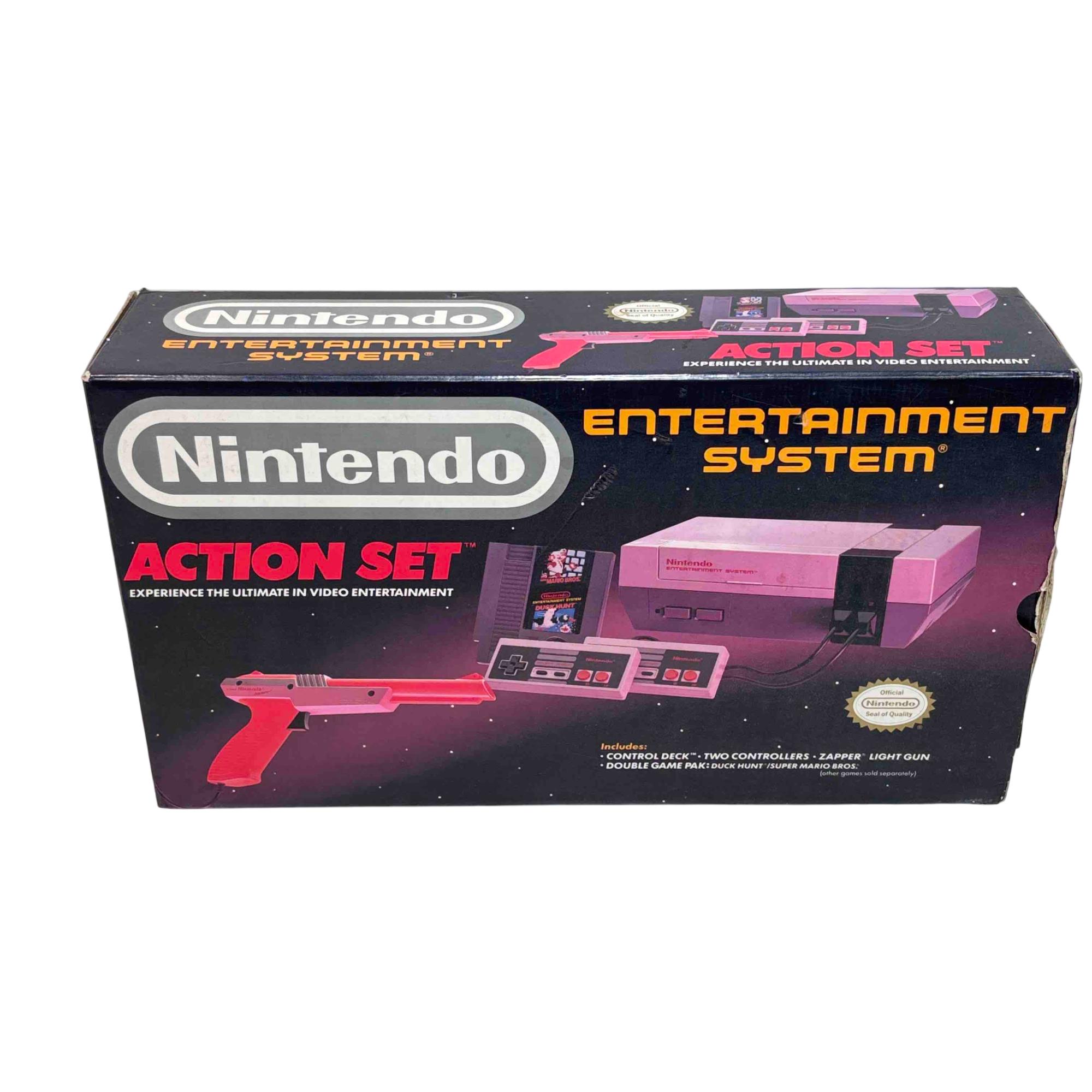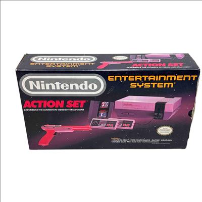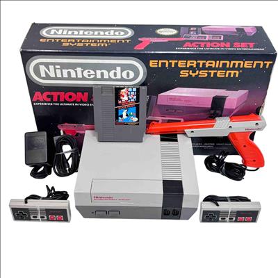 Experience classic gaming with the original Nintendo Entertainment System (NES) Action Set, complete in box. This iconic bundle includes the NES console, two controllers, the famous Zapper light gun, and the Super Mario Bros./Duck Hunt game cartridge. Perfect for collectors and retro gaming enthusiasts, this set brings the golden age of video games right to your living room.