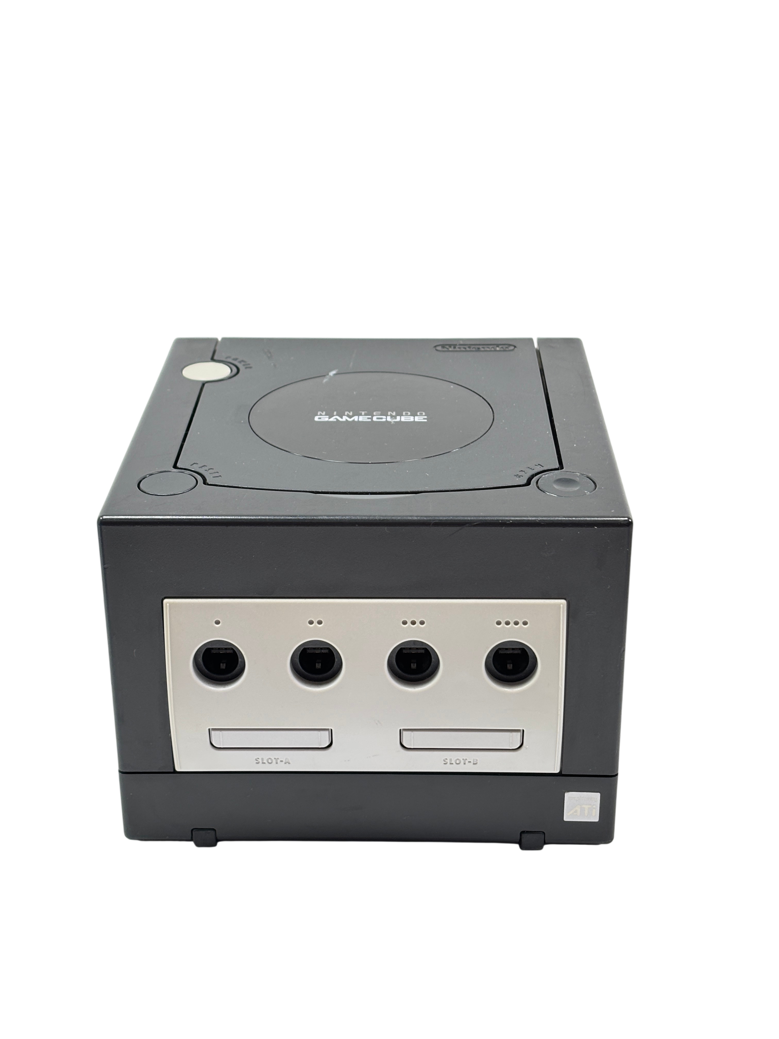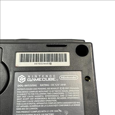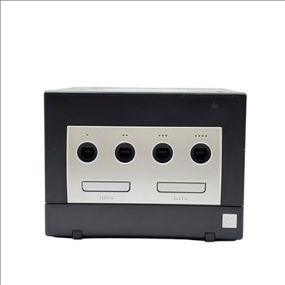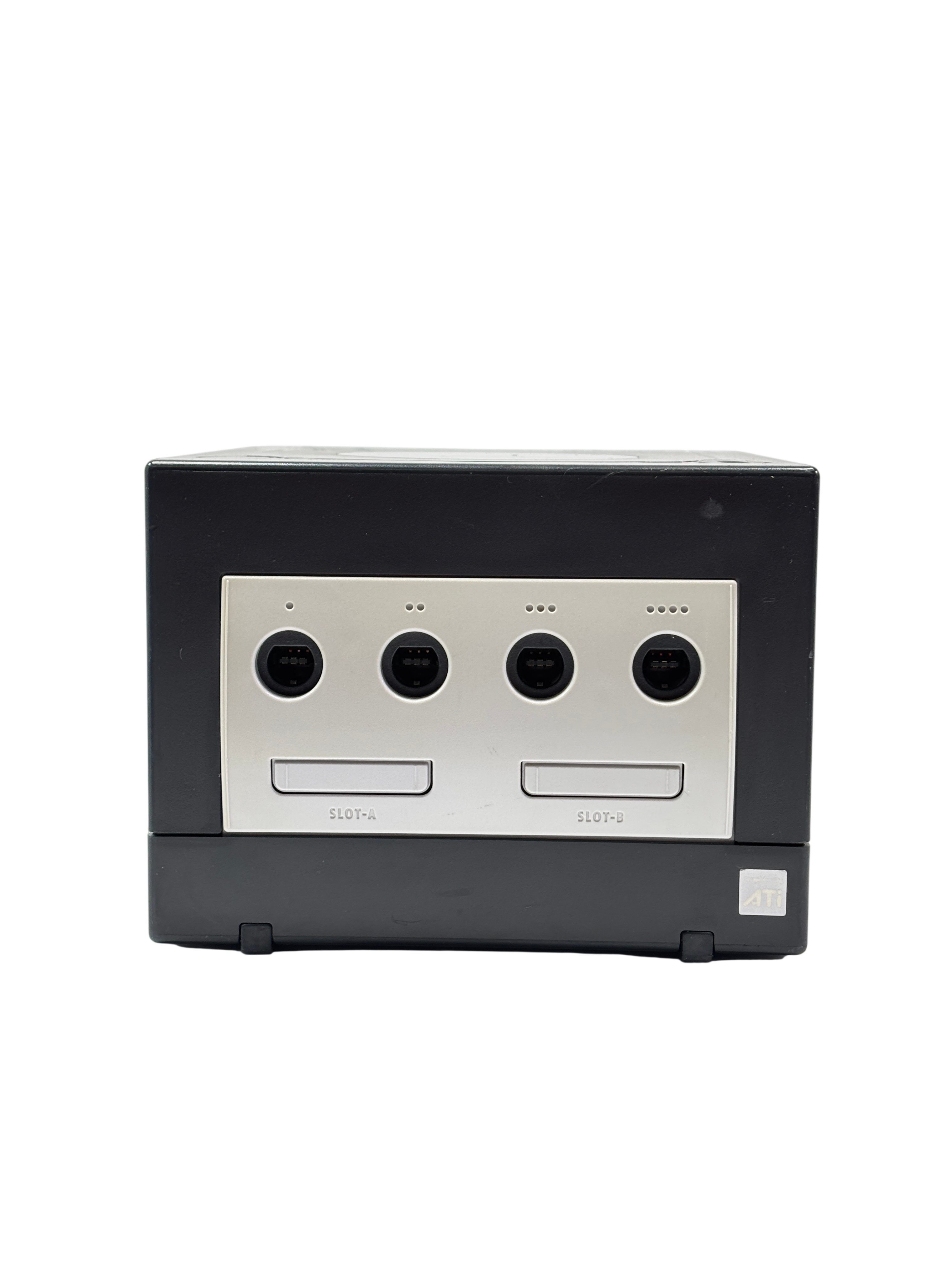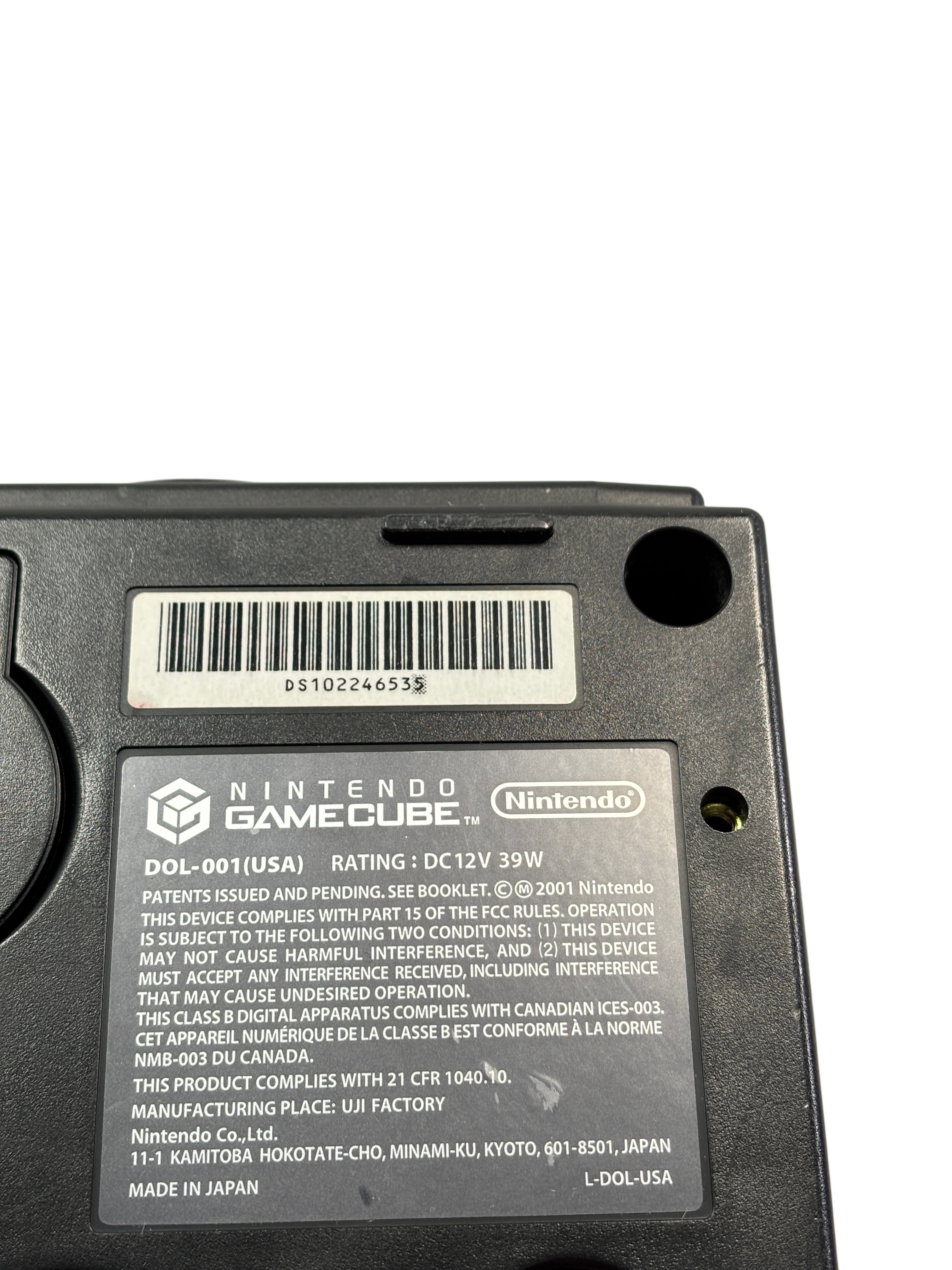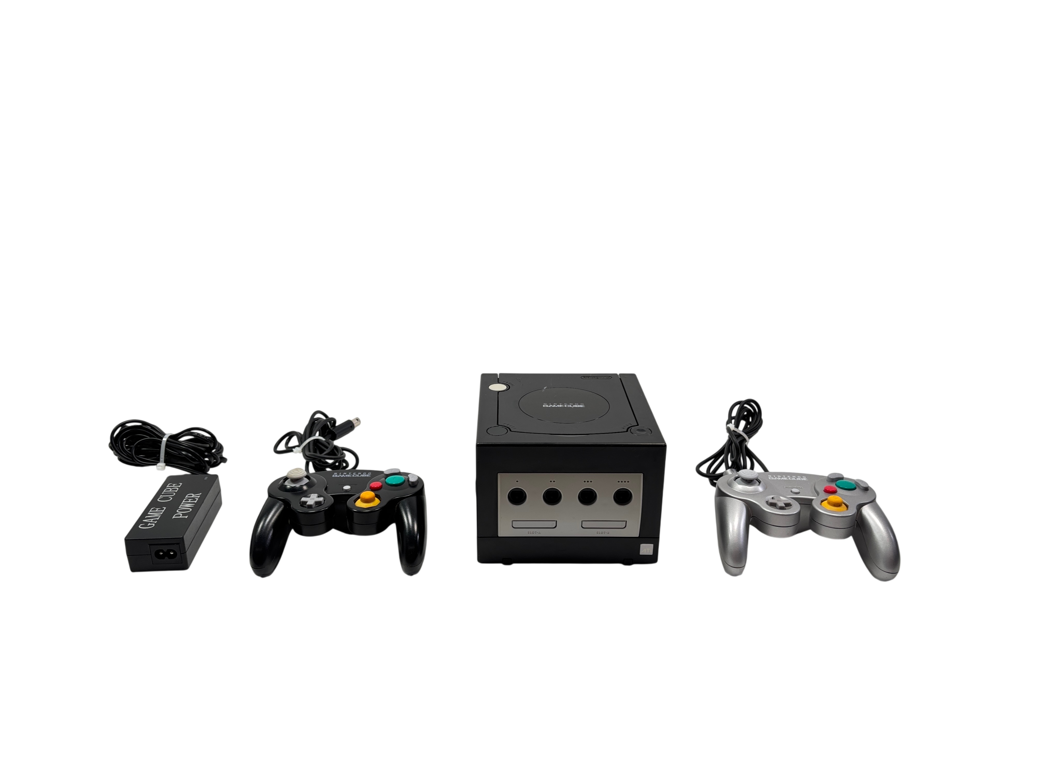 Nintendo DOL-001 Original GameCube Console comes complete with two wired controllers in black and silver, along with the necessary power adapter. Ideal for retro gaming enthusiasts, this set provides everything needed to enjoy a wide library of GameCube titles. The console is made in Japan and represents the original USA model, perfect for collectors and gamers alike.