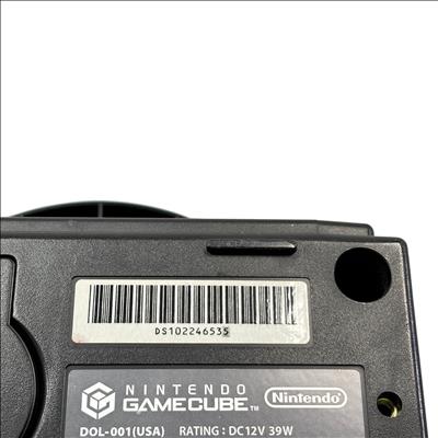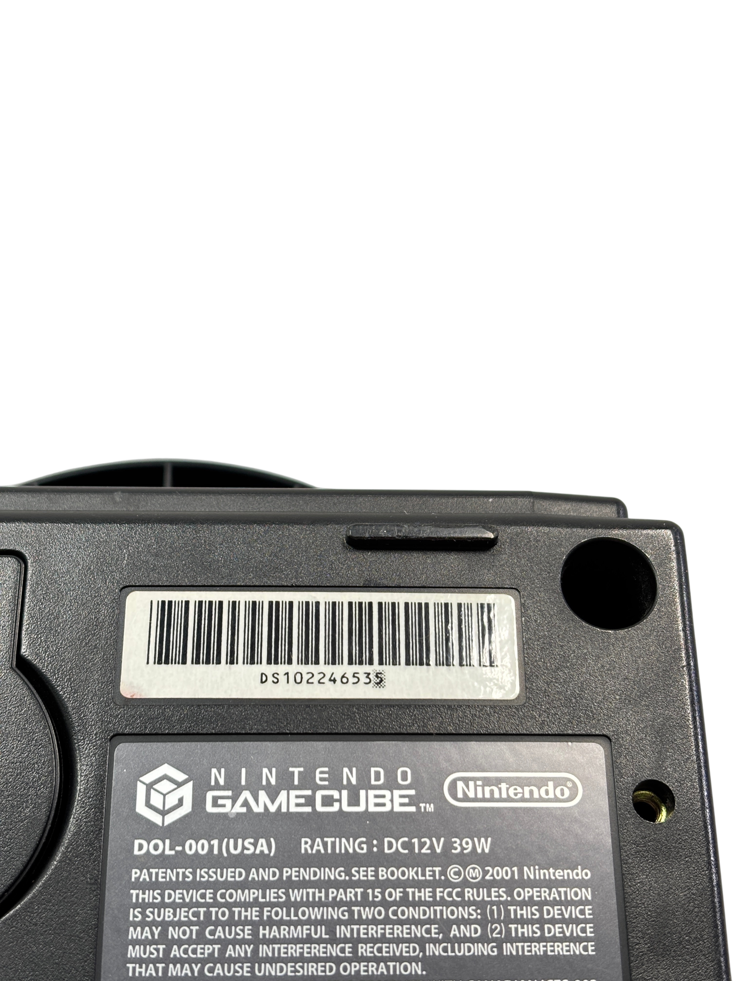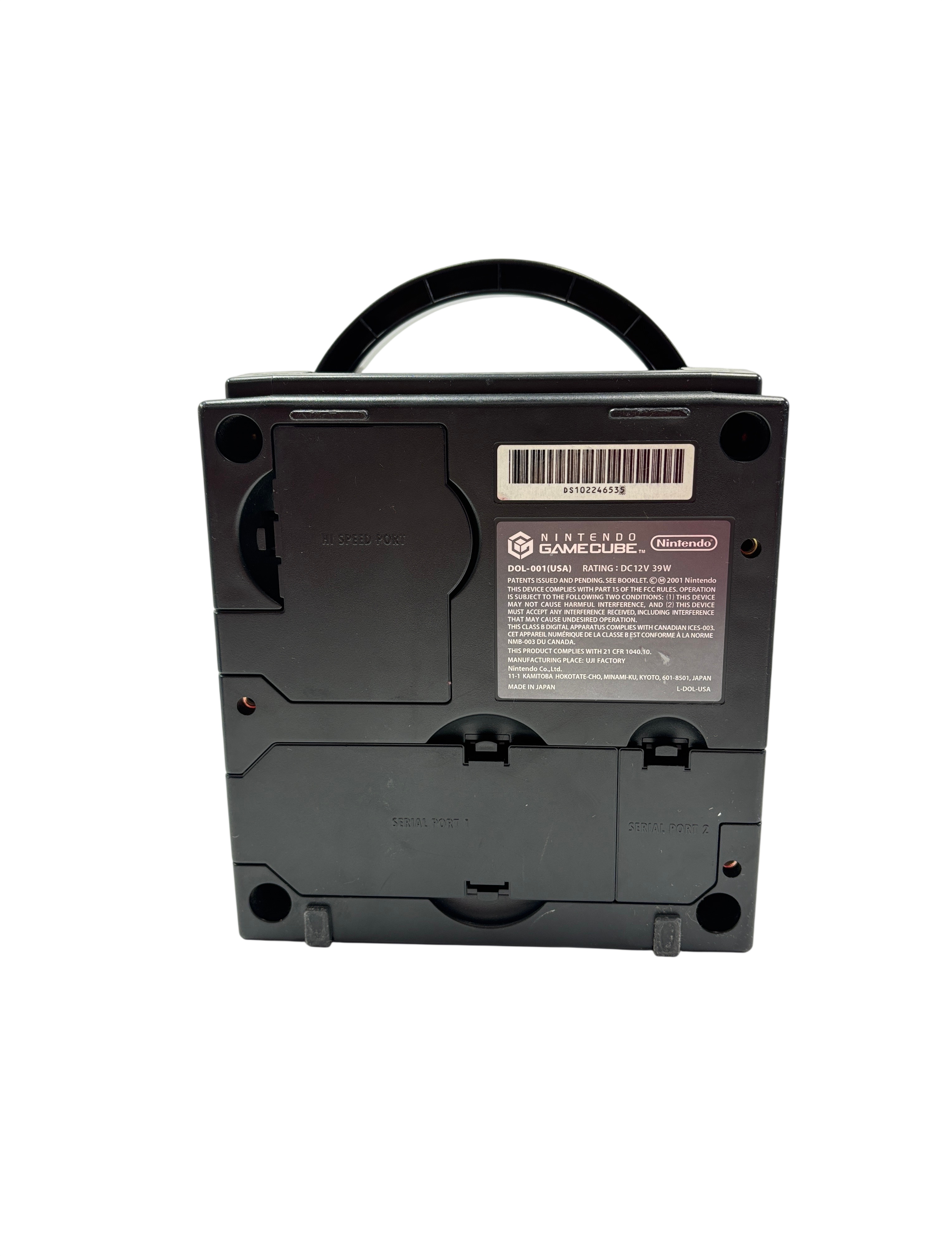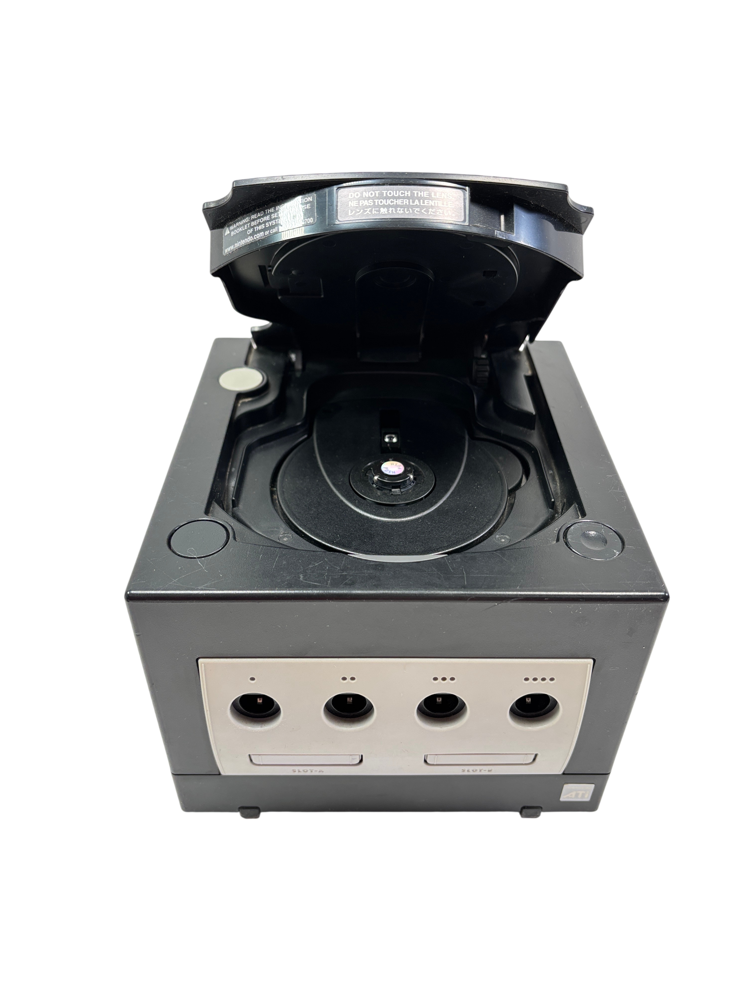 Nintendo DOL-001 Original GameCube Console comes complete with two wired controllers in black and silver, along with the necessary power adapter. Ideal for retro gaming enthusiasts, this set provides everything needed to enjoy a wide library of GameCube titles. The console is made in Japan and represents the original USA model, perfect for collectors and gamers alike.