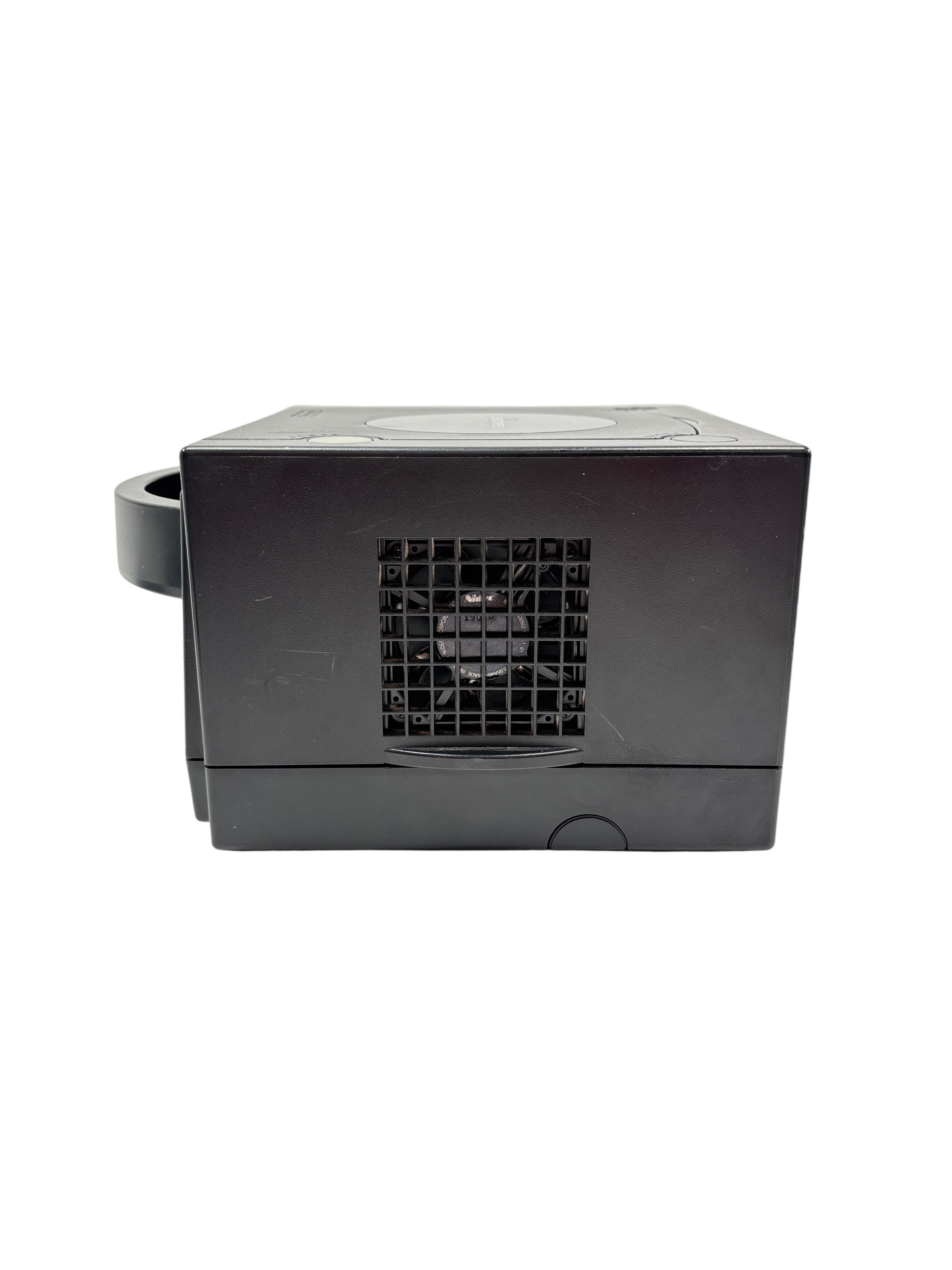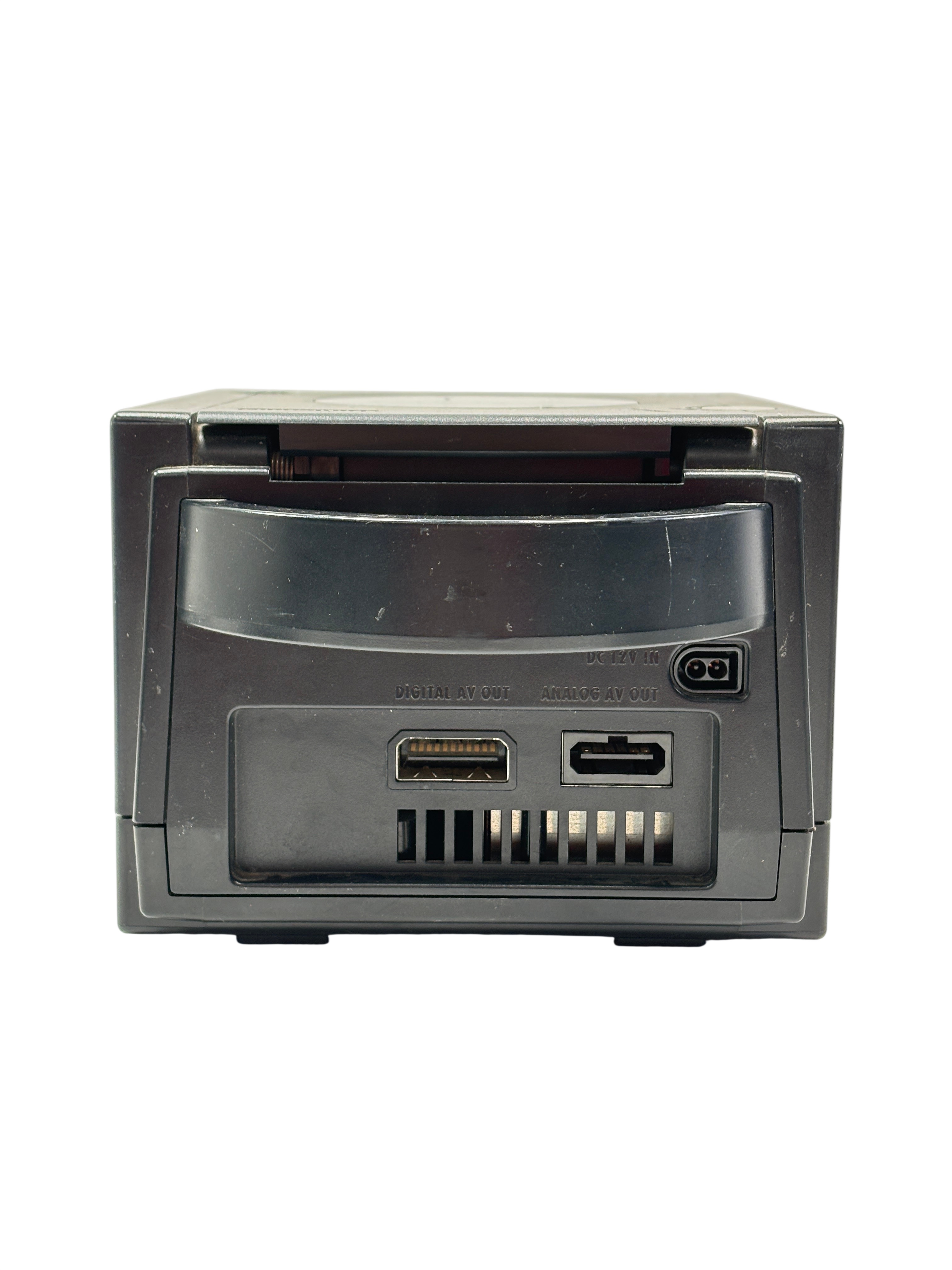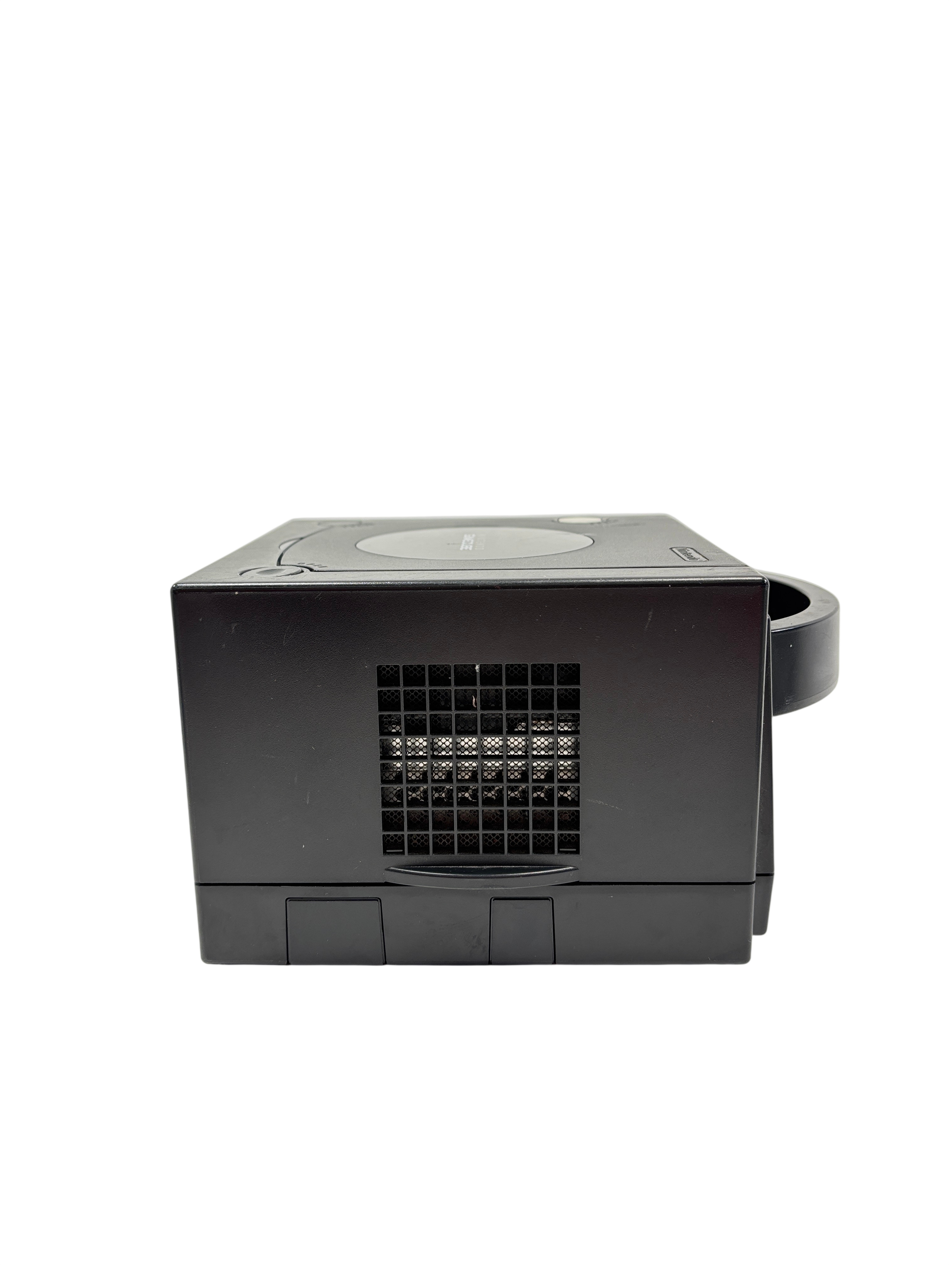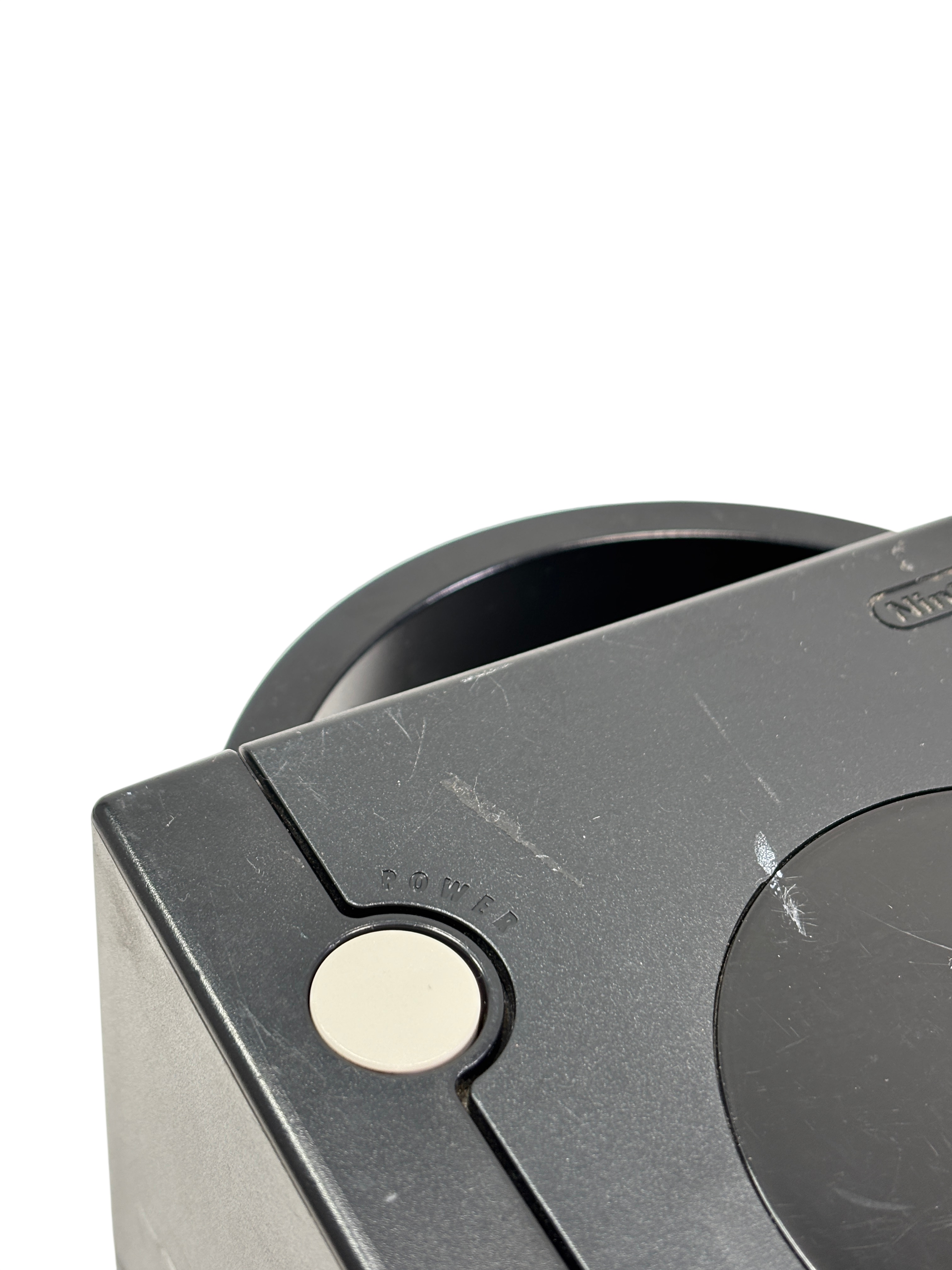 Nintendo DOL-001 Original GameCube Console comes complete with two wired controllers in black and silver, along with the necessary power adapter. Ideal for retro gaming enthusiasts, this set provides everything needed to enjoy a wide library of GameCube titles. The console is made in Japan and represents the original USA model, perfect for collectors and gamers alike.