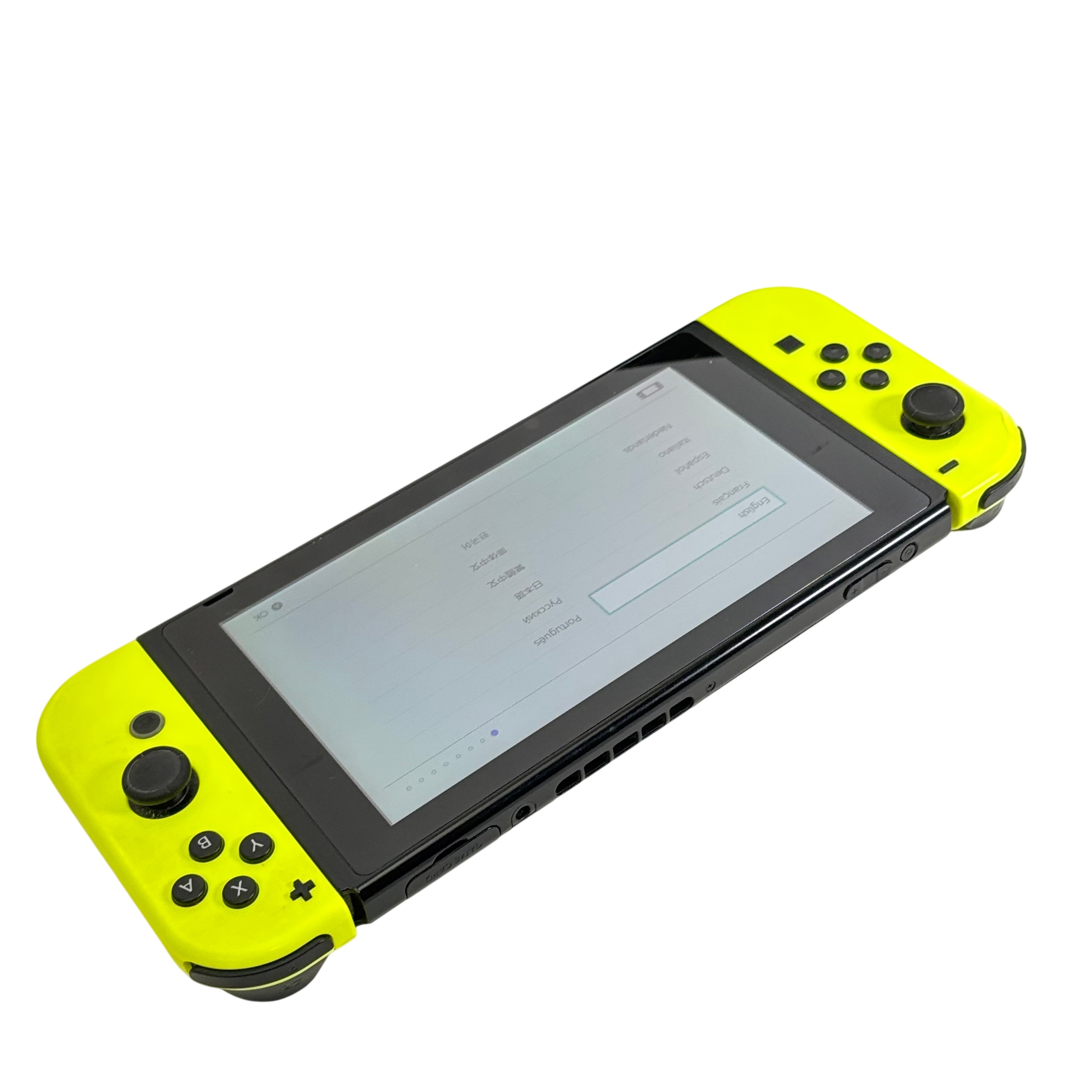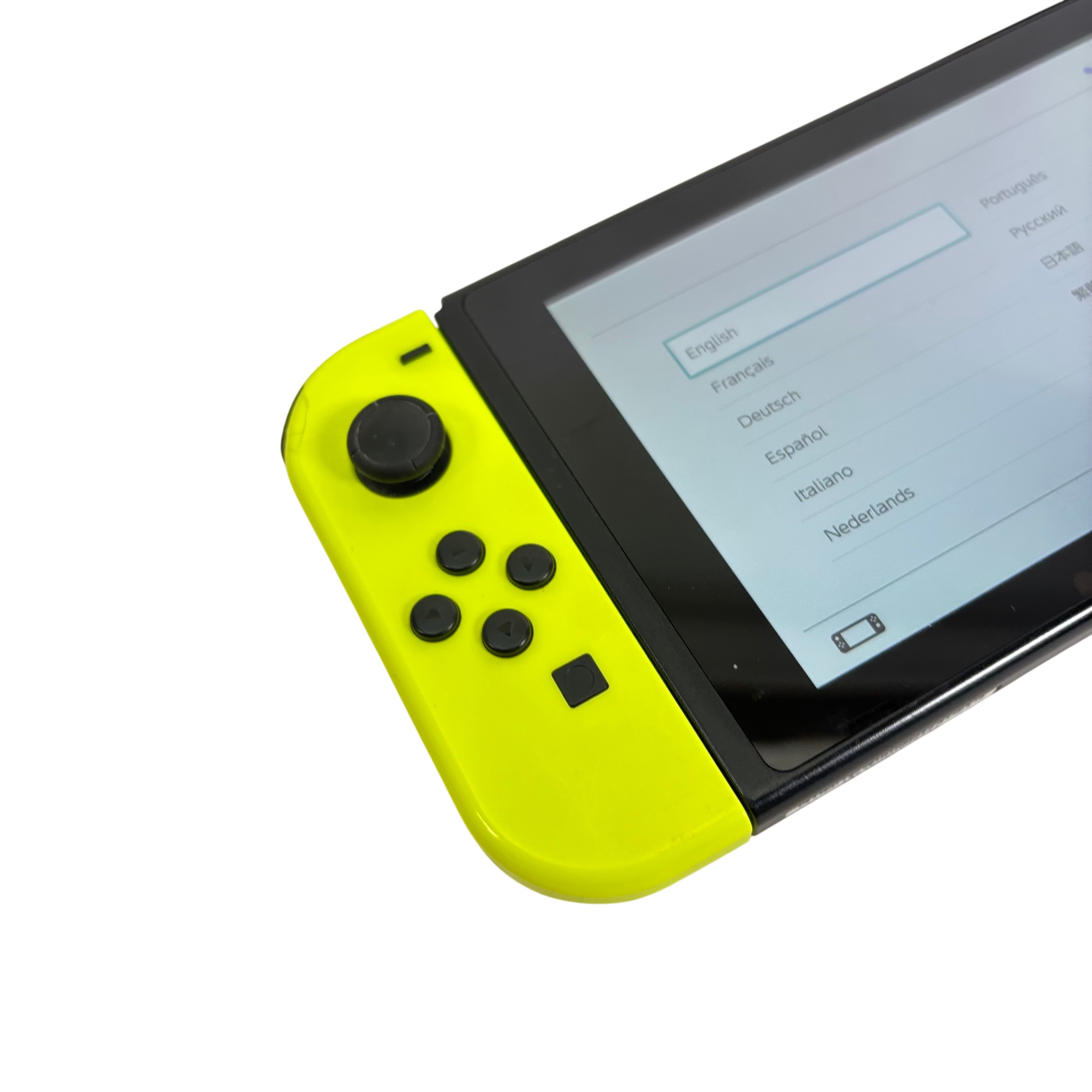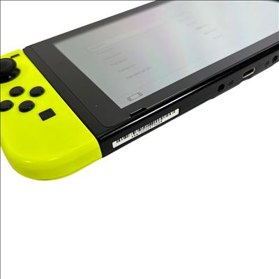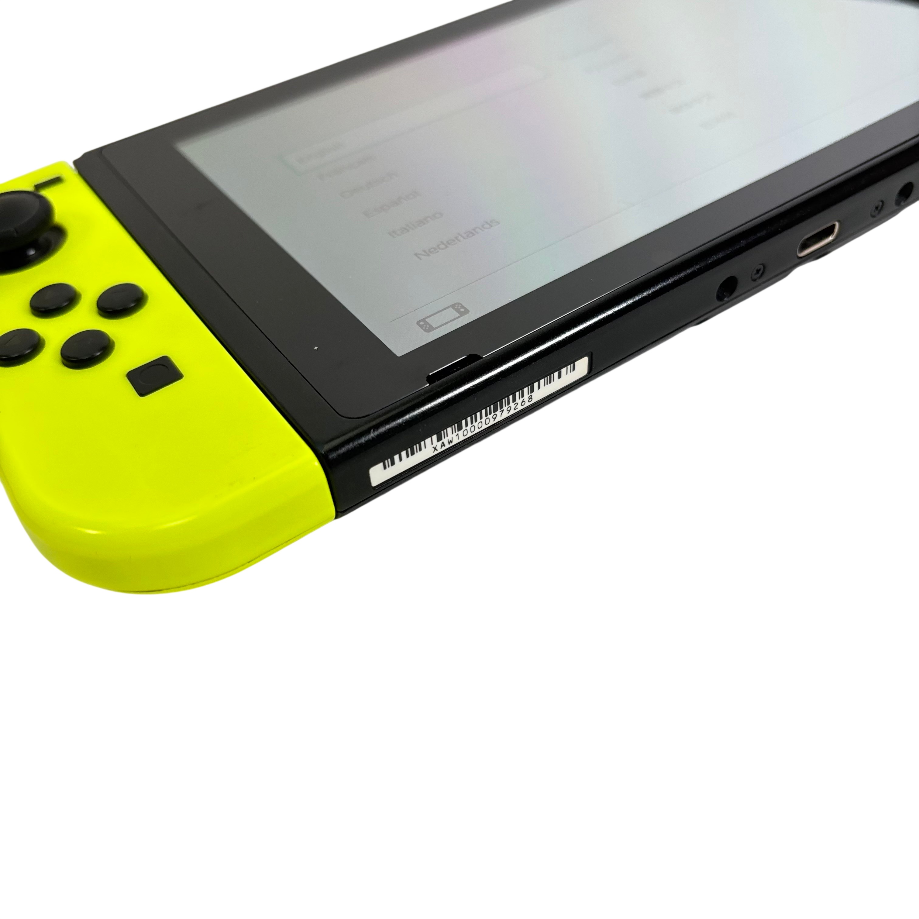 Nintendo Switch HAC-001 (Model HAC-001) is a versatile video game console featuring a 6.2 inch capacitive touchscreen and detachable Neon Yellow Joy-Con controllers.