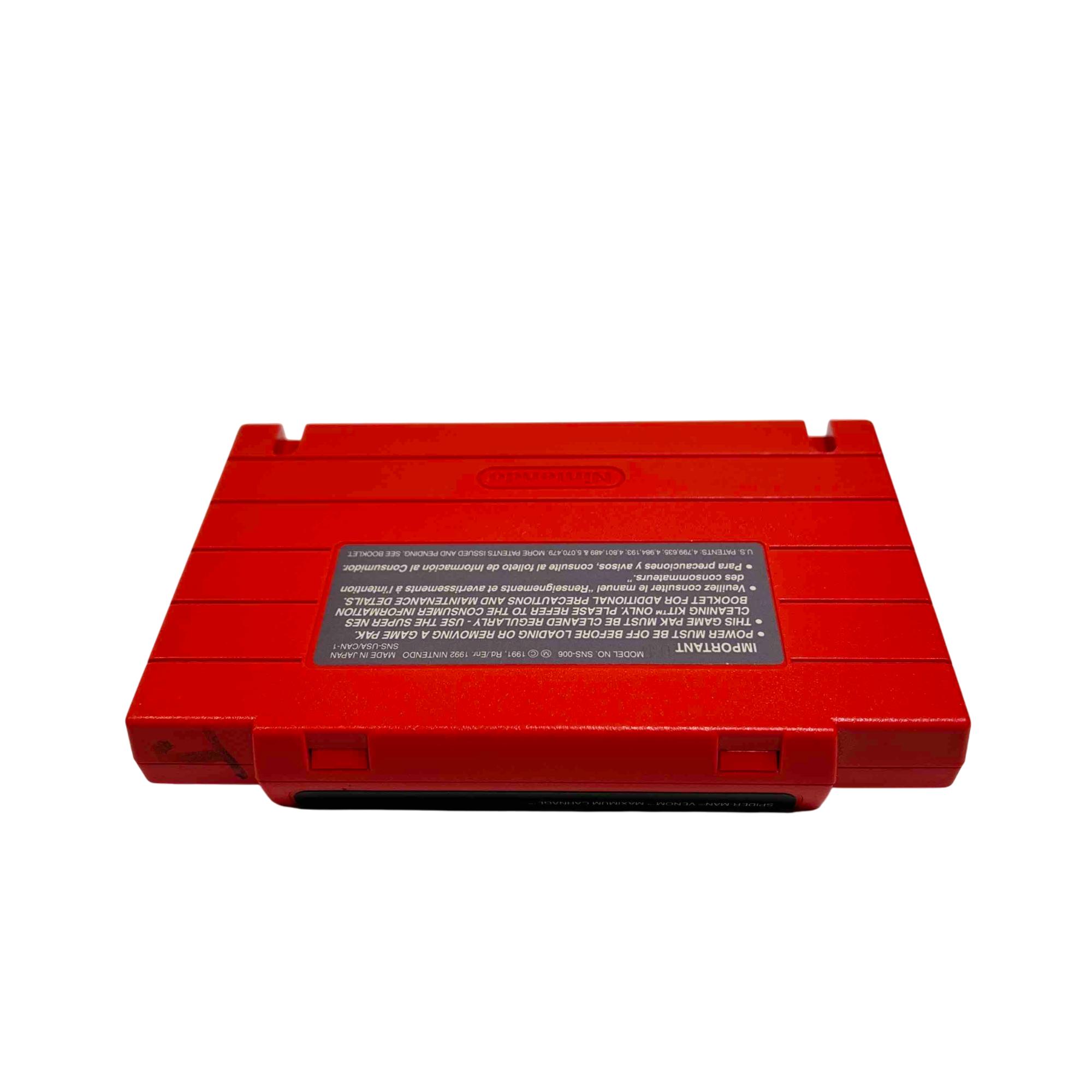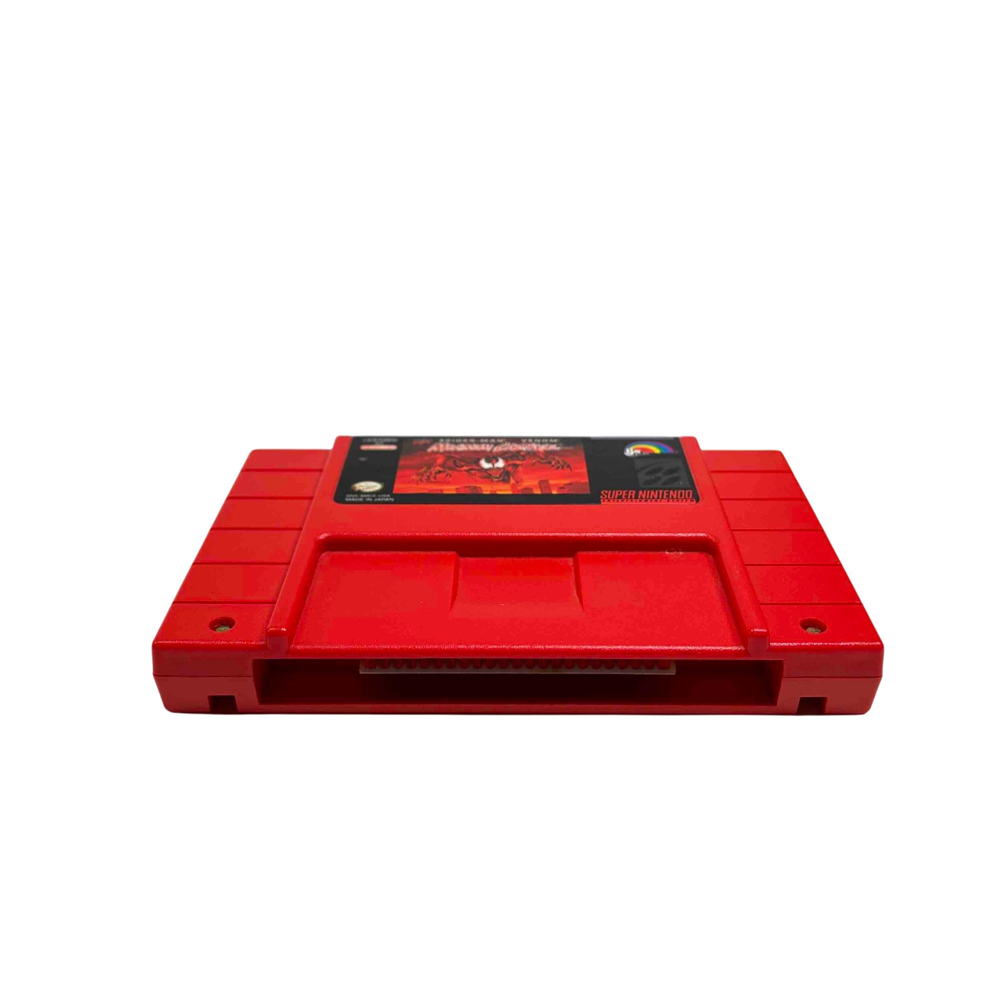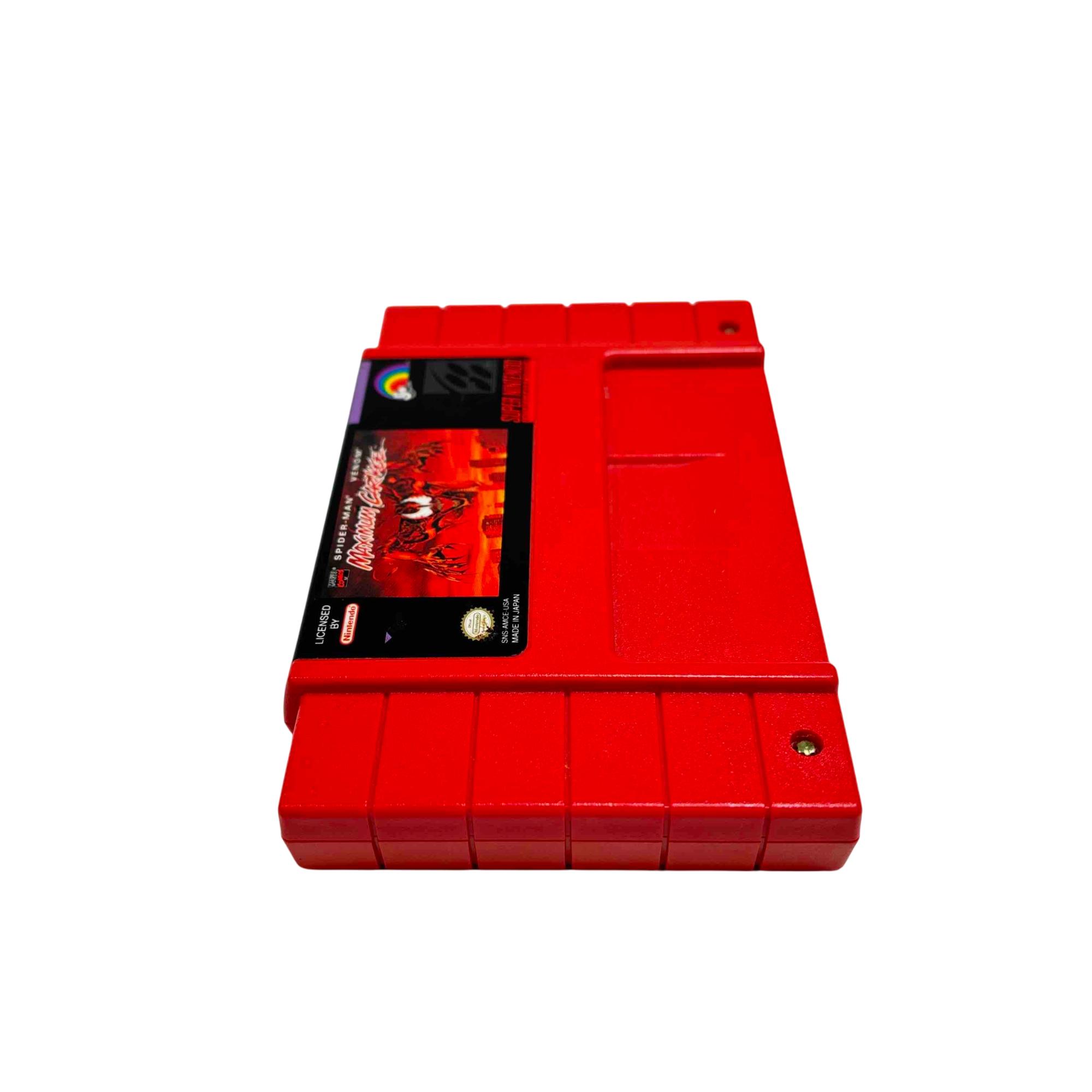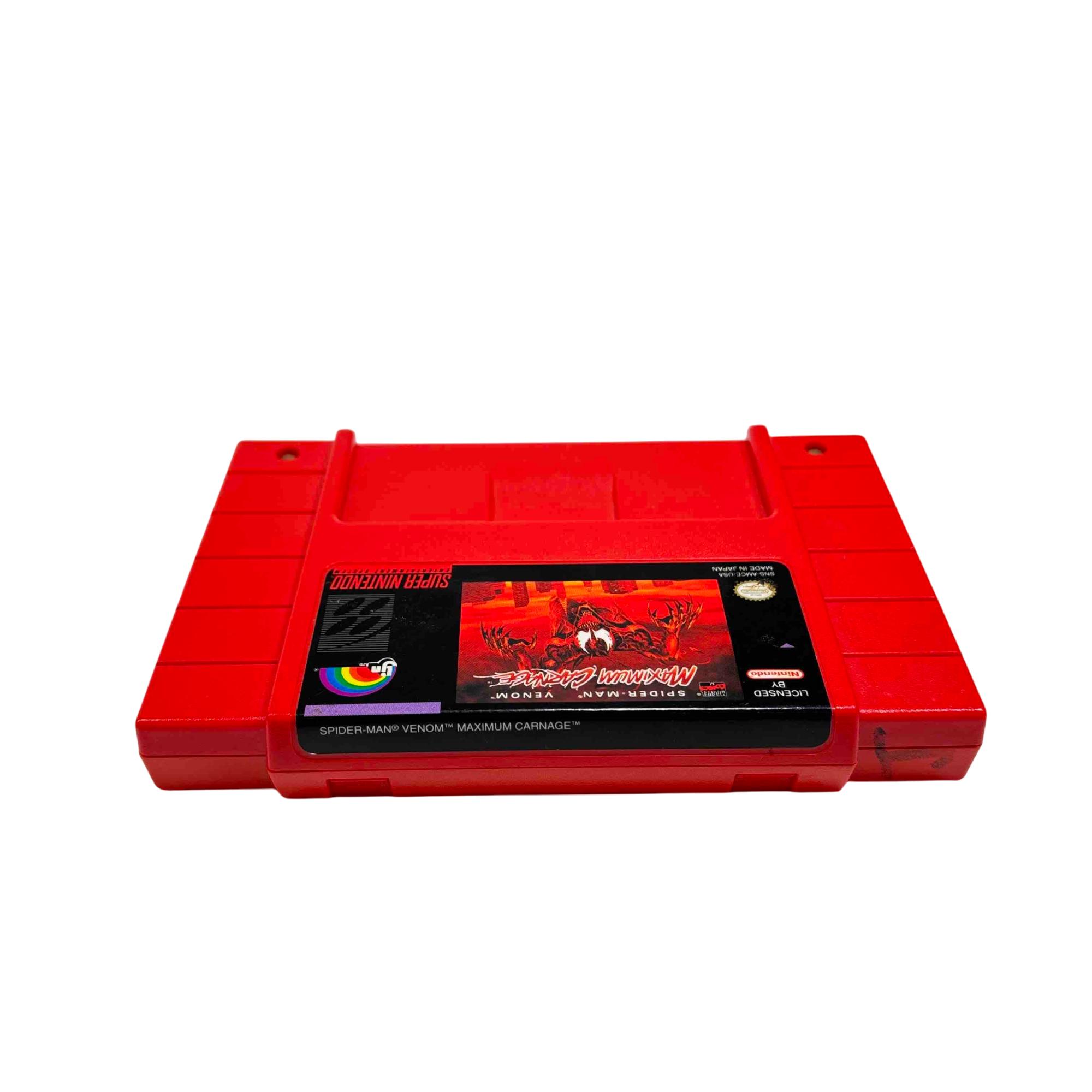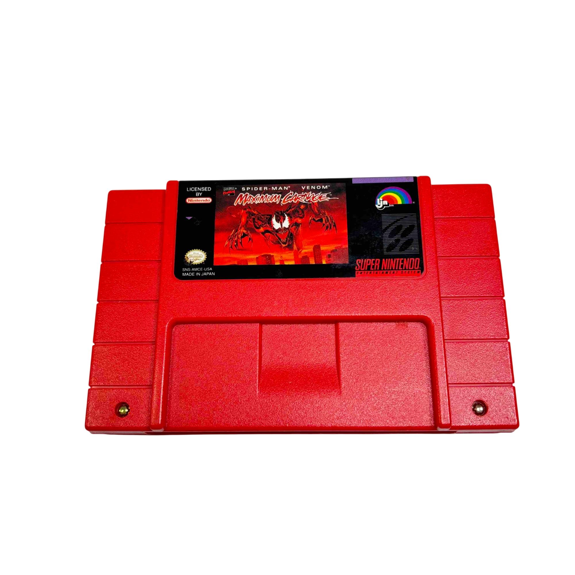 Experience the classic thrill of superheroes with the Nintendo SNS-006 Super Nintendo Game Cartridge featuring Spider-Man & Venom: Maximum Carnage. Immerse yourself in this vintage side-scrolling beat em up as you fight through villainous hordes on your Super Nintendo Entertainment System. This game cartridge is a must-have for retro gaming enthusiasts and collectors alike.