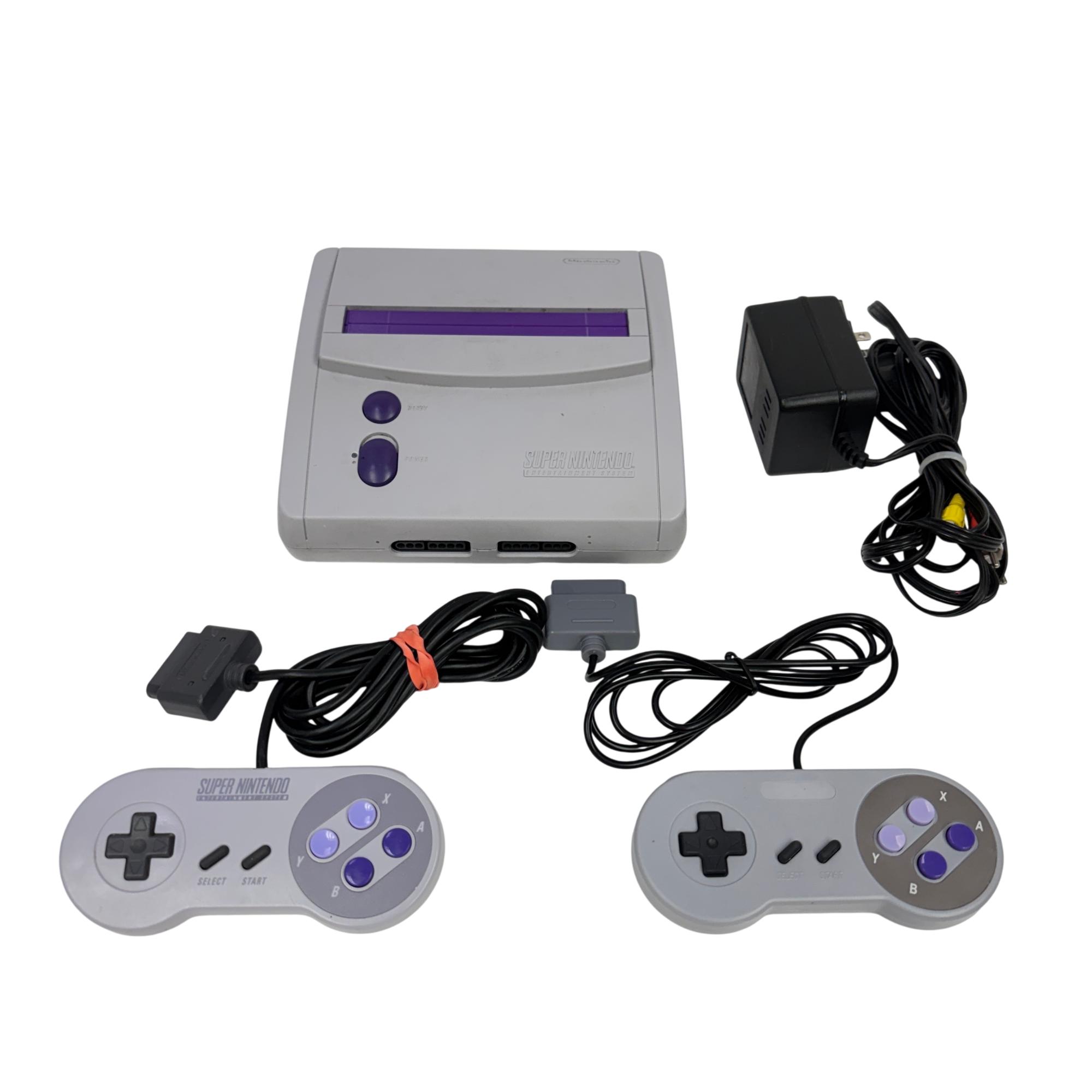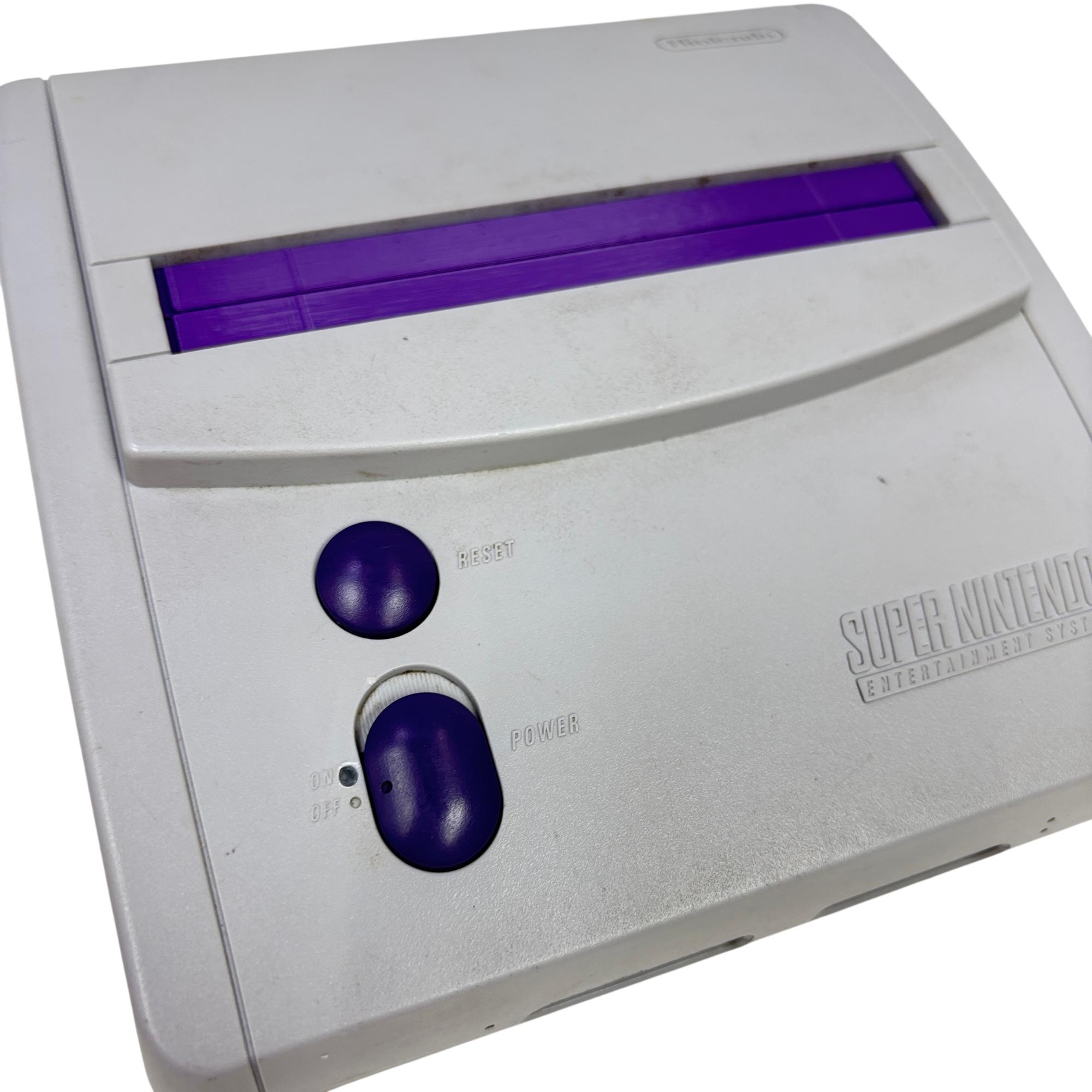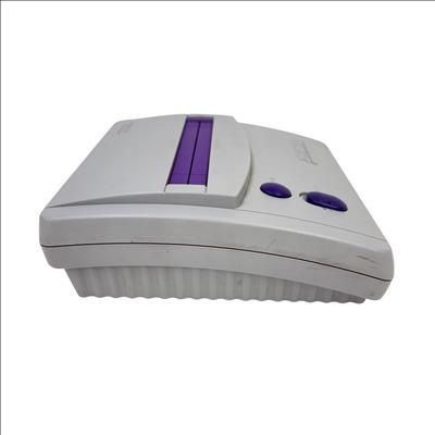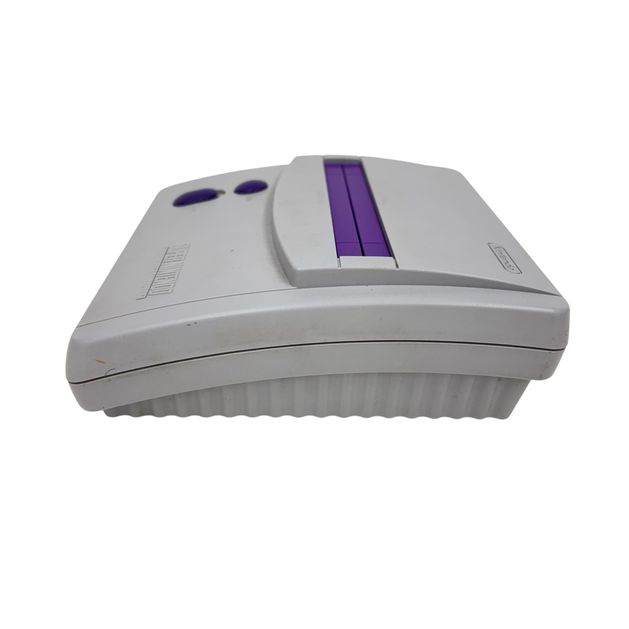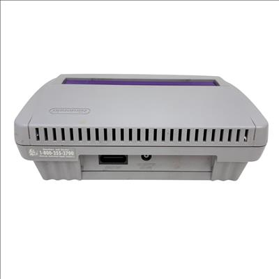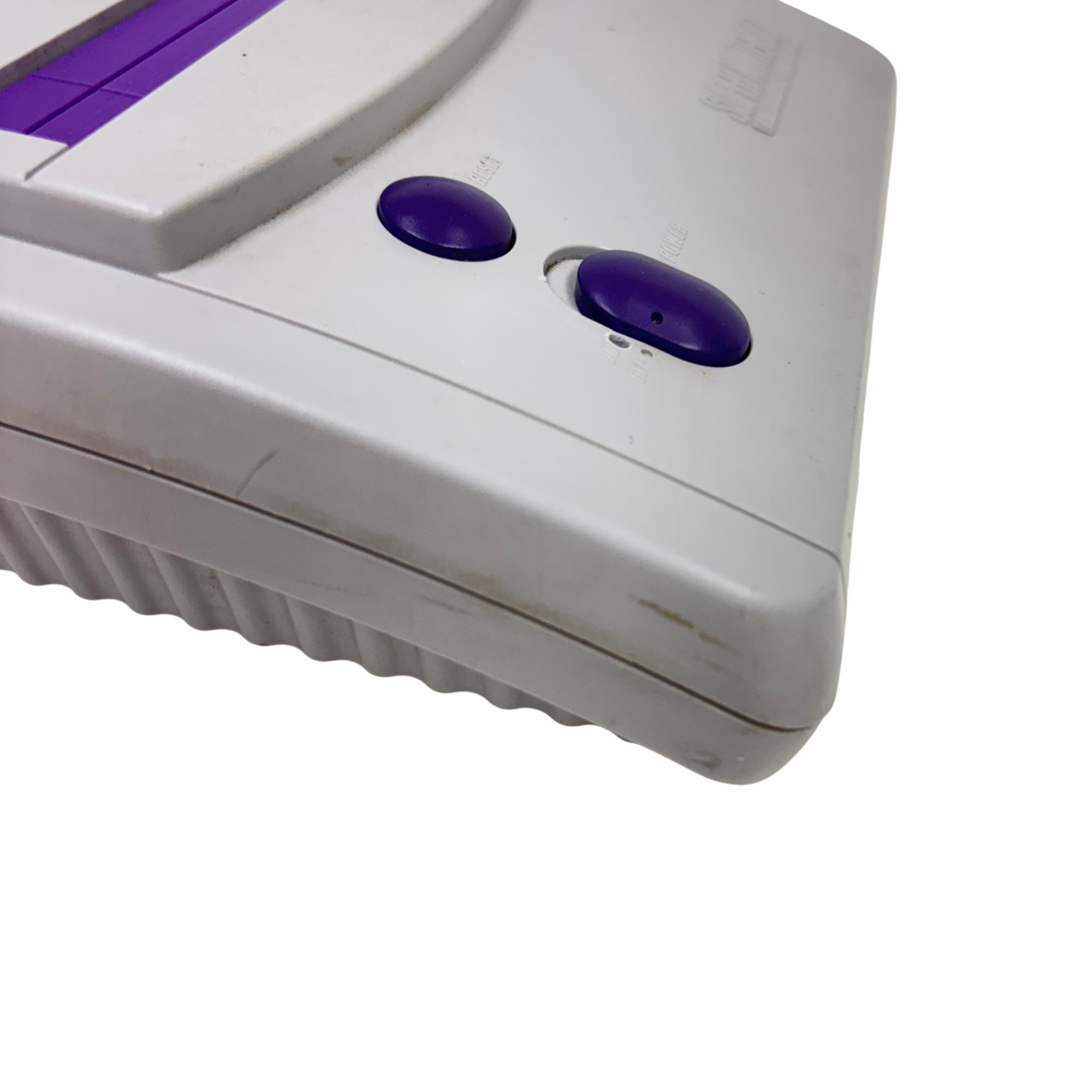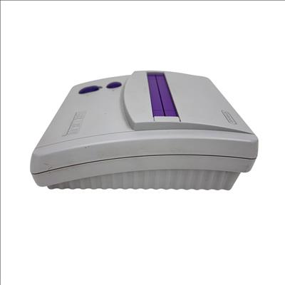 This Nintendo Super Nintendo Entertainment System Junior offers a compact redesign of the classic 16-bit gaming console, featuring a streamlined white and purple casing with multiple controller ports. This model supports a wide range of SNES cartridges and includes essential connectivity through its power adapter and AV output, making it a perfect choice for retro gaming enthusiasts seeking authentic gameplay experience.