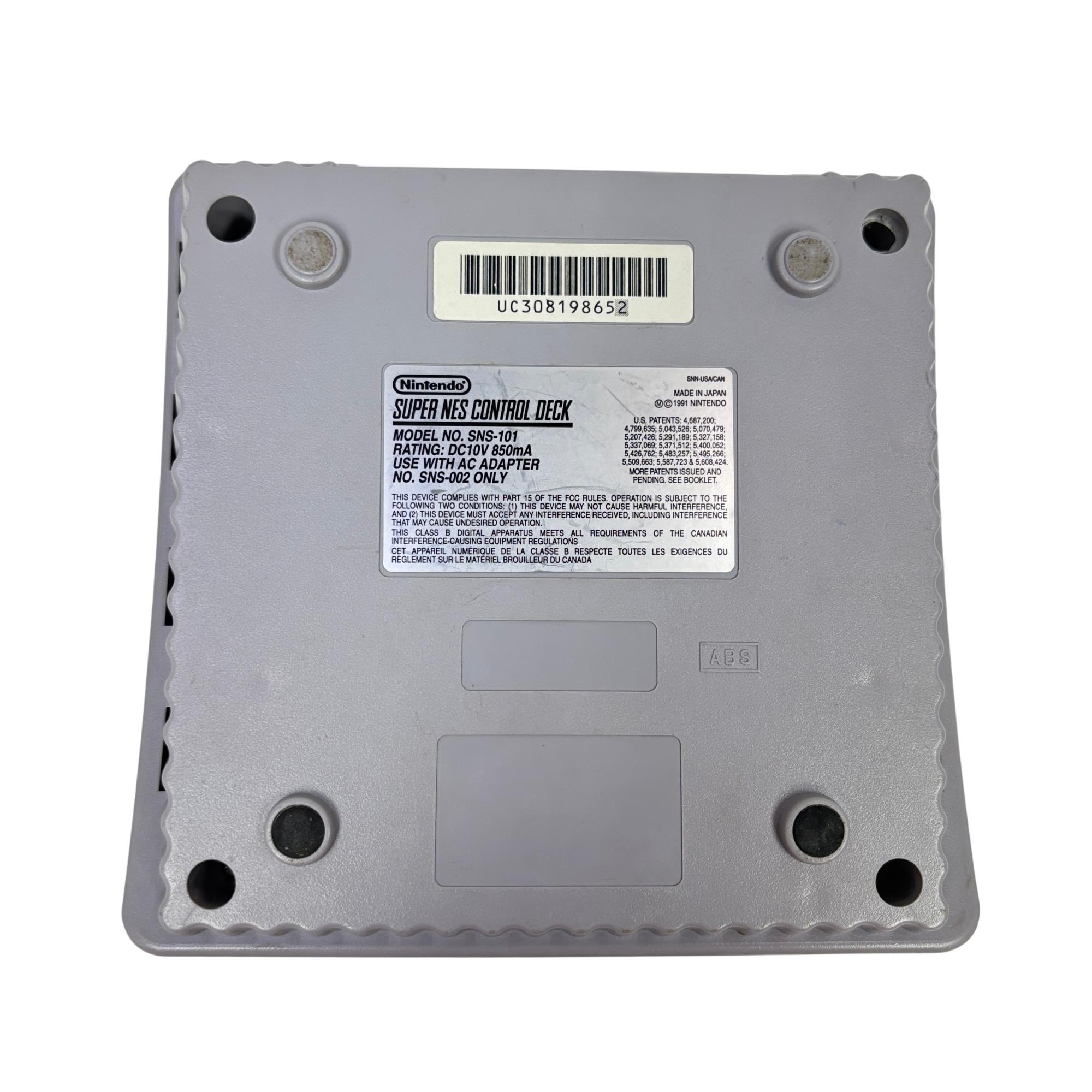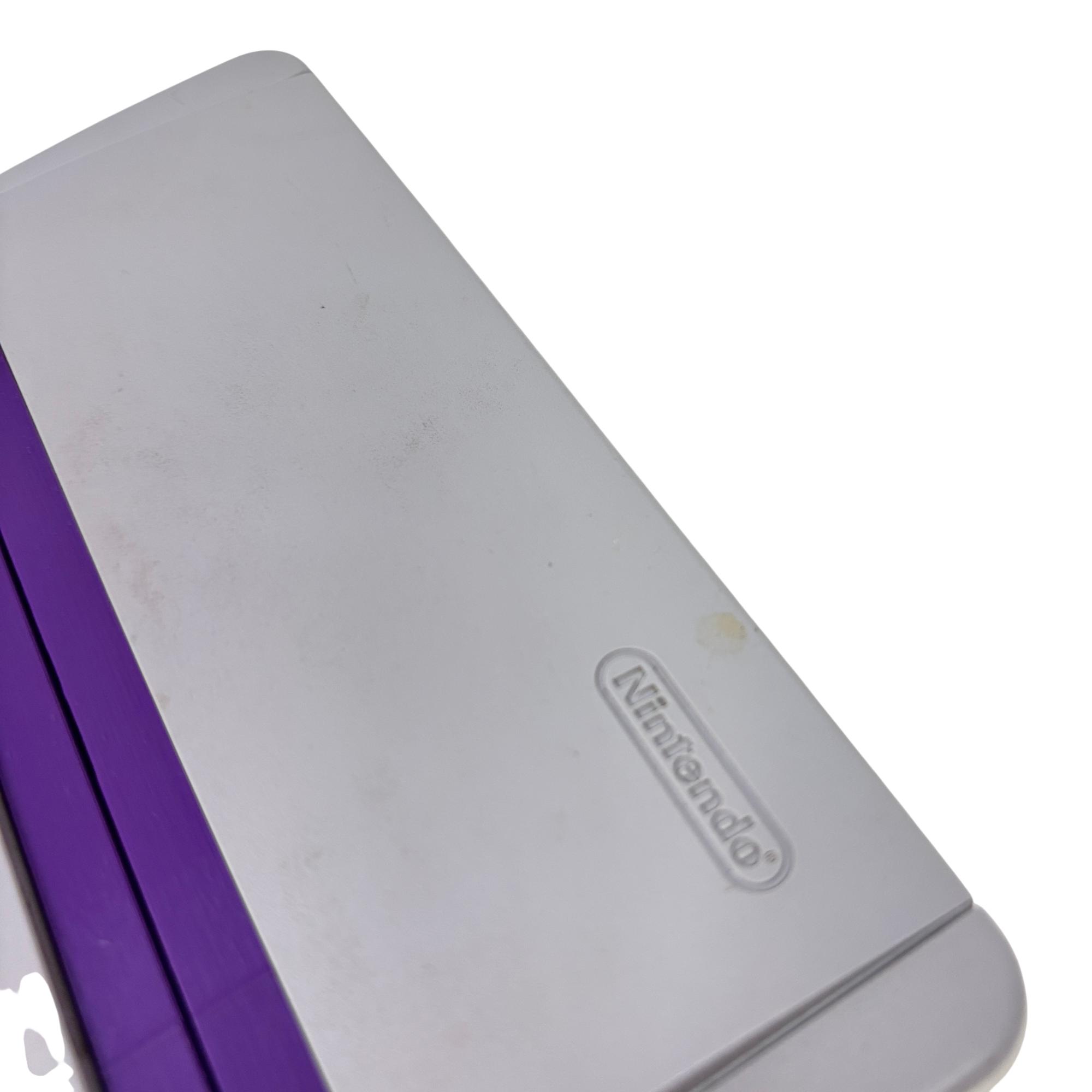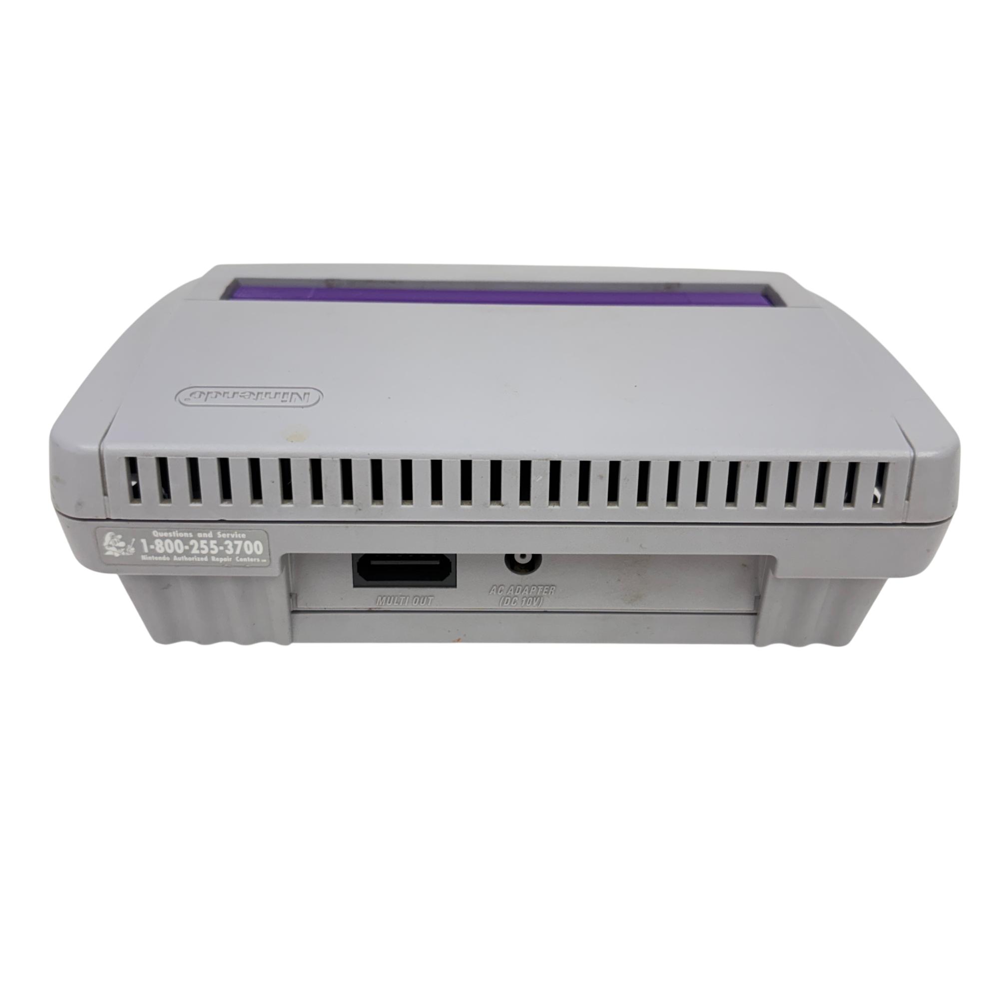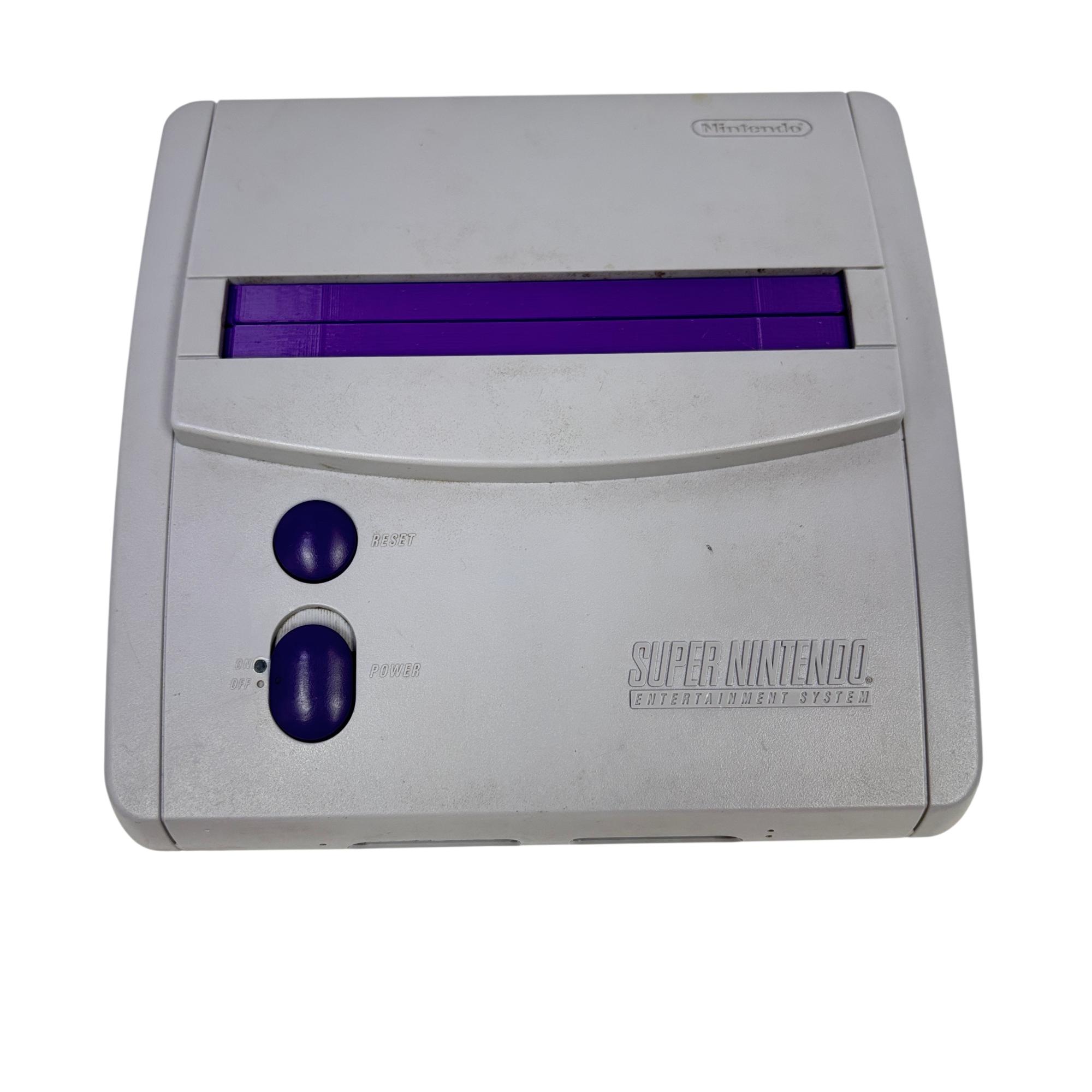 This Nintendo Super Nintendo Entertainment System Junior offers a compact redesign of the classic 16-bit gaming console, featuring a streamlined white and purple casing with multiple controller ports. This model supports a wide range of SNES cartridges and includes essential connectivity through its power adapter and AV output, making it a perfect choice for retro gaming enthusiasts seeking authentic gameplay experience.