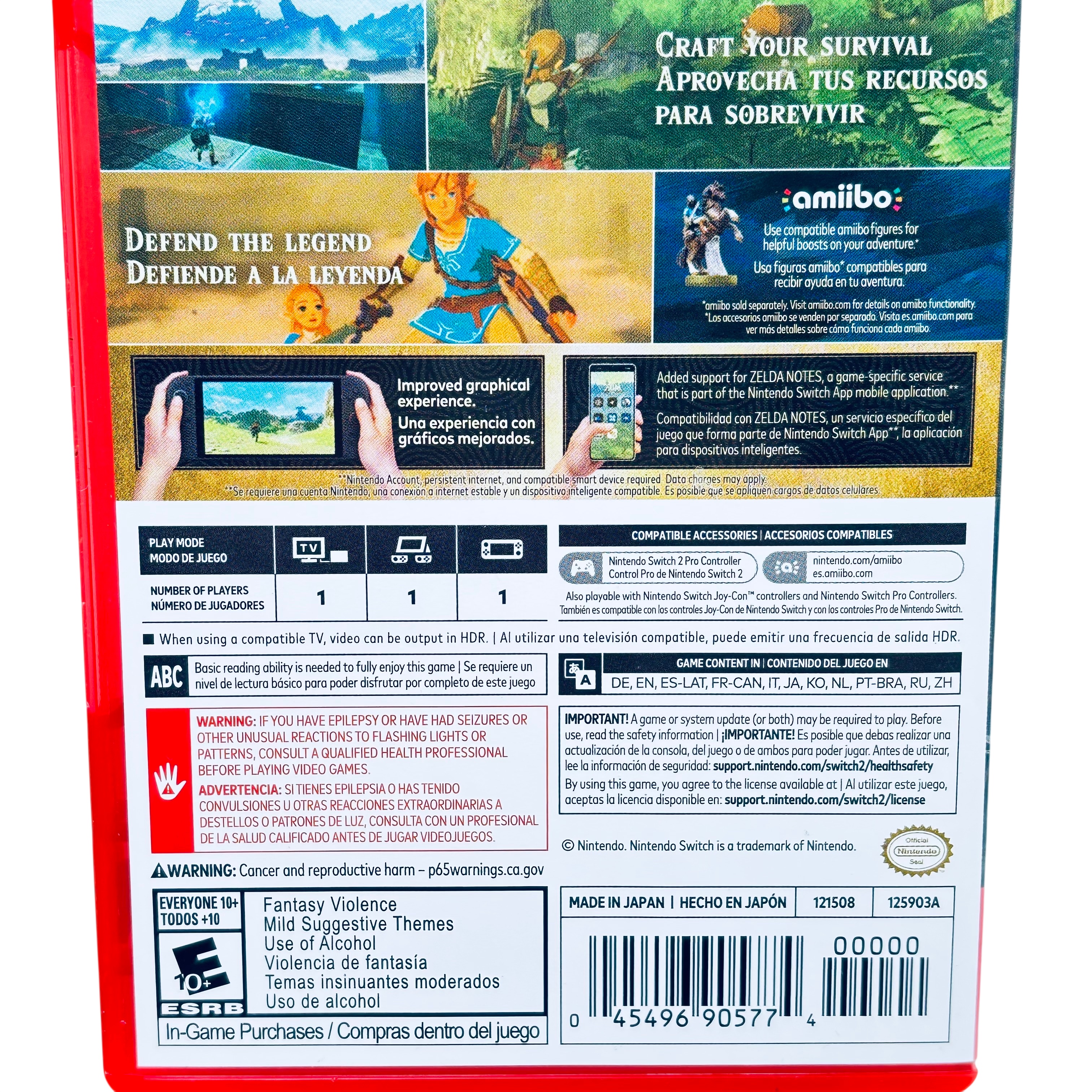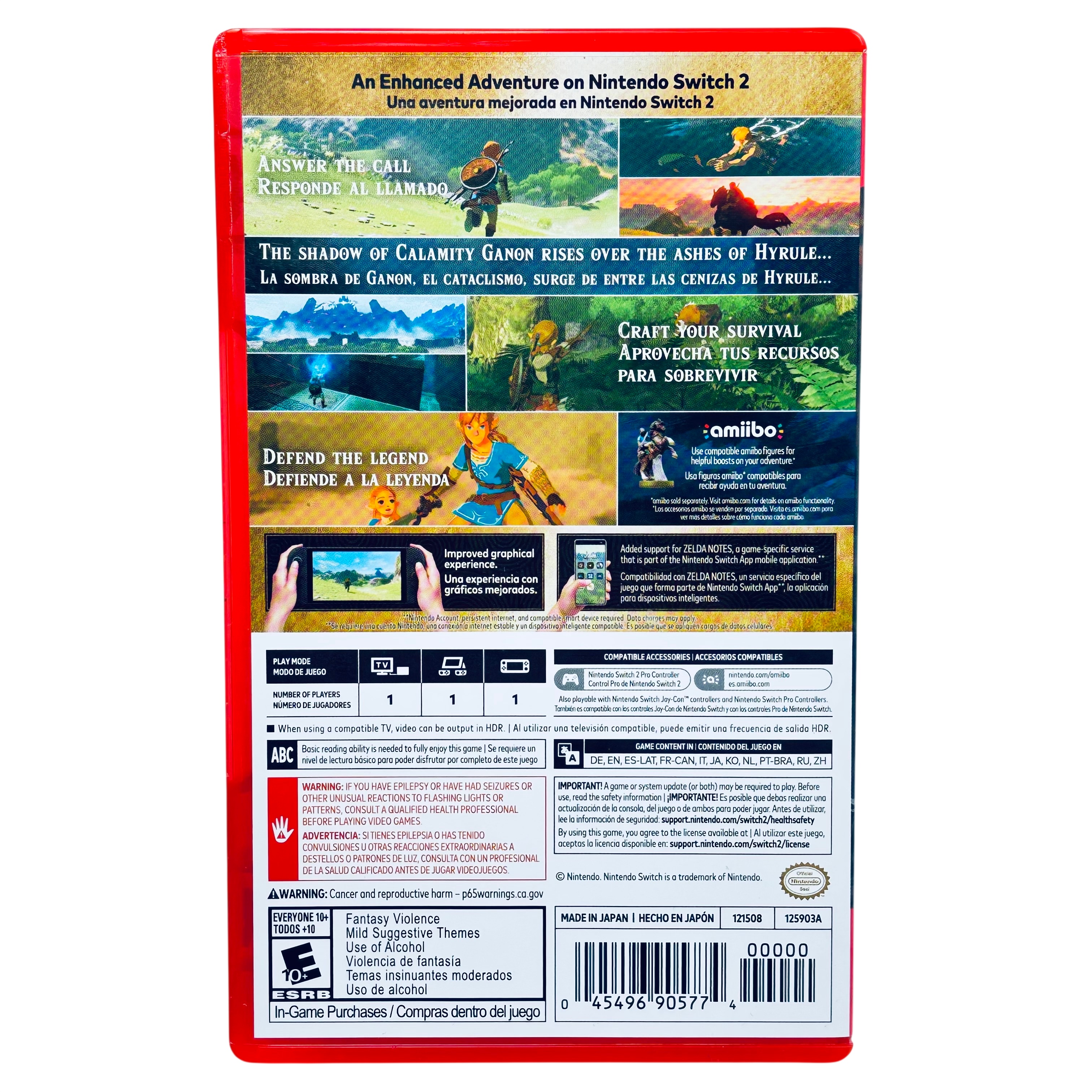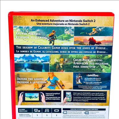 Nintendo The Legend of Zelda Breath of the Wild Nintendo Switch 2 Edition is an enhanced version of the acclaimed adventure game designed for the Nintendo Switch platform. This edition includes the original game along with an upgrade pack for the Nintendo Switch 2 Edition, offering improved graphics and additional features such as Zelda Notes support via the Nintendo Switch App. Compatible with various Nintendo Switch controllers and amiibo figures, this game delivers a rich single-player experience with HDR video output on supported TVs. Rated Everyone 10+, it is perfect for fans seeking an immersive and upgraded journey through Hyrule.