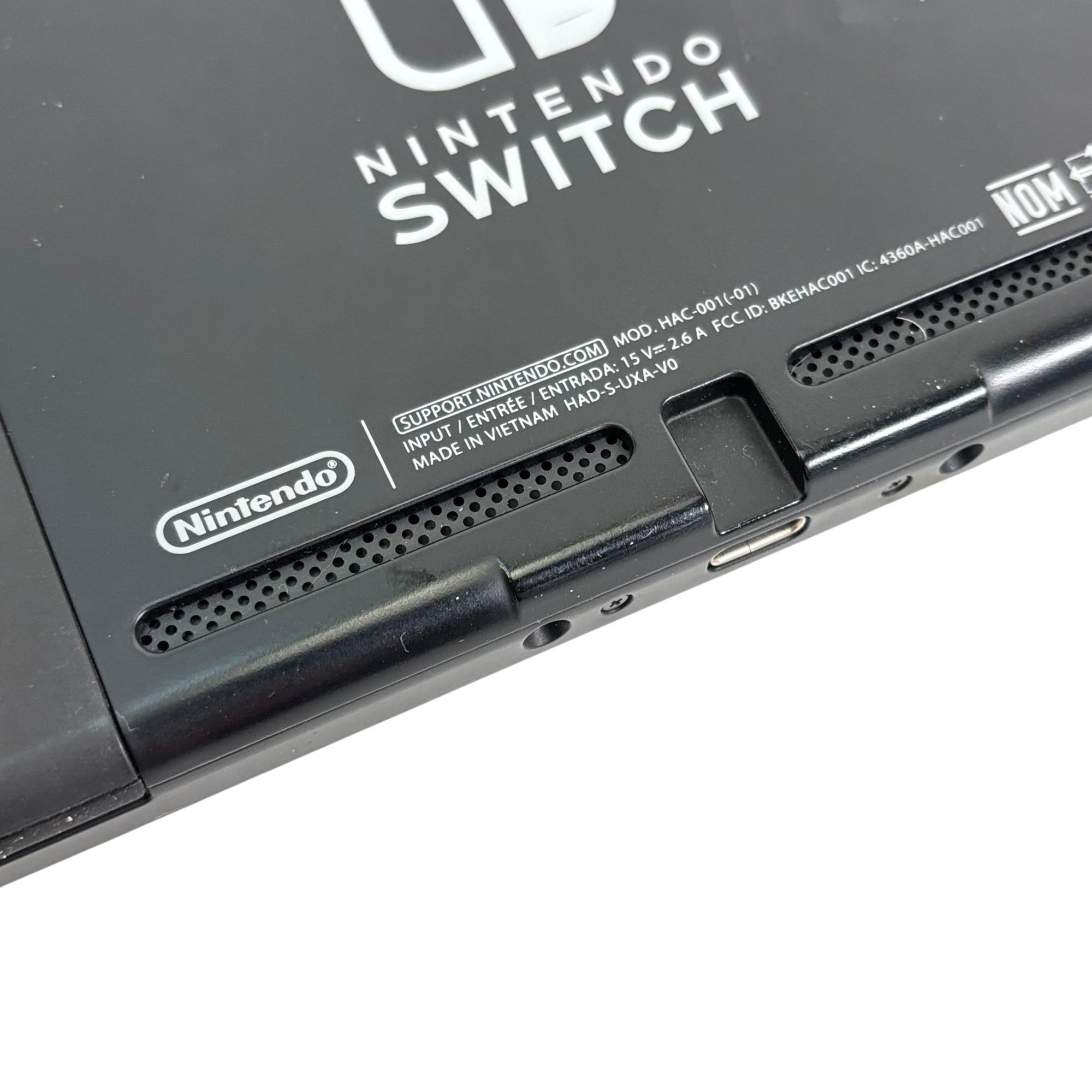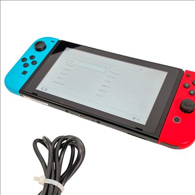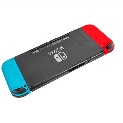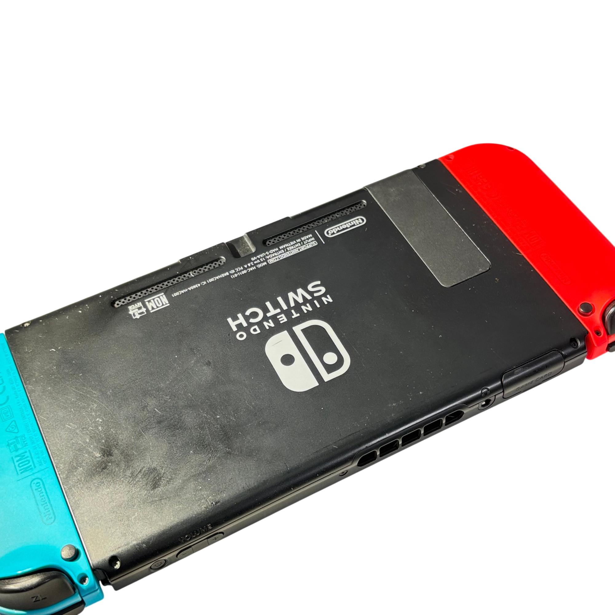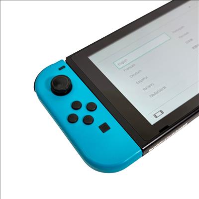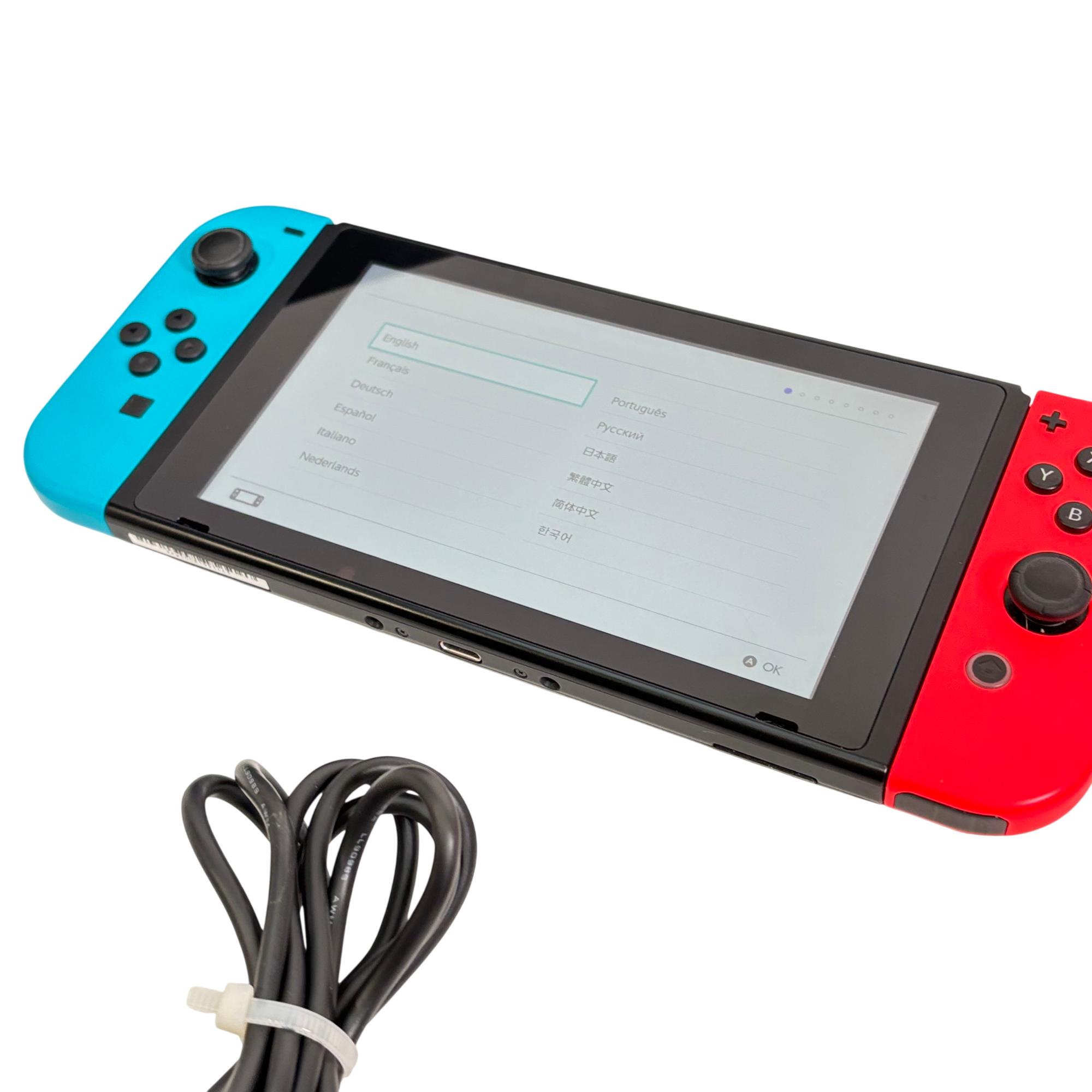 Nintendo Switch Console HAC-001 features a versatile design combining handheld and docked gameplay with neon red and blue Joy-Con controllers. This 32GB video game console supports multiple languages and offers seamless connectivity through its docking station and charger, providing an immersive gaming experience for players on the go or at home.