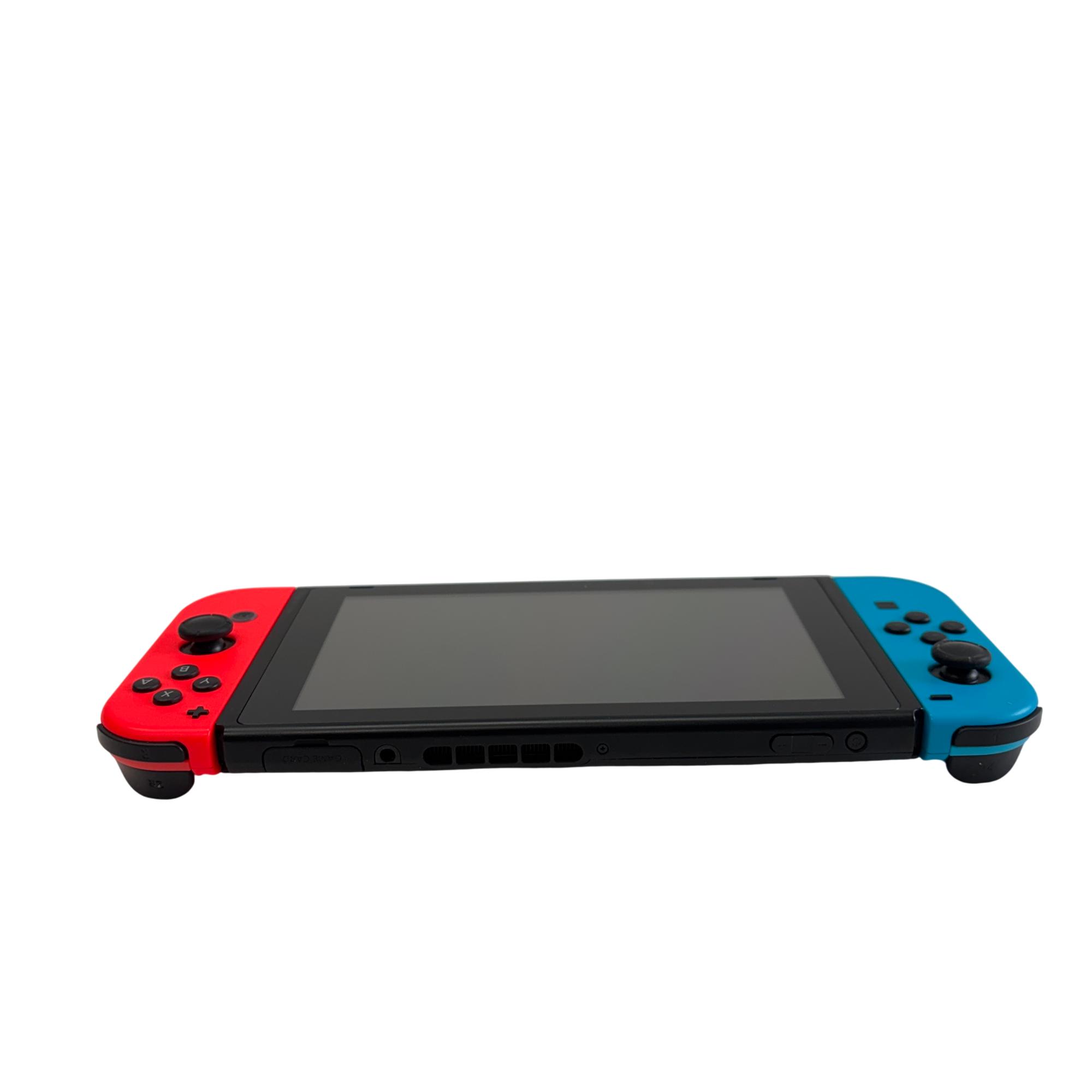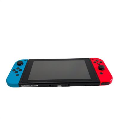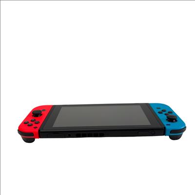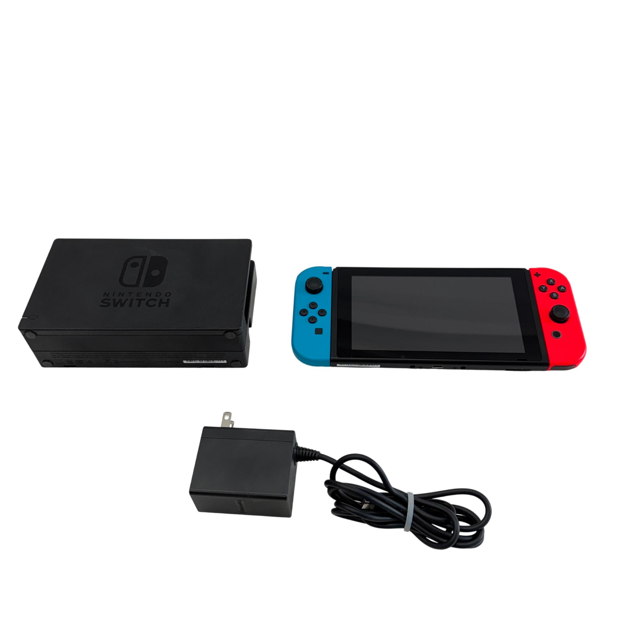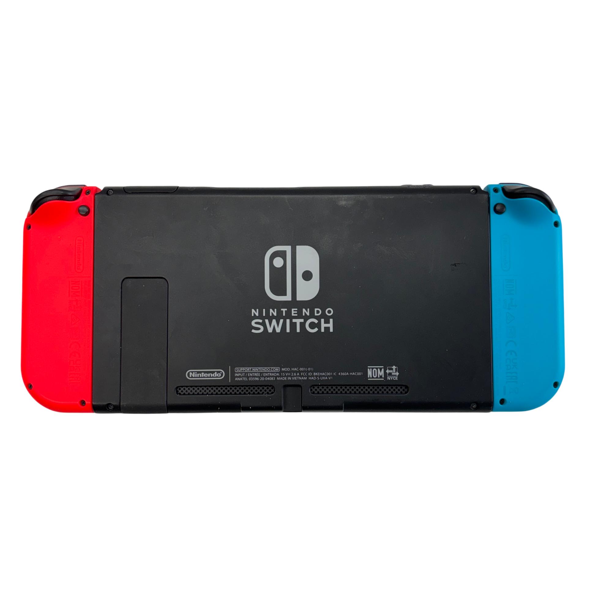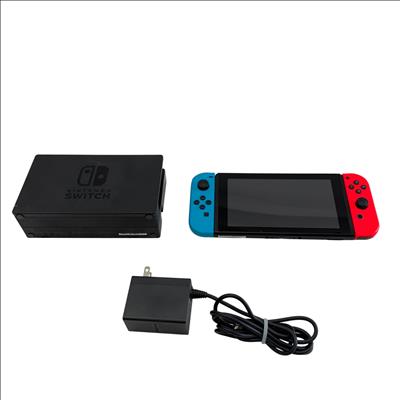 Nintendo Switch HAC-001(-01) console features a versatile design with neon red and blue Joy-Con controllers that enhance the gaming experience with vibrant colors and ergonomic control. The system includes a sleek black dock that allows seamless connection to a TV for gameplay on a larger screen, combining portability with home gaming convenience. Designed with user-friendly ports and durable construction, this gaming device supports a wide range of Nintendo titles and accessories.