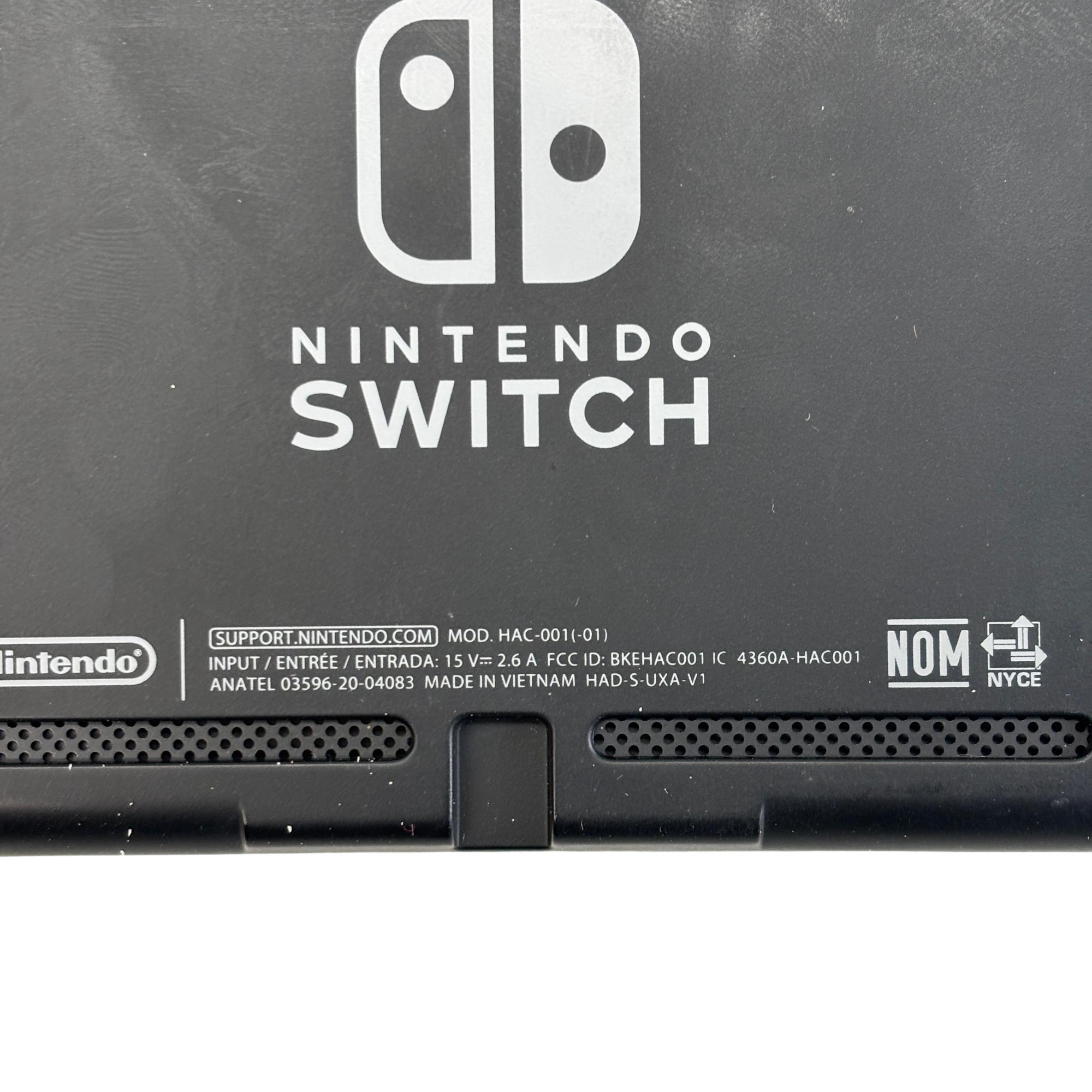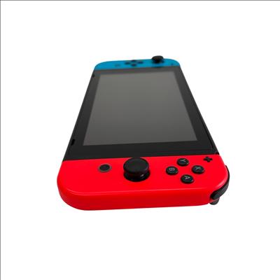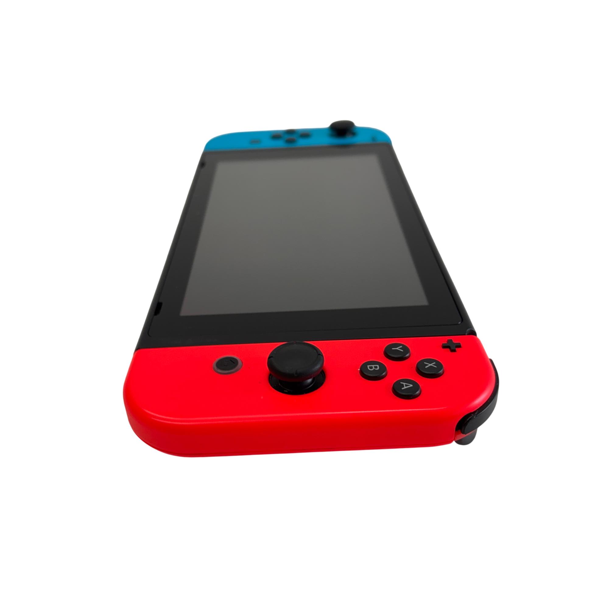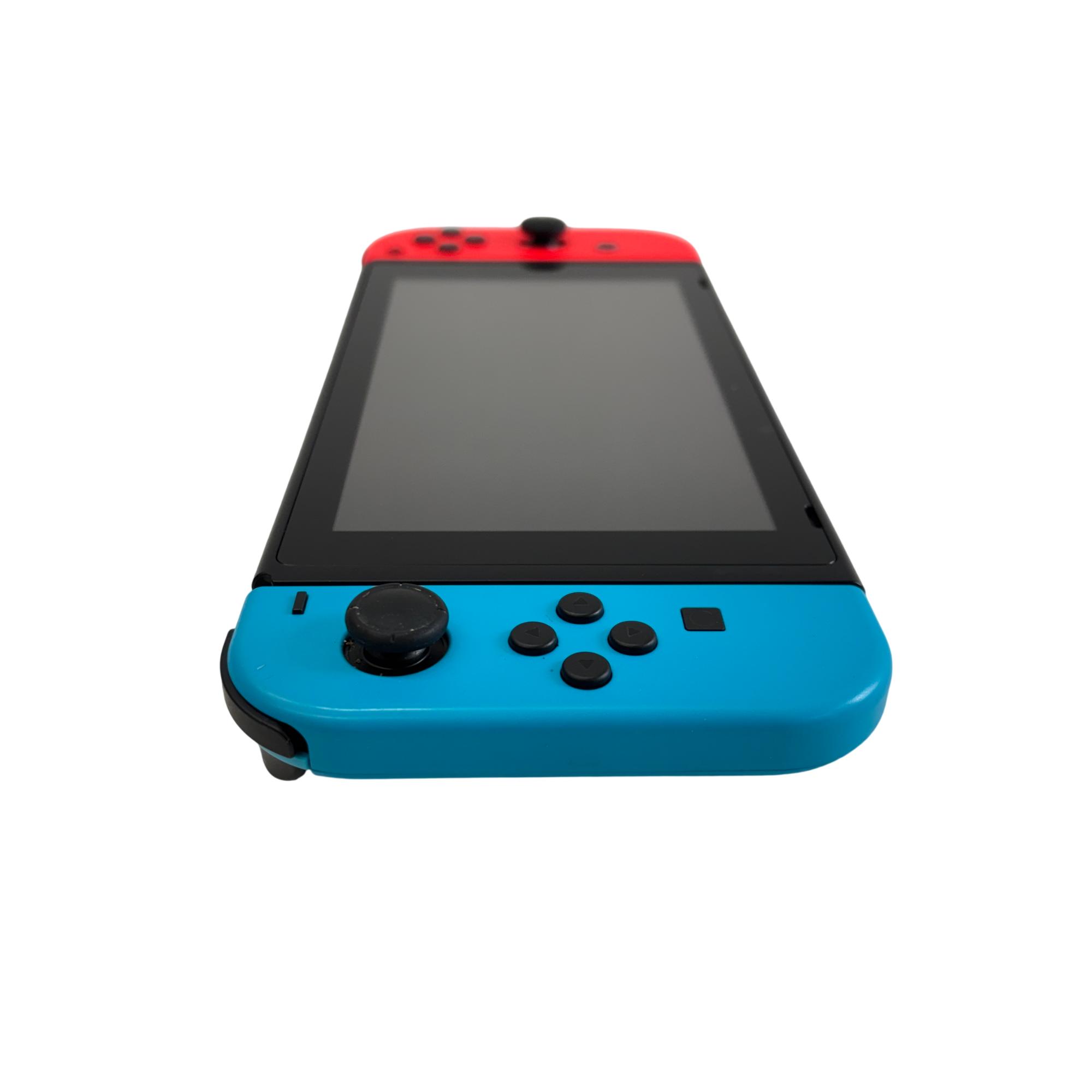 Nintendo Switch HAC-001(-01) console features a versatile design with neon red and blue Joy-Con controllers that enhance the gaming experience with vibrant colors and ergonomic control. The system includes a sleek black dock that allows seamless connection to a TV for gameplay on a larger screen, combining portability with home gaming convenience. Designed with user-friendly ports and durable construction, this gaming device supports a wide range of Nintendo titles and accessories.