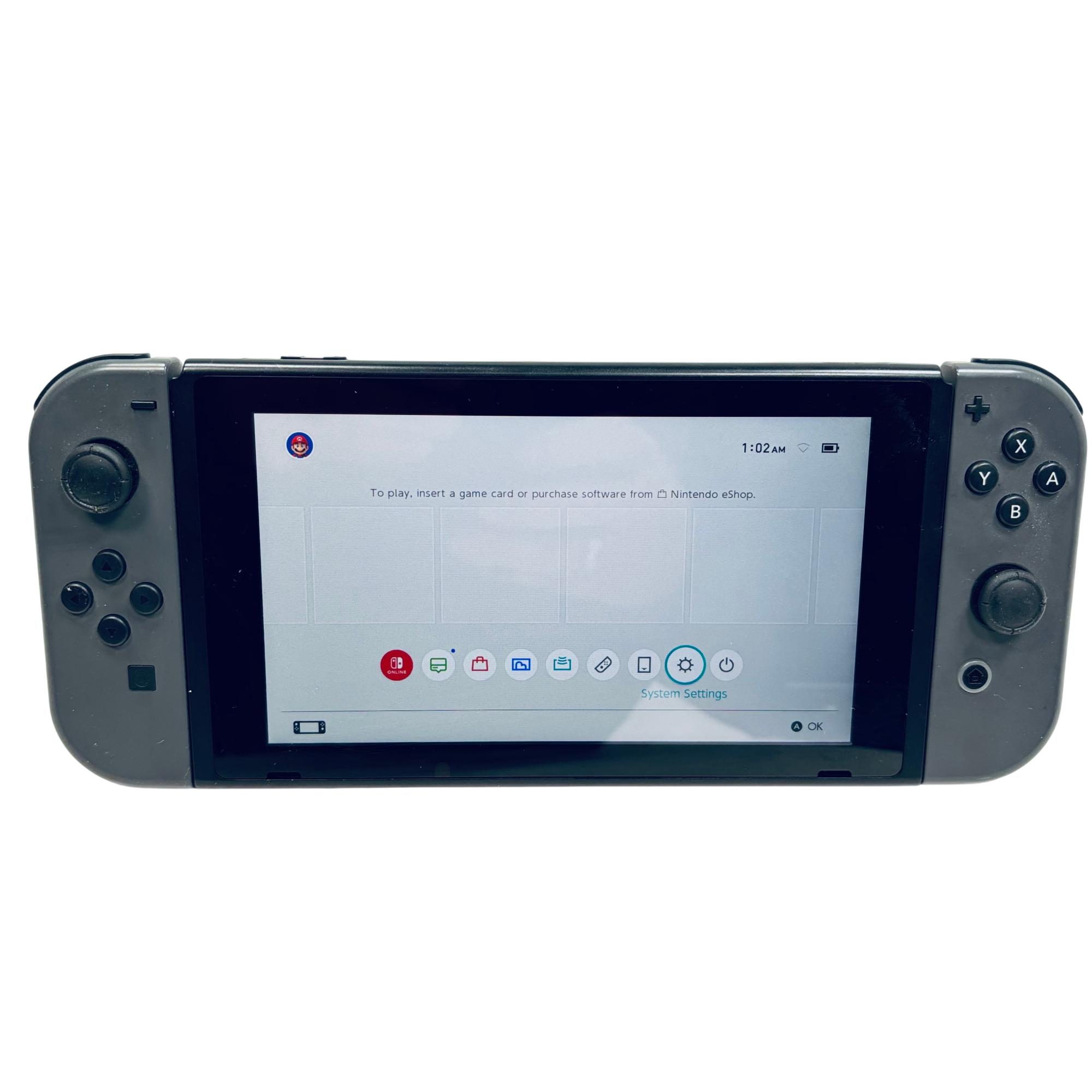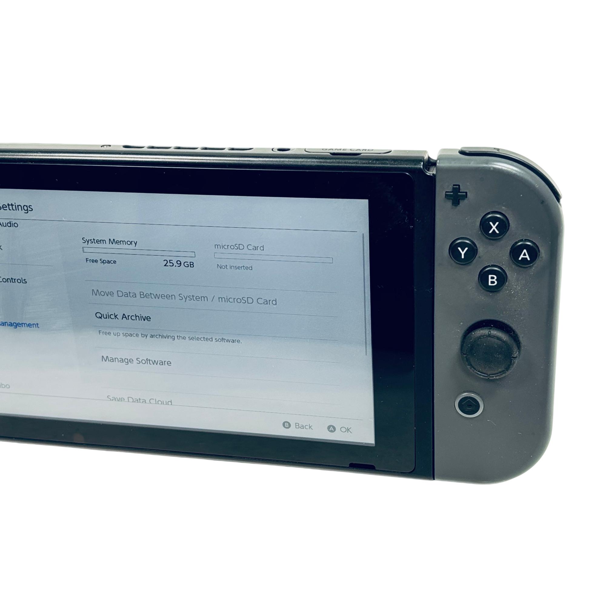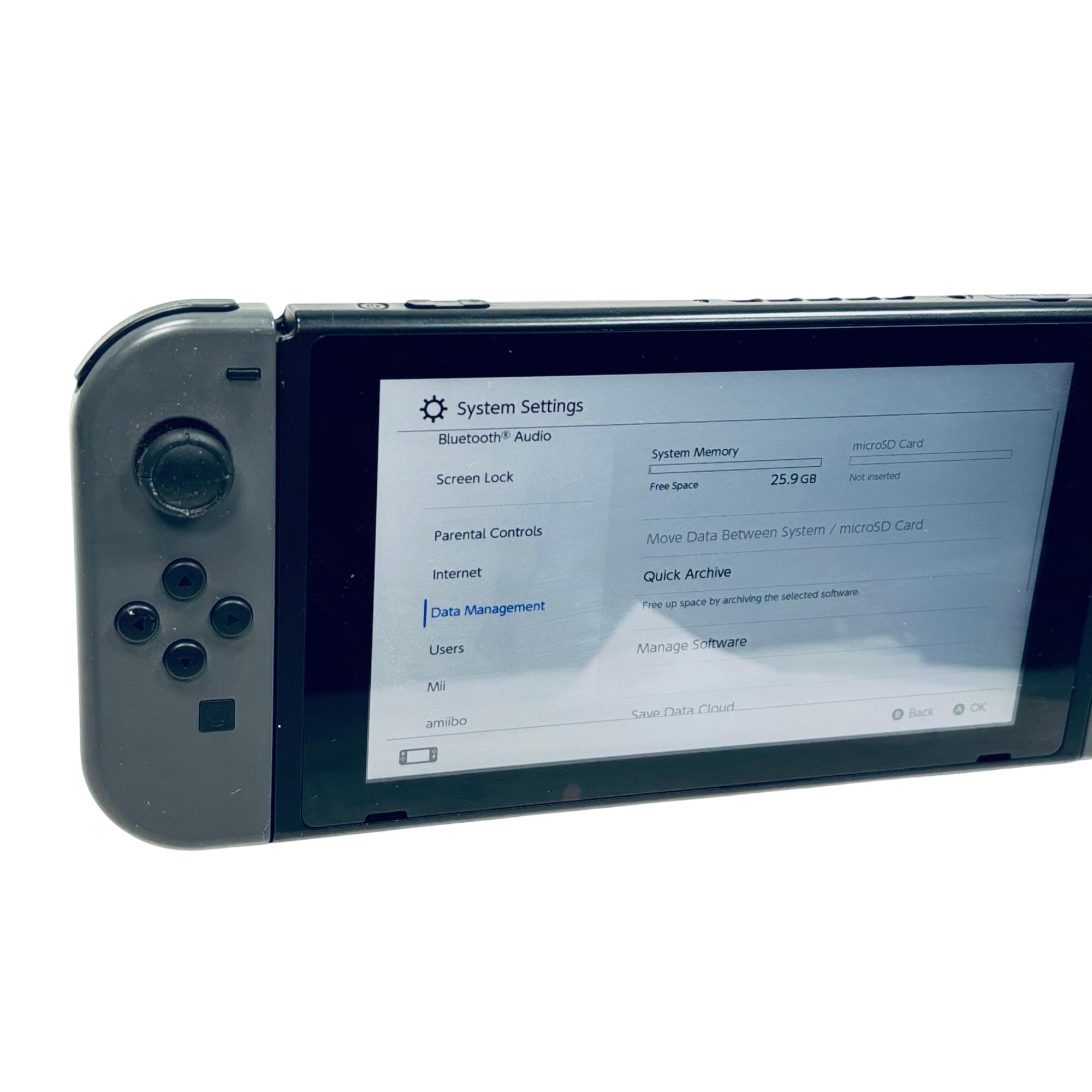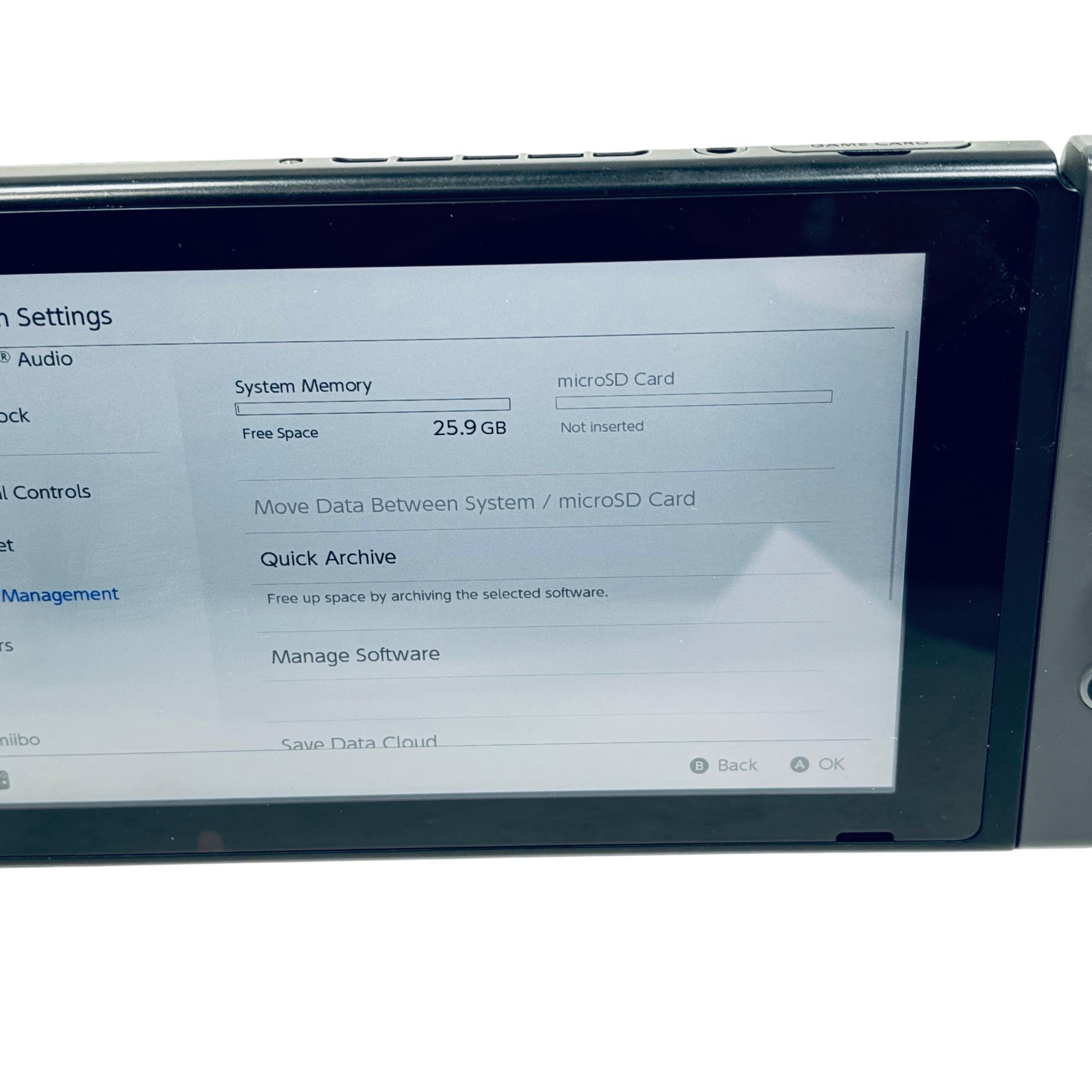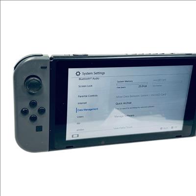 The Nintendo Switch HAC-001 32GB Video Game Console in black offers a versatile gaming experience with a touchscreen display and support for game cards and downloadable software. This electronic device features a compact design with system memory expandable via microSD card and easy software management options. Its interface provides settings for audio, storage, and data transfer, making it a popular gadget for portable and home gaming.