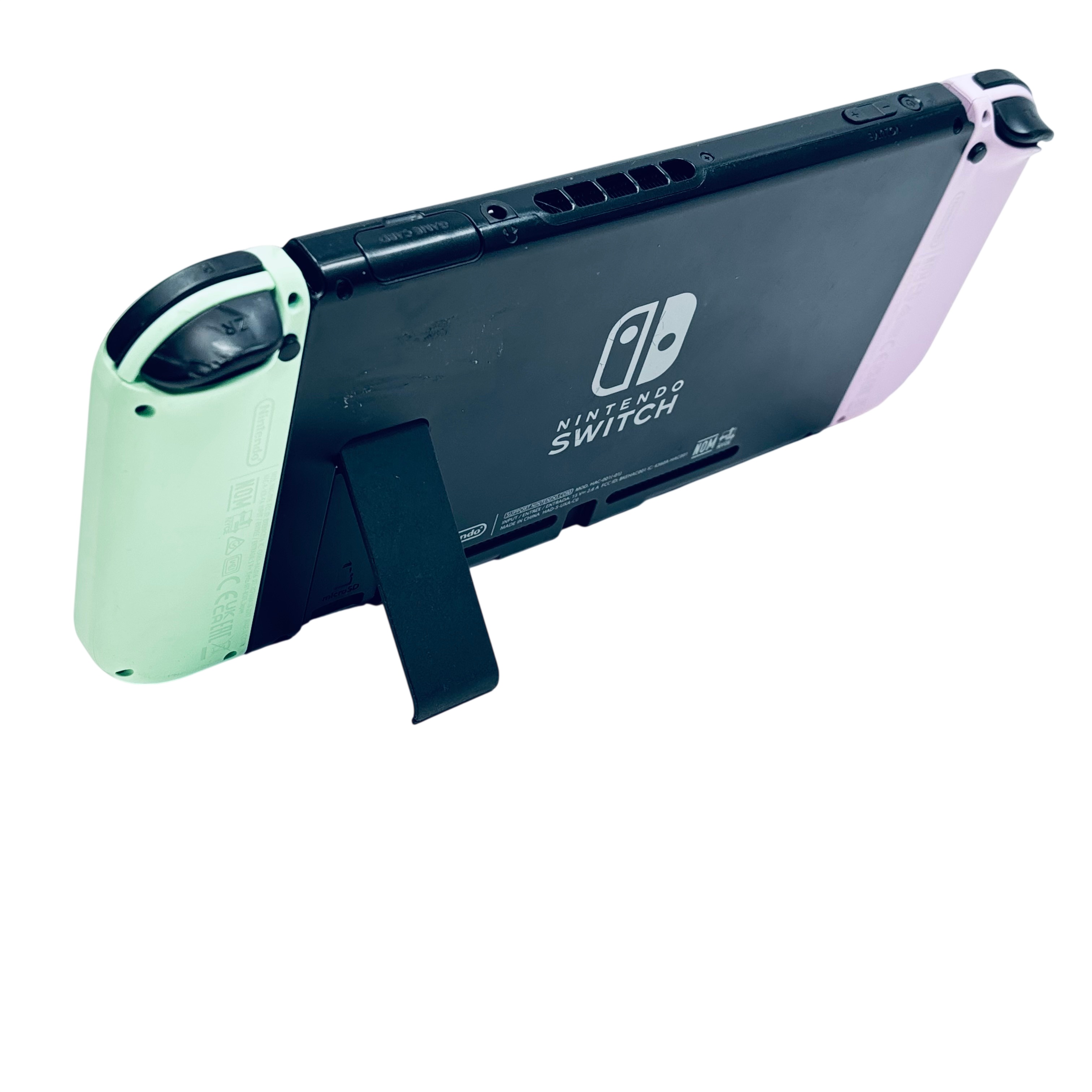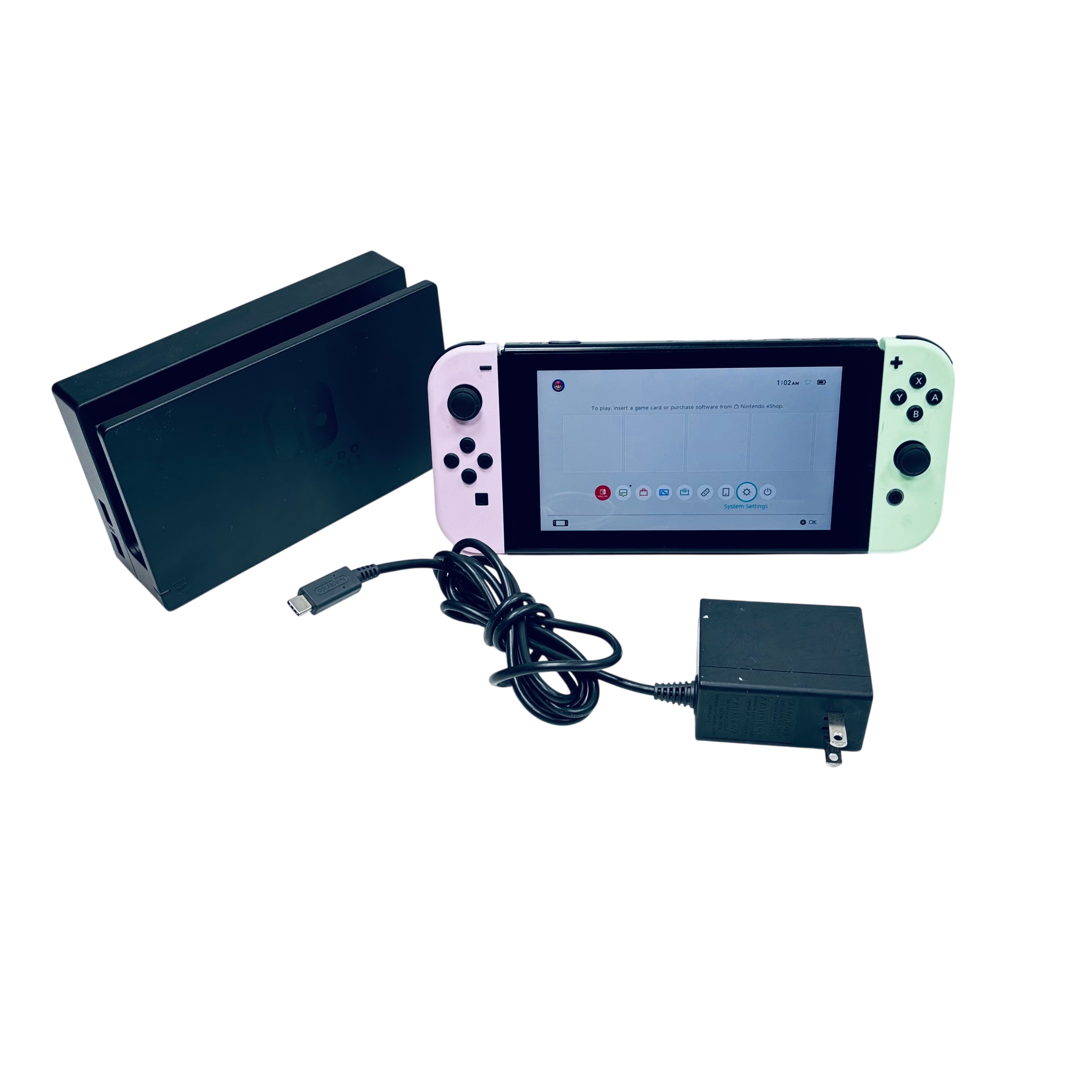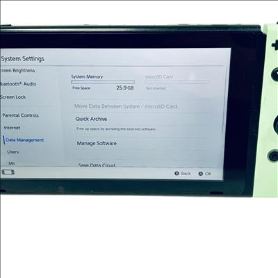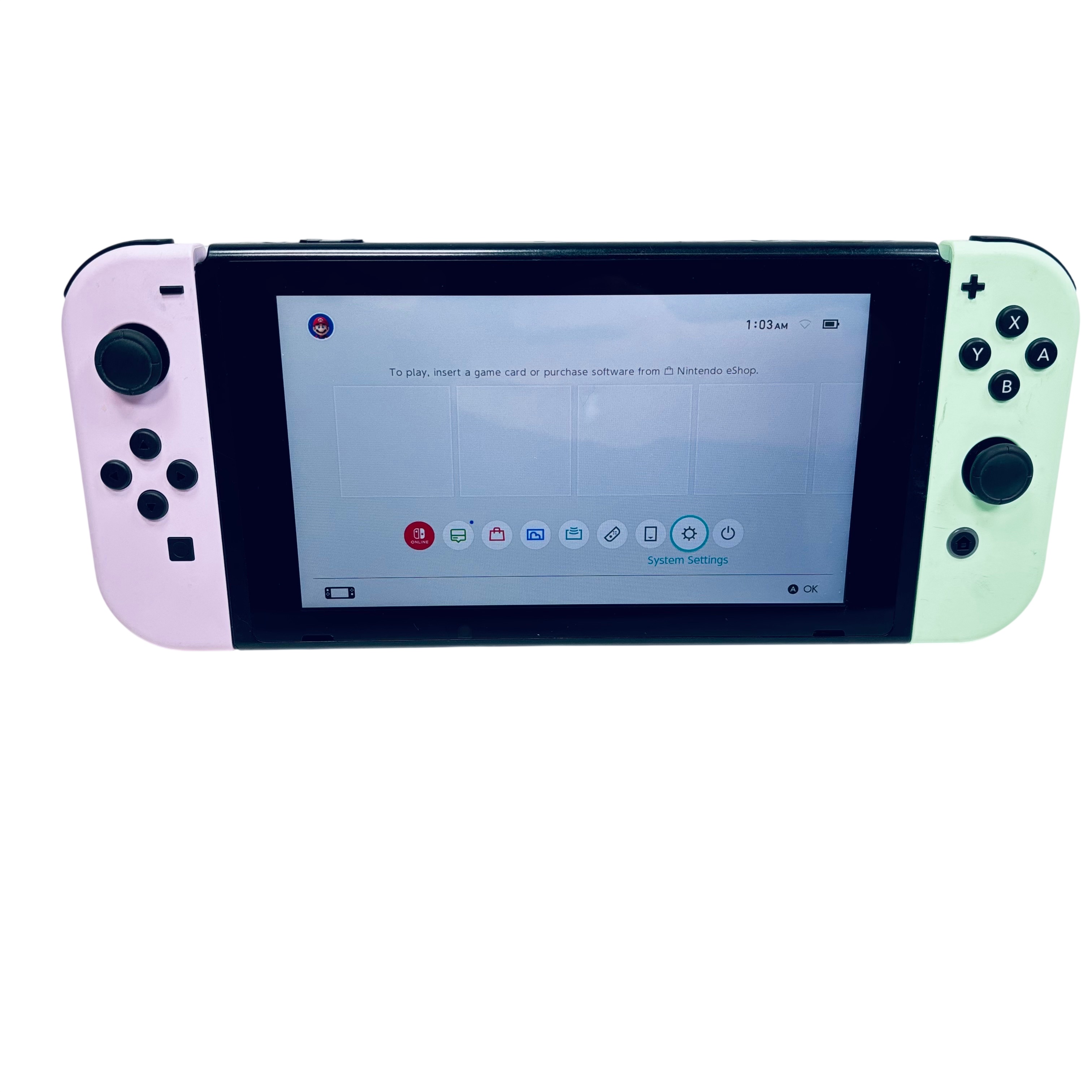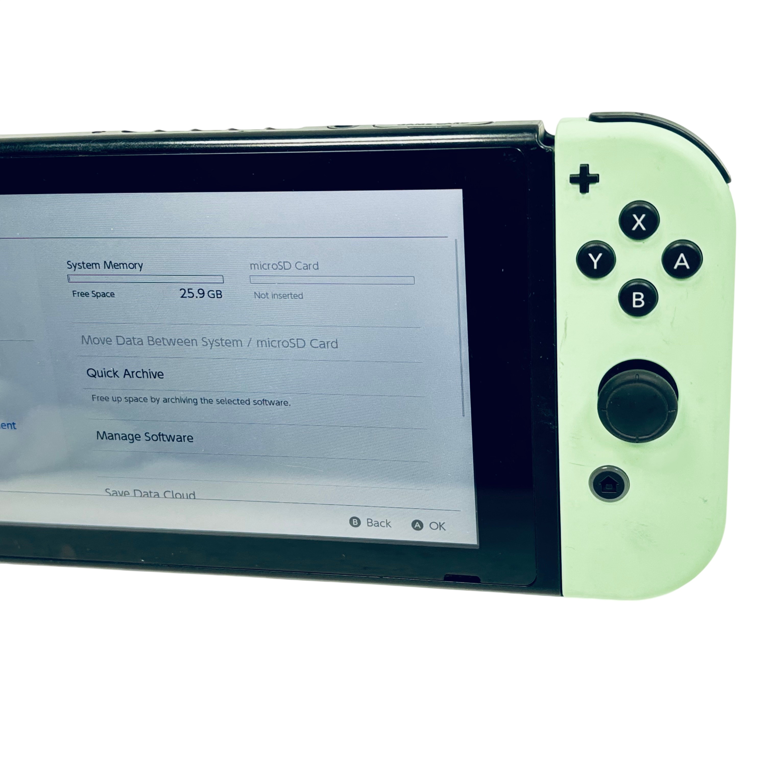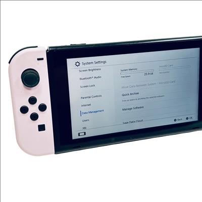 Nintendo Switch System HAC-001(-01) is a versatile hybrid video game console that offers both handheld and docked play modes. Featuring 32 GB of internal storage with approximately 25.9 GB free space, it supports expandable memory via a microSD card slot. This set includes the Nintendo Switch console with pink and white Joy-Con controllers, a docking station for TV connectivity, and an AC adapter for charging. Ideal for gaming on the go or at home, the system supports Bluetooth audio and offers parental controls, quick archive features, and cloud save data management.