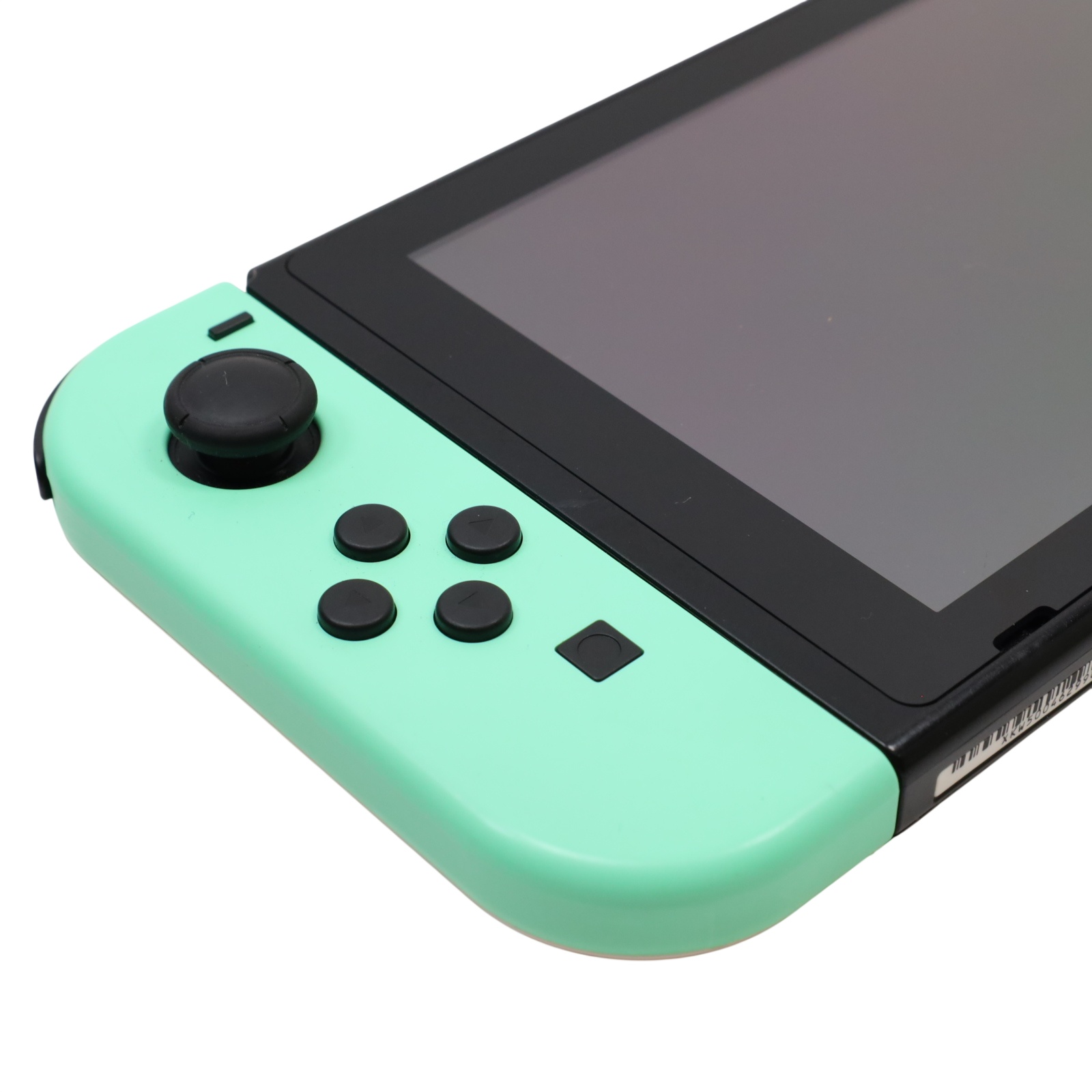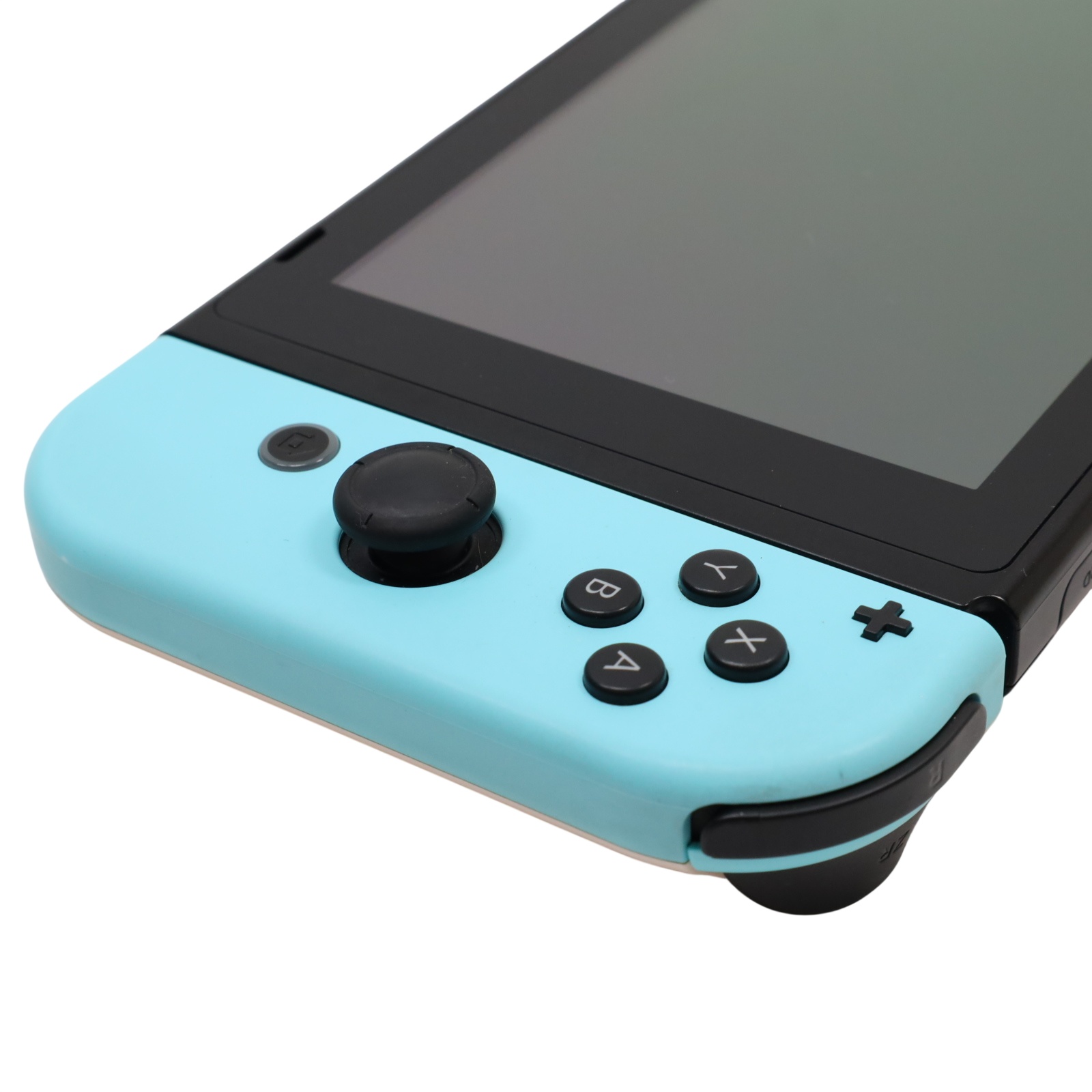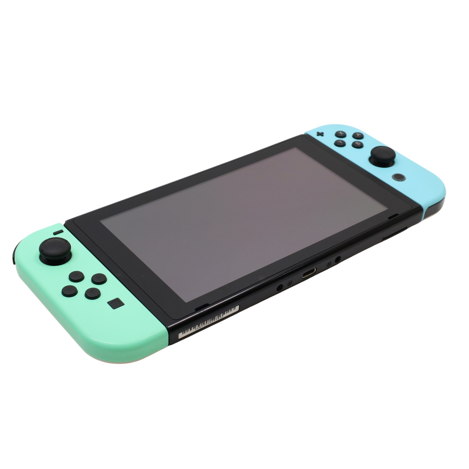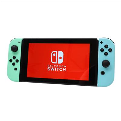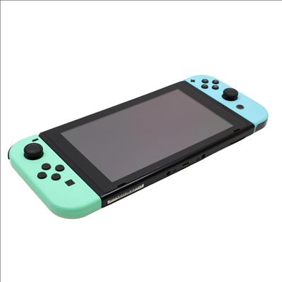 The Nintendo Switch Animal Crossing: New Horizons Edition is a special version of the popular Nintendo Switch console that features a unique design inspired by the beloved game, Animal Crossing: New Horizons. This limited edition console showcases a beautiful pastel blue and green color scheme, with a stylish pattern on the dock and Joy-Con controllers that depict iconic elements from the game, such as Tom Nook and his nephews, Timmy and Tommy. The console offers all the features and functionalities of the standard Nintendo Switch, including the ability to play games on the TV or in handheld mode, detachable Joy-Con controllers for multiplayer gaming, and access to a wide range of games and entertainment options. It's the perfect choice for Animal Crossing fans who want to immerse themselves in the charming world of the game while enjoying the versatility of the Nintendo Switch.