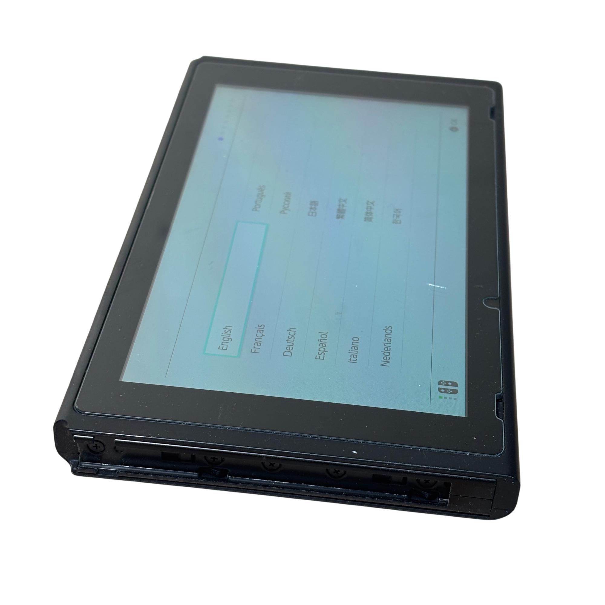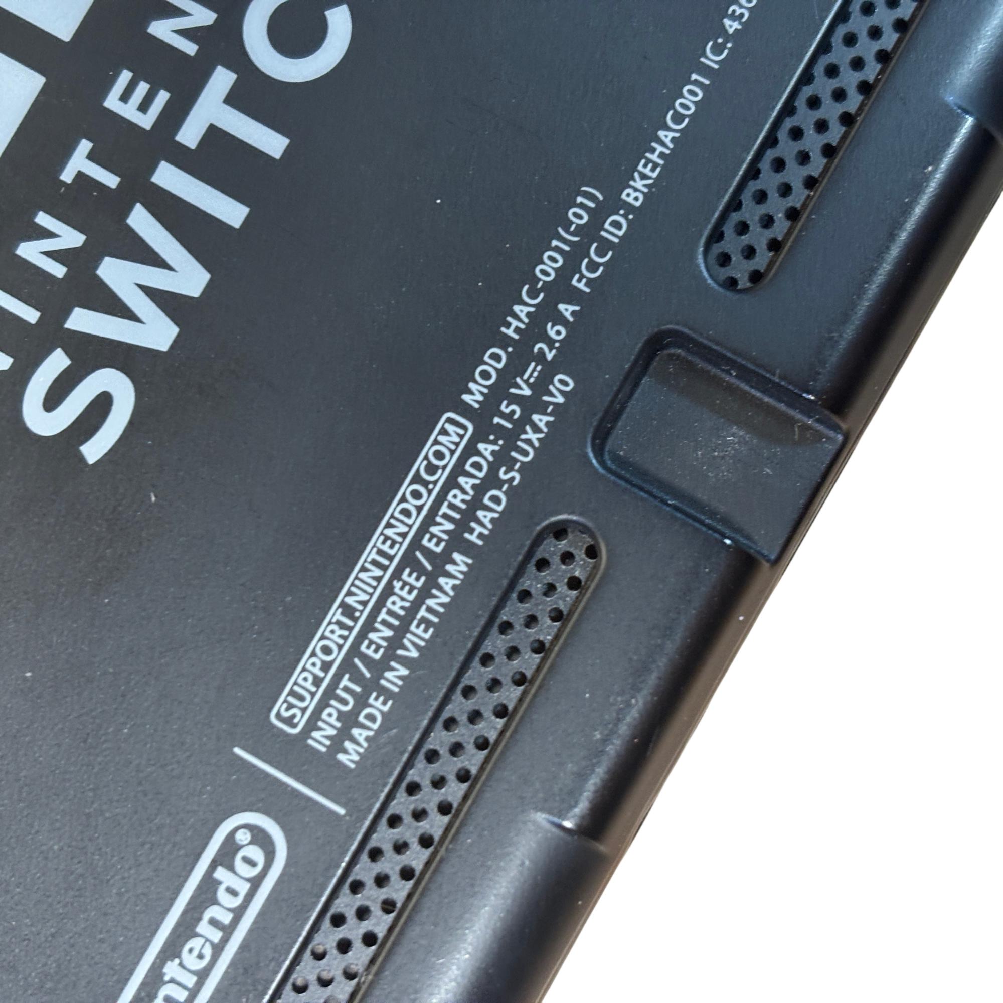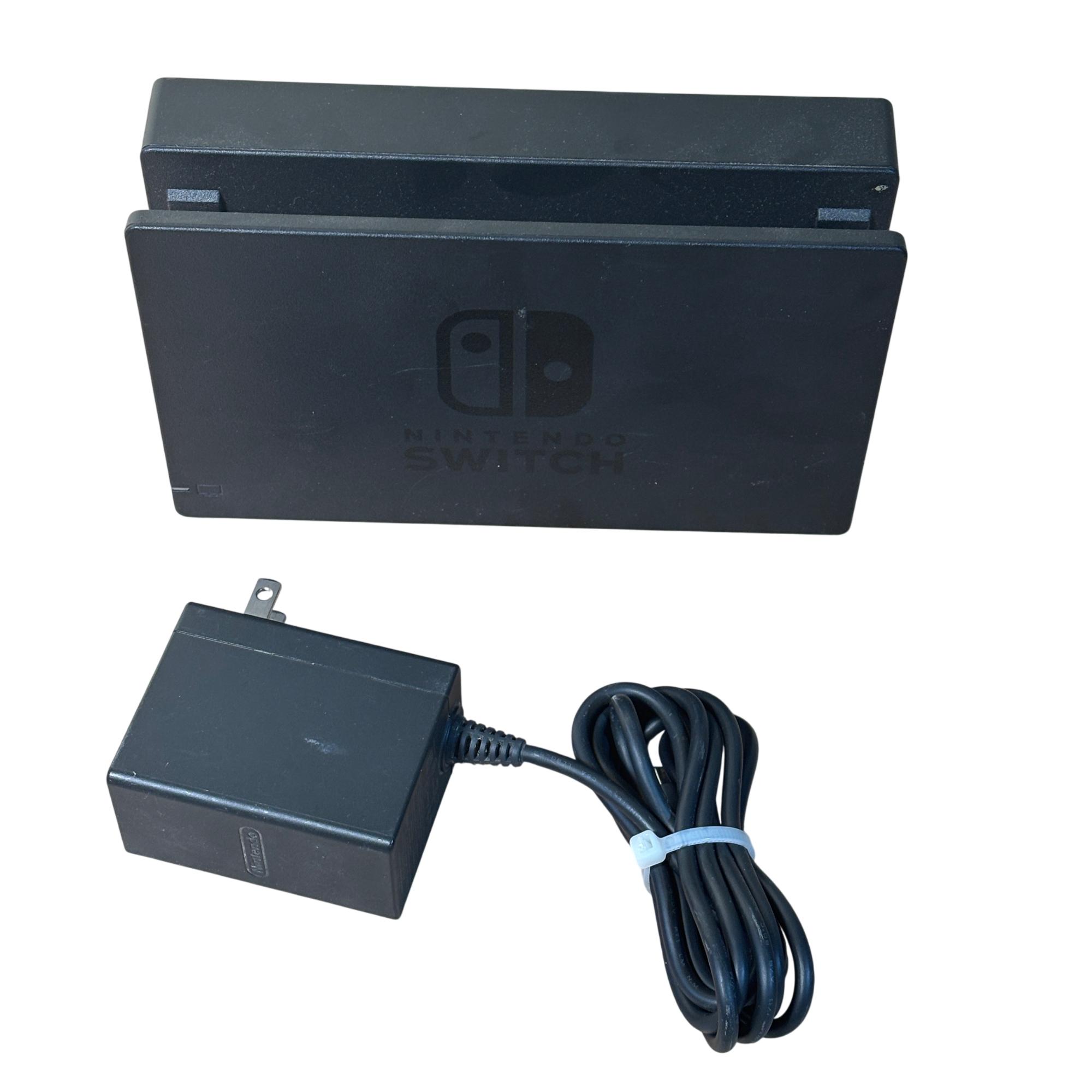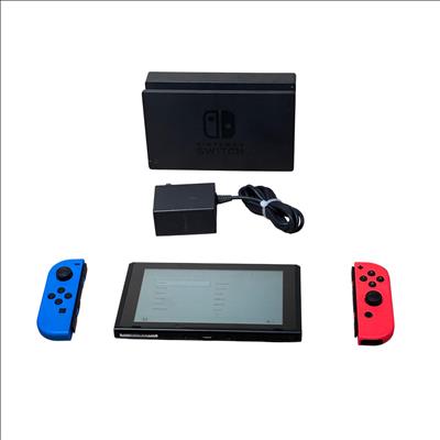Nintendo Switch Console HAC-001(-01) features a versatile gaming system with neon red and blue Joy-Con controllers designed for both handheld and docked play. The original dock allows seamless connection to a TV for immersive gaming experiences, while the compact design incorporates efficient power input and connectivity options for easy setup.