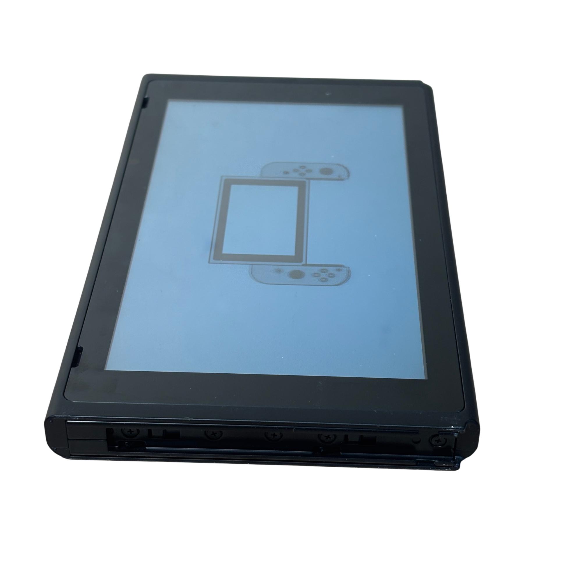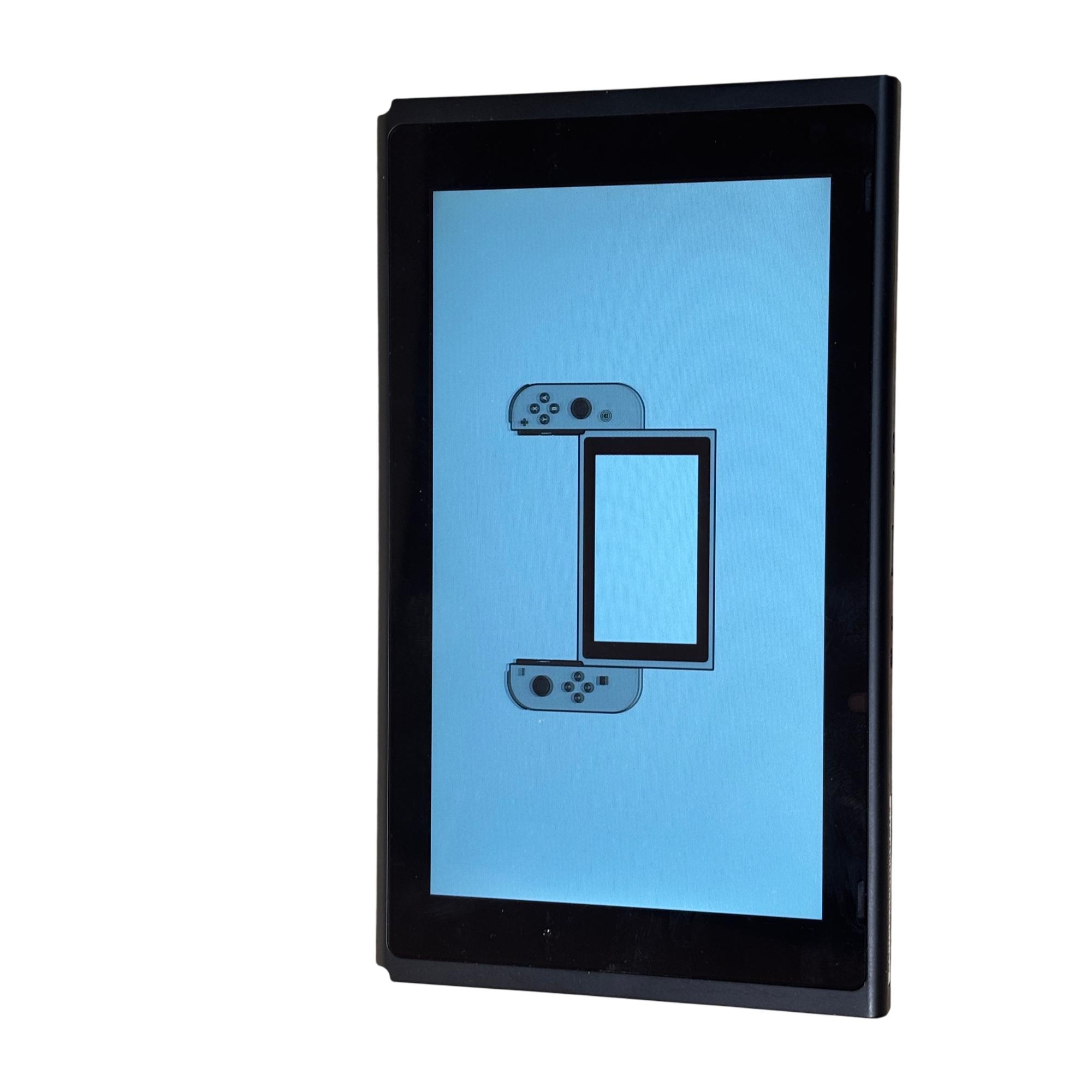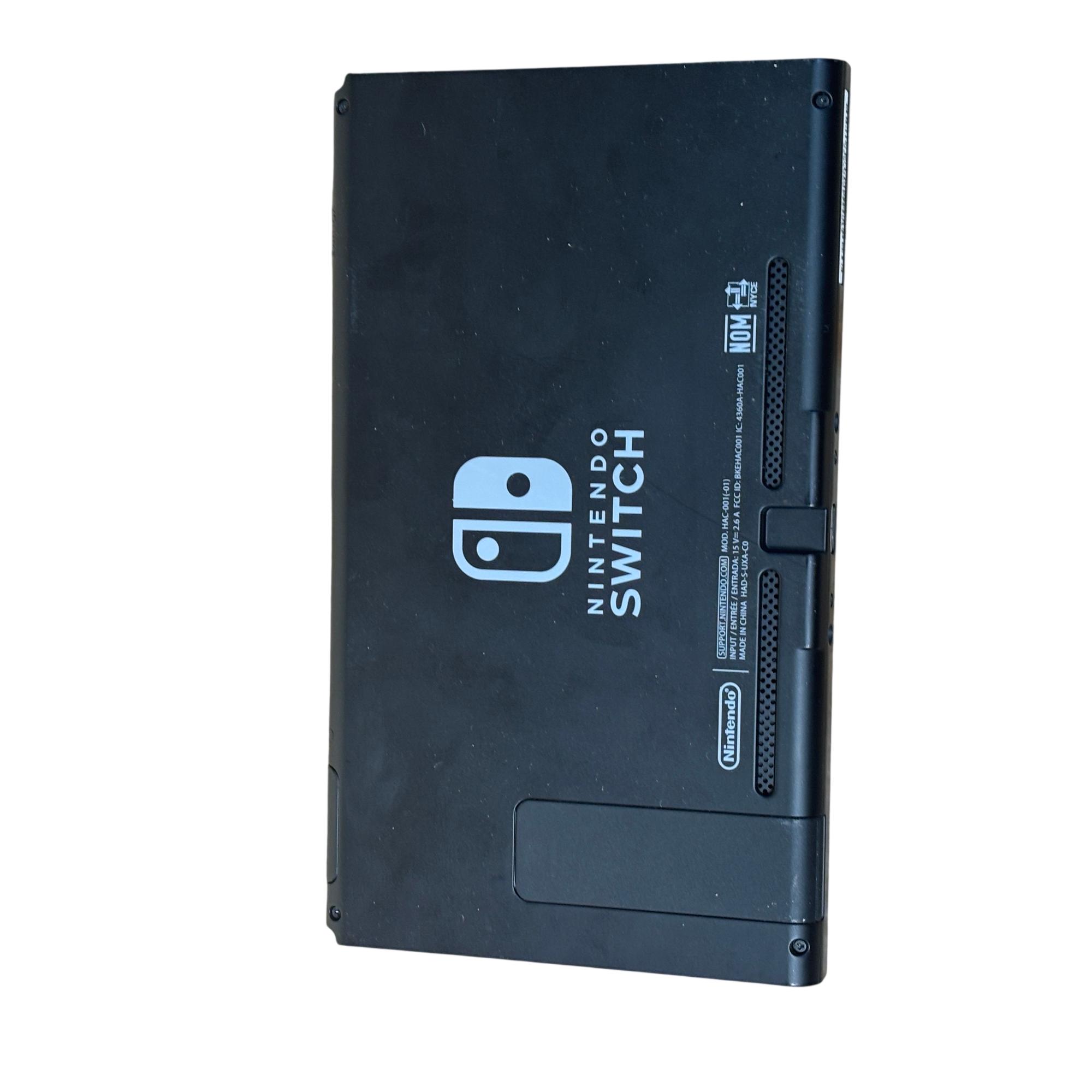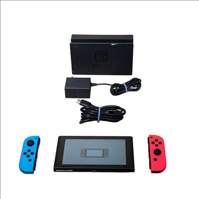 Nintendo Switch 2017 Model HAC-001 Console features a sleek rectangular design with a vibrant blue screen and detachable neon blue and neon red Joy-Con controllers for versatile gaming. This video game system includes a compact dock for seamless TV connectivity and precise control with ergonomic buttons. Known for combining handheld flexibility with home console power, this model supports immersive gameplay and quick setup through HDMI connectivity.