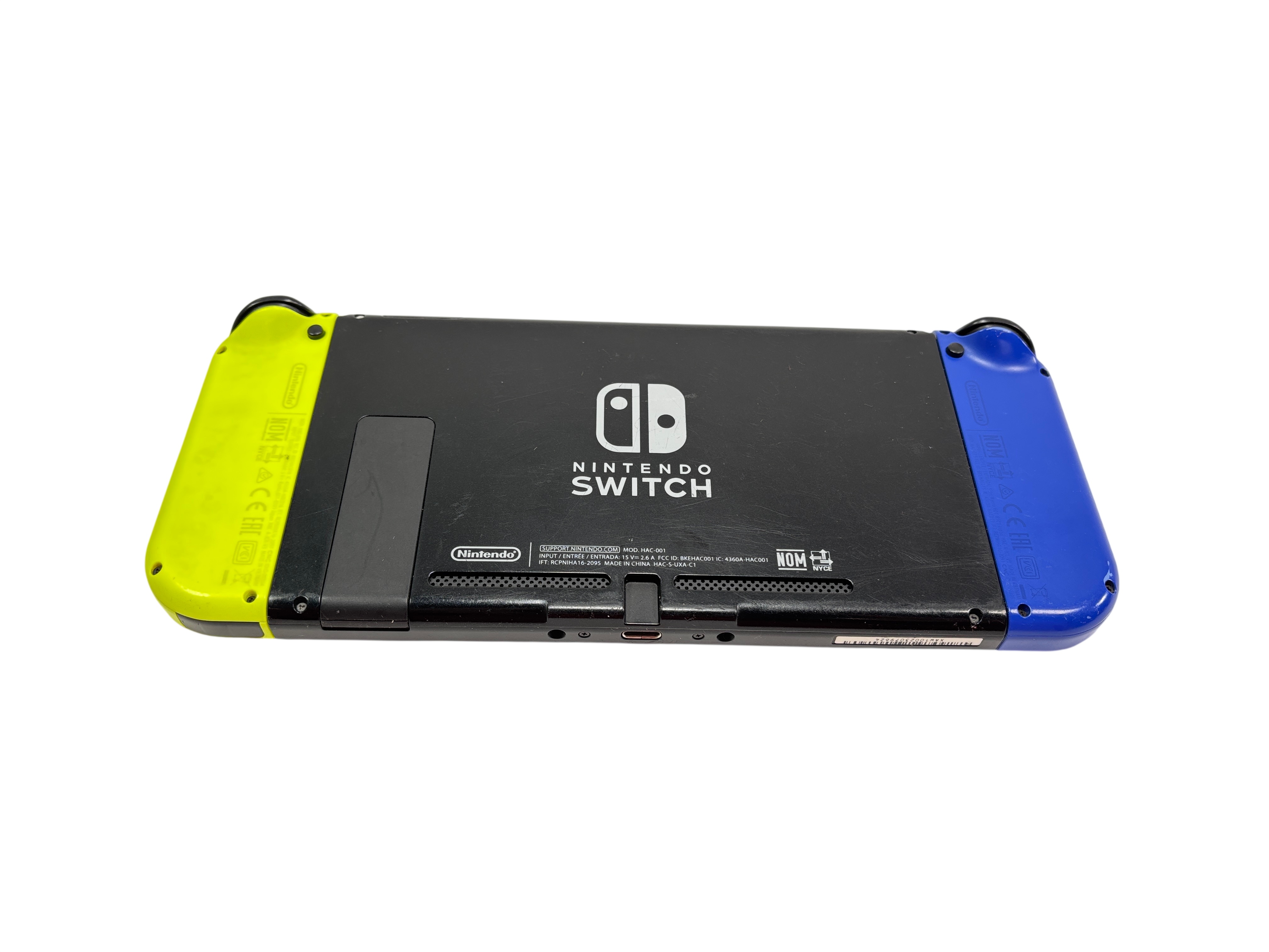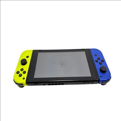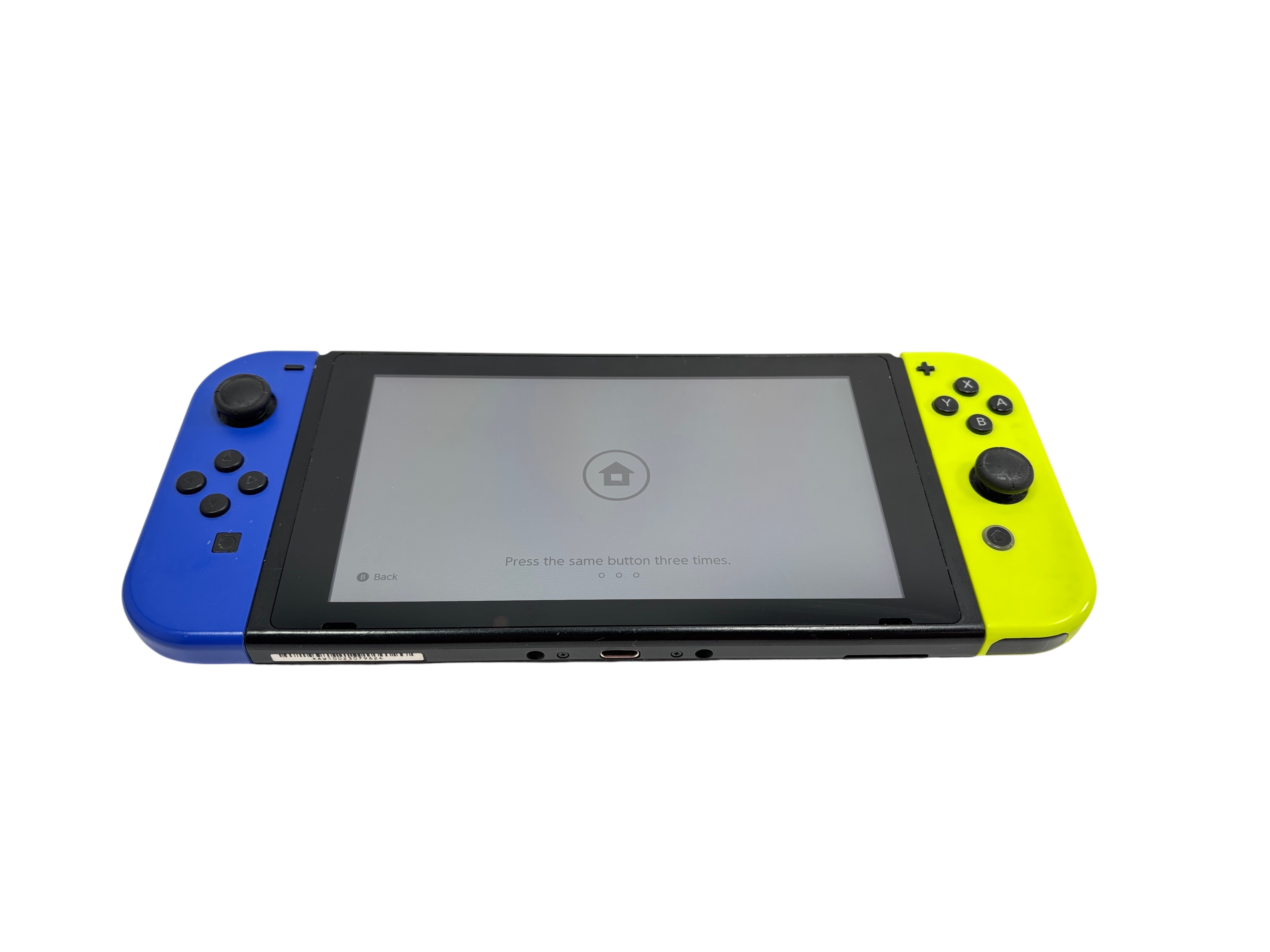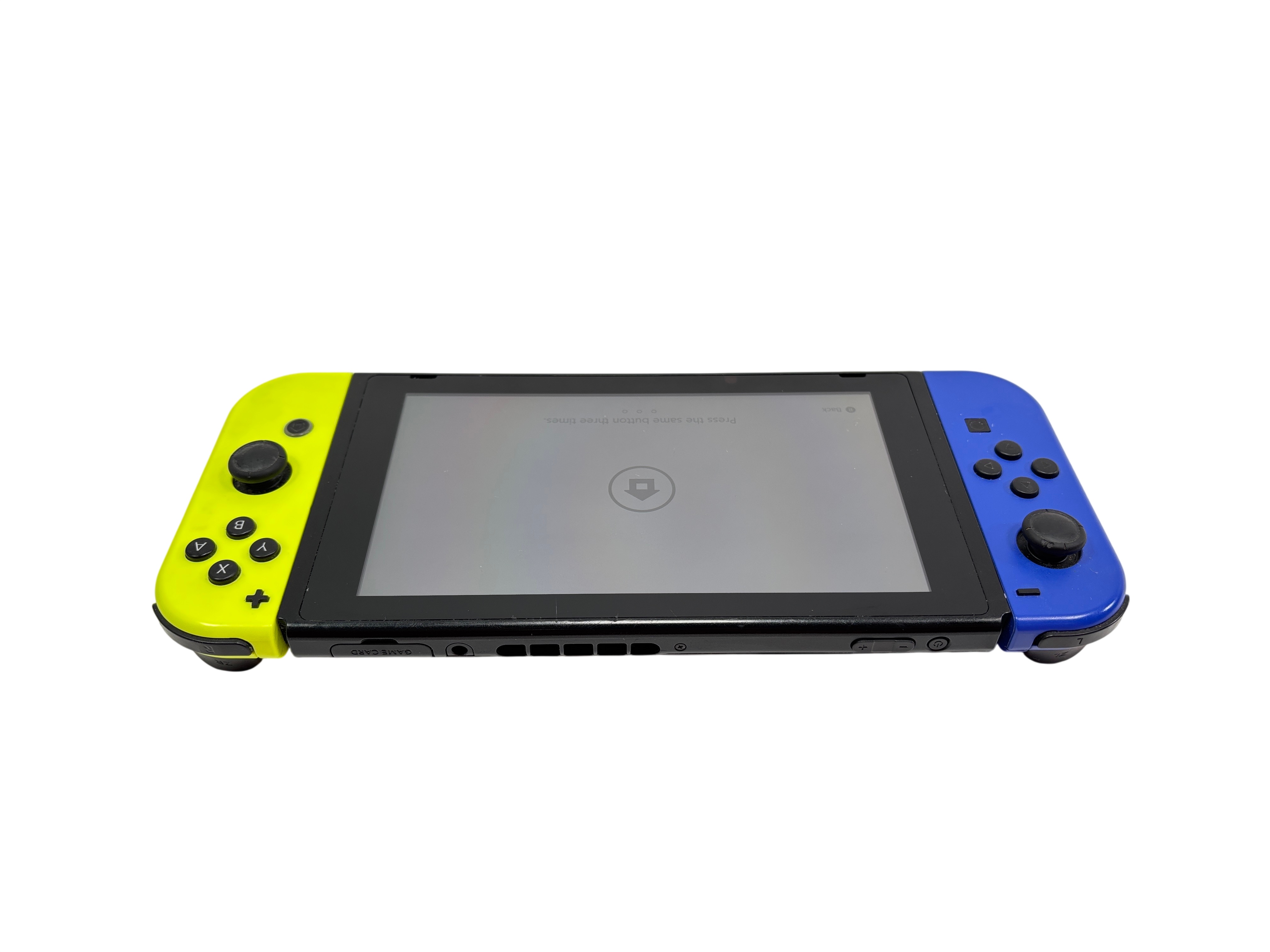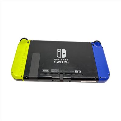 Nintendo Switch HAC-001 Console (No Dock) features a 6.2-inch capacitive multi-touch screen and comes with vibrant Blue and Neon Yellow Joy-Con controllers. This portable hybrid gaming system supports both handheld and TV mode (dock sold separately). Ideal for gaming on the go or at home, this model offers versatile play options in a compact design.