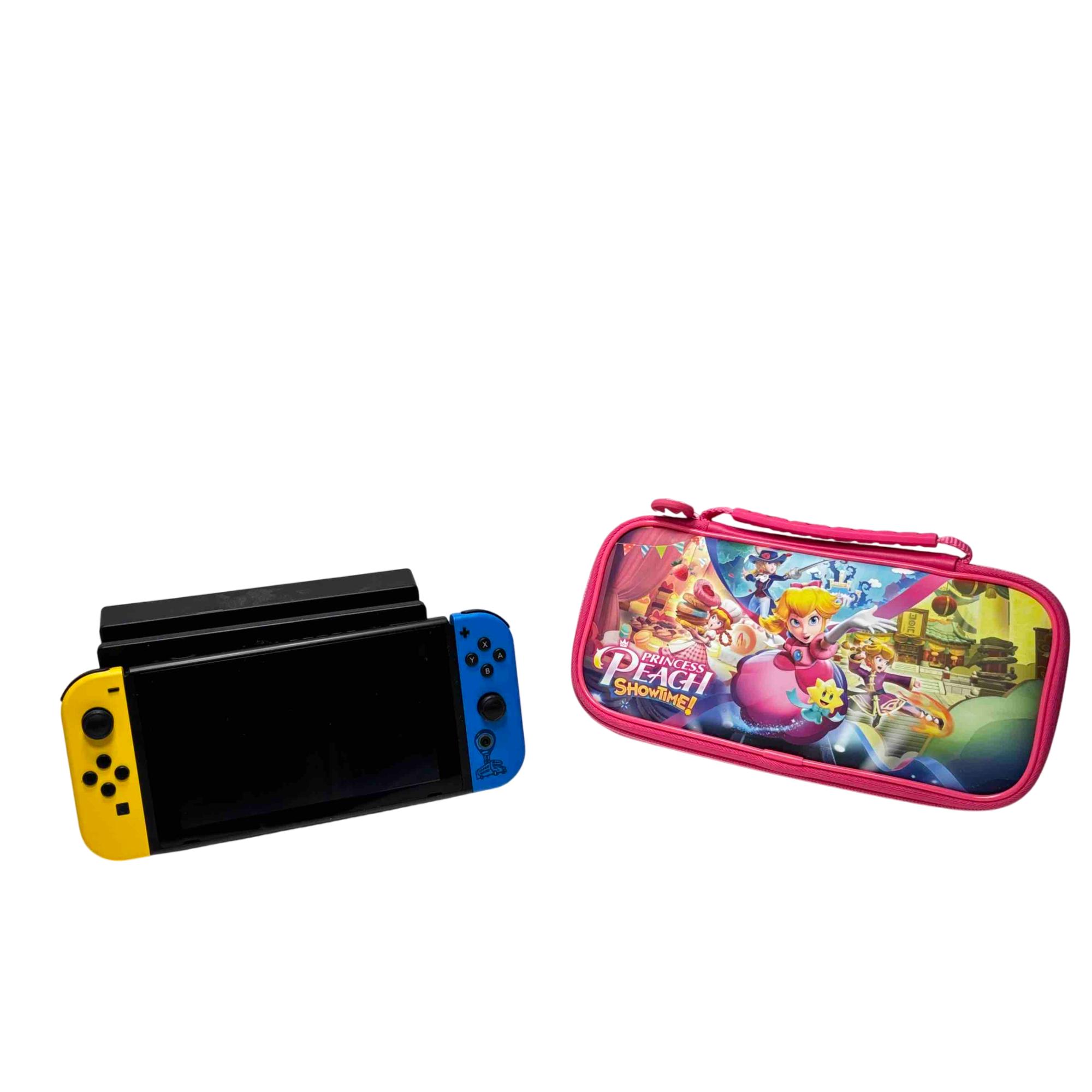 Experience the ultimate in gaming flexibility with the Nintendo Switch HAC-001 and Dock set. This portable gaming powerhouse, featuring vibrant blue and yellow Joy-Con controllers, allows you to seamlessly transition your gaming experience from handheld to TV mode. The exclusive Princess Peach Showtime! carrying case adds a touch of flair while offering protection on the go.
