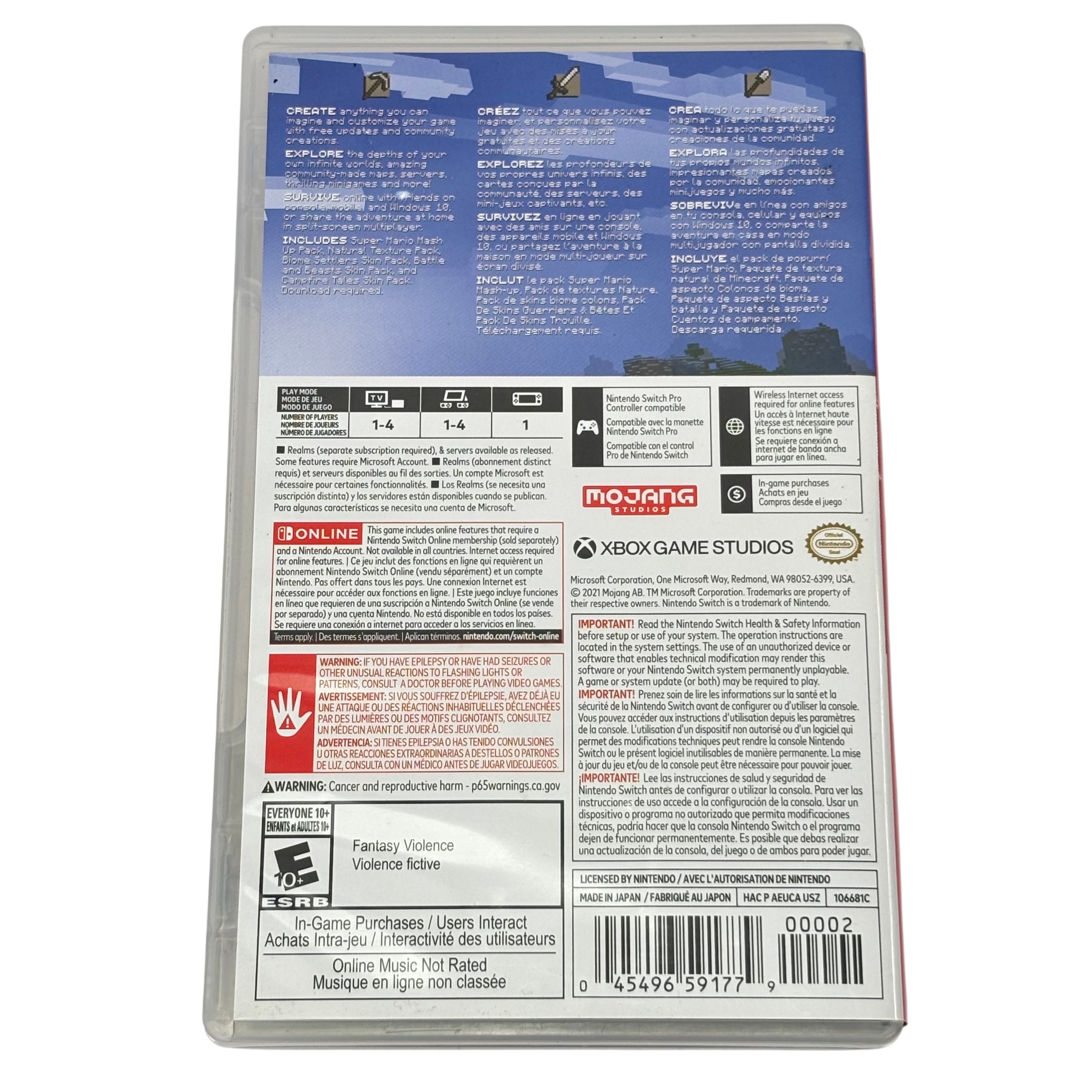 Nintendo Minecraft Switch Game Cartridge offers the classic Minecraft experience optimized for the Nintendo Switch platform. This physical game cartridge includes the popular Super Mario Mash-Up Pack along with additional texture and skin packs, providing a unique and fun twist to the Minecraft world. Rated Everyone 10+ by ESRB, the game supports both local and online multiplayer for 1 to 4 players, making it perfect for family and friends. The package includes the game cartridge and case, delivering a complete physical edition for Nintendo Switch gamers.
