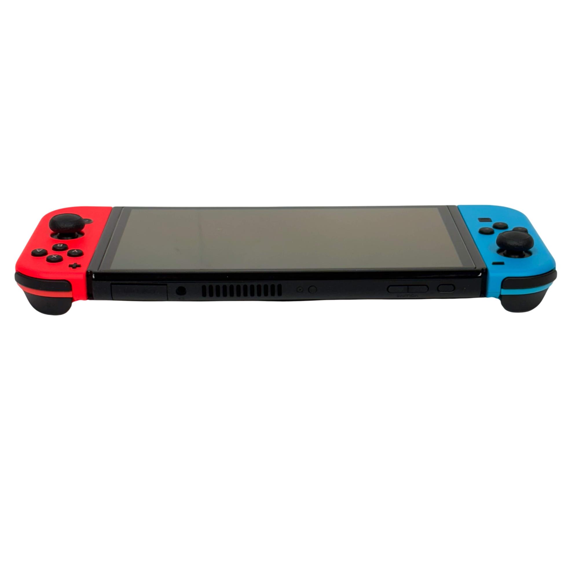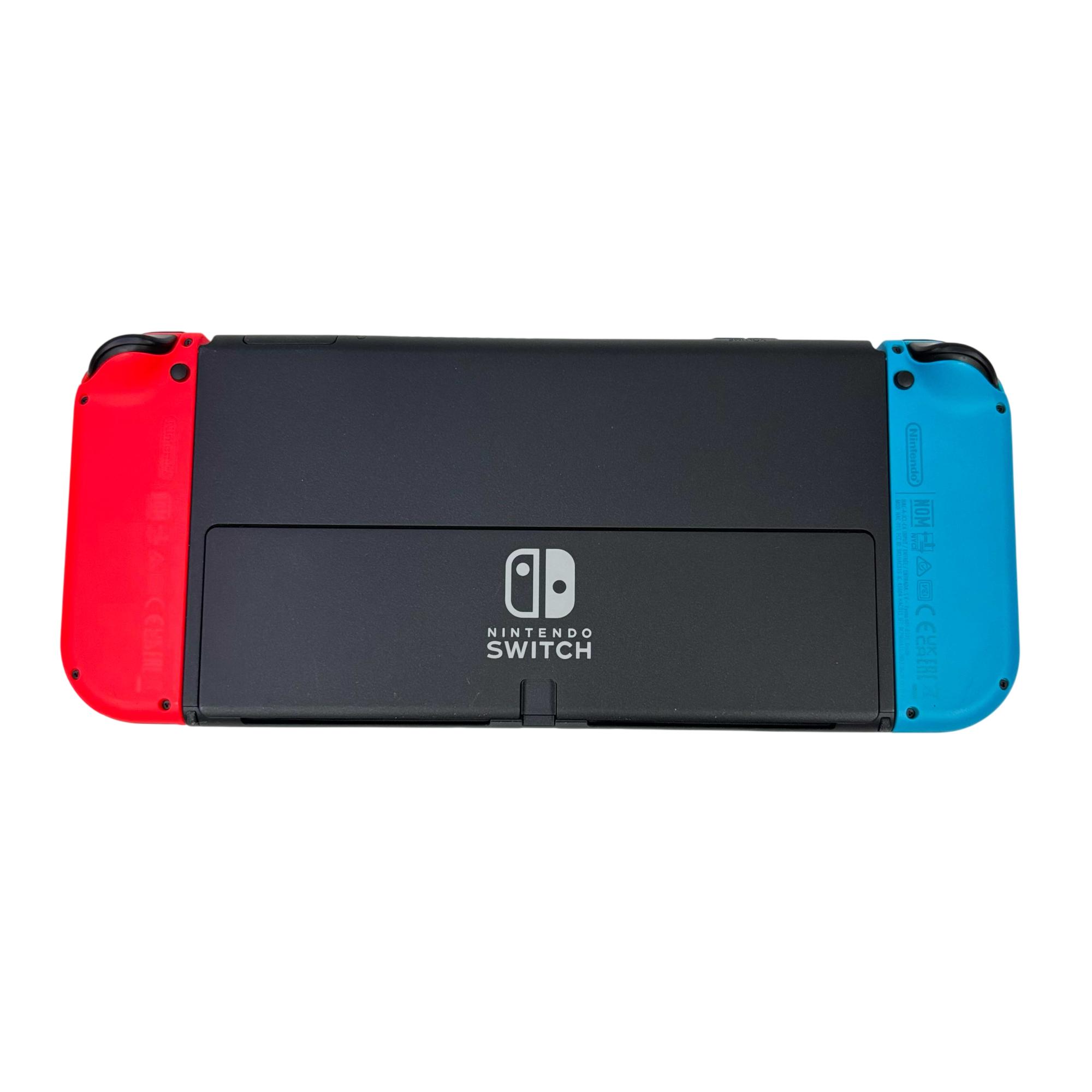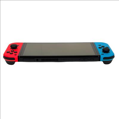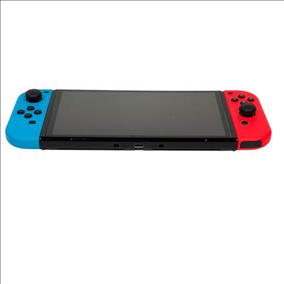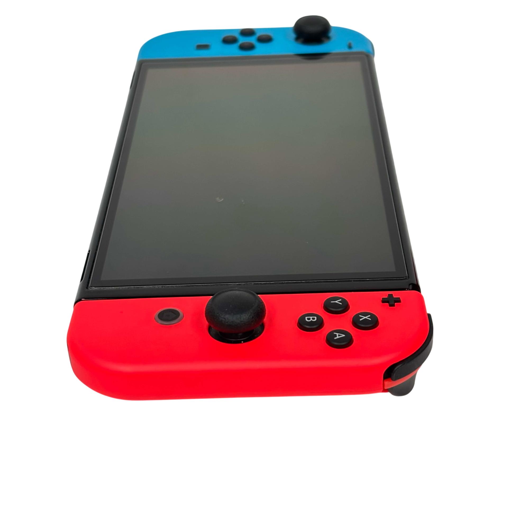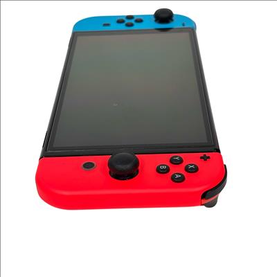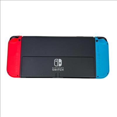 The Nintendo Switch OLED offers a vibrant 7-inch OLED screen that delivers stunning visuals and enhanced color contrast for an immersive gaming experience. This versatile video game console can be used in handheld mode, docked to a TV, or in tabletop mode, featuring detachable neon red and blue Joy-Con controllers for flexible multiplayer gameplay and motion controls.