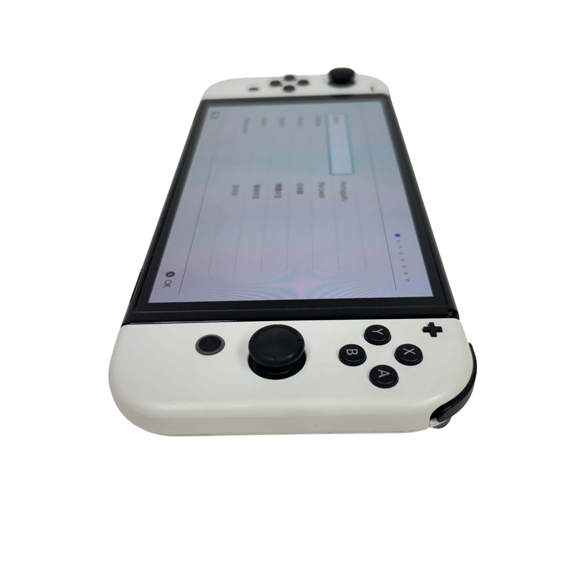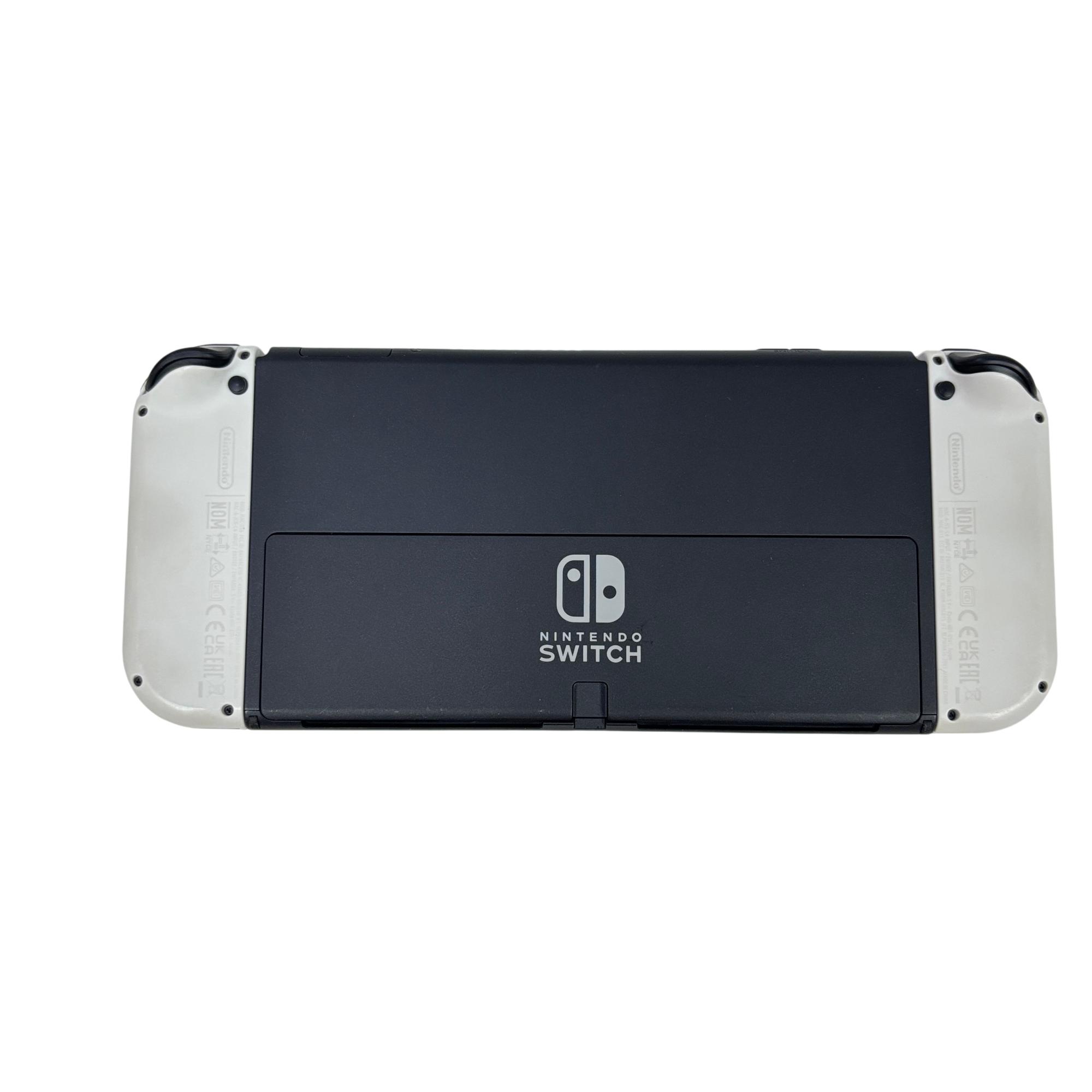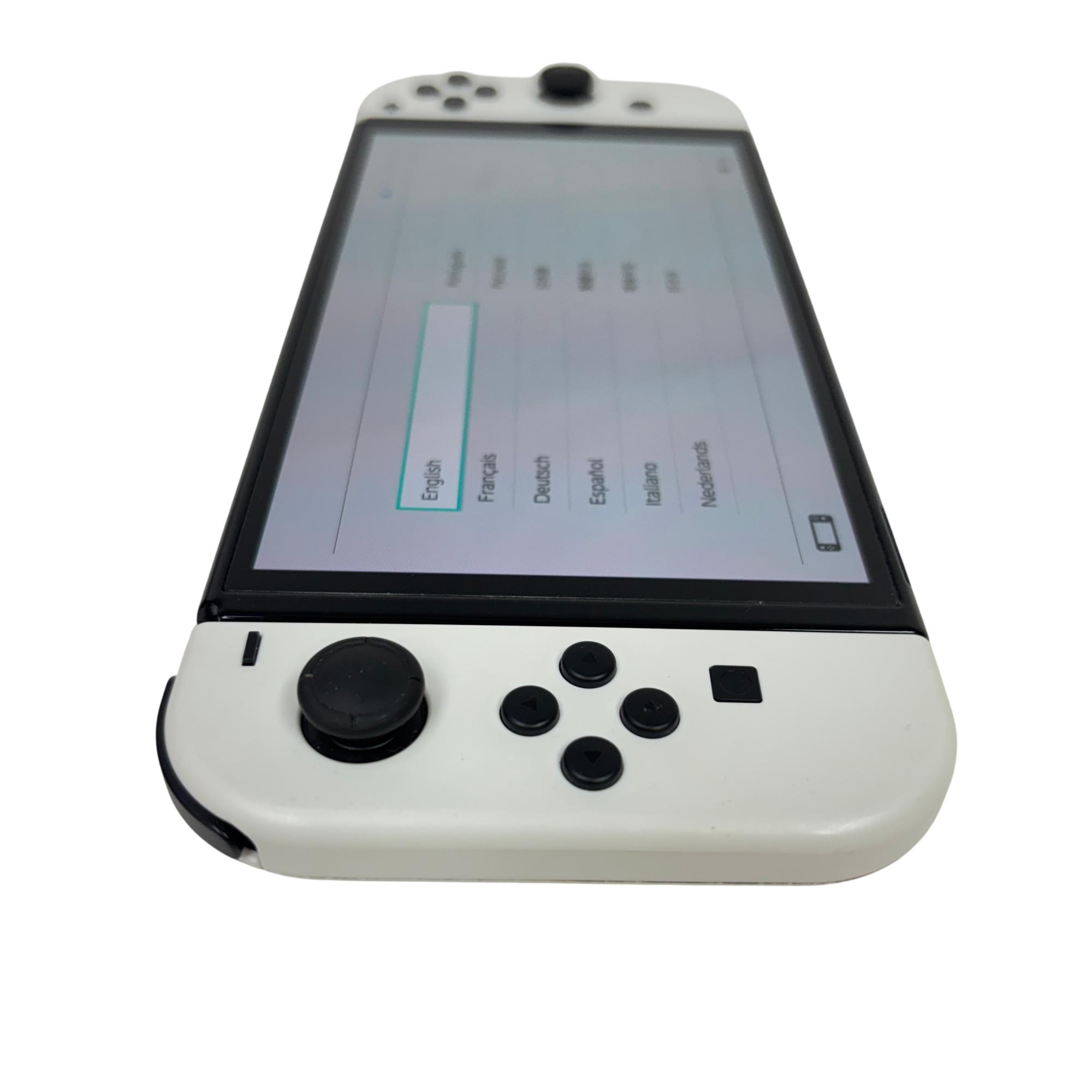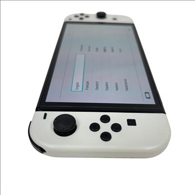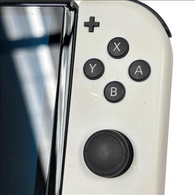 This Nintendo Switch OLED features a vibrant OLED screen that enhances visual clarity and color richness for an immersive gaming experience. This handheld console offers a sleek design with white Joy-Con controllers and 64GB of internal storage, making it ideal for portable gaming on the go.