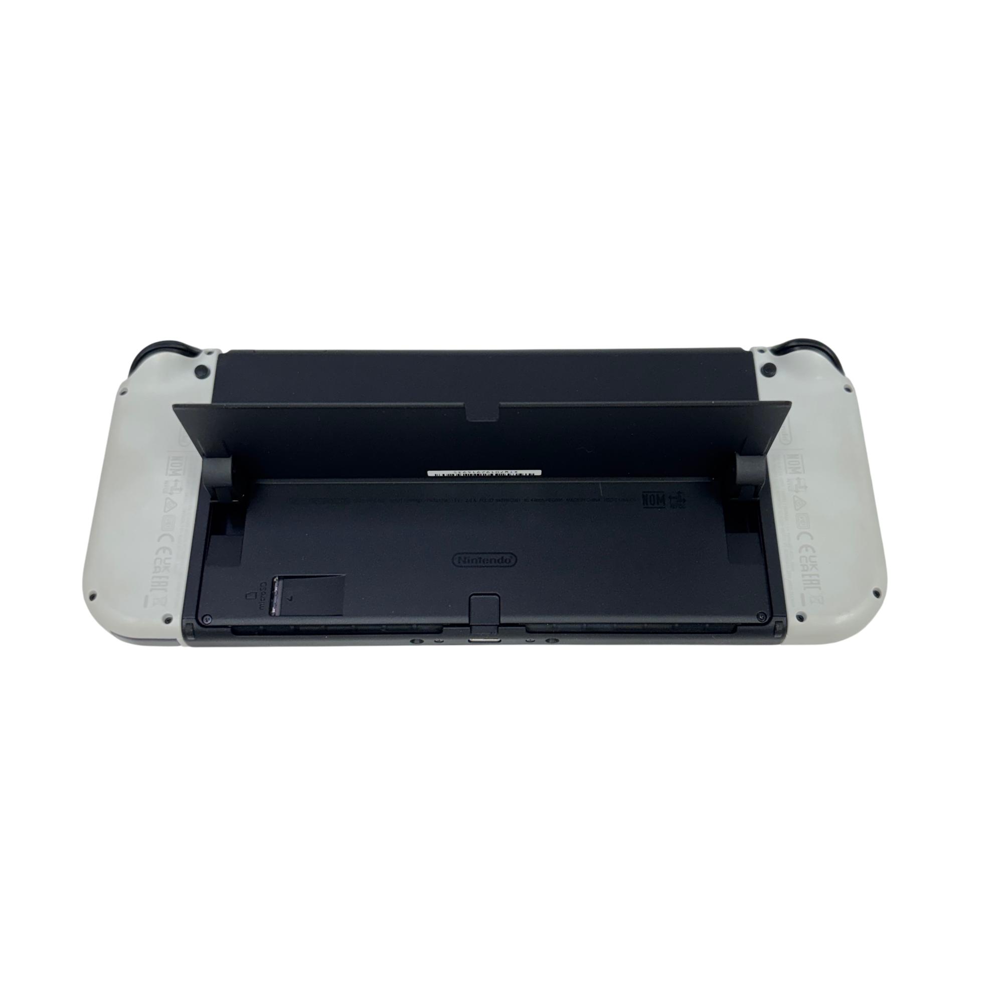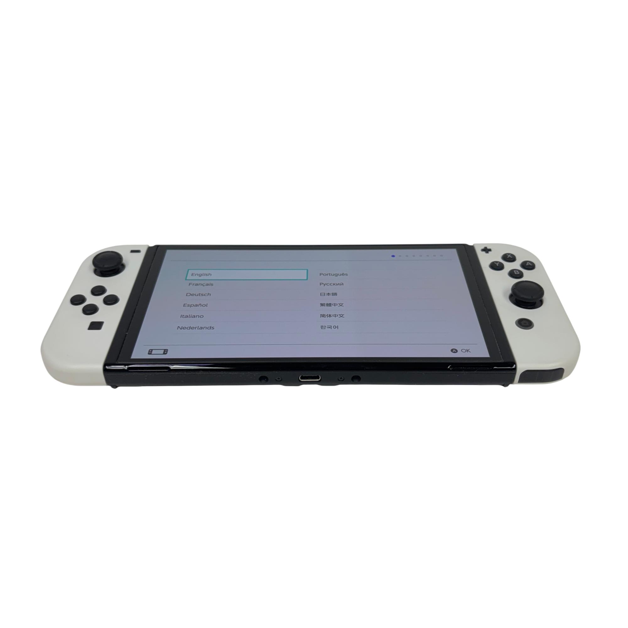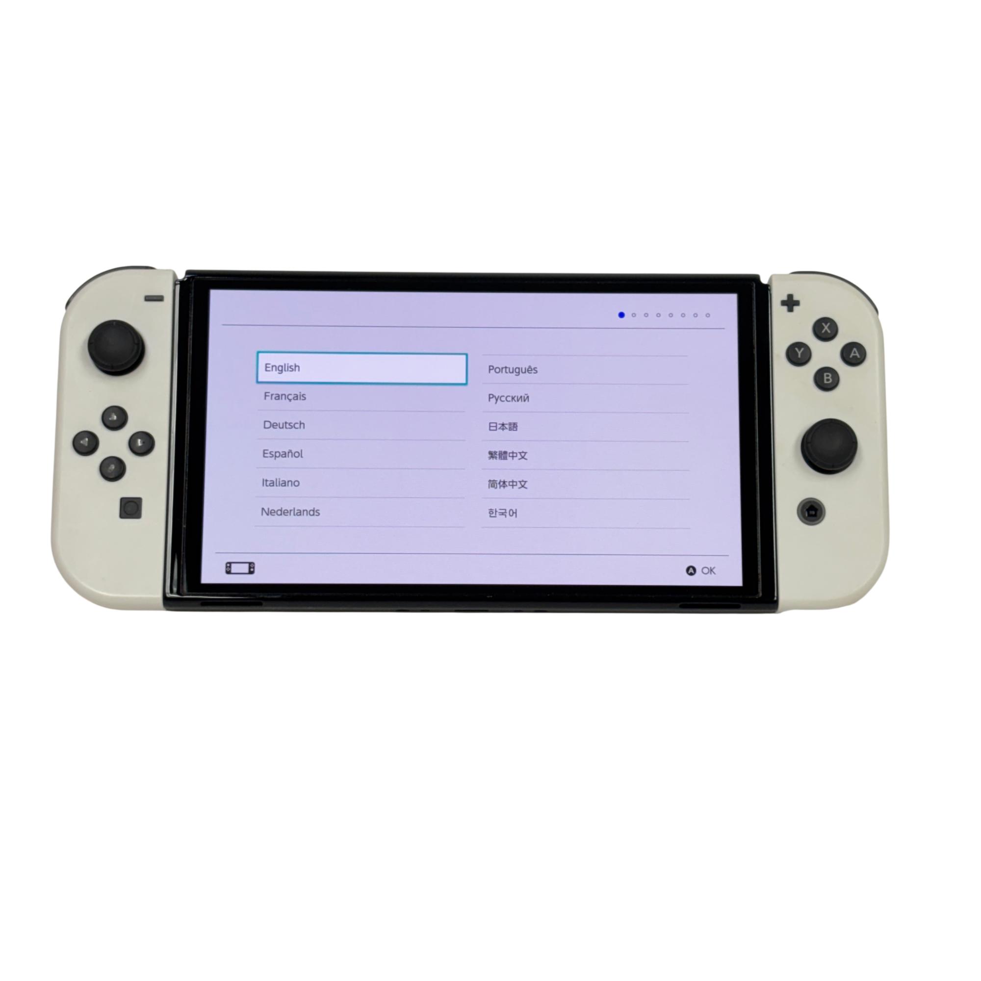 This Nintendo Switch OLED features a vibrant OLED screen that enhances visual clarity and color richness for an immersive gaming experience. This handheld console offers a sleek design with white Joy-Con controllers and 64GB of internal storage, making it ideal for portable gaming on the go.