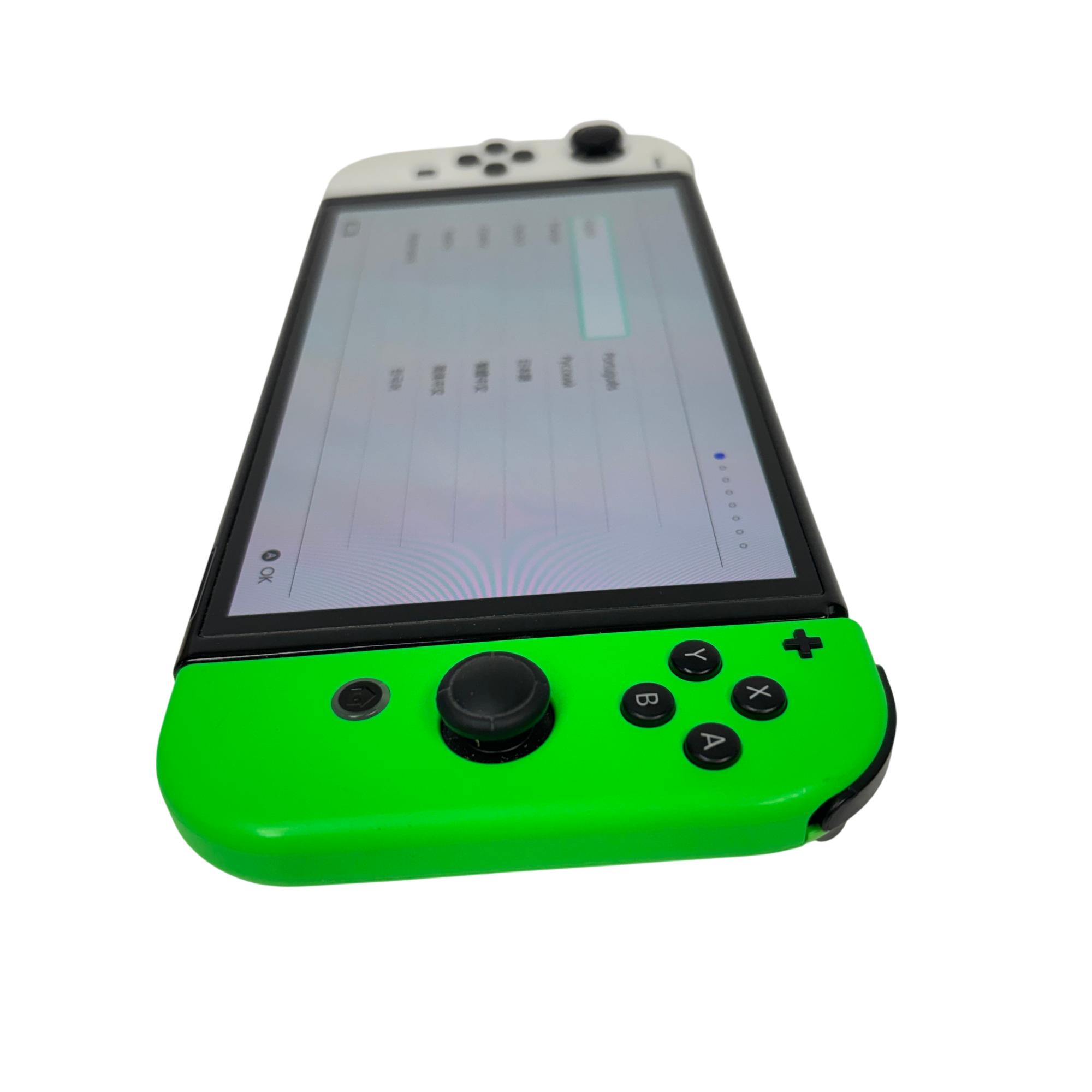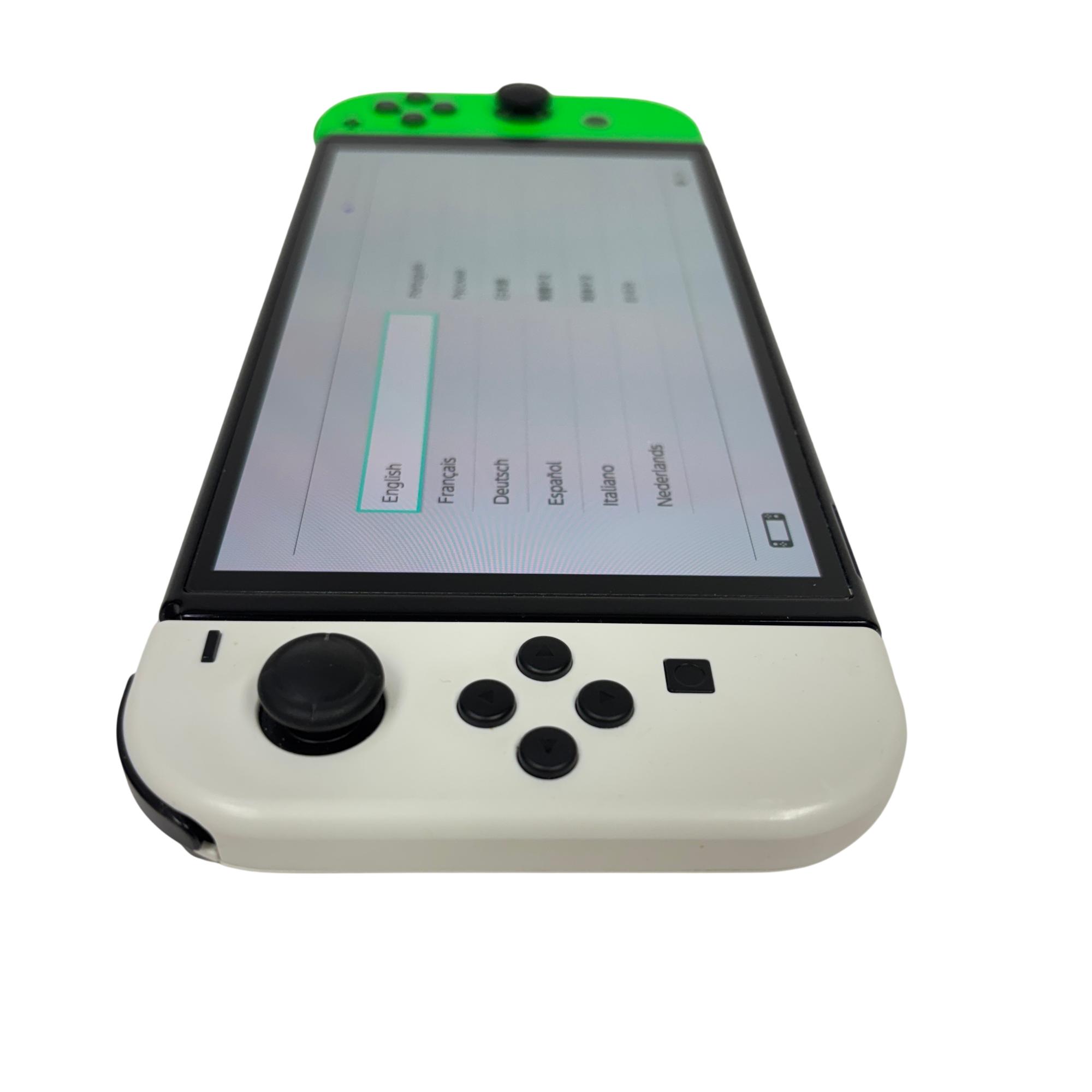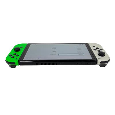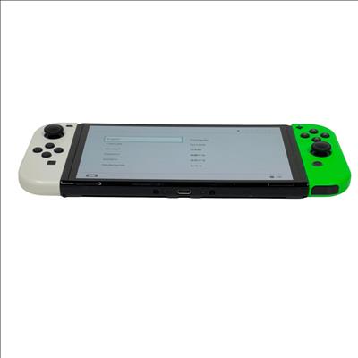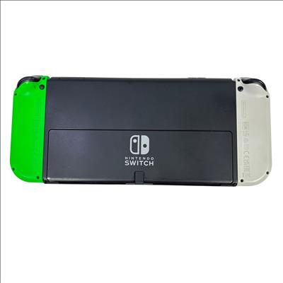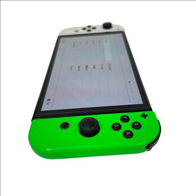 This Nintendo Switch OLED Console features a vibrant 7-inch OLED screen that delivers enhanced color and contrast for an immersive gaming experience. This model includes white and neon green Joy-Con controllers designed for comfortable gameplay, paired with sleek black and green accents. Its compact and portable design makes it ideal for both home and on-the-go gaming sessions.