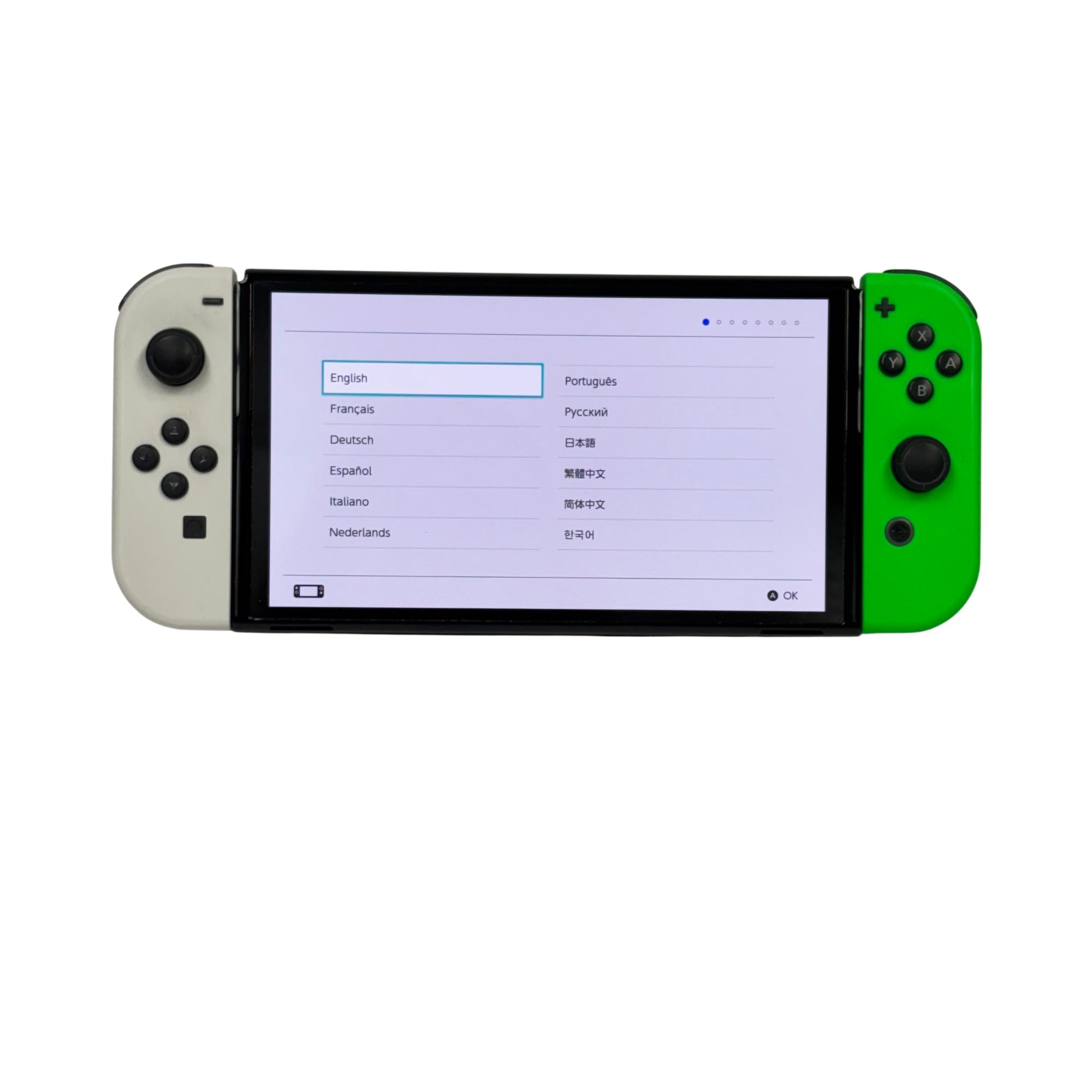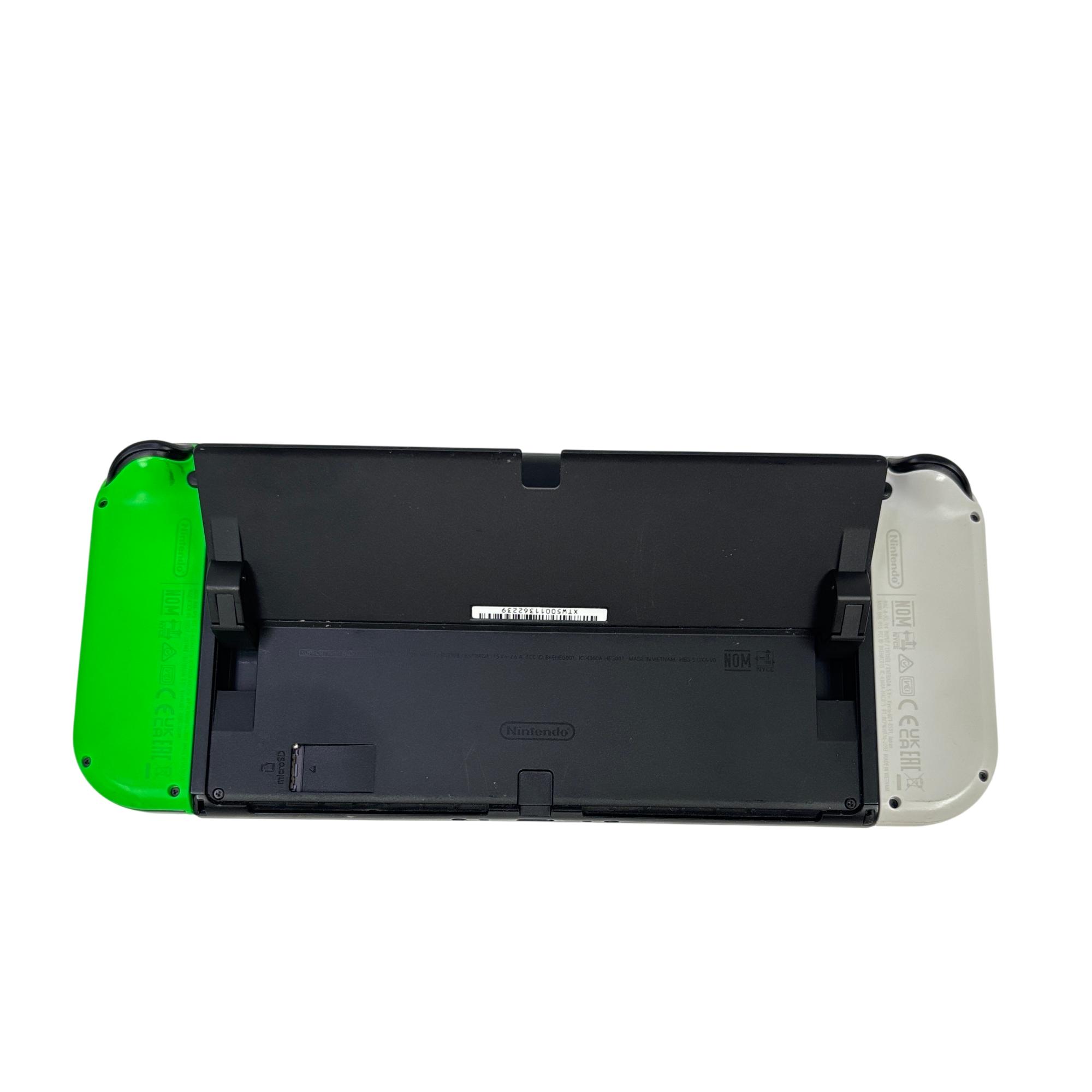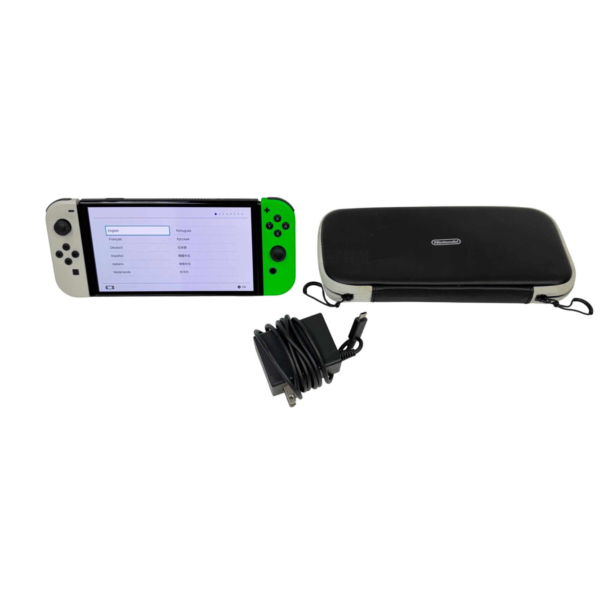 This Nintendo Switch OLED Console features a vibrant 7-inch OLED screen that delivers enhanced color and contrast for an immersive gaming experience. This model includes white and neon green Joy-Con controllers designed for comfortable gameplay, paired with sleek black and green accents. Its compact and portable design makes it ideal for both home and on-the-go gaming sessions.