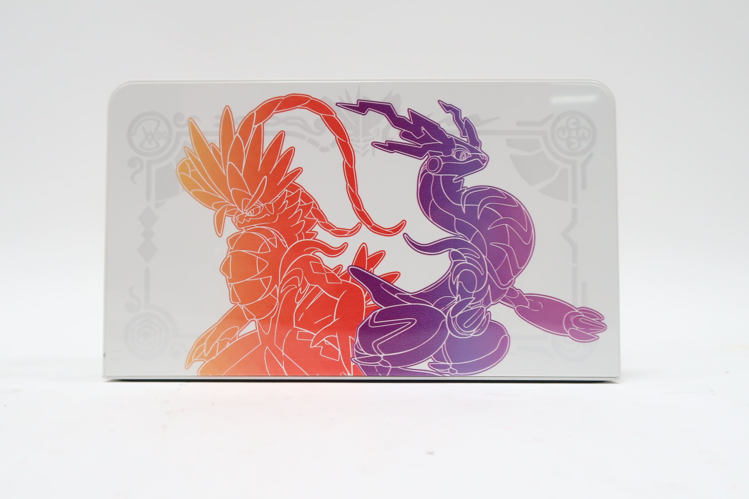 On the surface of the glossy white dock, the Legendary Pokémon Koraidon and Miraidon are displayed in their respective version colors. The bottom-left side of the back of the dock has a Poké Ball motif.
