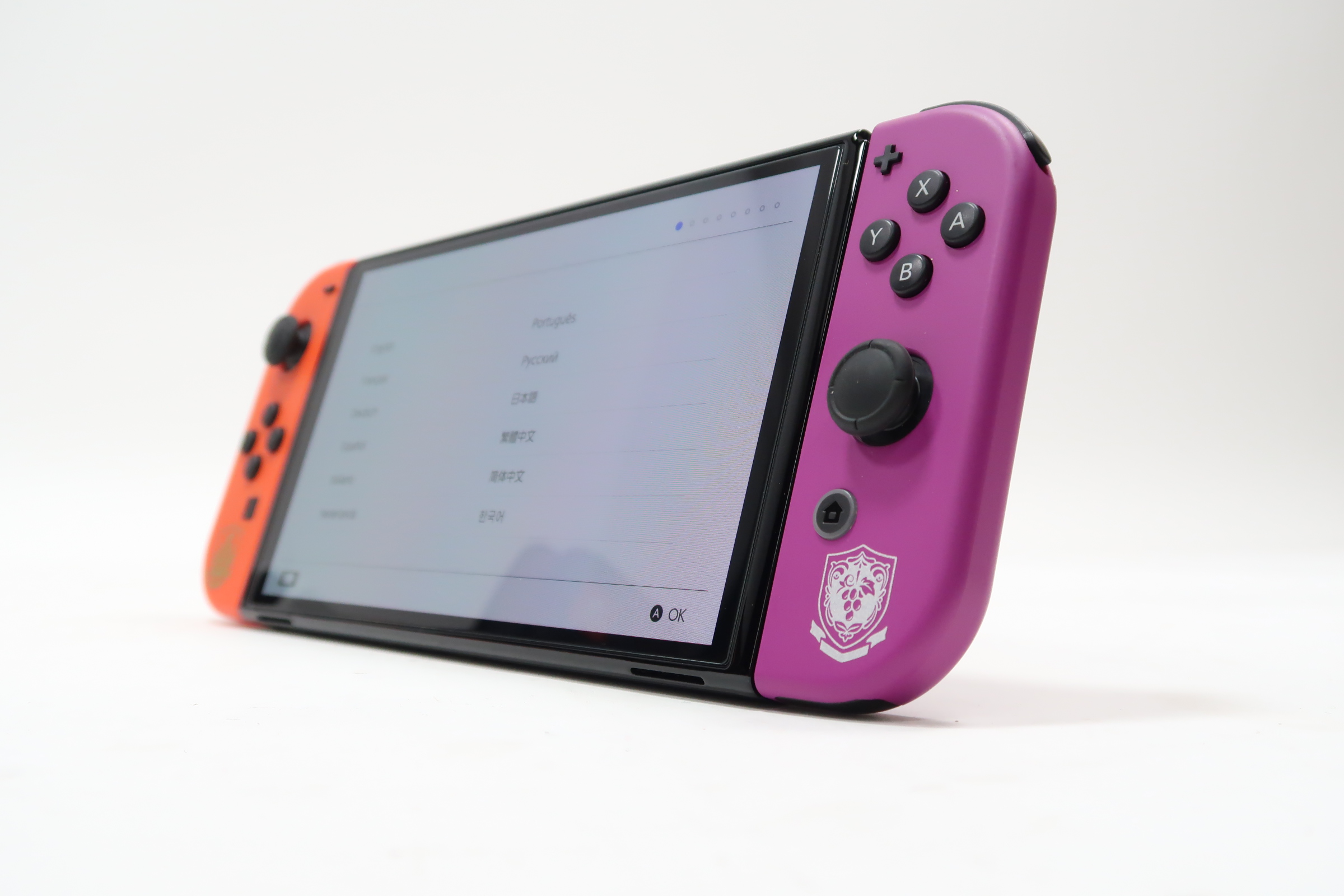 The included Joy-Con controllers have the main colors of Pokémon Scarlet and Pokémon Violet and are decorated with the respective crests of the schools from the games, Naranja Academy and Uva Academy.