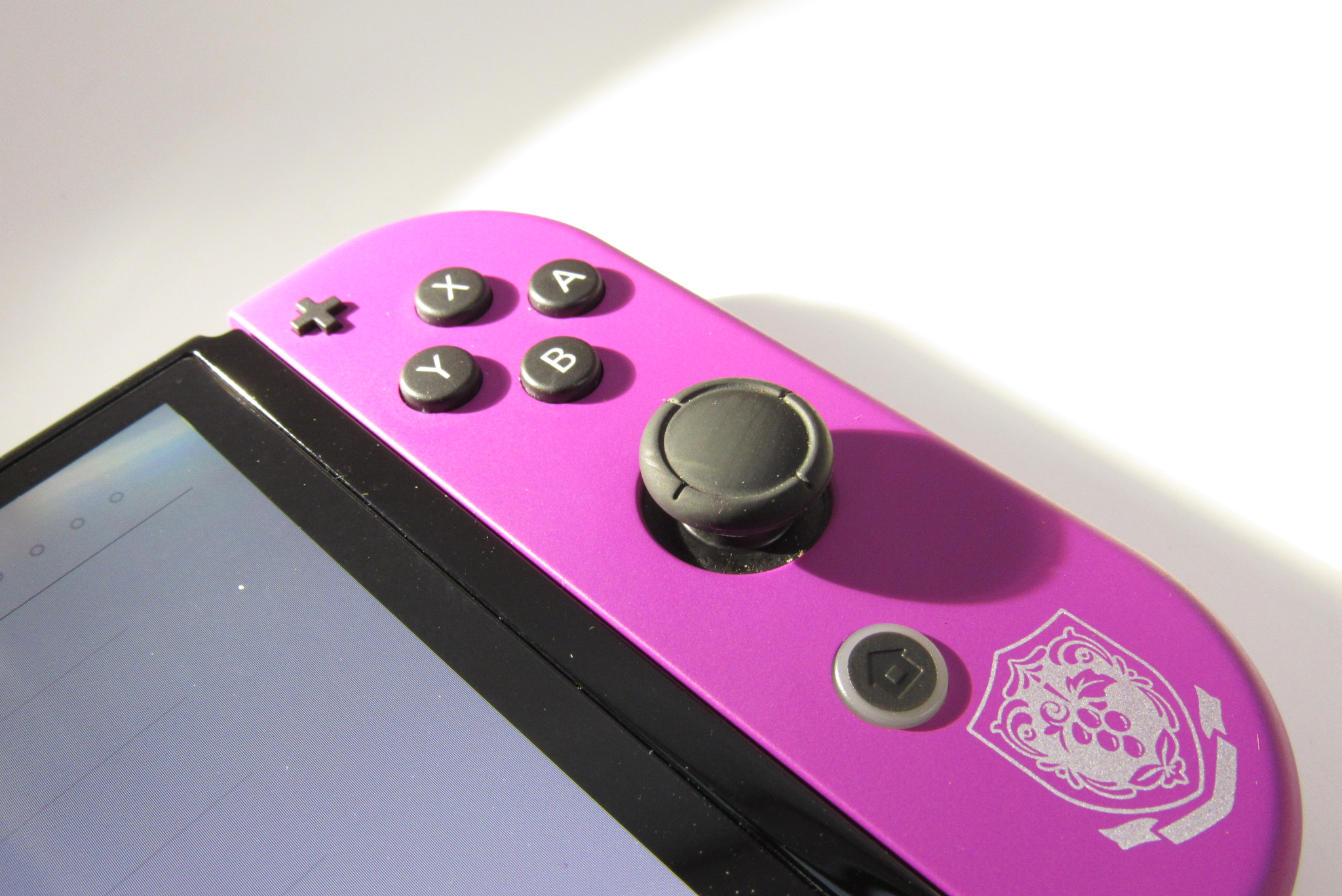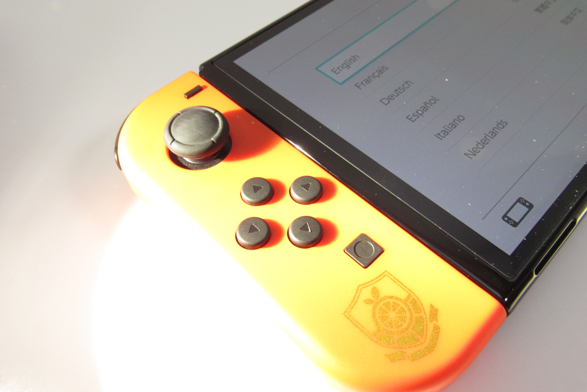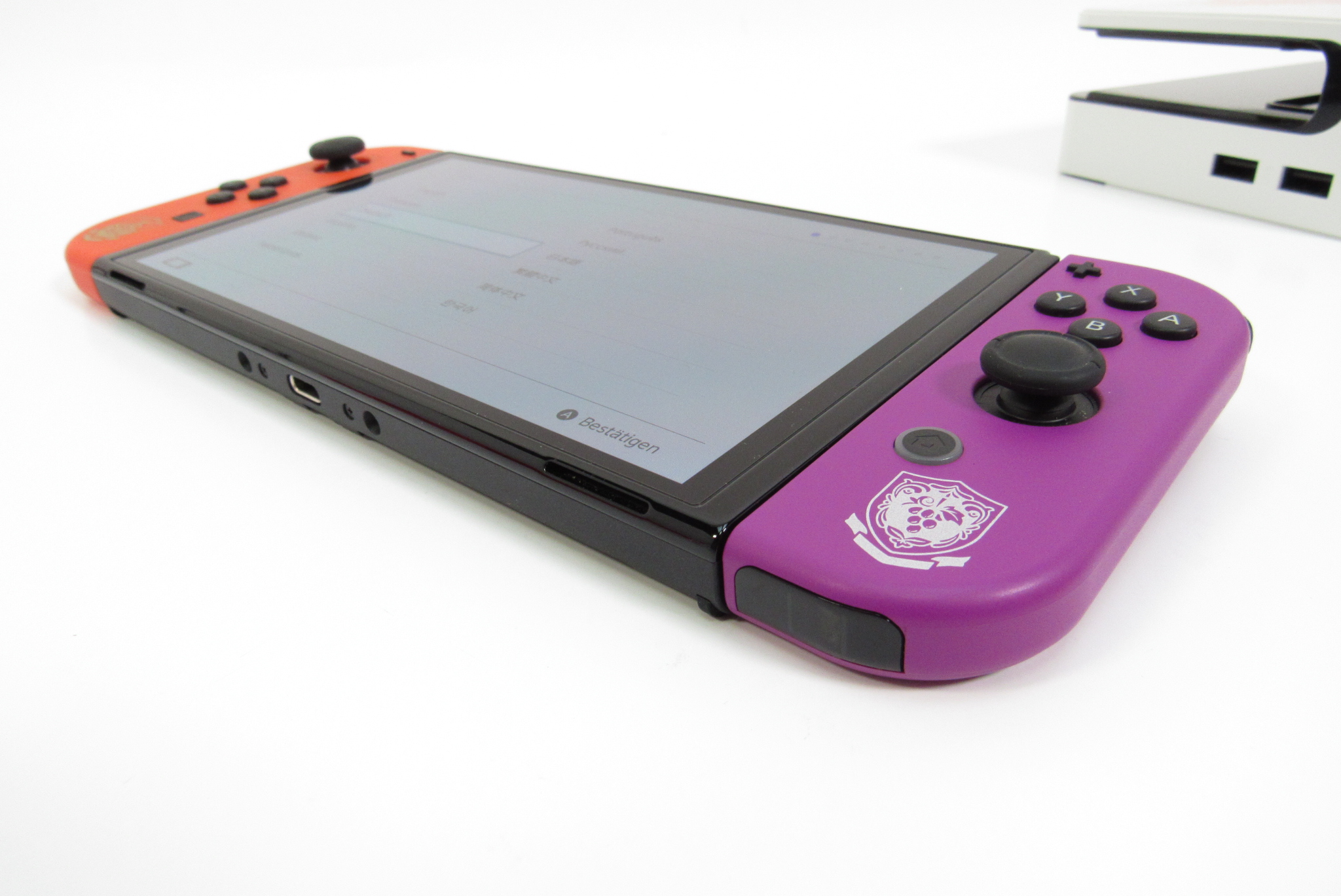 The included Joy-Con controllers have the main colors of Pokémon Scarlet and Pokémon Violet and are decorated with the respective crests of the schools from the games, Naranja Academy and Uva Academy.