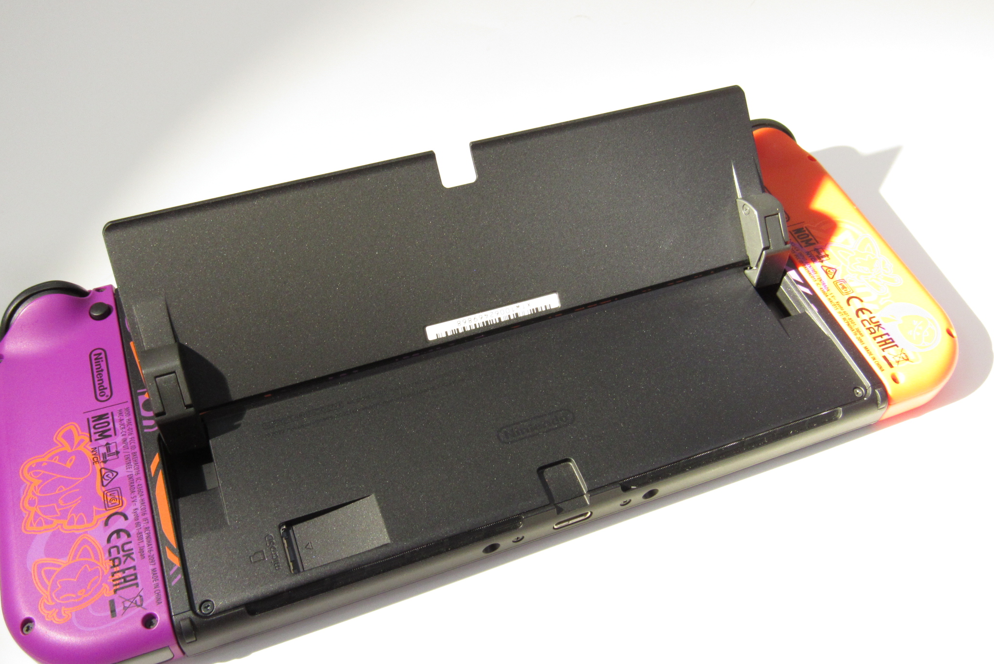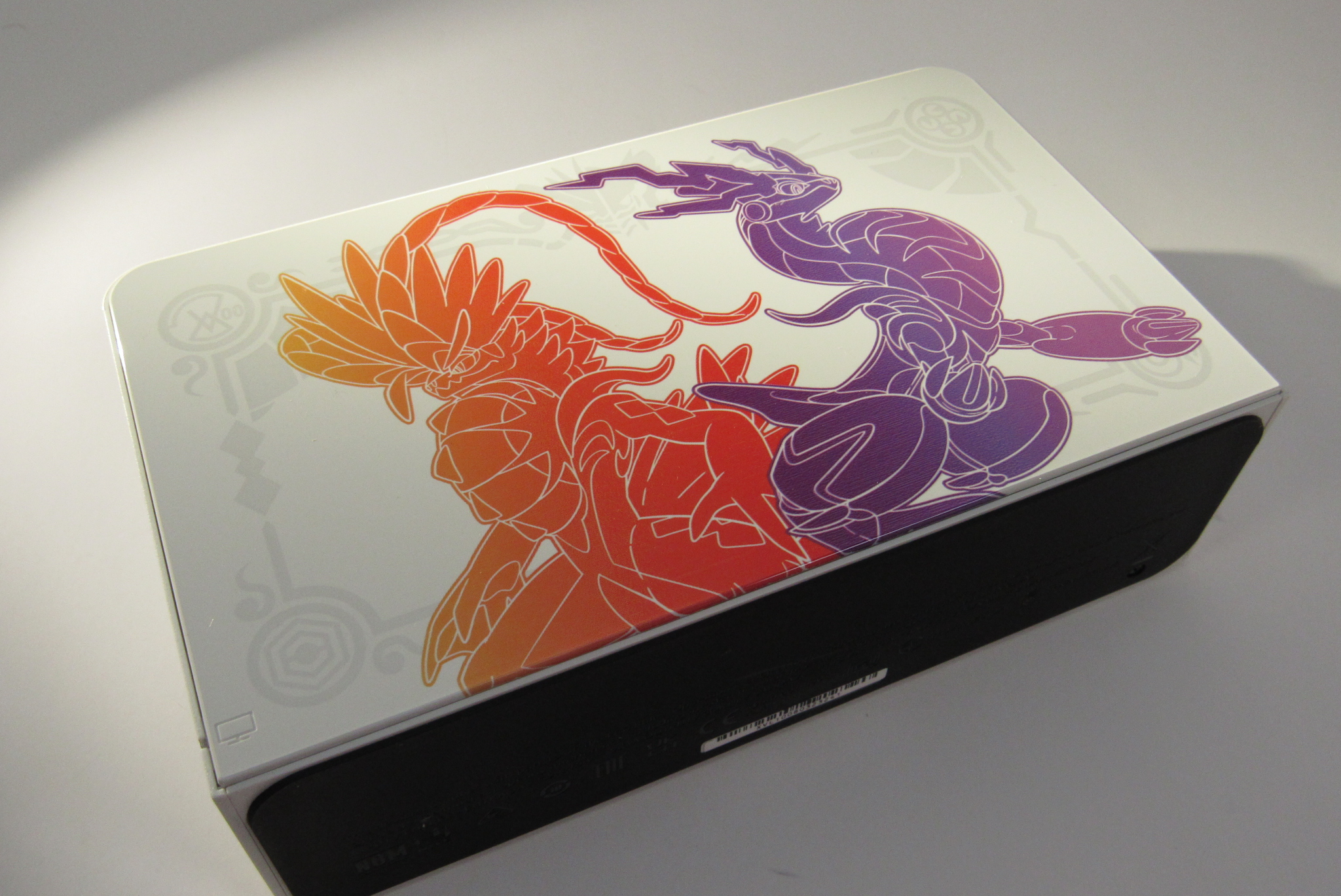 On the surface of the glossy white dock, the Legendary Pokémon Koraidon and Miraidon are displayed in their respective version colors. The bottom-left side of the back of the dock has a Poké Ball motif.