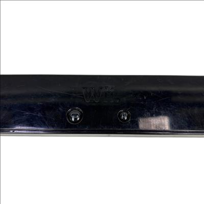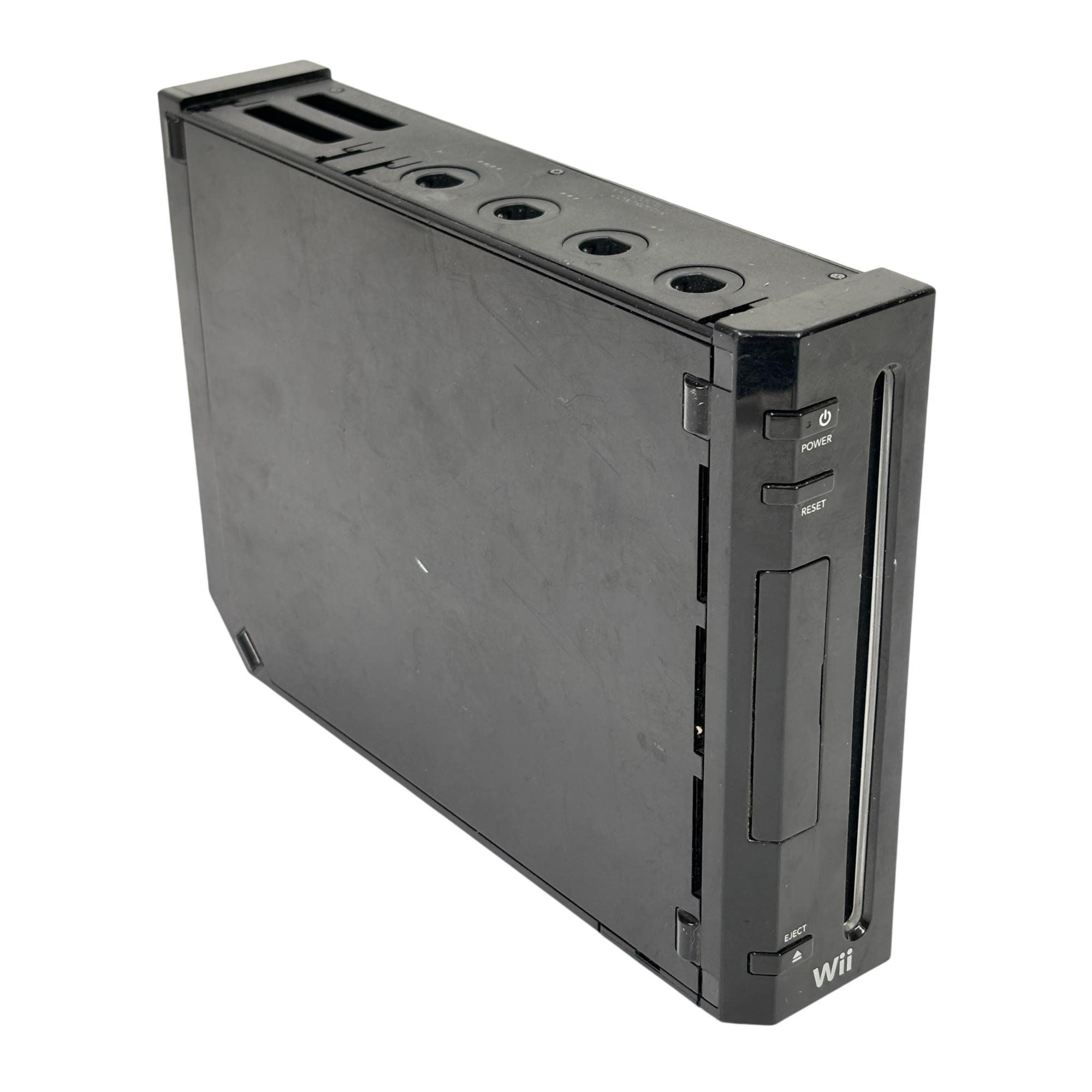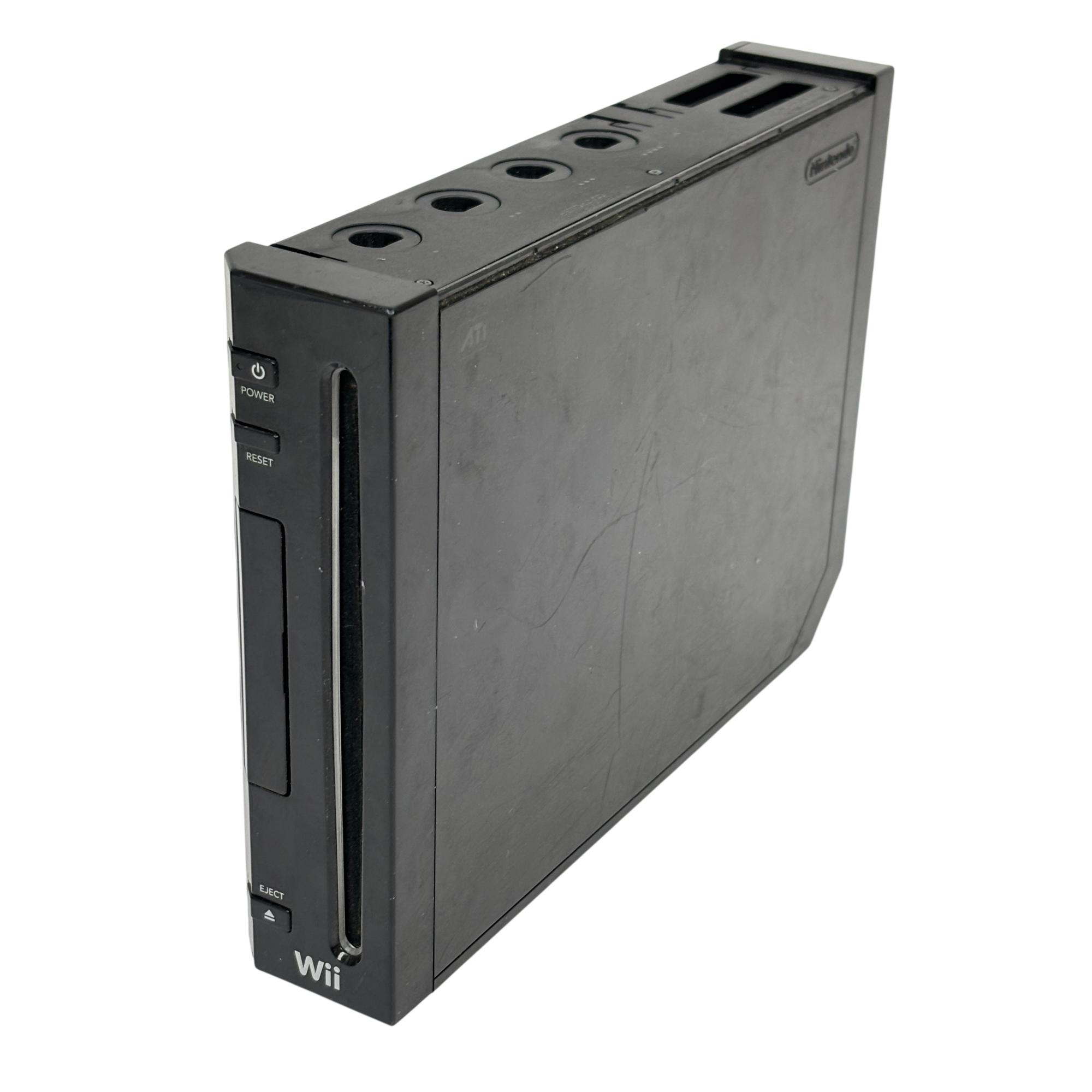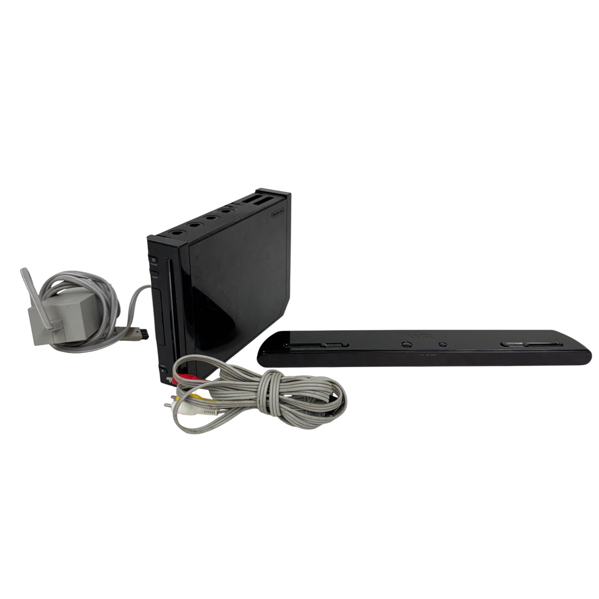 This Nintendo Wii RVL-001 is a sleek black video game console featuring multiple ports and buttons including power, reset, and eject. Designed for immersive gaming experiences, this model includes a sensor bar for accurate motion detection and enhanced control. Its compact rectangular design integrates a grey cable and metal components, making it a versatile addition to any entertainment setup.