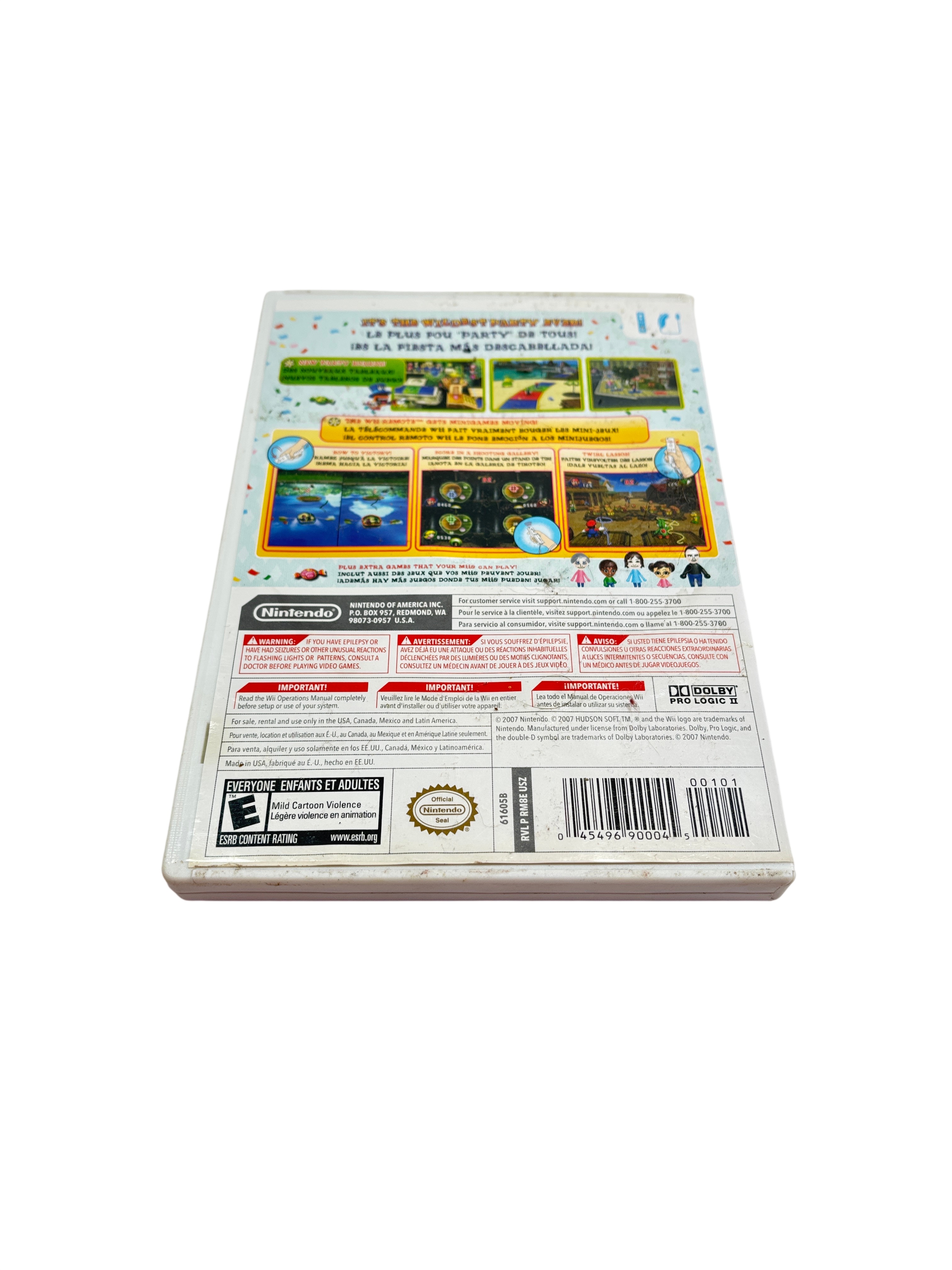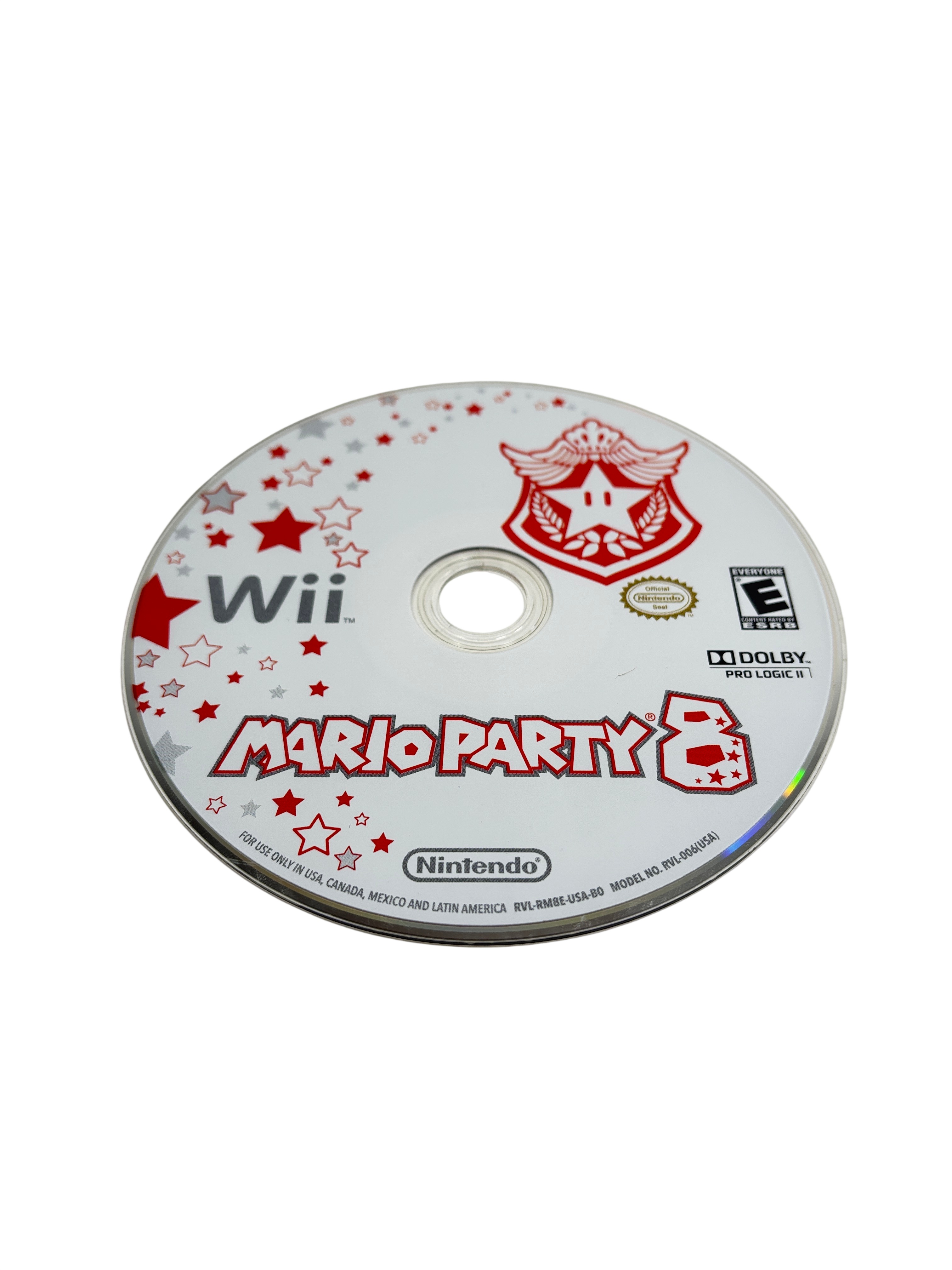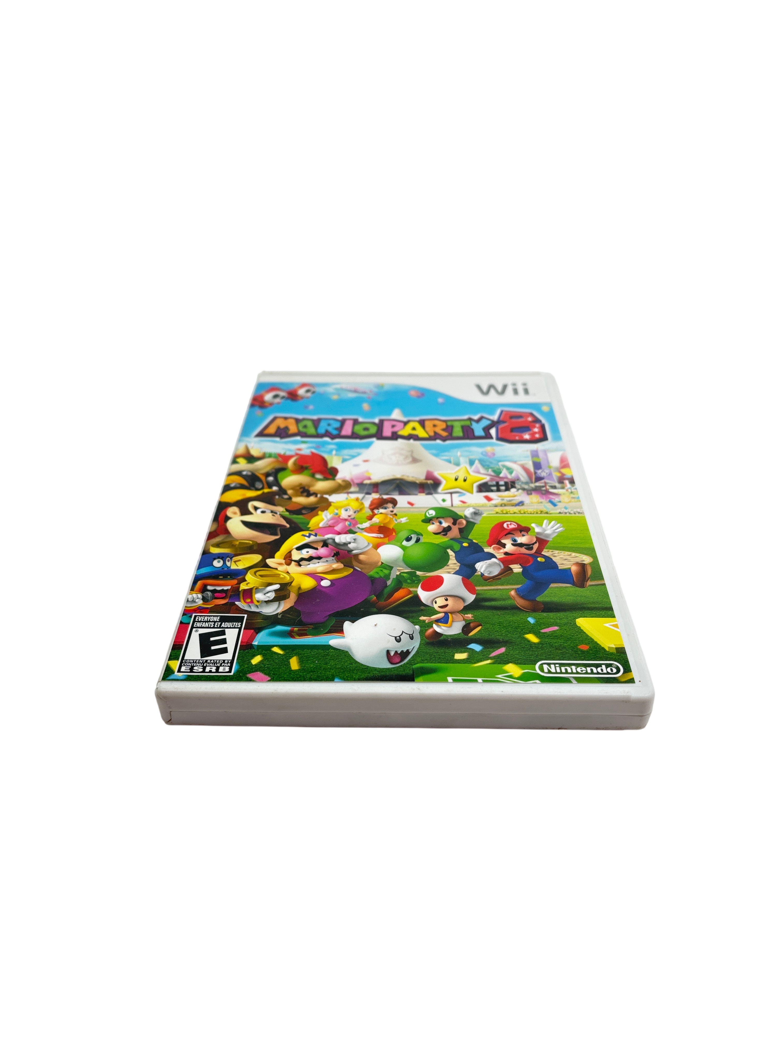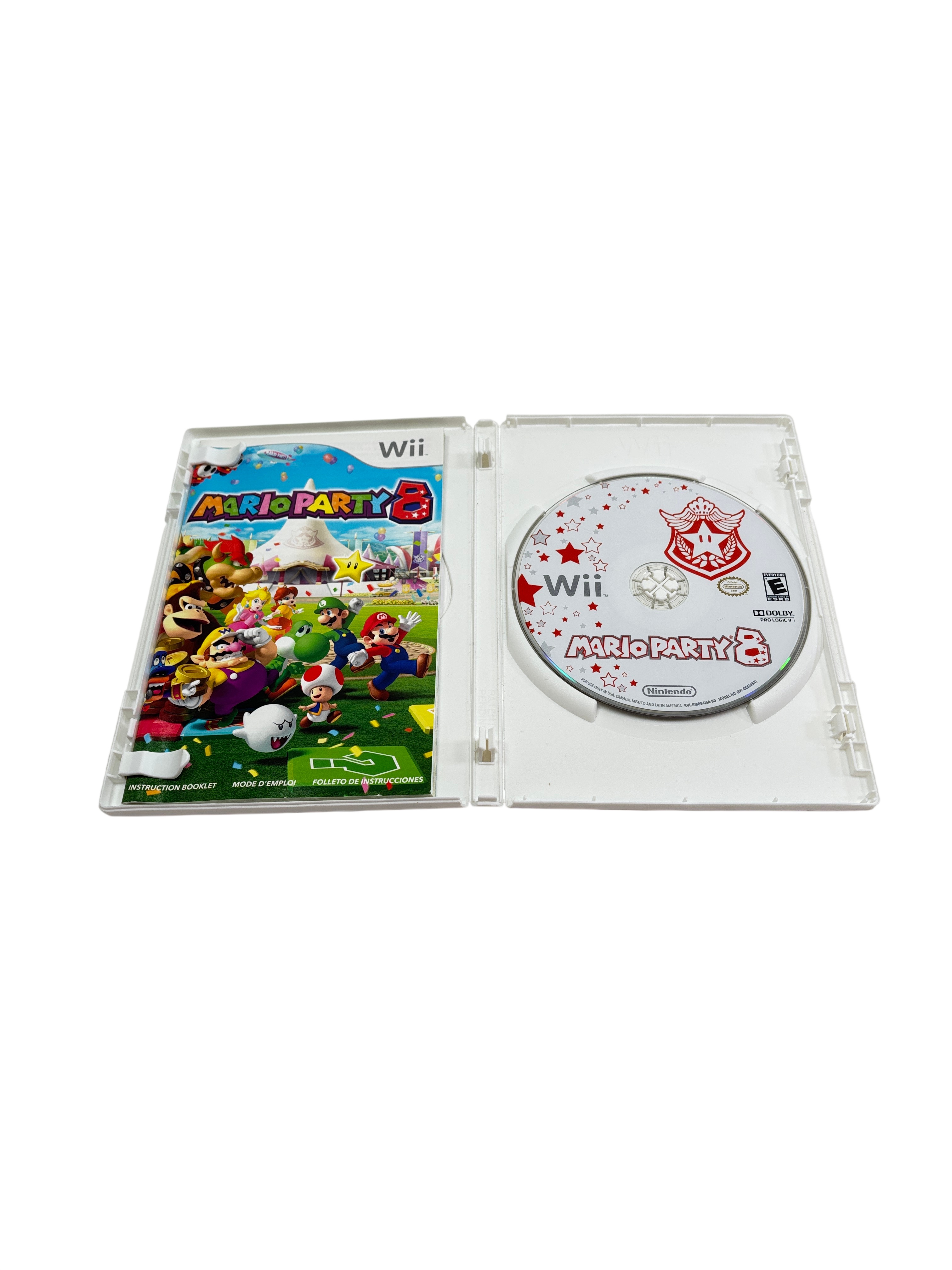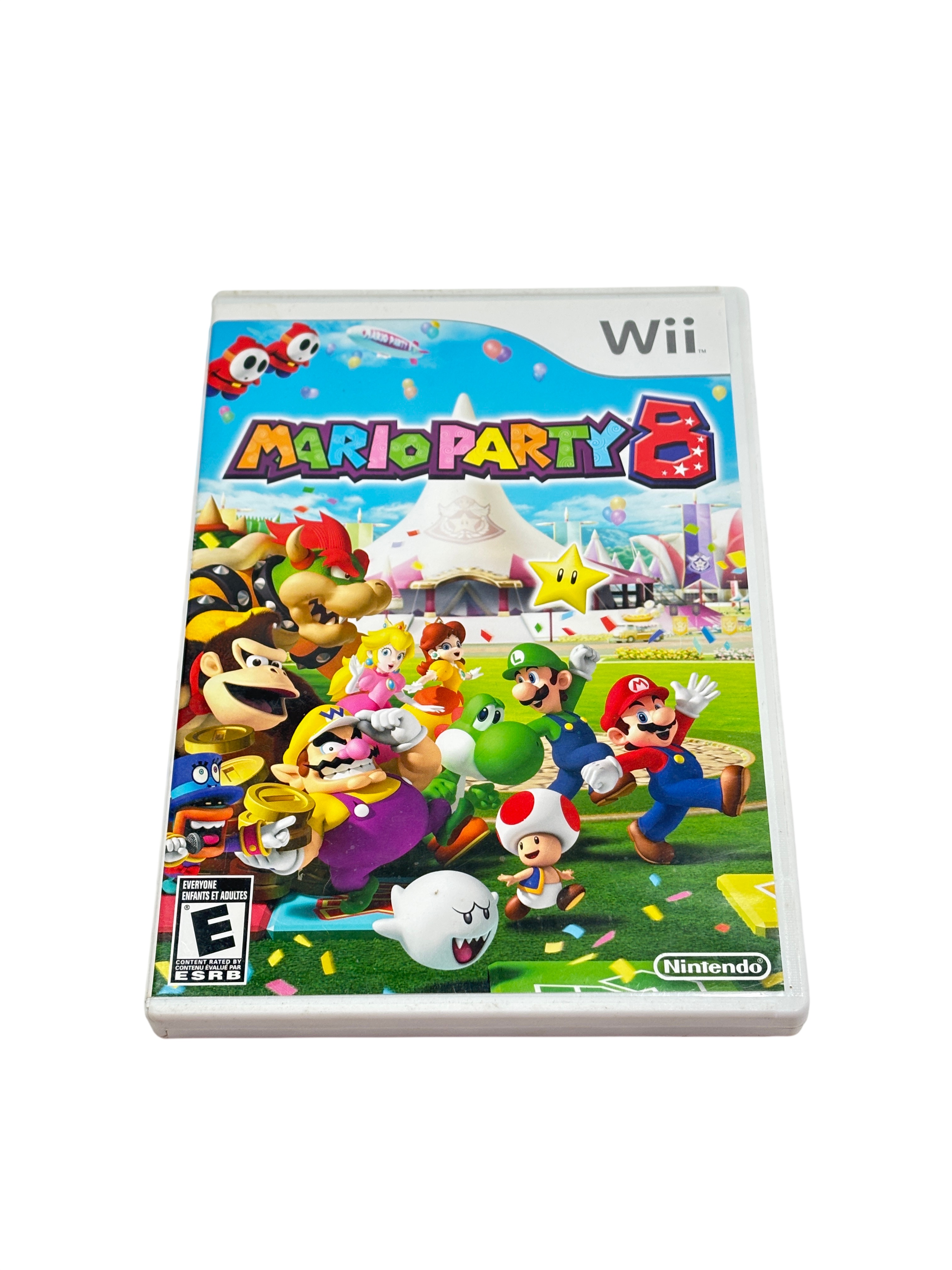 Nintendo Mario Party 8 is a popular party video game designed for the Nintendo Wii console. This listing includes the original game disc, instruction booklet, and white plastic case featuring vibrant cover art with iconic Mario characters. Rated E for Everyone, Mario Party 8 offers fun multiplayer gameplay suitable for all ages. The game disc is compatible with Wii systems in the USA, Canada, Mexico, and Latin America regions, making it a great addition for fans of classic Nintendo party games.