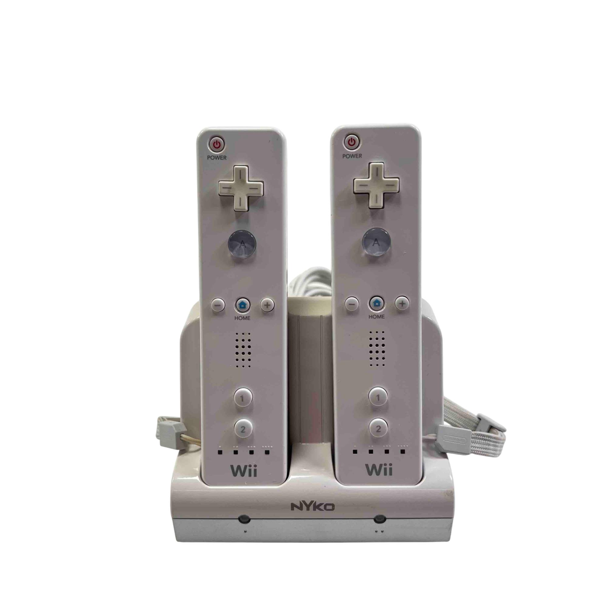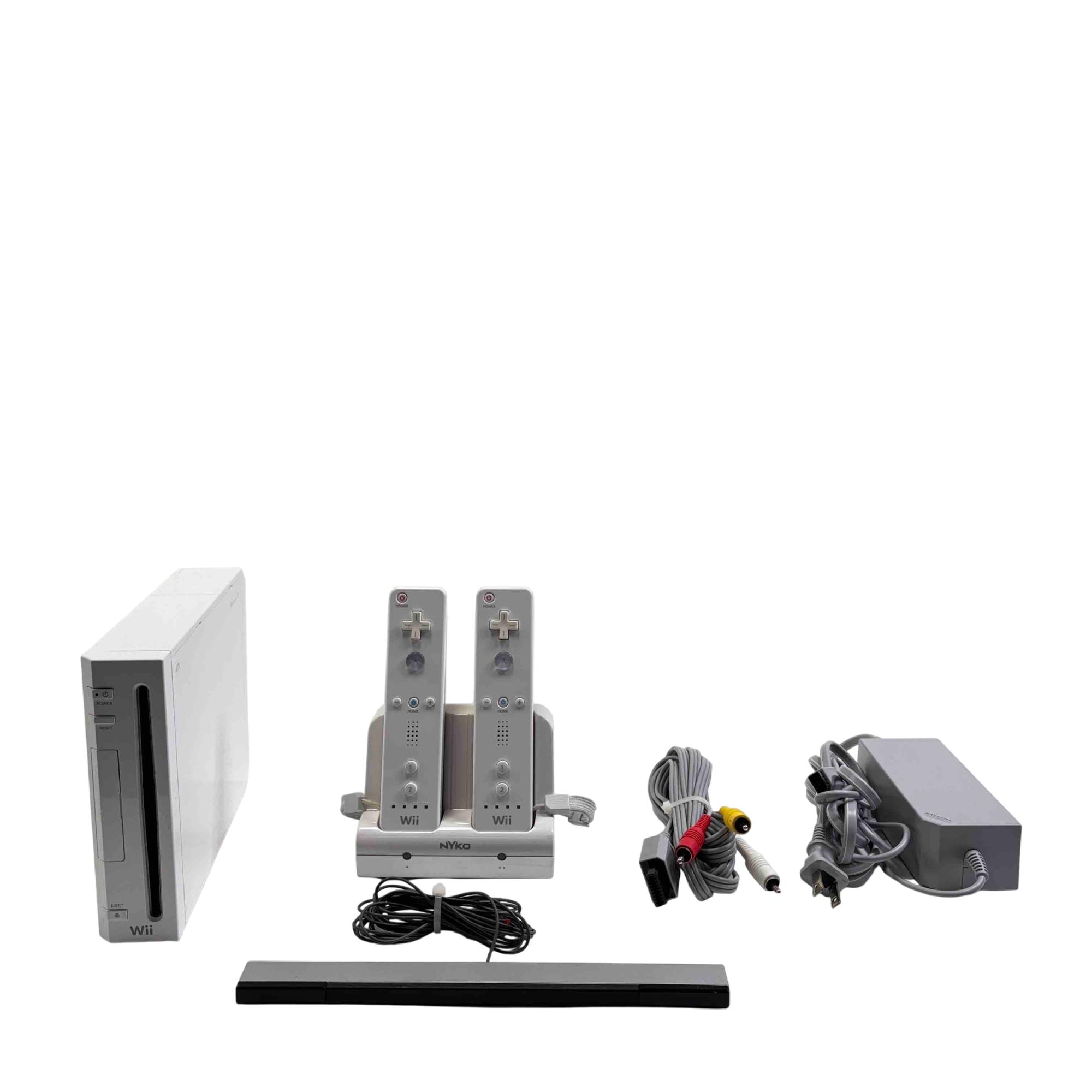 Experience immersive gaming with this classic Nintendo Wii console bundle, model RVL-001, compatible with GameCube games and accessories. The set includes two Wii remotes with a convenient Nyko charging dock, plus all essential cables and the original sensor bar, making it the perfect choice for both new players and nostalgic fans.