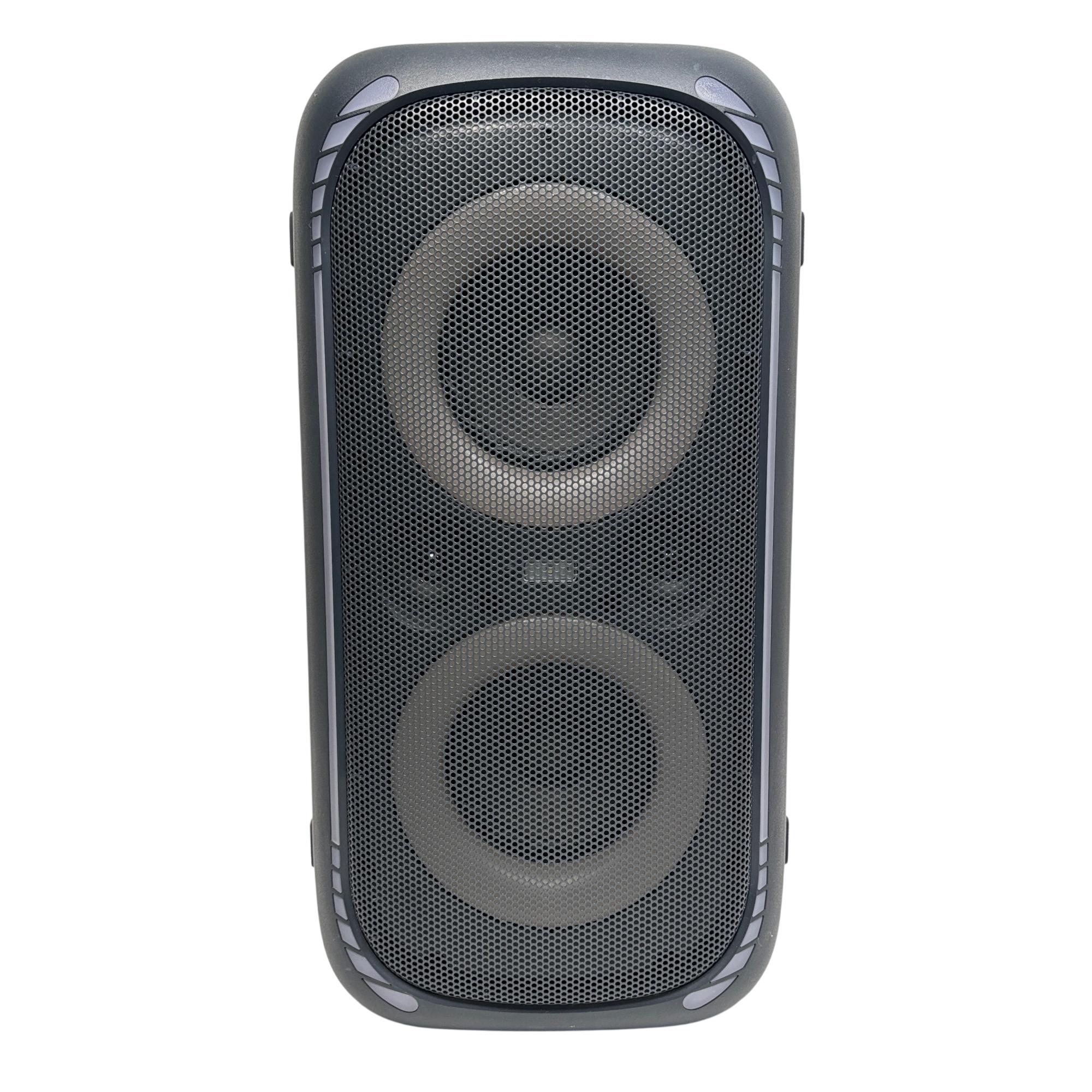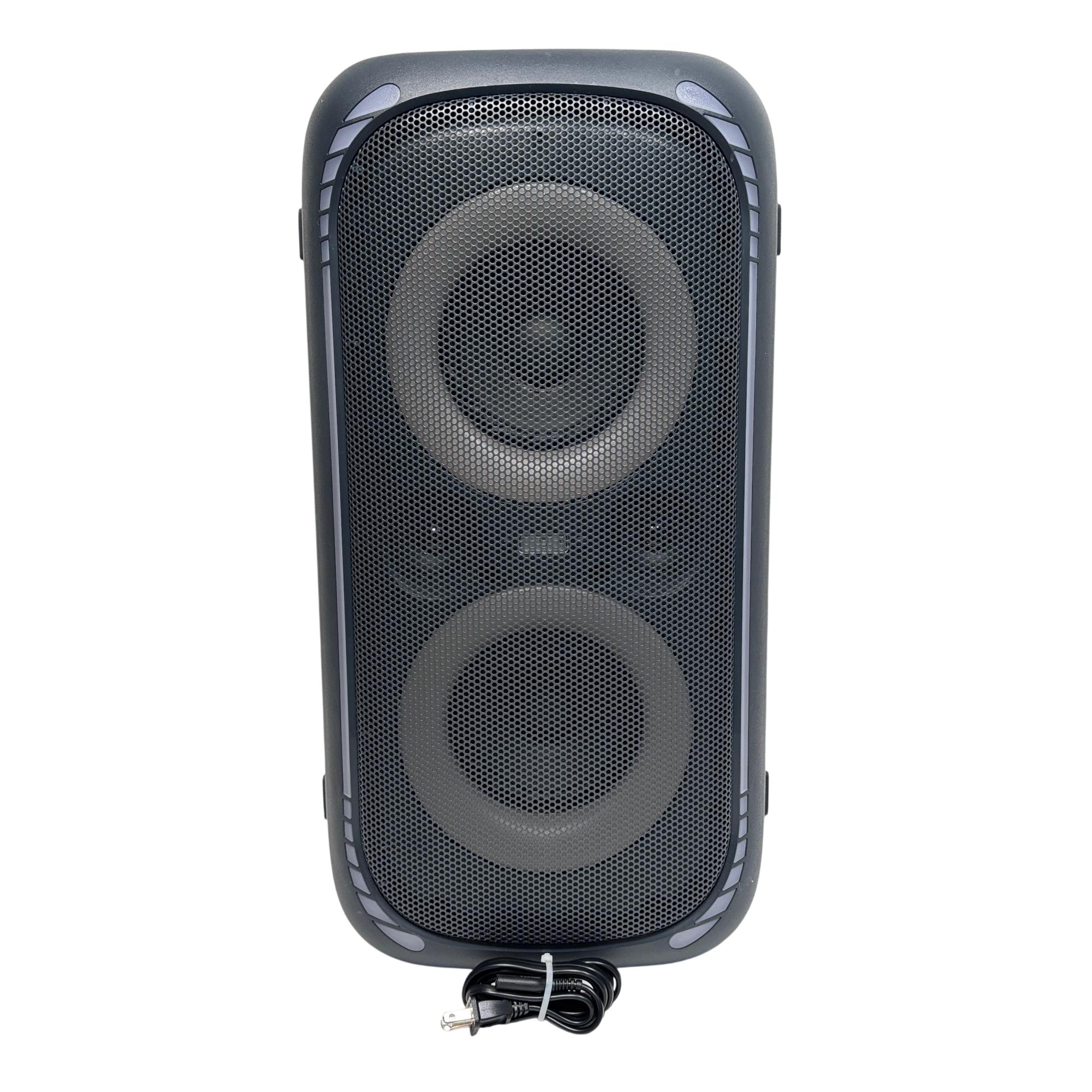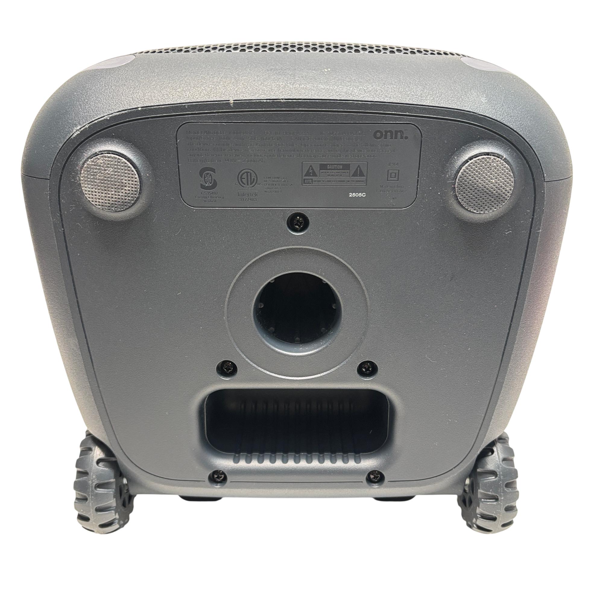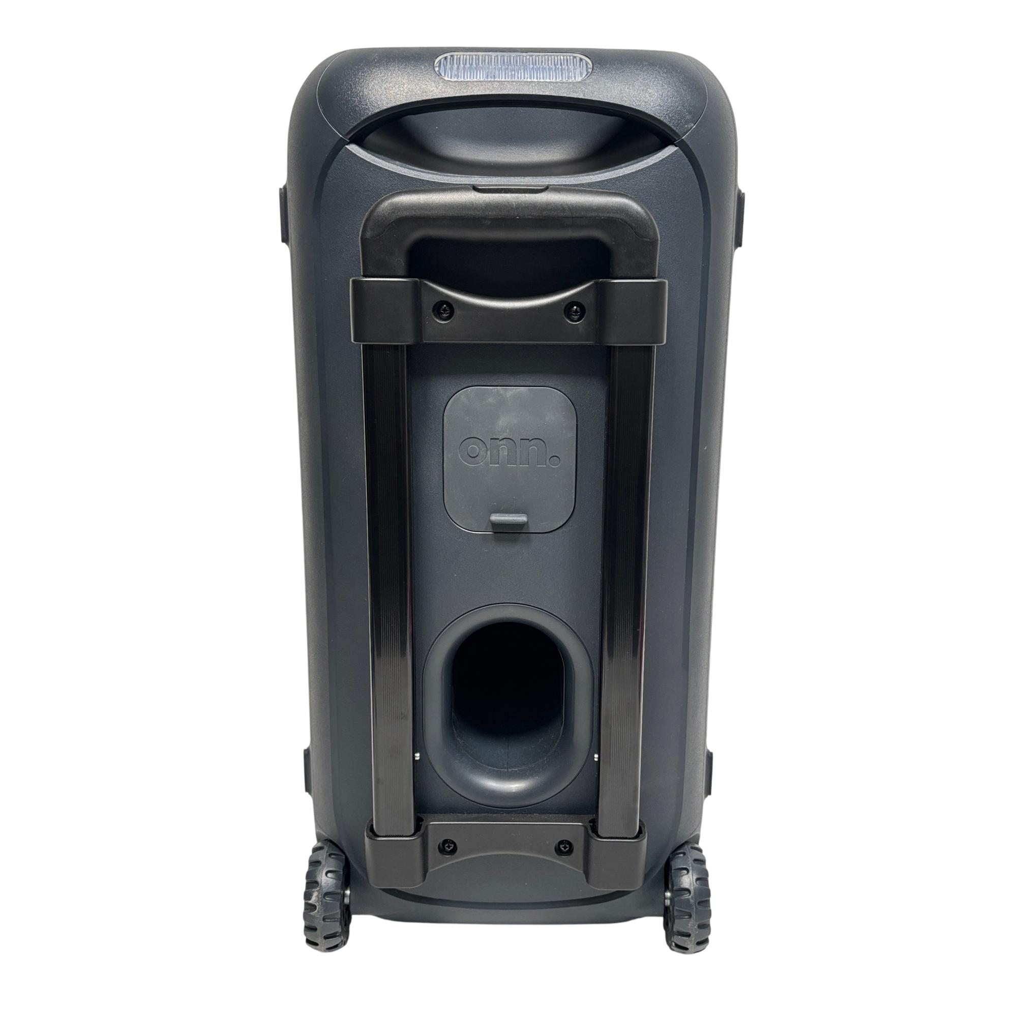 onn. 100094813 Large Party Speaker Gen 2 Portable Bluetooth Speaker with LED Lighting delivers powerful sound performance with versatile input options including AUX, microphone, and guitar connections. Designed for portability, this speaker features built-in wheels and a handle for easy transport, complemented by vibrant LED lighting that enhances party atmospheres.