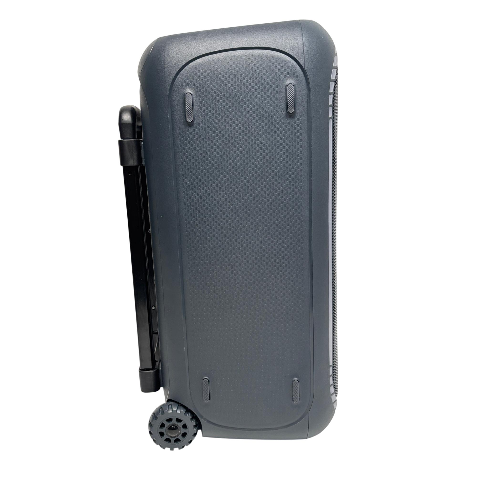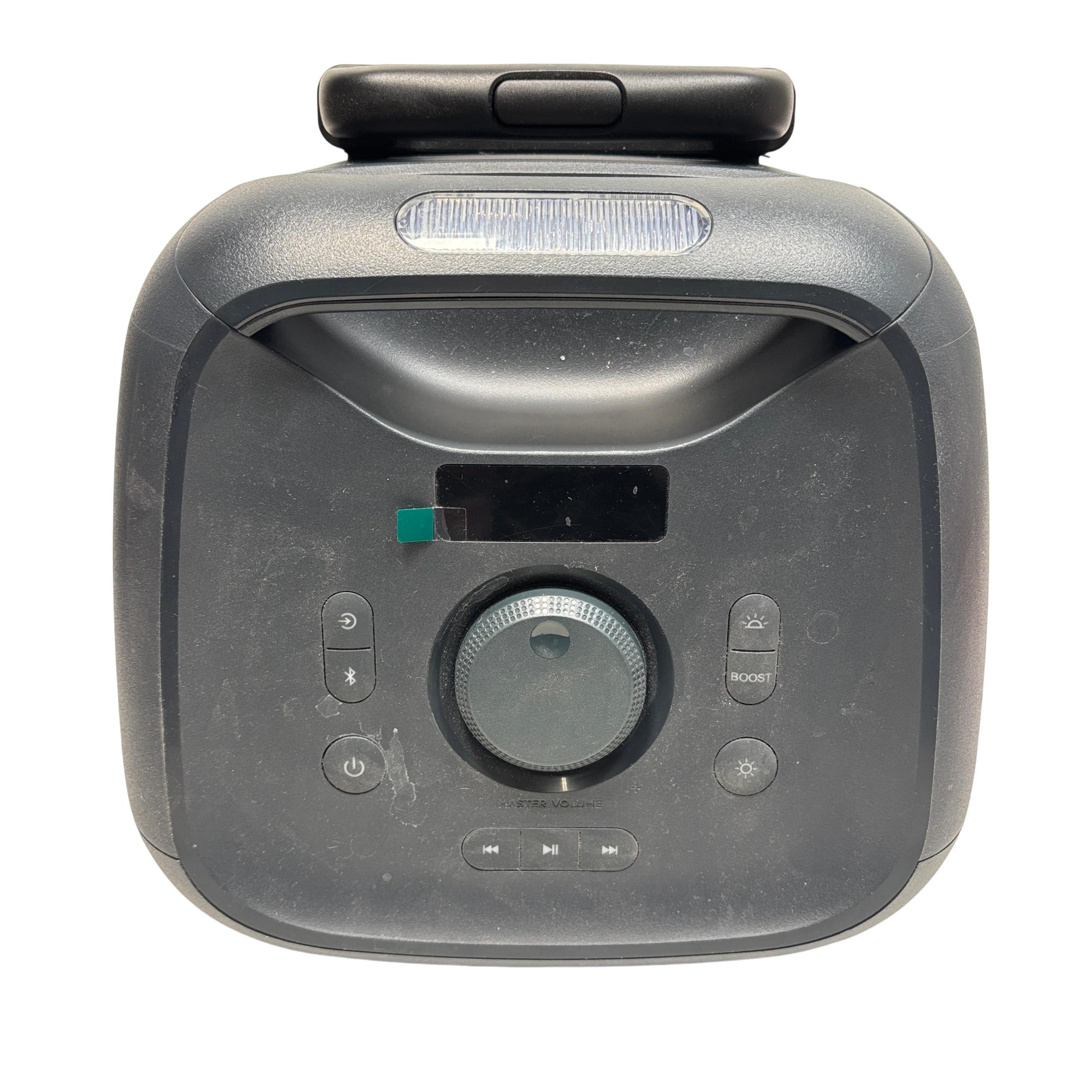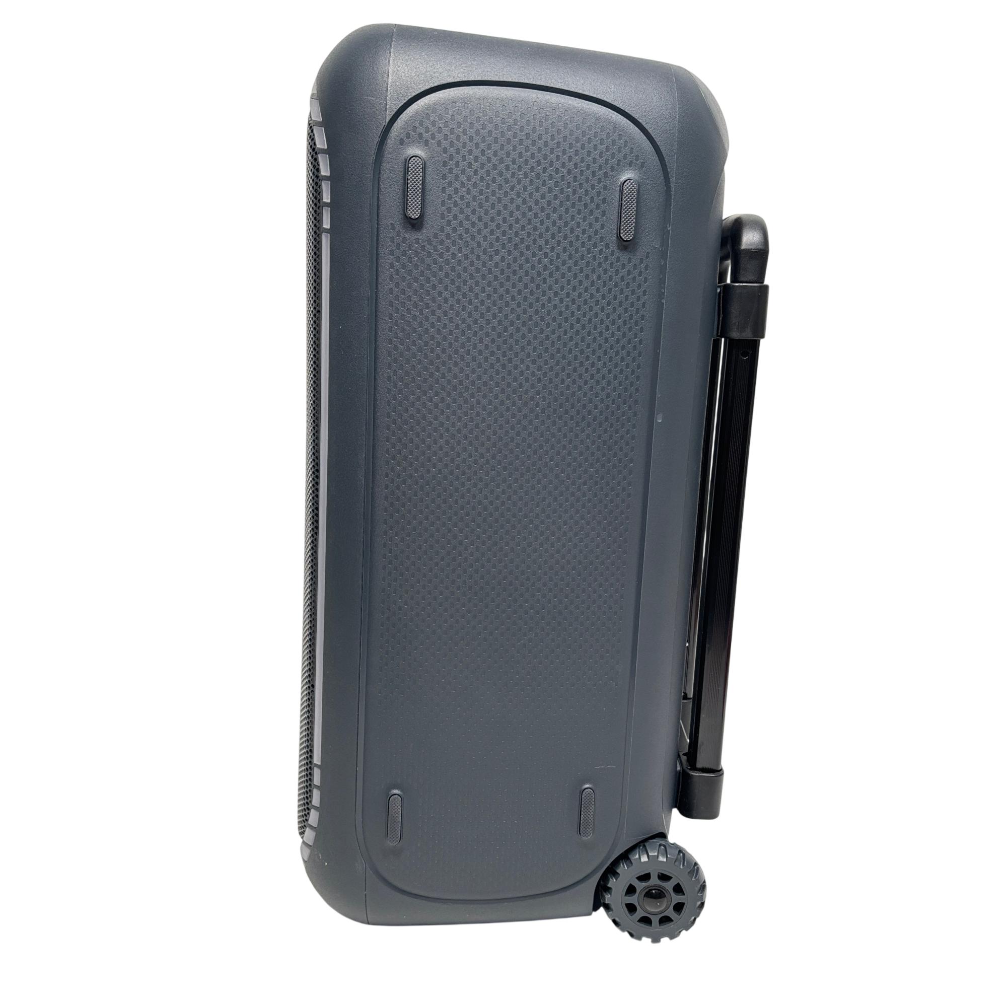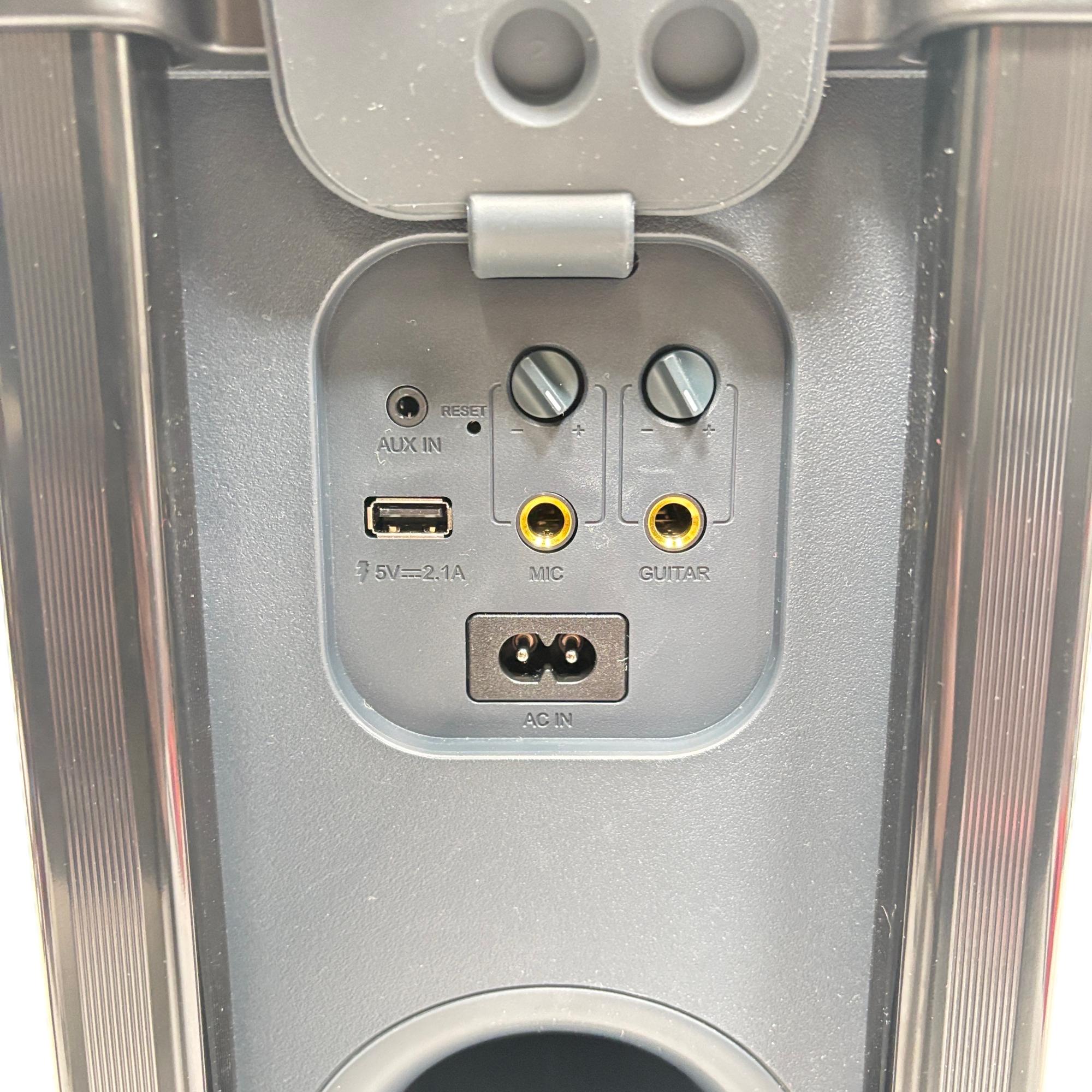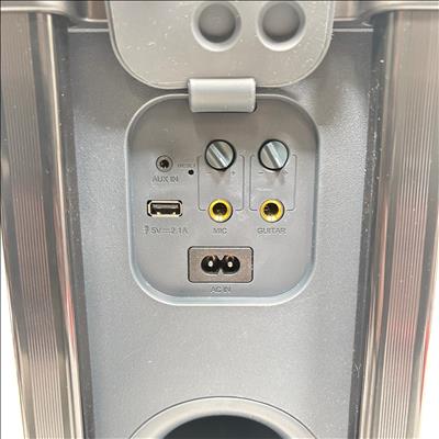 onn. 100094813 Large Party Speaker Gen 2 Portable Bluetooth Speaker with LED Lighting delivers powerful sound performance with versatile input options including AUX, microphone, and guitar connections. Designed for portability, this speaker features built-in wheels and a handle for easy transport, complemented by vibrant LED lighting that enhances party atmospheres.