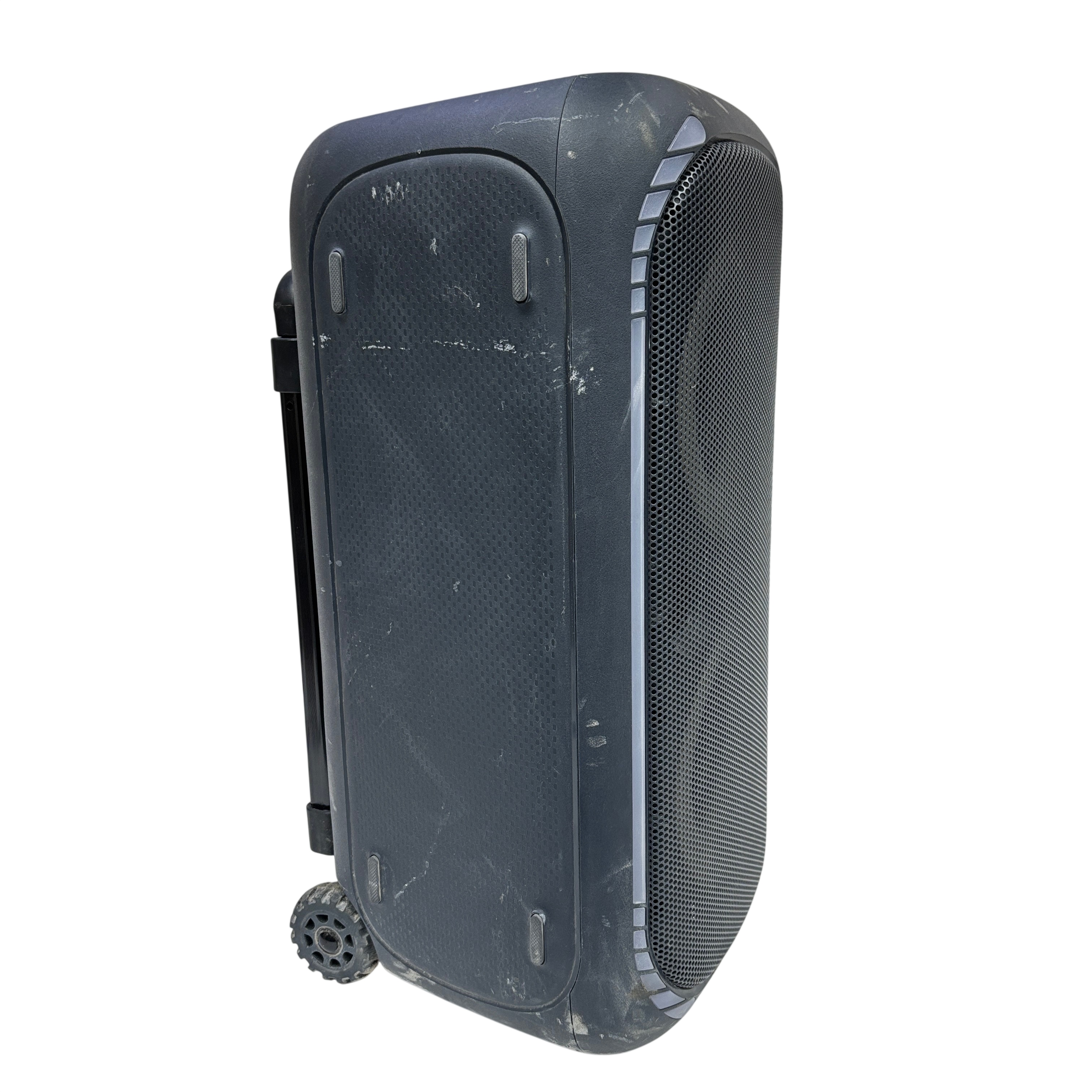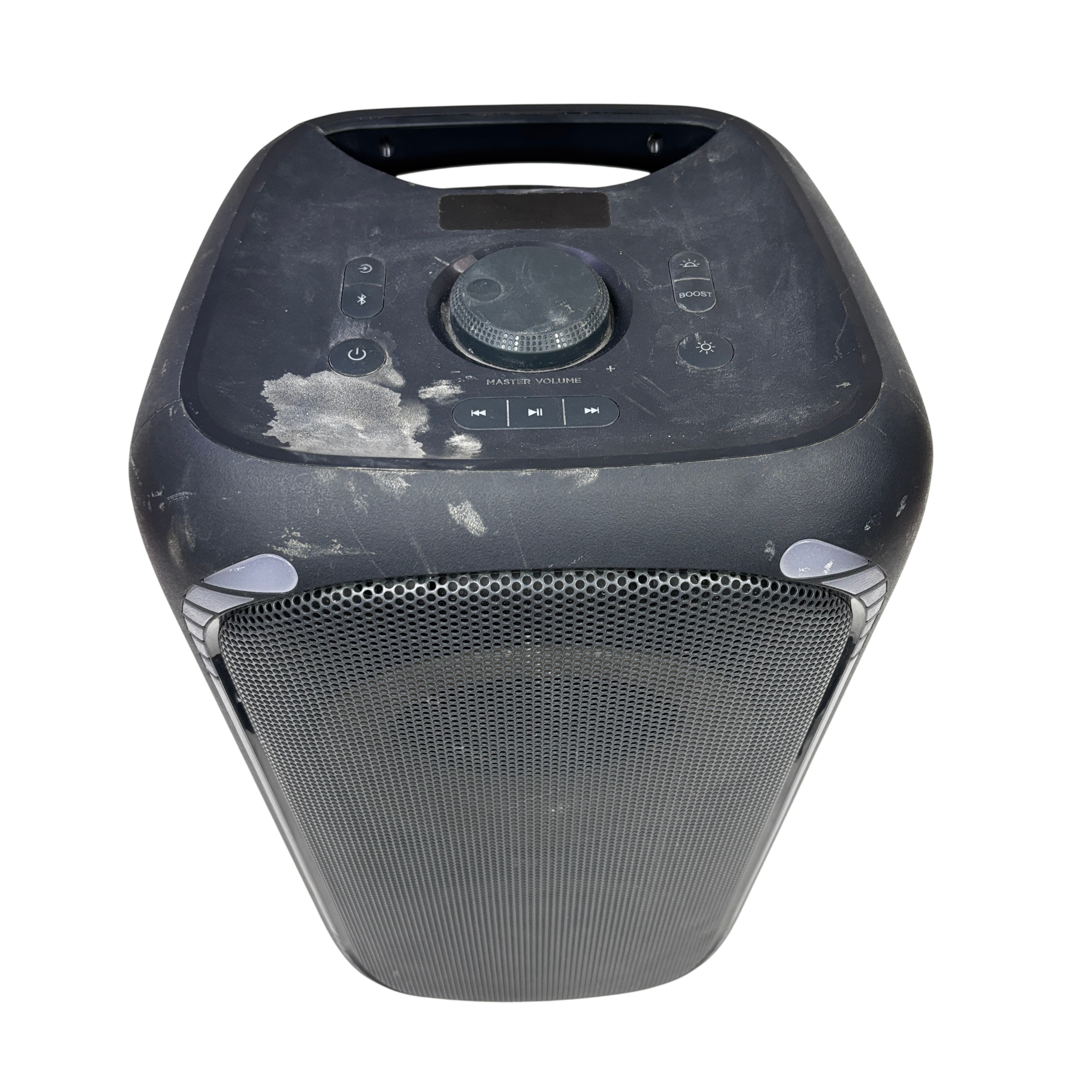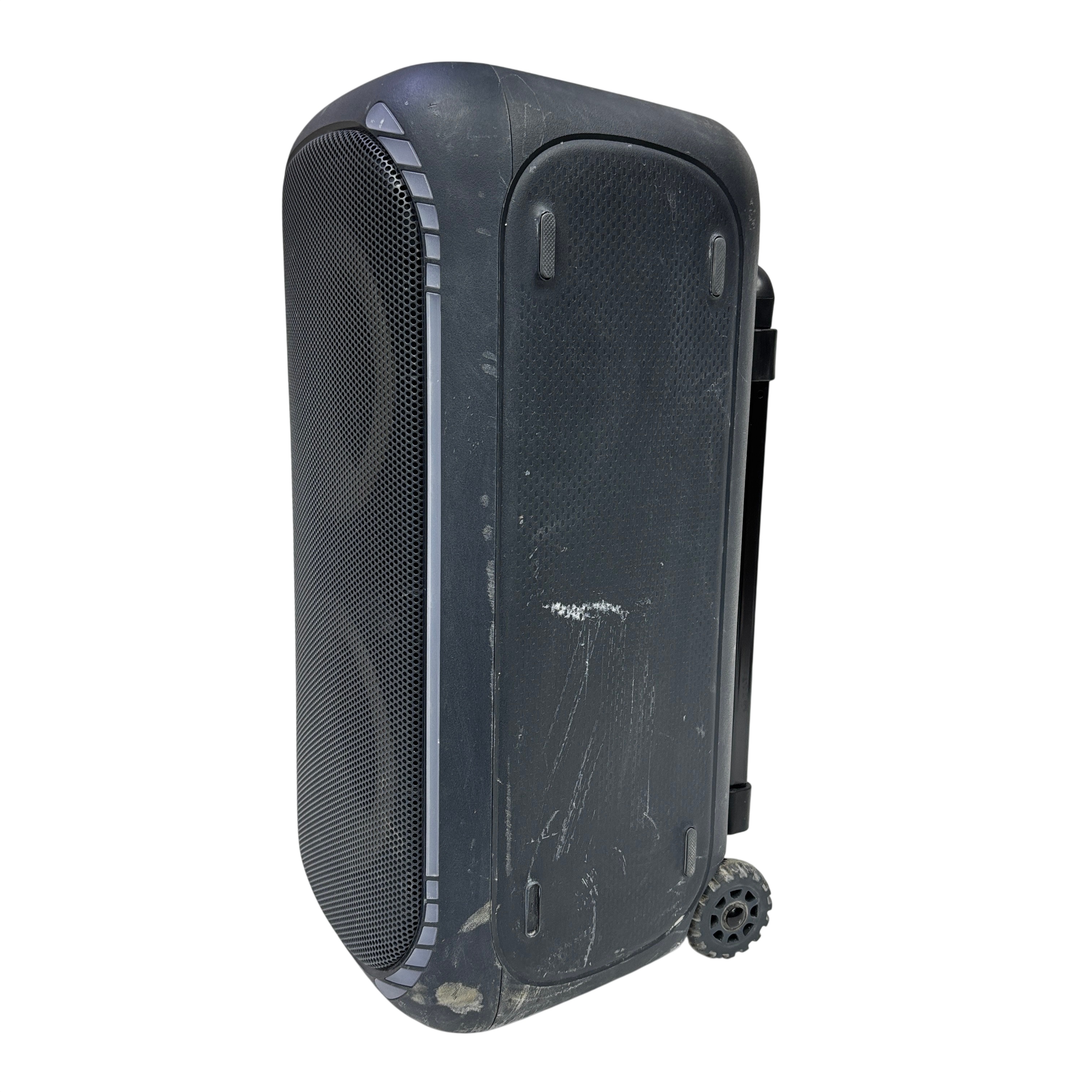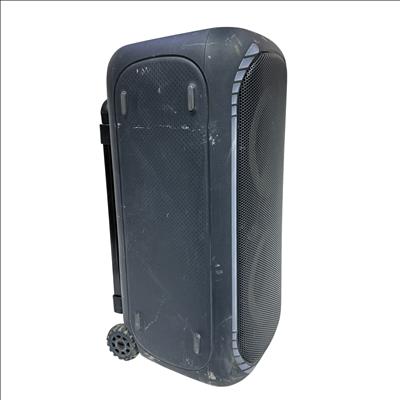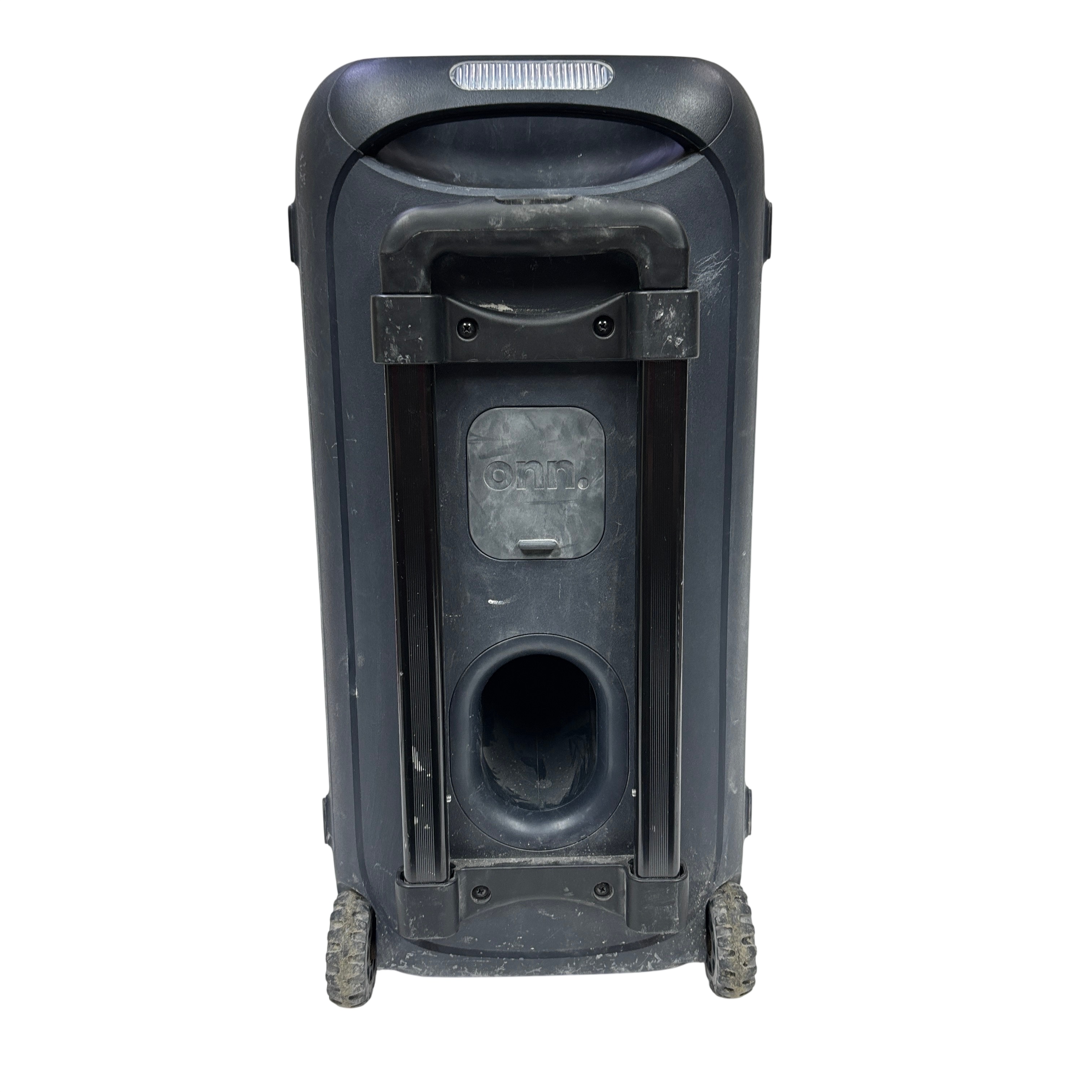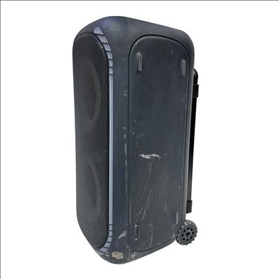 The ONN 100094813 Portable Bluetooth Speaker offers wireless audio streaming with Bluetooth connectivity and convenient playback controls. Featuring a large master volume knob, light and boost control buttons, this speaker is designed for portability with a built-in handle and wheels for easy transport. Its durable black plastic casing makes it suitable for indoor and outdoor use, providing powerful sound in a compact form factor. Ideal for parties, events, or casual listening, this speaker combines functionality and mobility.