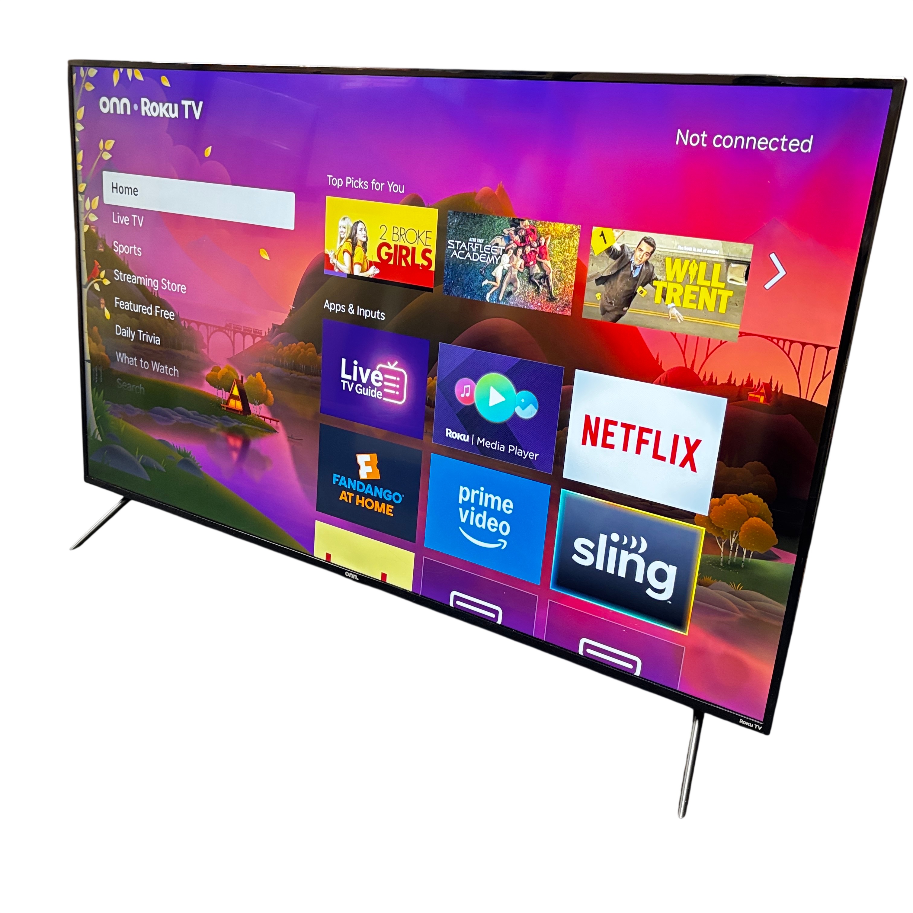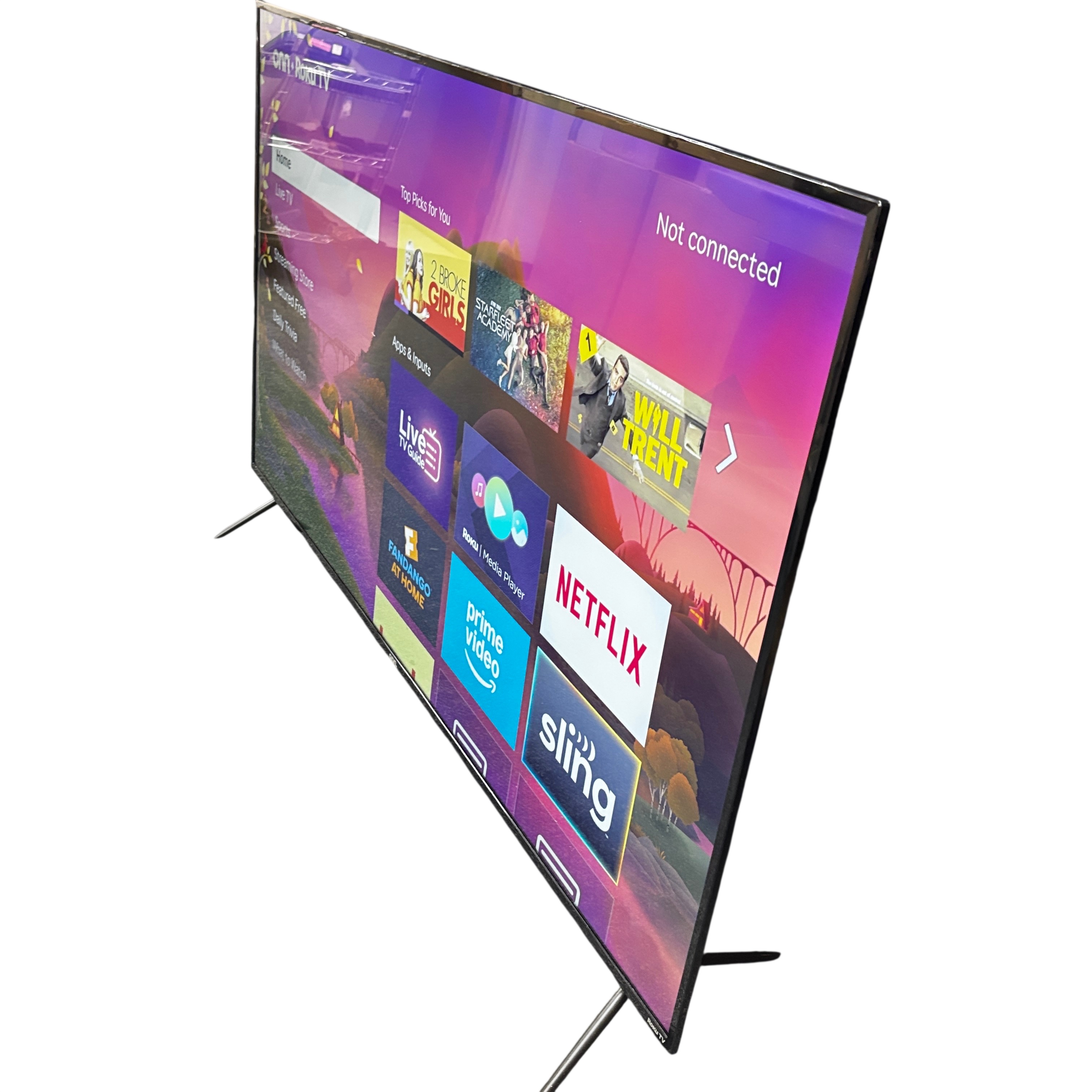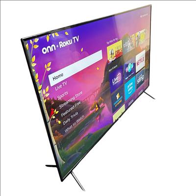 The ONN Roku TV is a smart television featuring the popular Roku TV platform, providing access to streaming services such as Netflix, Prime Video, and Sling. This TV supports a wide power input range of 100-240V and includes USB connectivity at 5V 500mA. It is VESA mount compatible with a 400 x 300 mm mounting pattern, allowing flexible installation options. The TV comes with attached stand legs but does not include a remote. Please note the screen has a visible scratch, which may affect viewing experience. Ideal for users looking for an affordable smart TV with broad streaming capabilities.