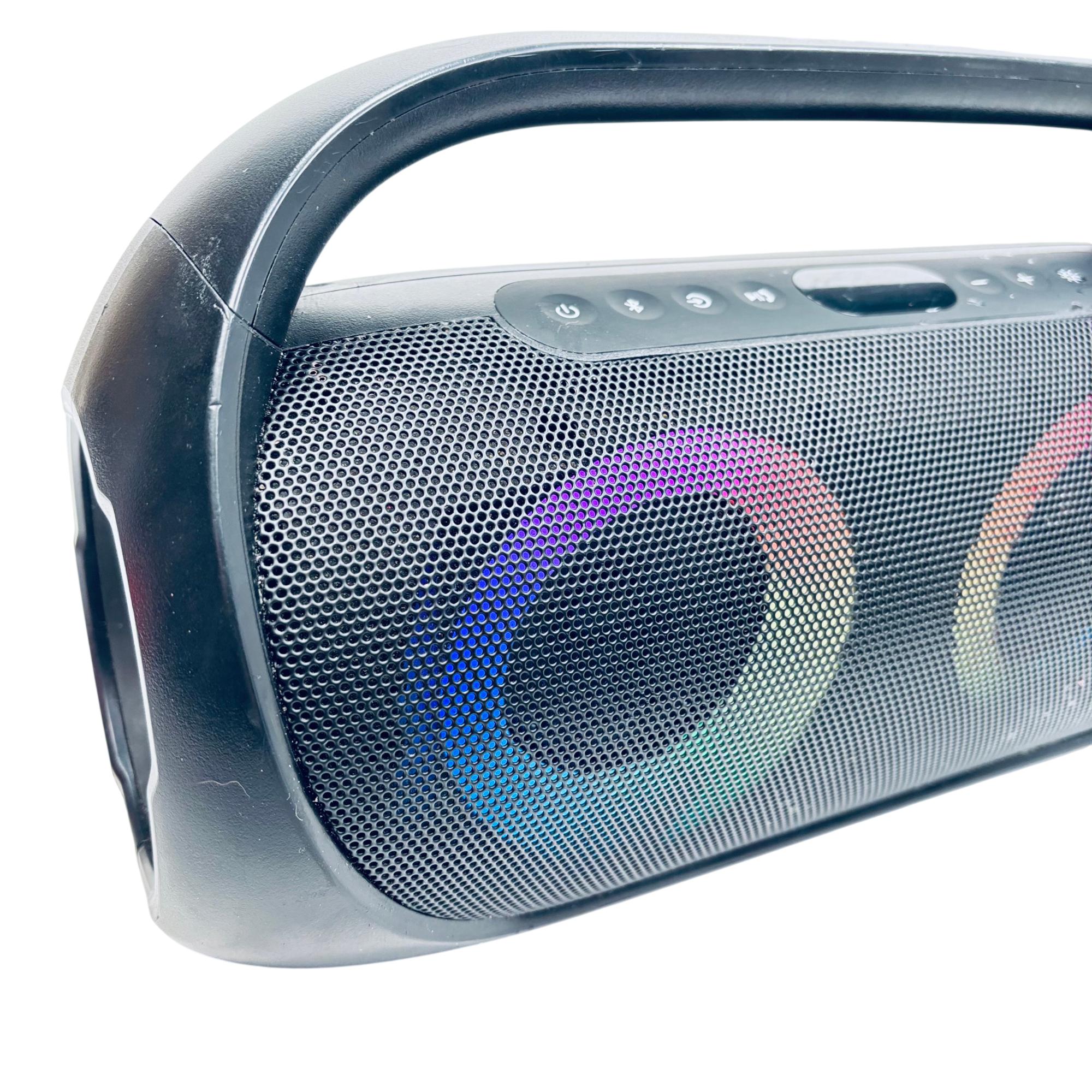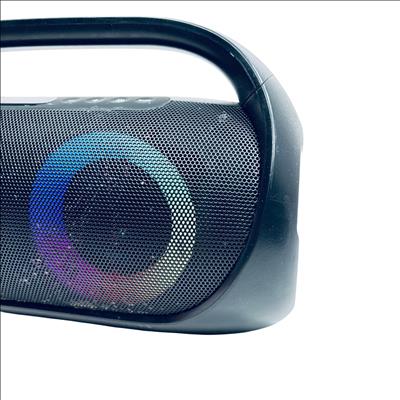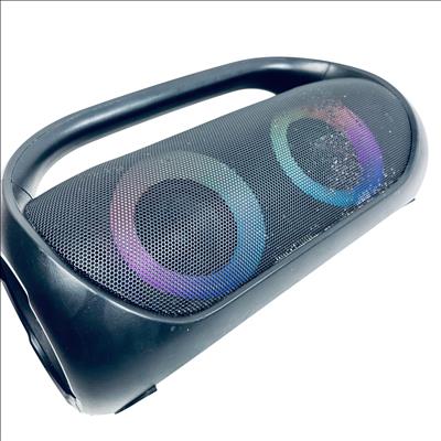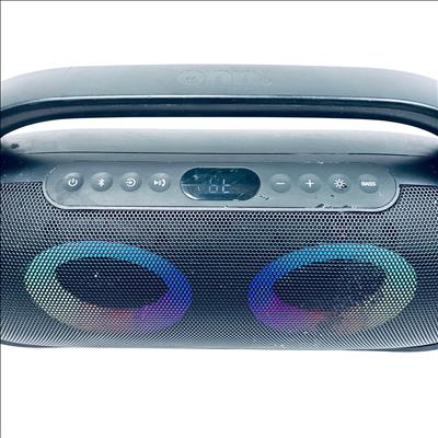 Onn Model 100097809 Portable Bluetooth Boombox Speaker with LED Lighting delivers powerful sound and vibrant multicolor LED effects for an enhanced audio experience. This portable speaker features Bluetooth connectivity and a built-in FM radio, making it versatile for indoor or outdoor use. Designed with a sleek black finish accented by a colorful circular LED pattern, it combines style with functionality.