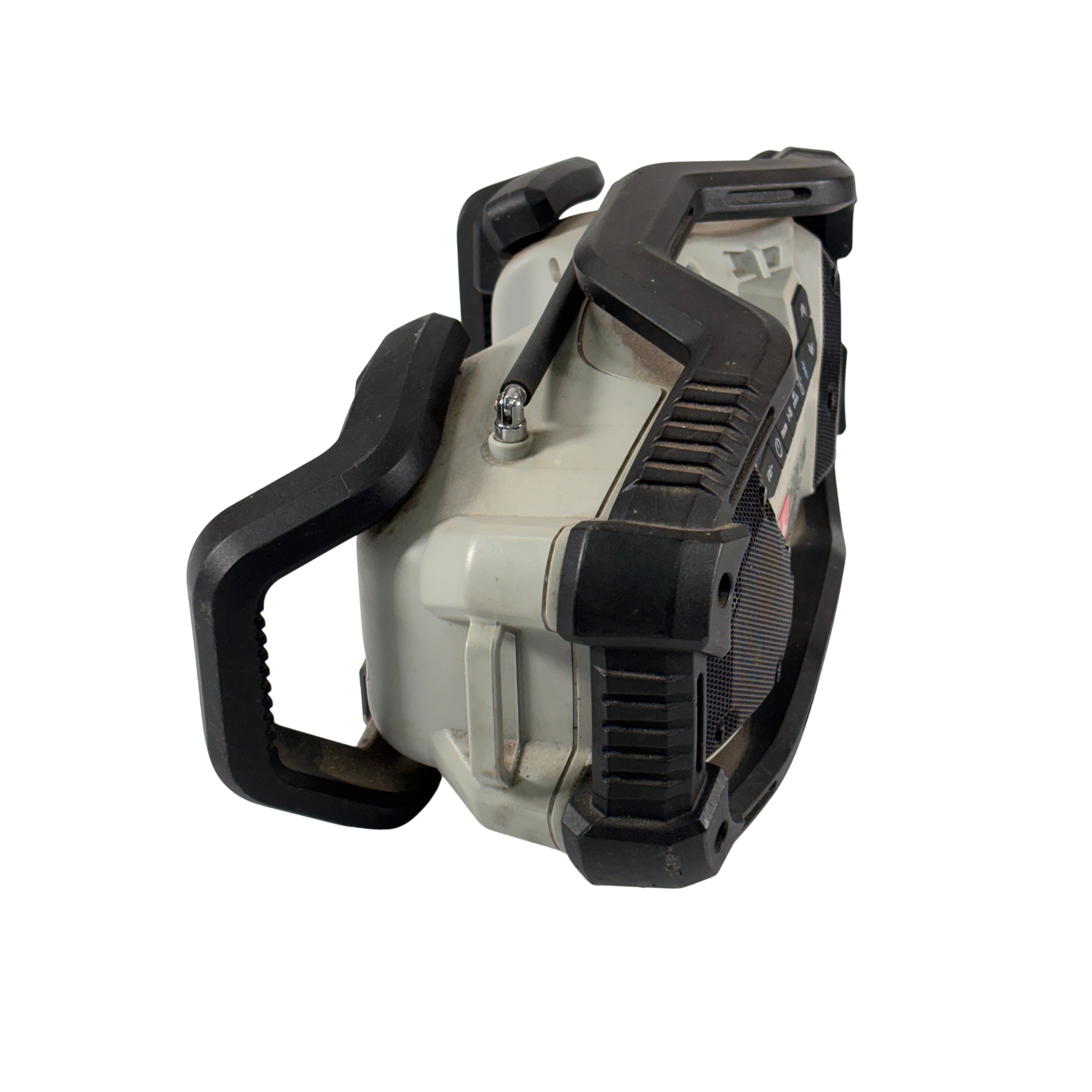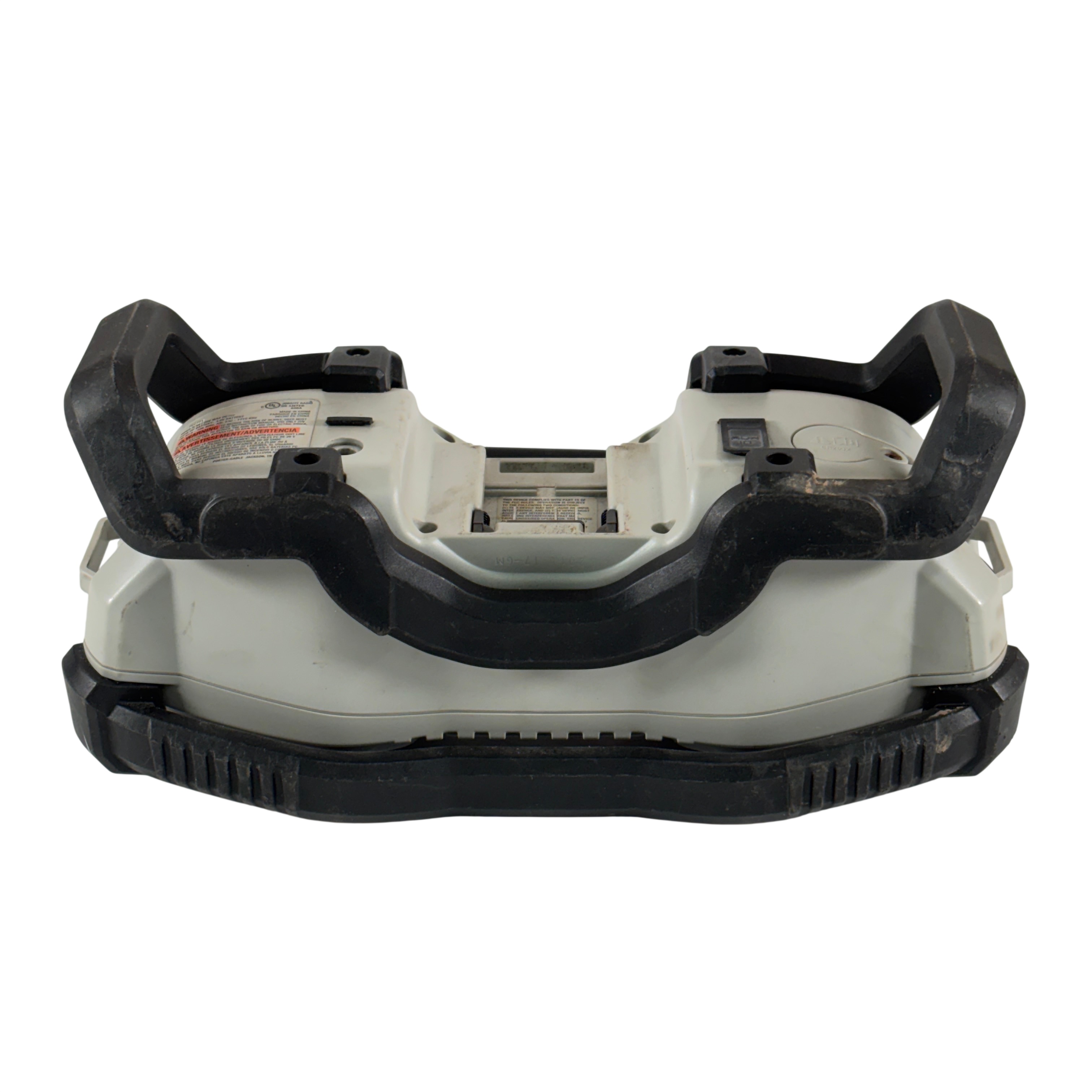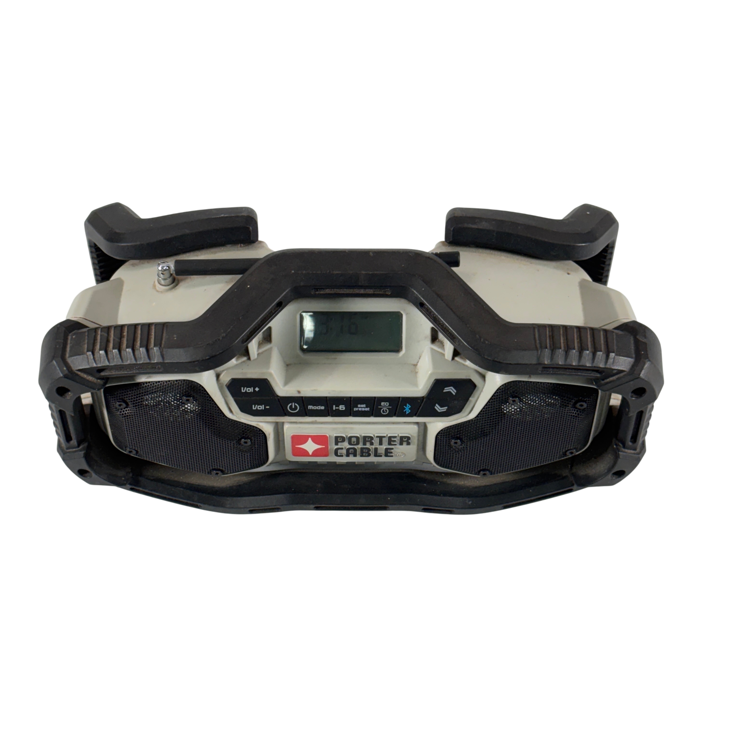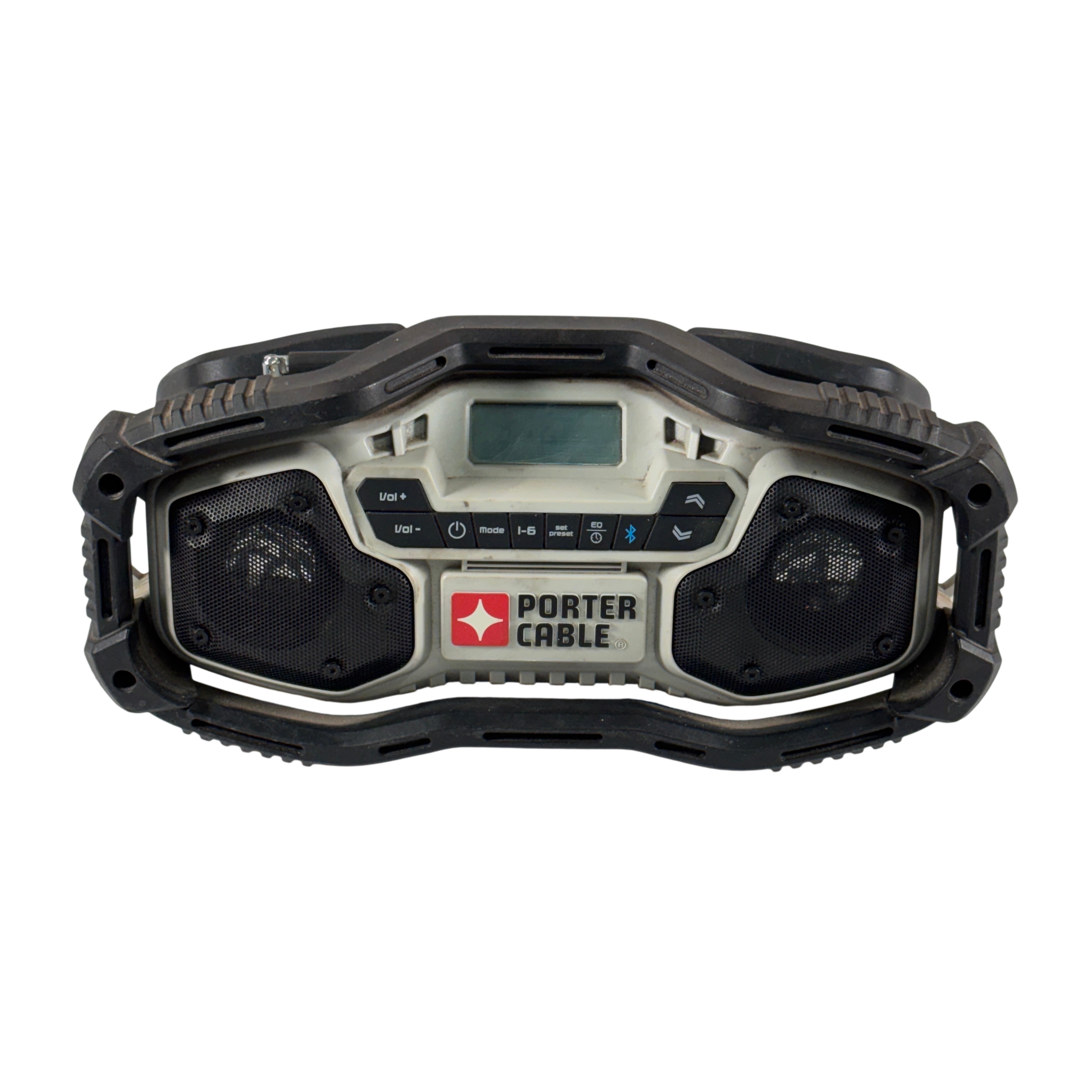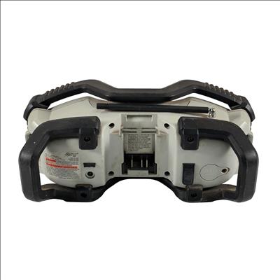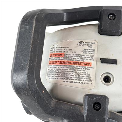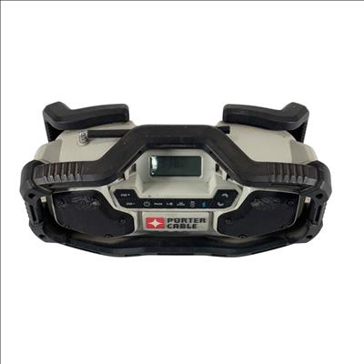 PORTER-CABLE PCC771 compact jobsite radio features AM, FM, and AUX functionality with 12 preset stations. It delivers clear, powerful sound through dual high-performance speakers and includes an equalizer to enhance audio quality. Bluetooth compatibility allows wireless streaming from smart devices, making it versatile for work or home use.