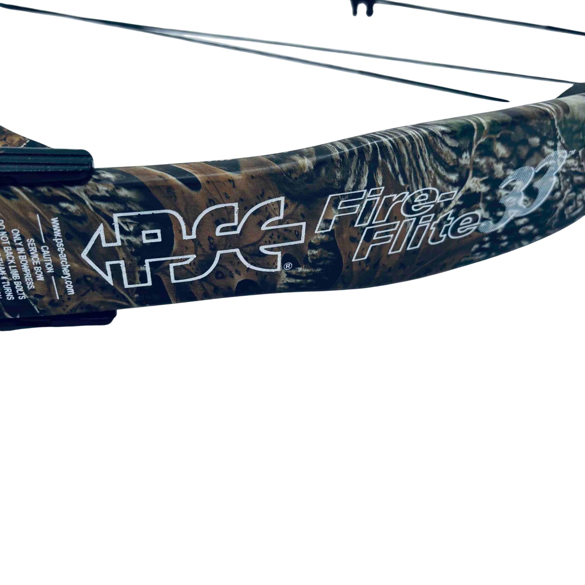 The PSE Fire Flite 33 is a high-performance compound bow, ideal for both hunting and target shooting. Featuring a robust camo design, advanced pulley system, and ergonomic handle, this bow offers durability and accuracy for archers of all levels. Get the power and reliability you need with the trusted PSE name.