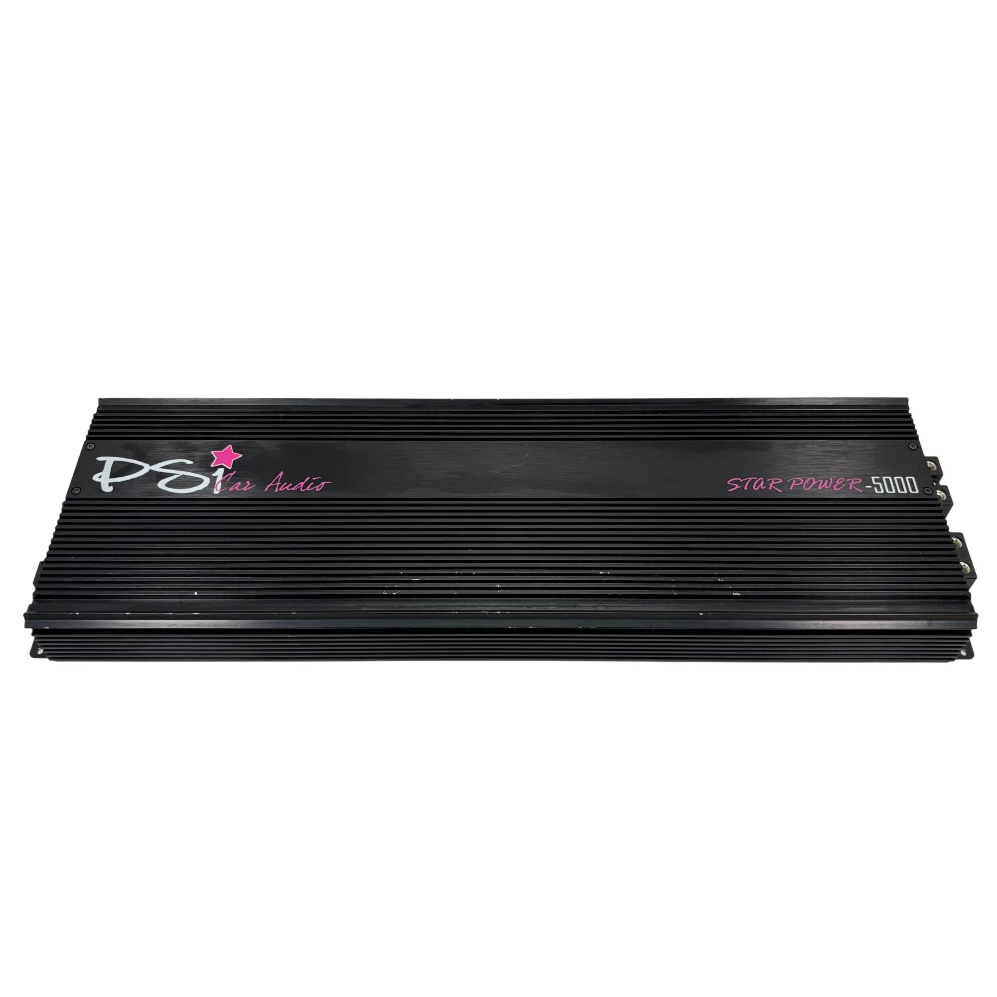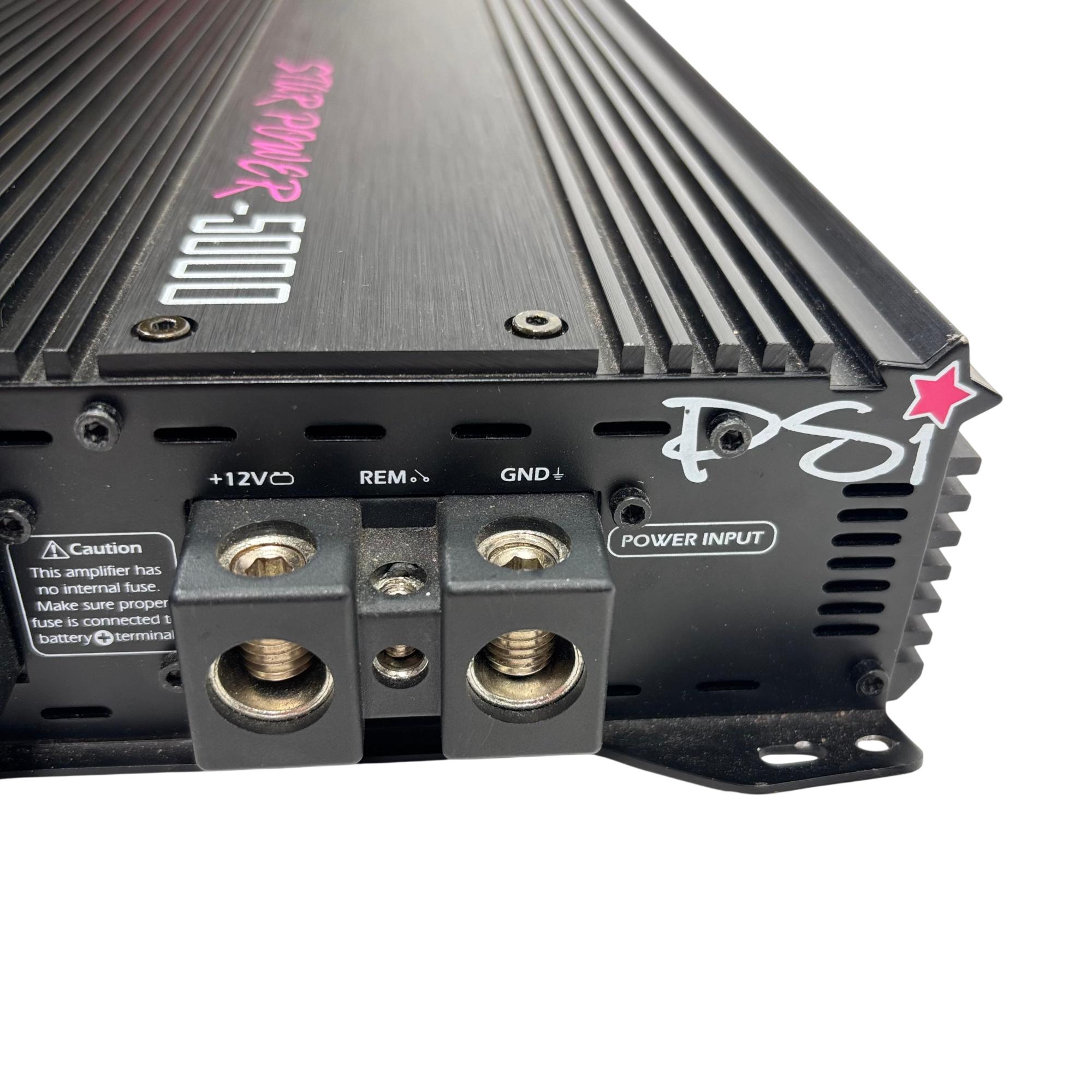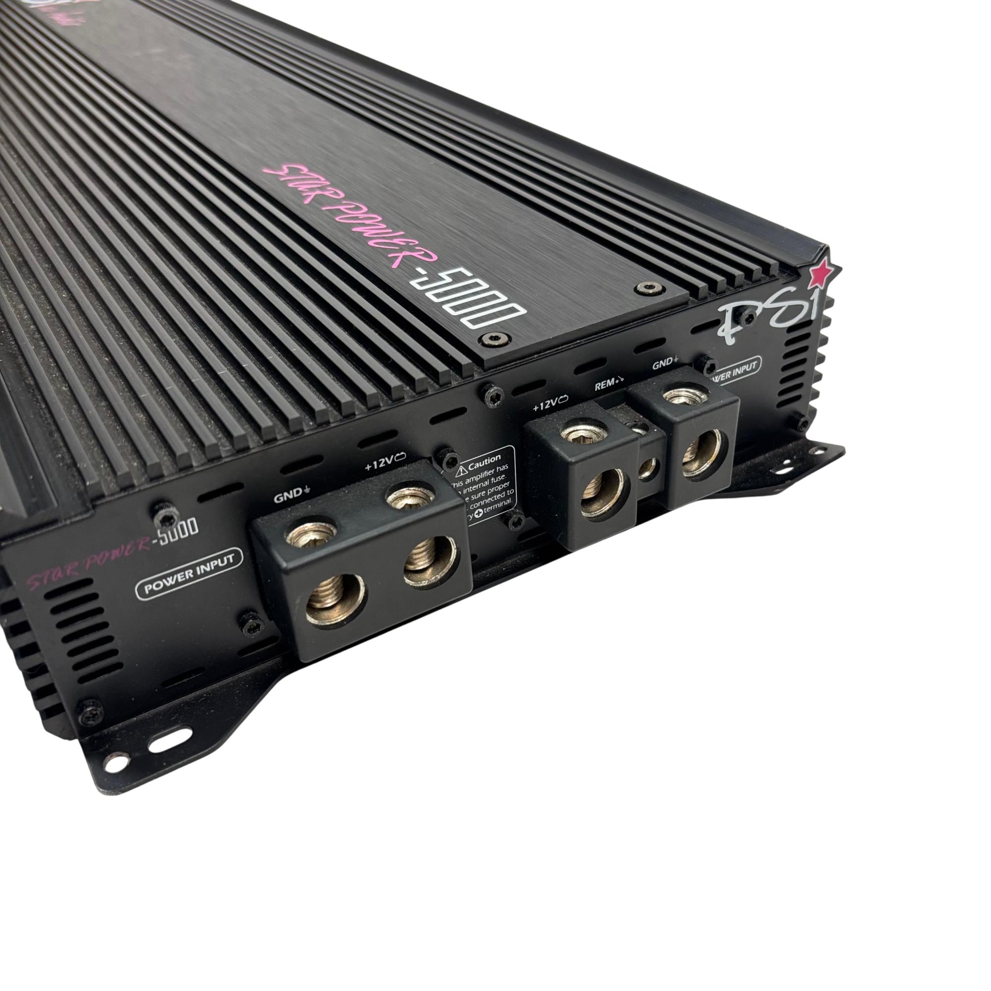 PSI Audio STAR POWER-5000 Car Audio Amplifier delivers powerful sound performance optimized for automotive audio systems. This high-output amplifier features a robust design with clear labeling and wiring connectivity, engineered to enhance audio quality and drive demanding subwoofers or speakers efficiently in a vehicle environment.