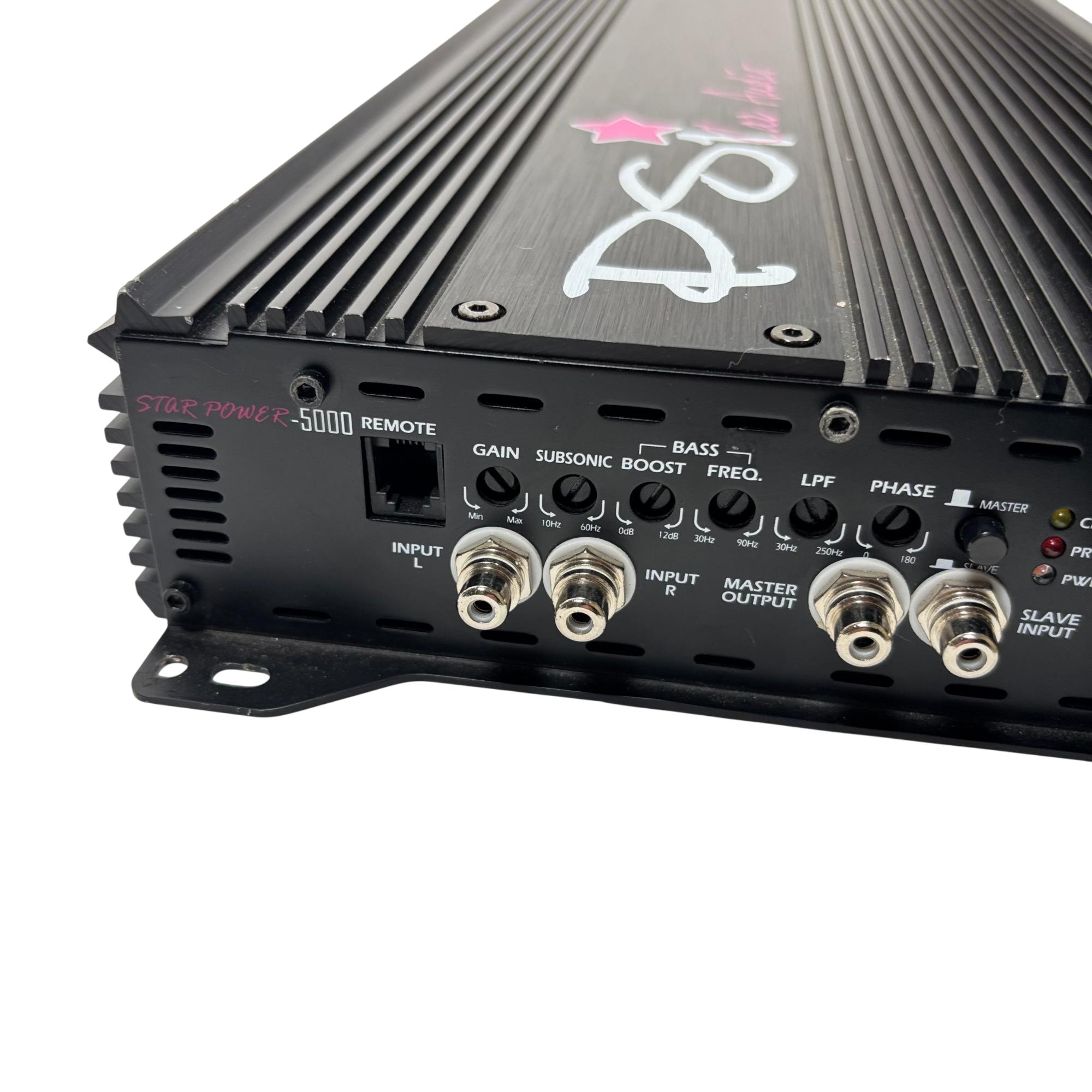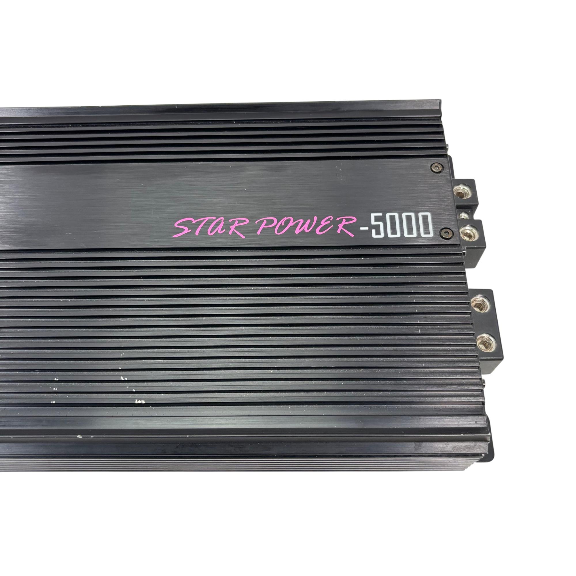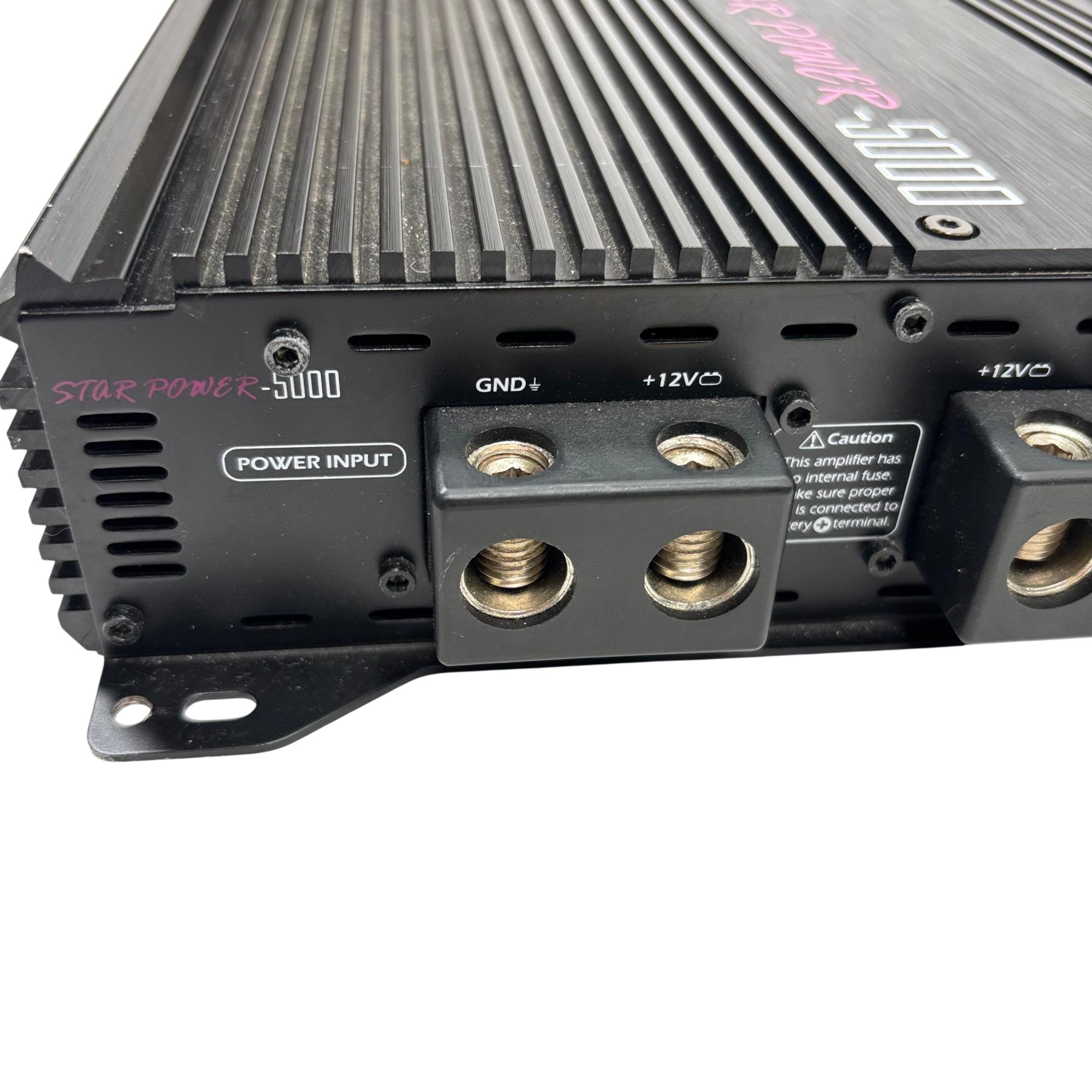 PSI Audio STAR POWER-5000 Car Audio Amplifier delivers powerful sound performance optimized for automotive audio systems. This high-output amplifier features a robust design with clear labeling and wiring connectivity, engineered to enhance audio quality and drive demanding subwoofers or speakers efficiently in a vehicle environment.