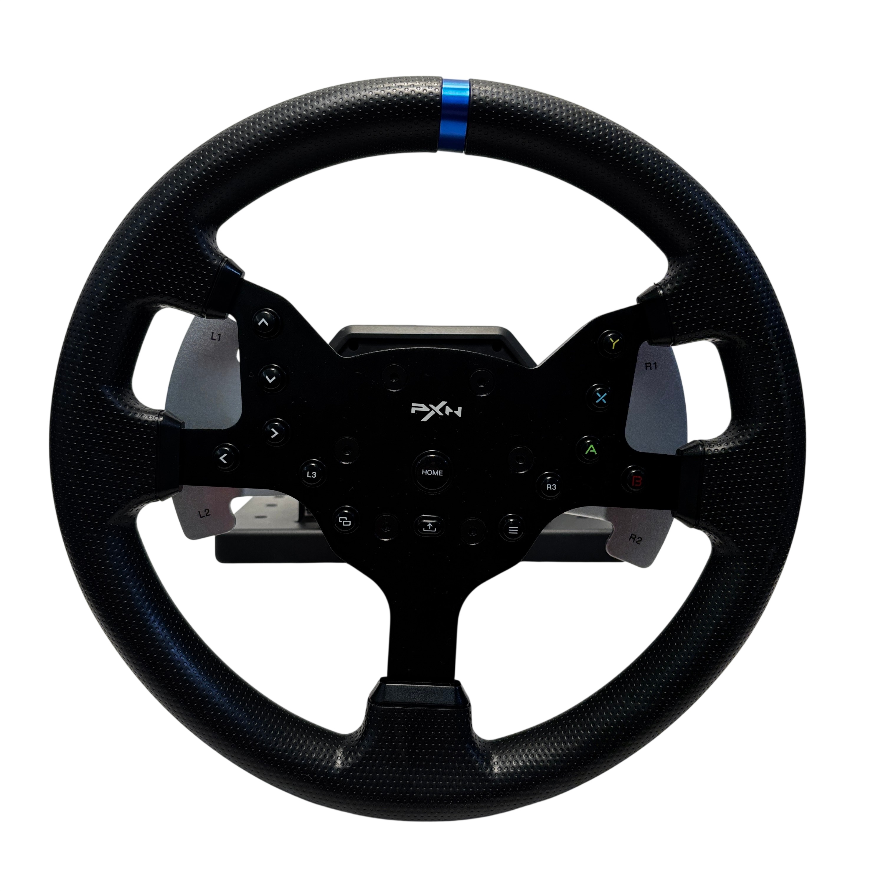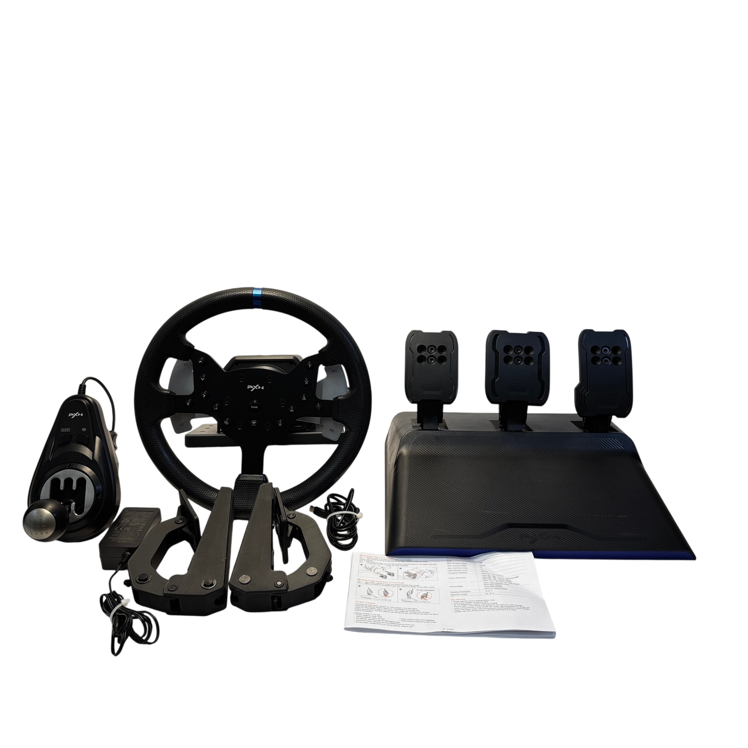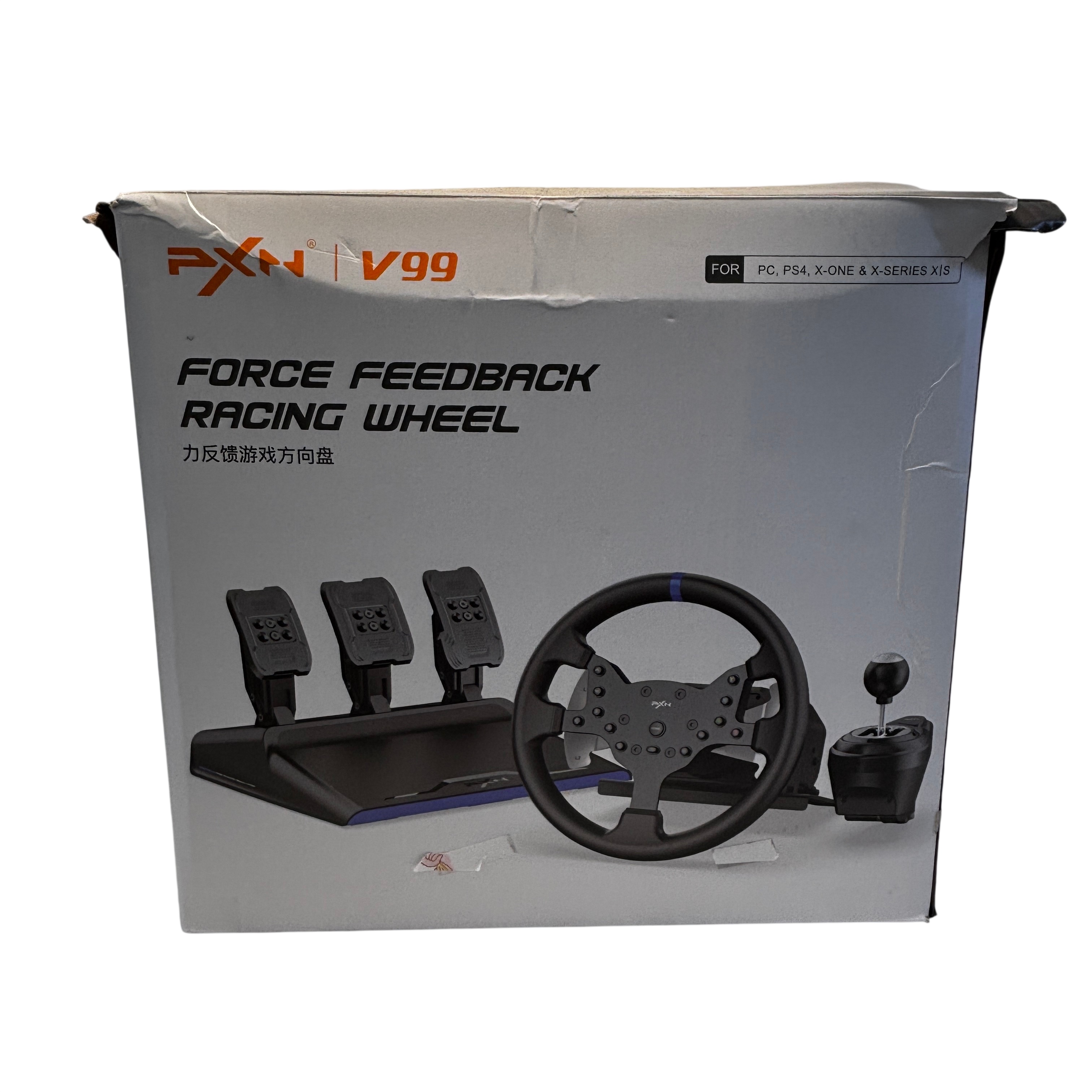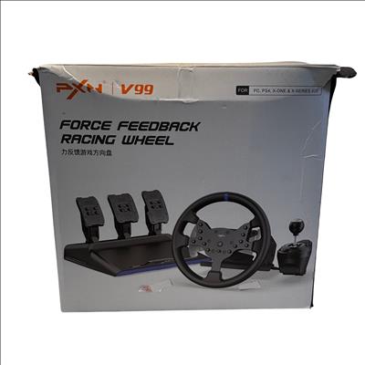The PXN V99 Force Feedback Racing Wheel offers an immersive driving experience with realistic force feedback and a full set of pedals including accelerator, brake, and clutch. Designed for compatibility with PC, PlayStation 4, Xbox One, and Xbox Series X/S, this racing wheel features multiple programmable buttons and paddle shifters for precise control. Included in the package are the racing wheel, pedal set, gear shifter, power adapter, and user manual, making it a complete setup for racing simulation enthusiasts. With its robust build and responsive feedback, the PXN V99 is ideal for gamers seeking enhanced realism in racing games.