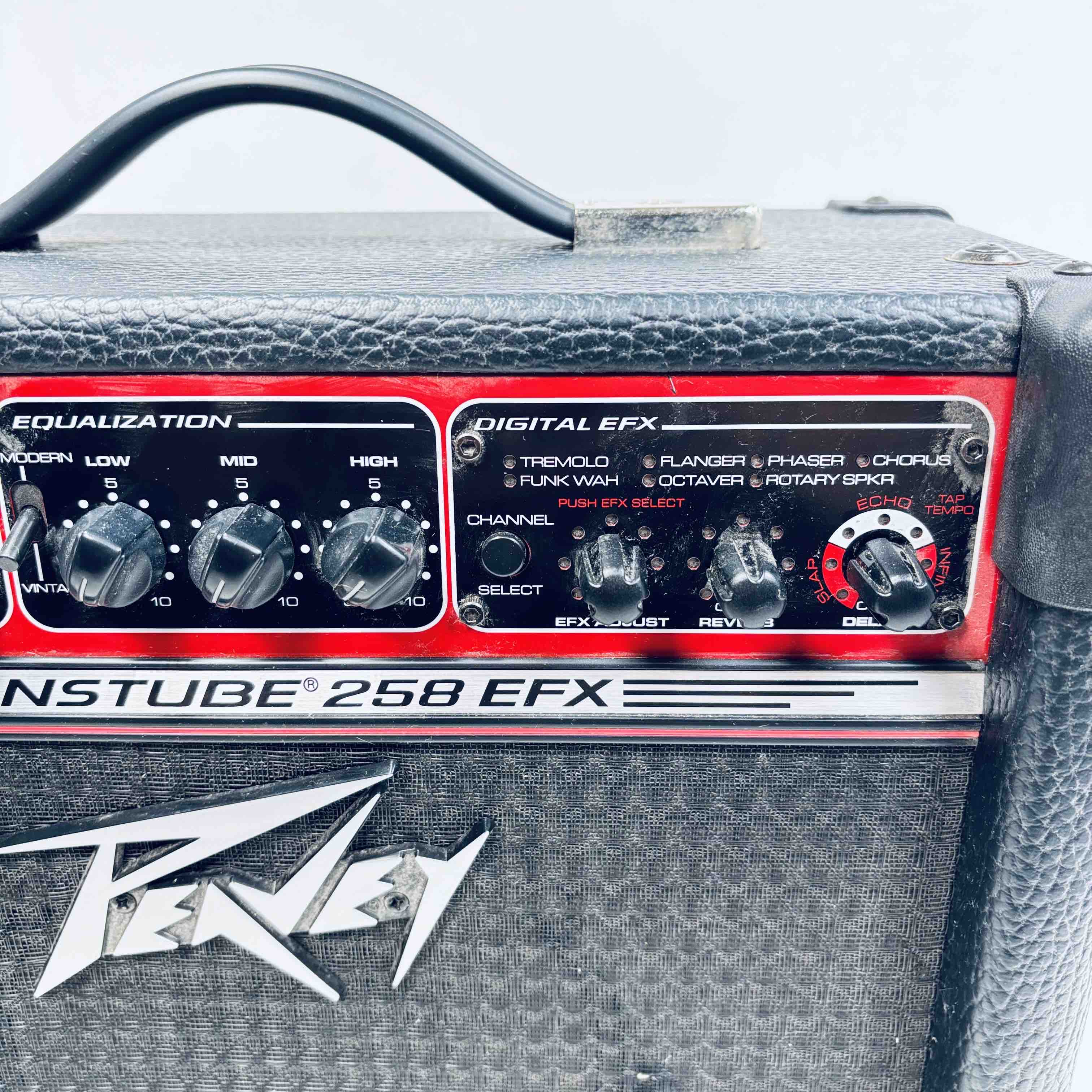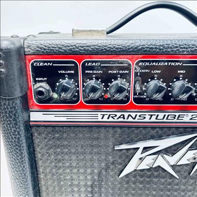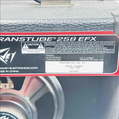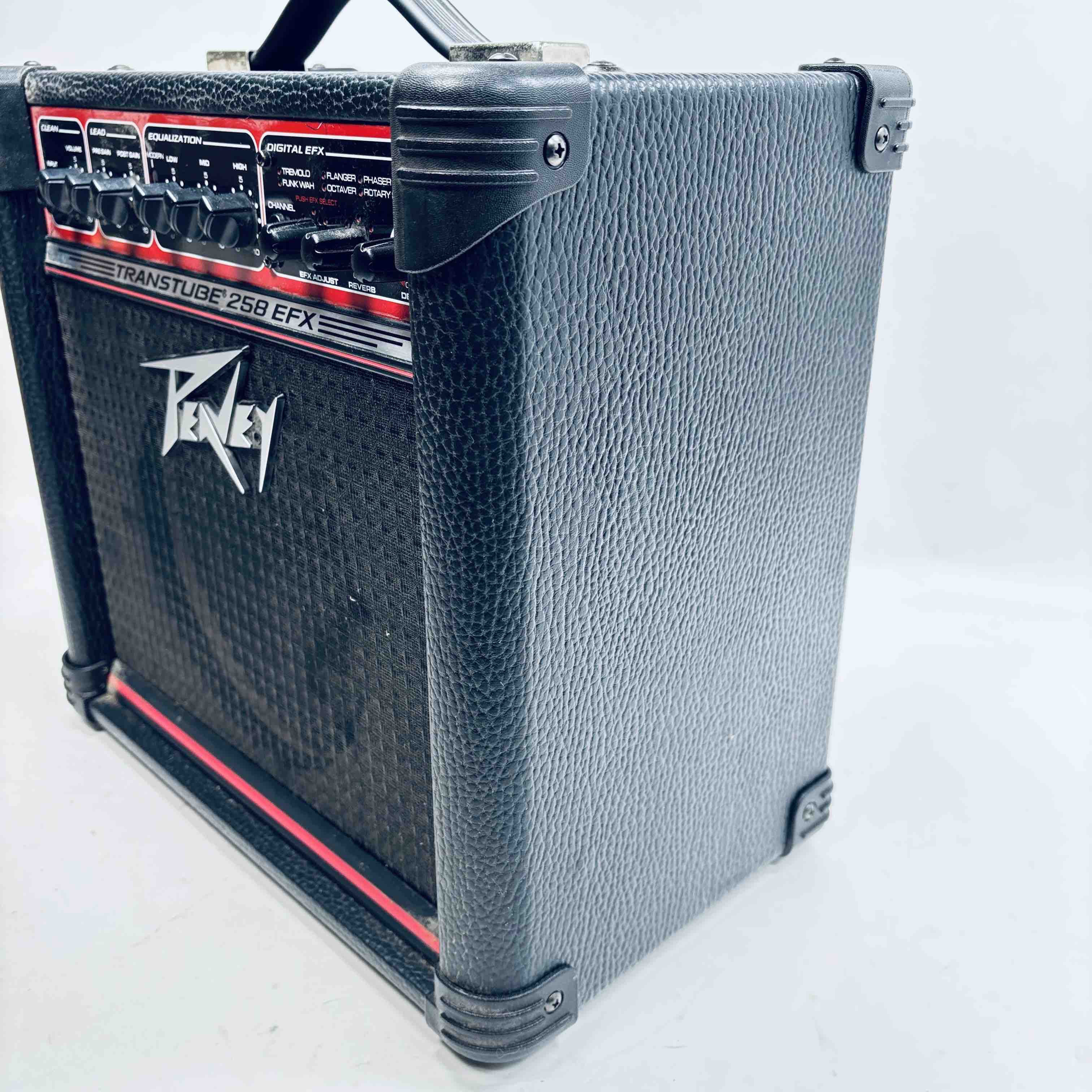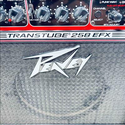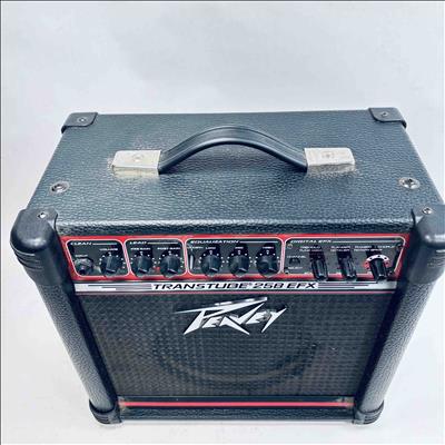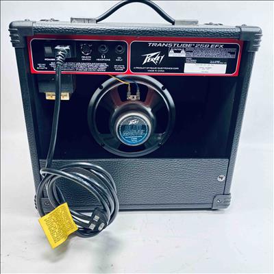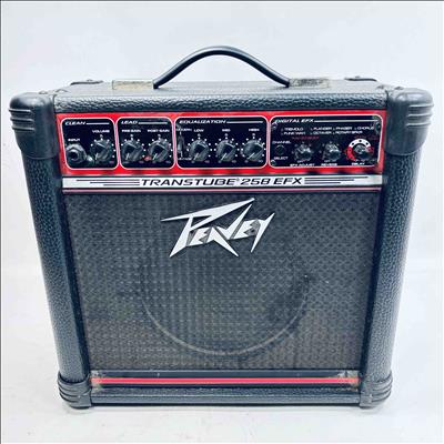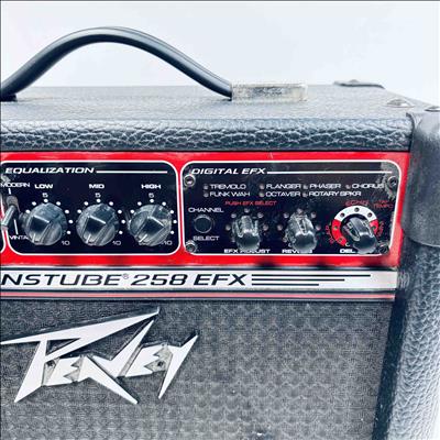 Peavey Transtube 258 EFX Guitar Combo Amplifier delivers 25 watts of powerful tube-driven tone with built-in digital effects including reverb, delay, tremolo, flanger, and phaser. This versatile black and red amplifier features multiple control knobs for pre gain, post gain, equalization, and EFX adjustment, making it suitable for clean and lead sound customization. Designed by Peavey Electronics, it operates at 120 VAC with an 8-ohm speaker load and includes a remote switch and headphone output for flexible use.