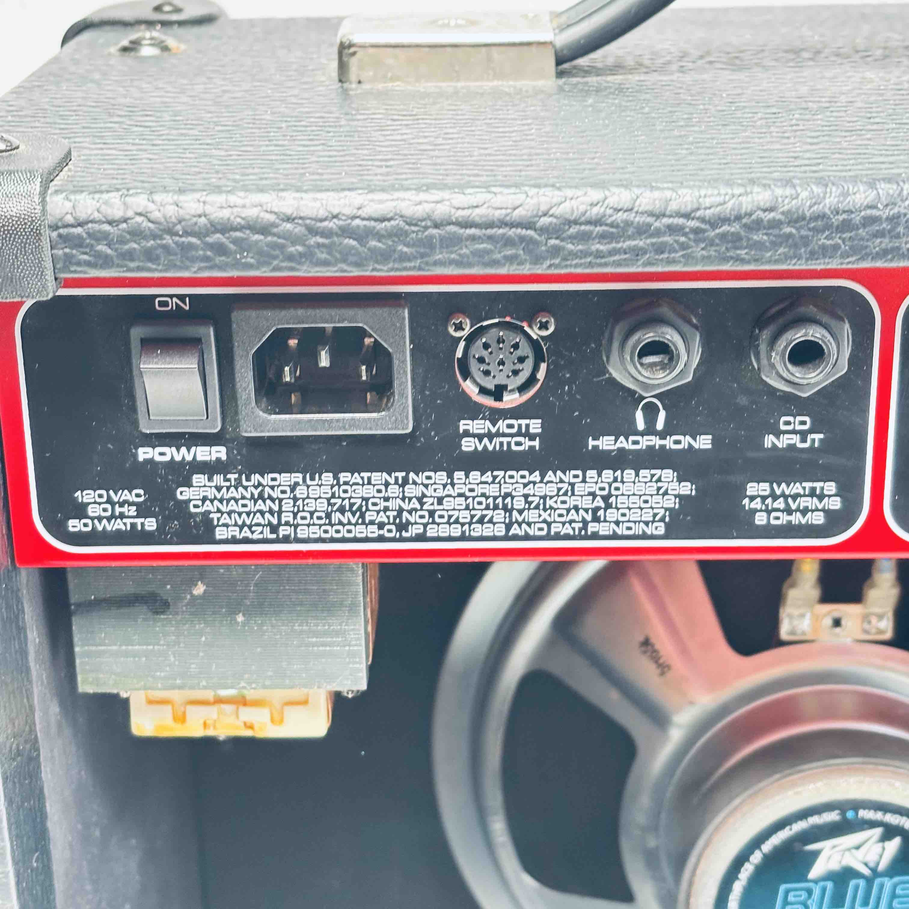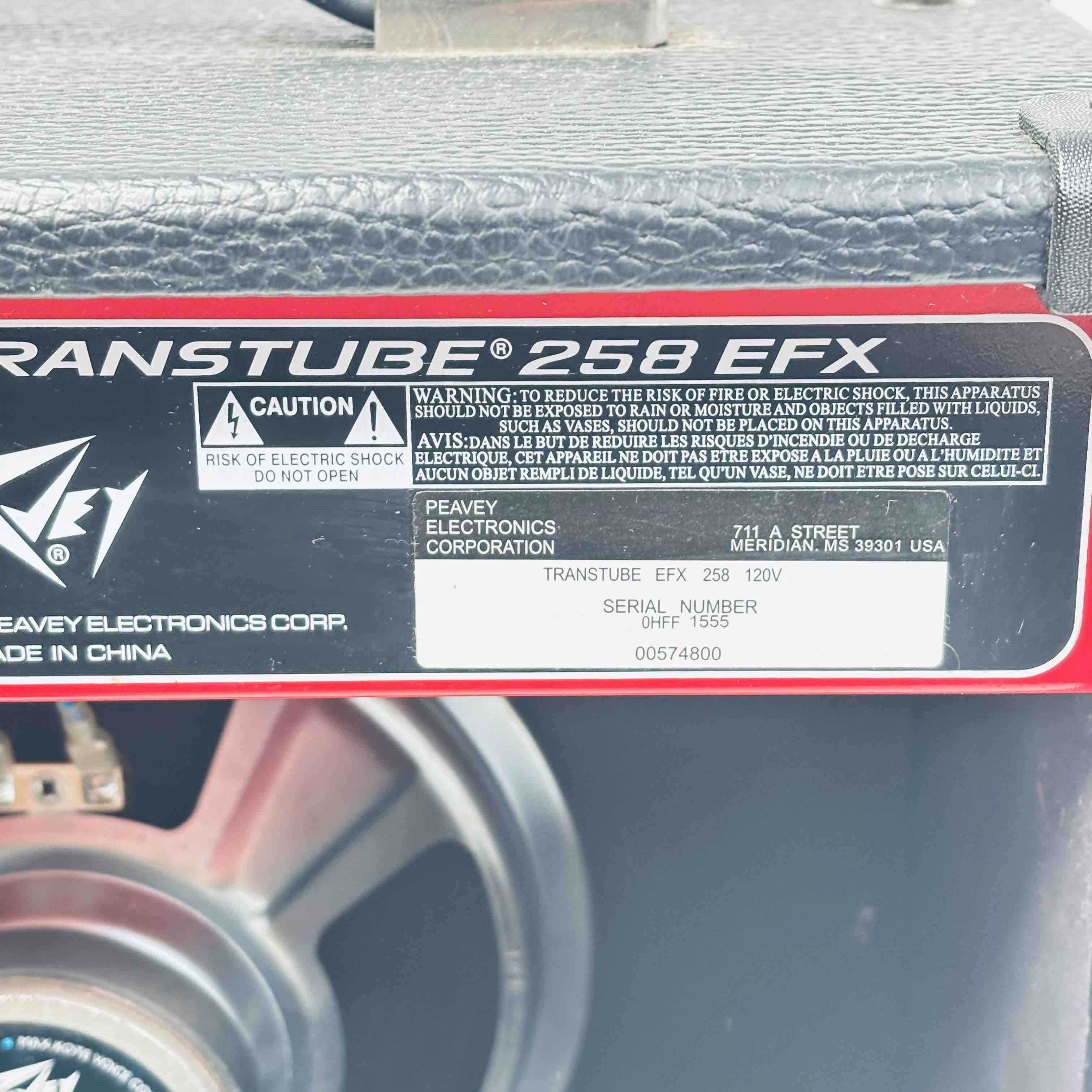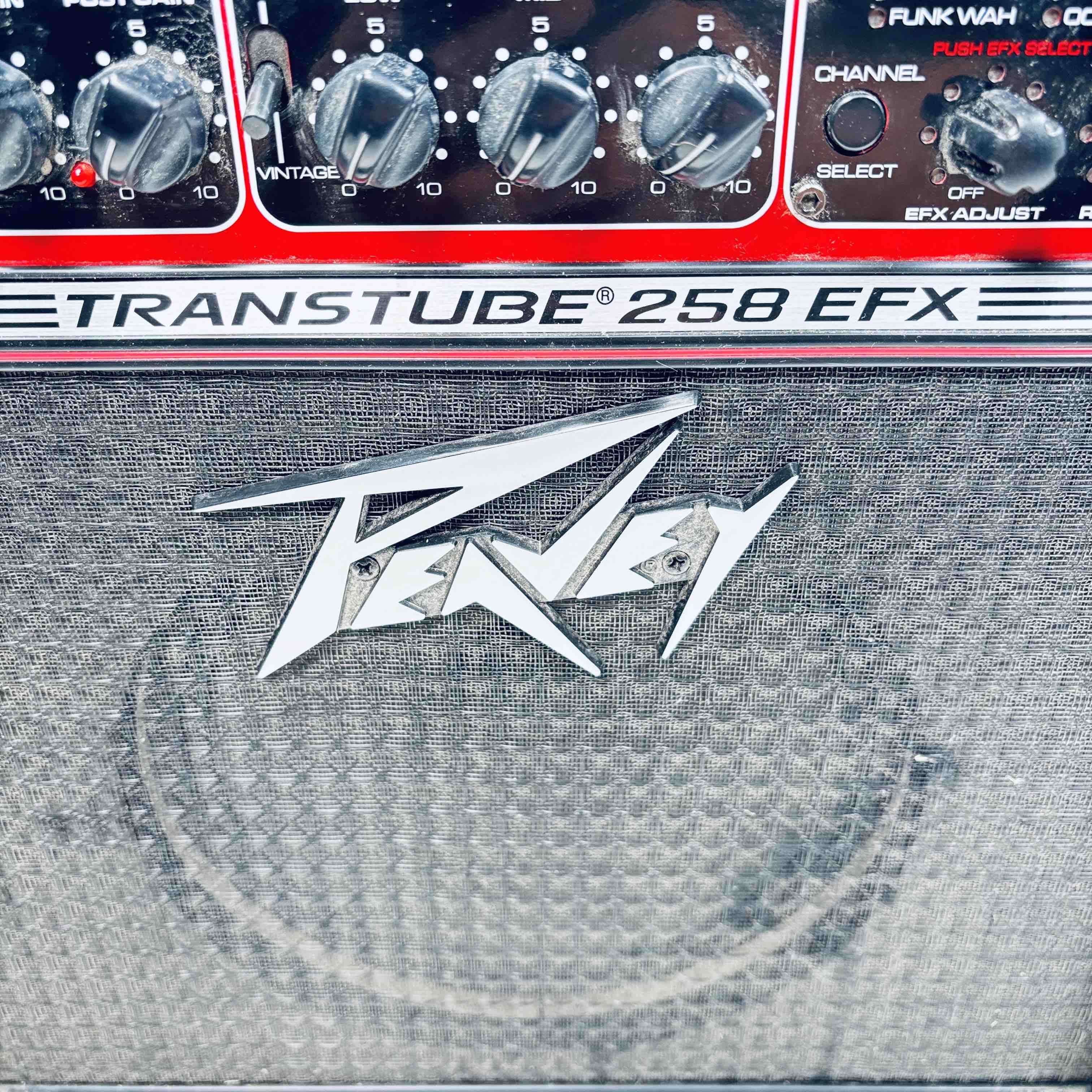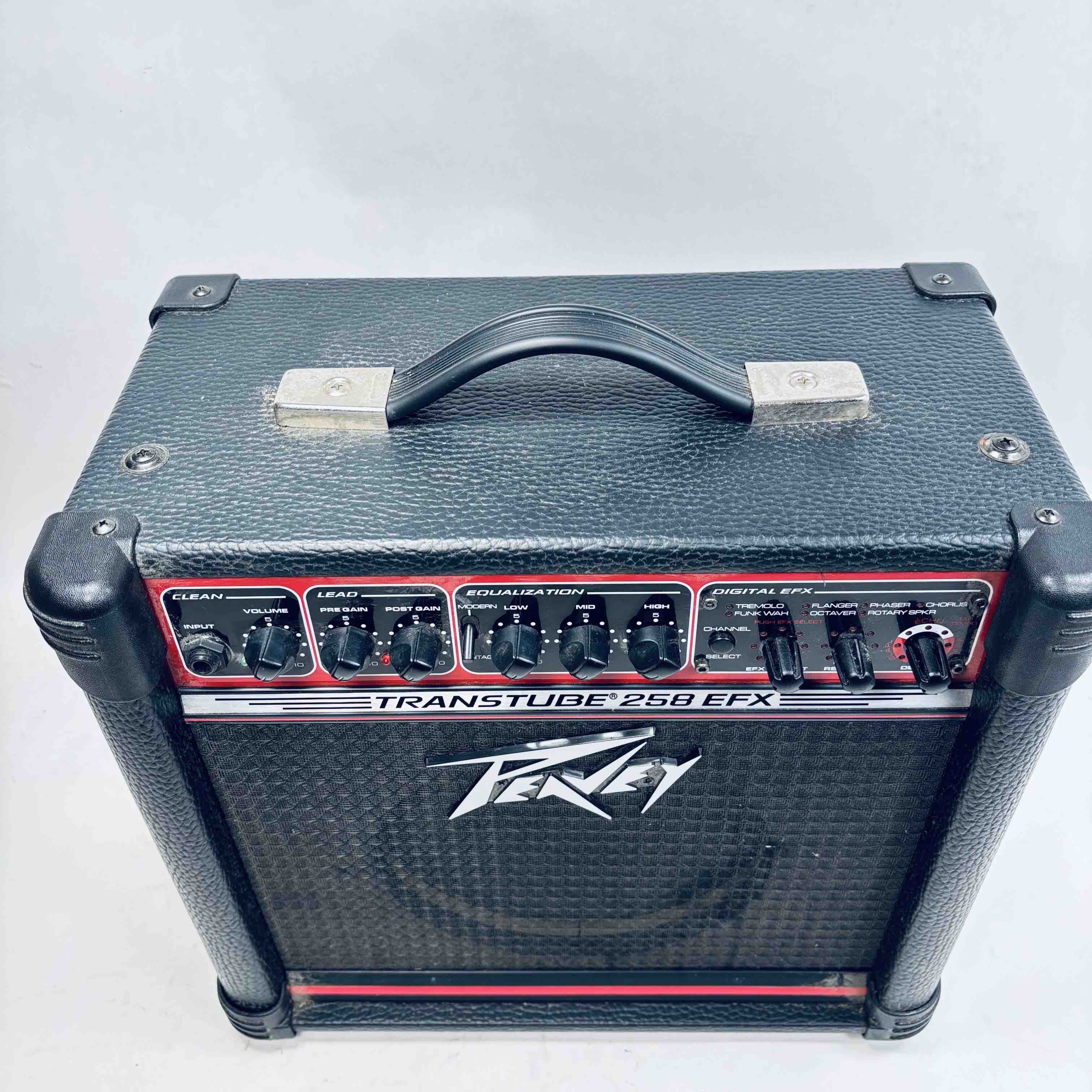 Peavey Transtube 258 EFX Guitar Combo Amplifier delivers 25 watts of powerful tube-driven tone with built-in digital effects including reverb, delay, tremolo, flanger, and phaser. This versatile black and red amplifier features multiple control knobs for pre gain, post gain, equalization, and EFX adjustment, making it suitable for clean and lead sound customization. Designed by Peavey Electronics, it operates at 120 VAC with an 8-ohm speaker load and includes a remote switch and headphone output for flexible use.