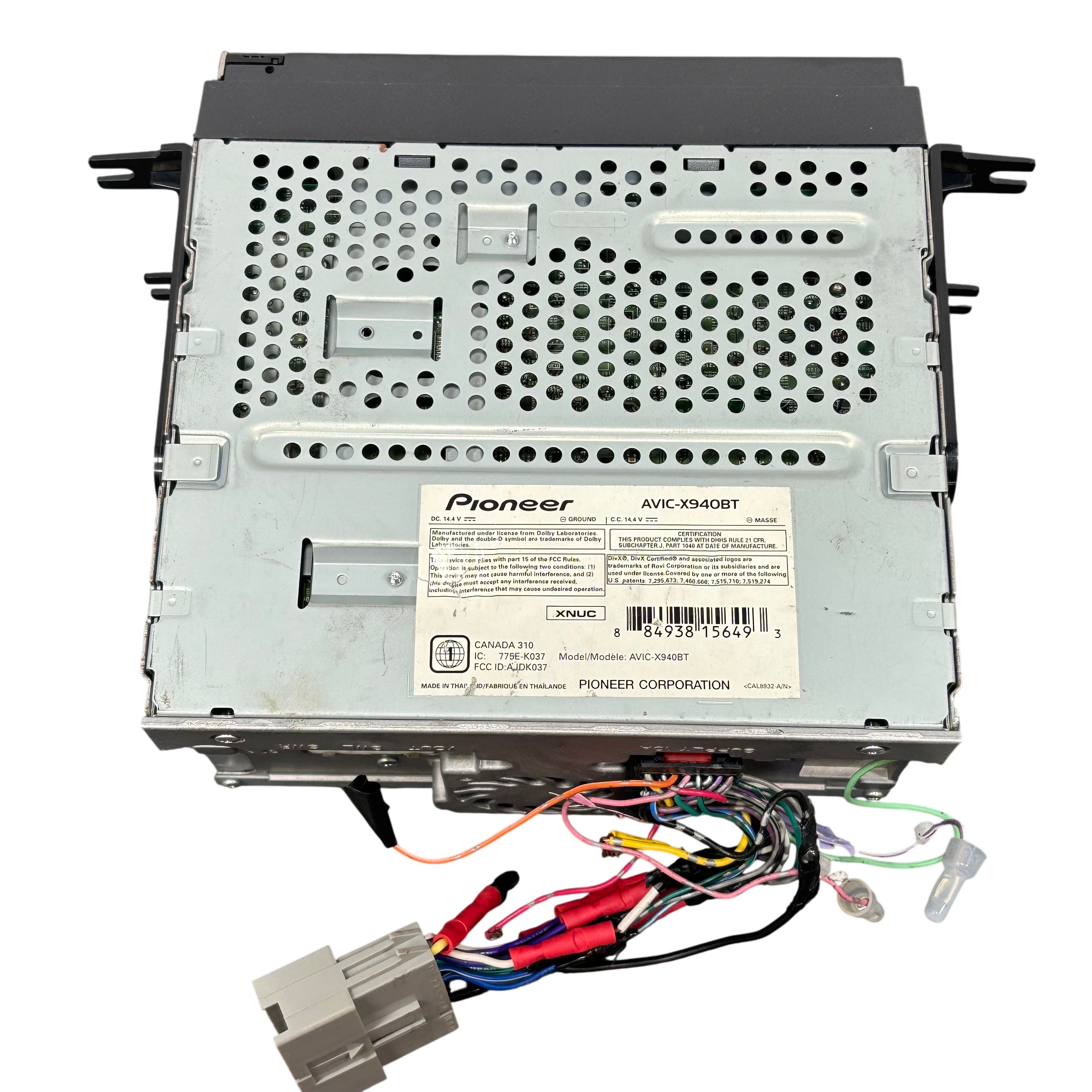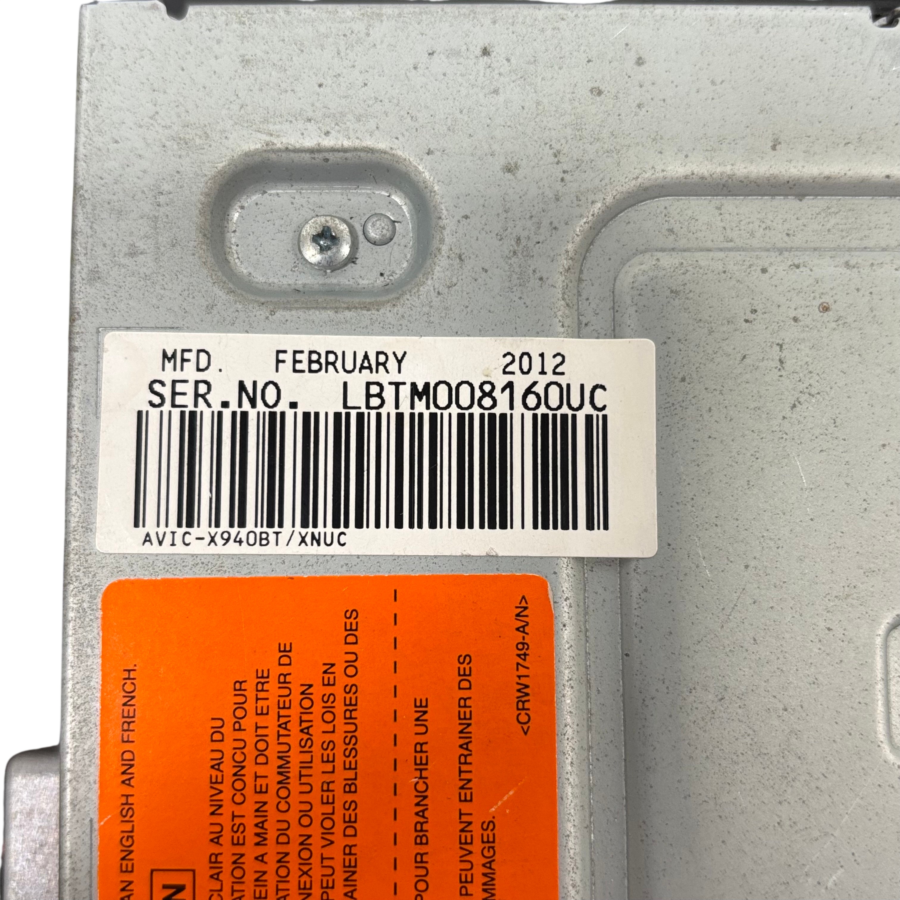 The Pioneer AVIC-X940BT is a versatile car stereo receiver featuring built-in Bluetooth for hands-free calling and audio streaming, along with DVD playback and DivX video support. Manufactured in February 2012, this model includes a micro SD card slot for expanded media options and integrated GPS navigation to assist drivers on the road. Designed for 14.4V DC power input, it fits standard double-DIN slots and offers comprehensive connectivity for enhanced in-car entertainment. Ideal for upgrading your vehicles audio system with modern multimedia features.