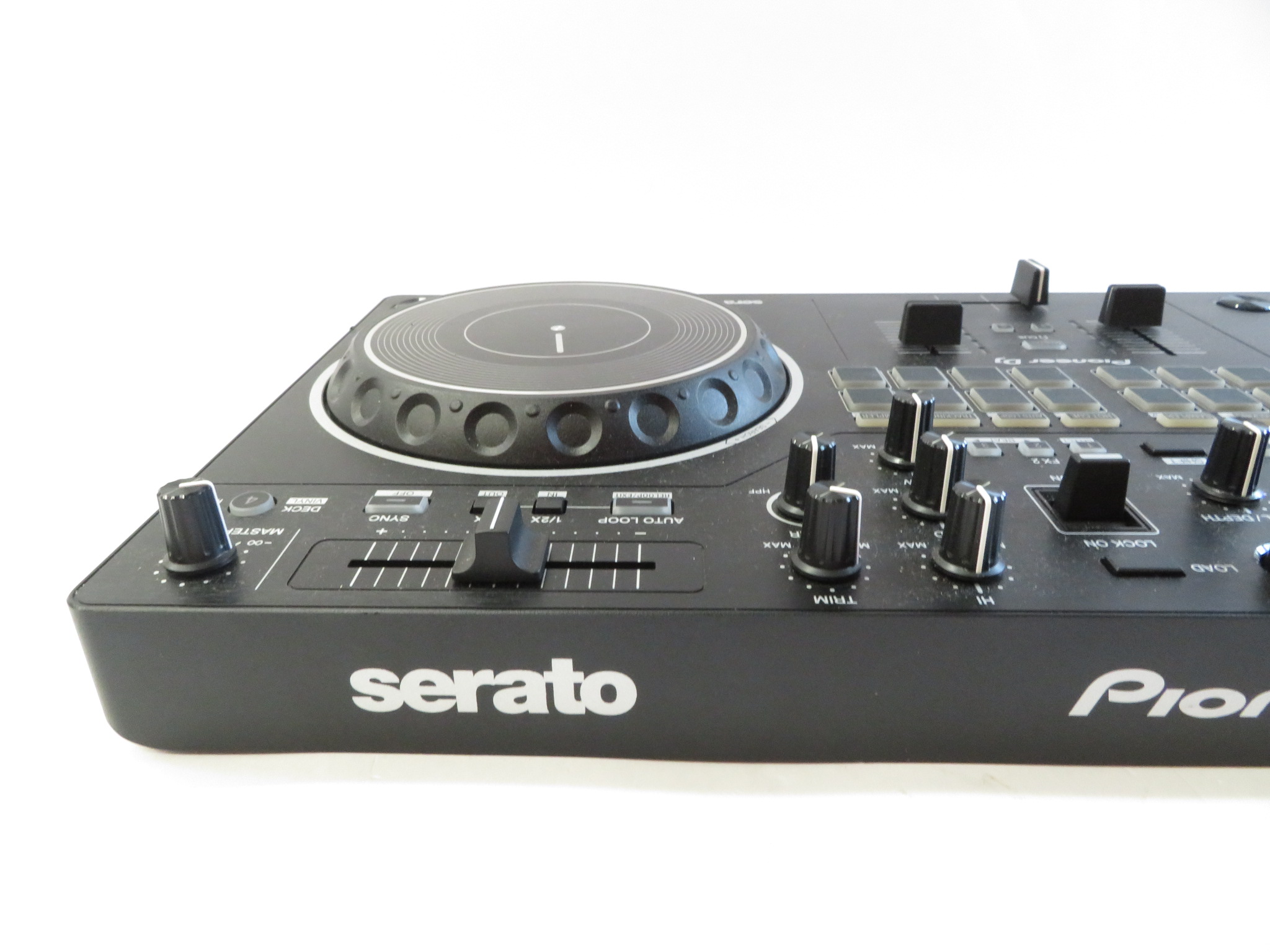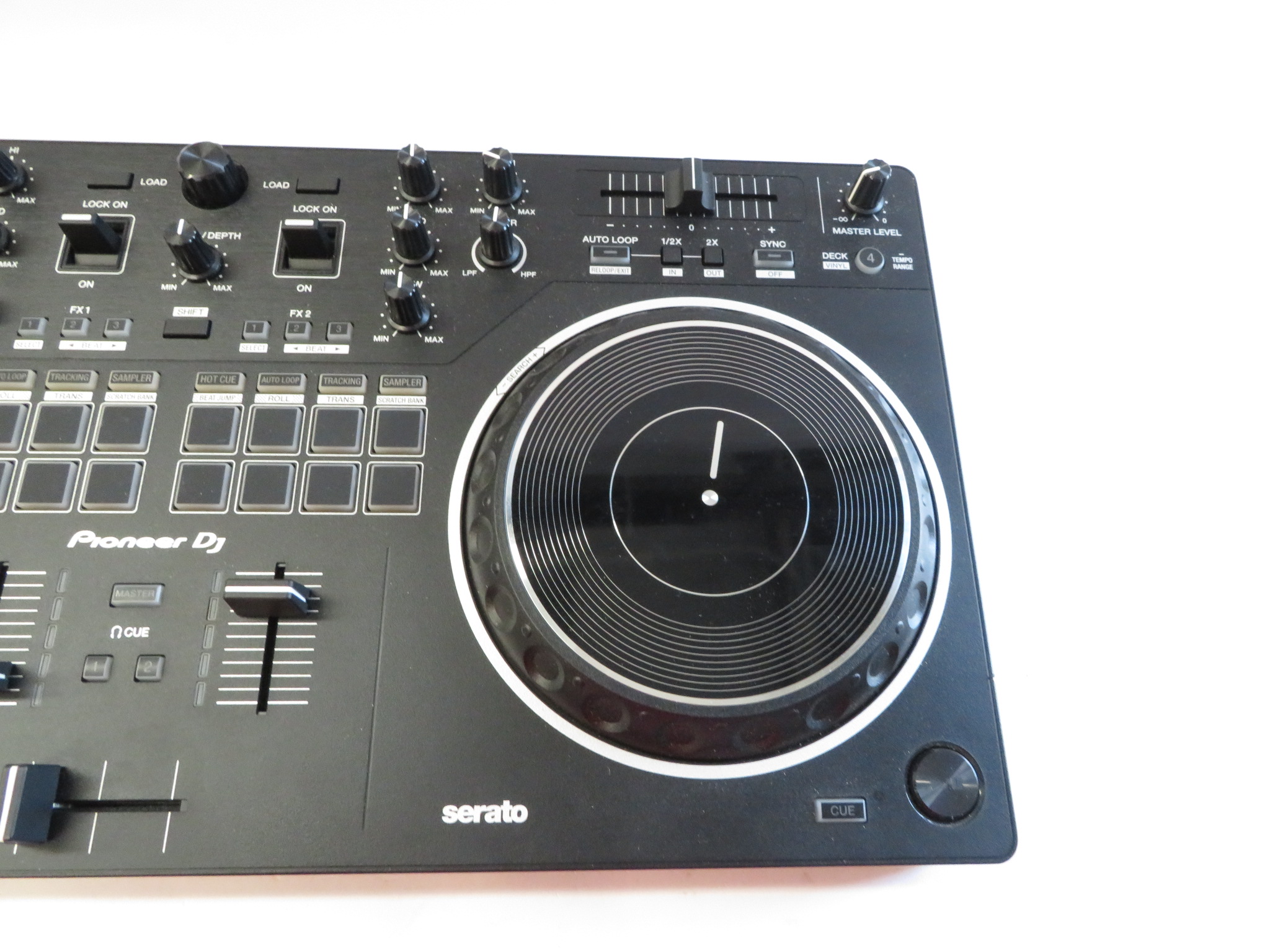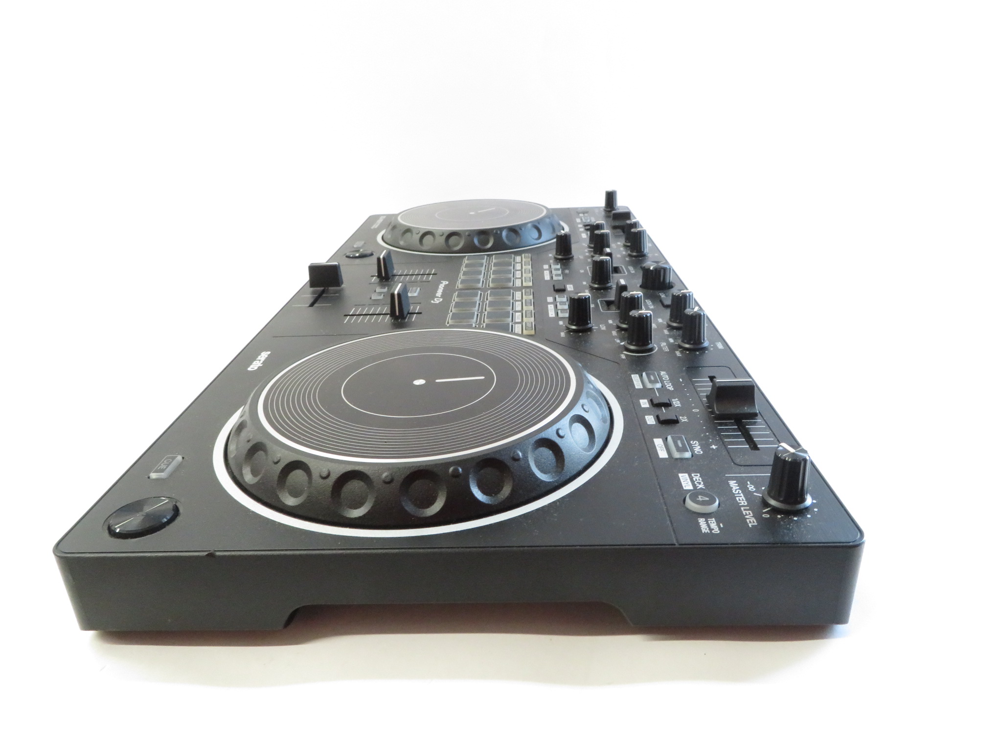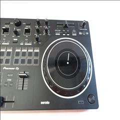 A 2-channel scratch-style DJ controller that mimics the setup of professional battle DJs with an interface designed to emulate PLX turntables and a DJM-S series mixer. With dimensions of 526 mm in width, 59.2 mm in height, and 255.5 mm in depth, and weighing 2.1 kg, this controller features a 24 bit/48 kHz soundcard, a signal-to-noise ratio of 103 dB, and a distortion rate of less than 0.005%. It supports a frequency range of 20 - 20000 Hz and is powered via USB Type-B, consuming 5V 500mA. The DDJ-REV1 offers expanded control for mixing and scratching with its 60mm tempo sliders placed horizontally above the decks for precise speed adjustments, and Performance Pads located in the mixer section for intuitive effects combination, sample triggering, and track scratching. Lever FX allows dynamic texture addition to music, with the ability to apply effects from Serato DJ Lite either in short bursts or locked on for continuous play, facilitating hands-free operation for scratching or track browsing.