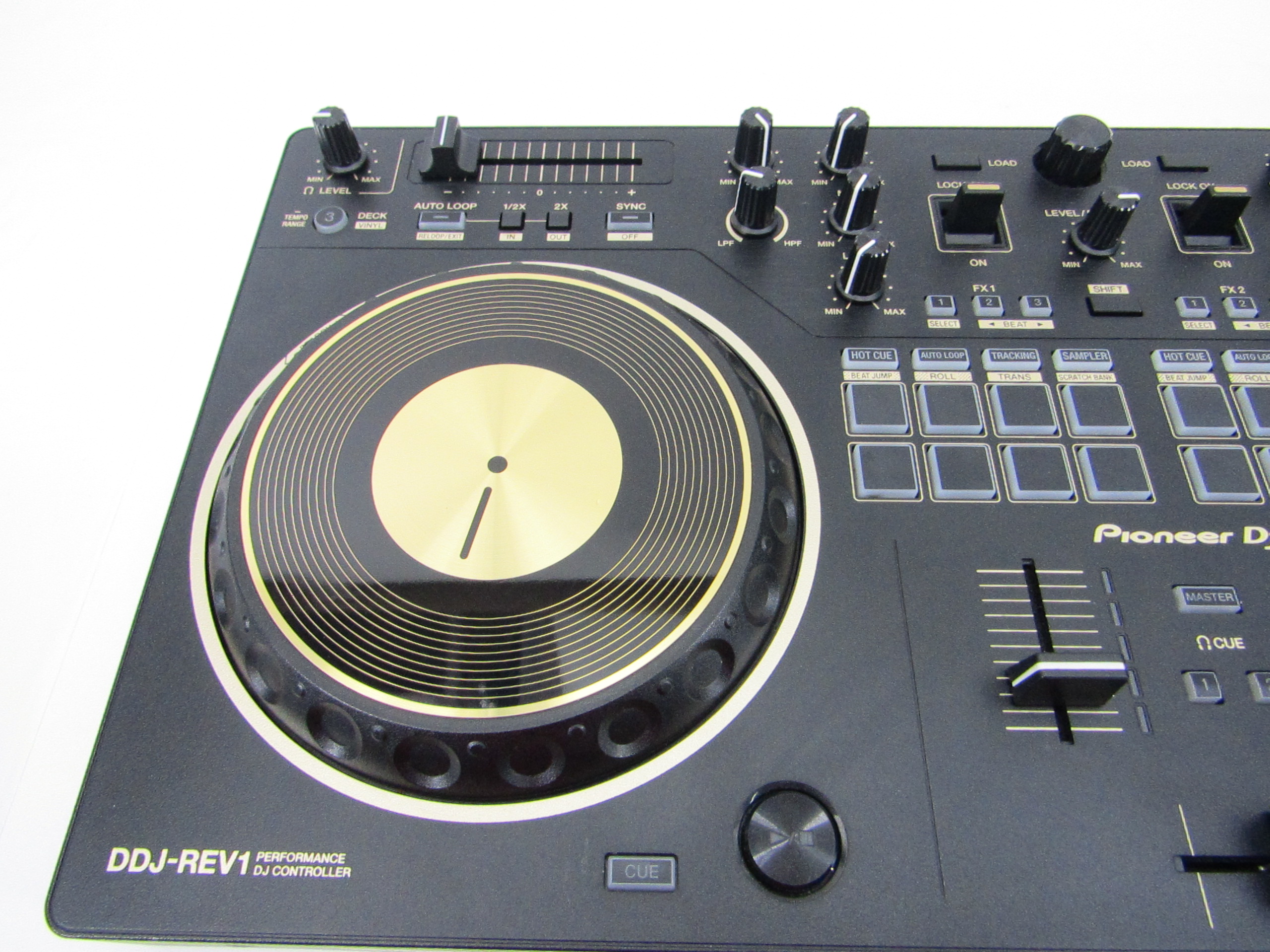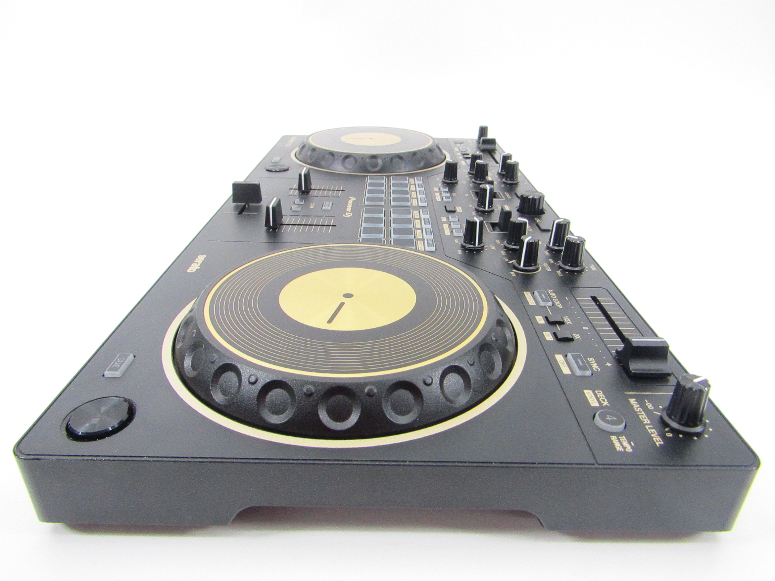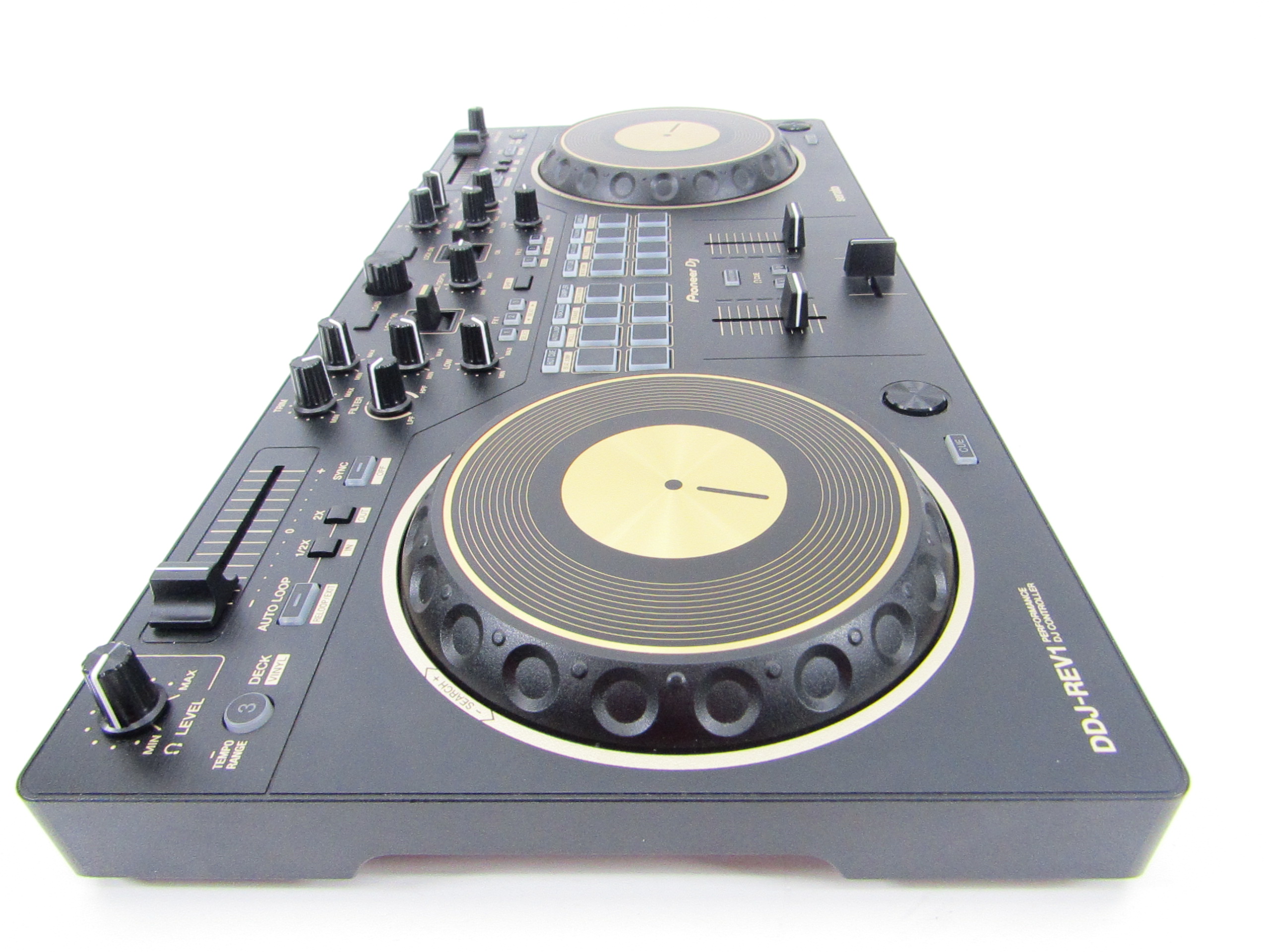 This Pioneer DDJ-REV1-N Serato Performance DJ controller in limited-edition gold is an ideal solution for open-format and scratch DJs as it emulates a professional DJM-S mixer and PLX turntable setup. For the first time on a Pioneer DJ controller, the tempo sliders sit horizontally on top of the deck sections to mirror PLX turntables in a battle configuration, while the performance pads and Lever FX paddles sit in the mixer section to parallel the DJM-S Series mixer design. This professional DJ controller features a spacious layout to test new mixing techniques and scratch-ready jog wheels, which are noticeably larger than jog wheels on previous beginner level controllers. This is an ideal starter kit for artists considering learning how to battle, scratch and stream their sets.