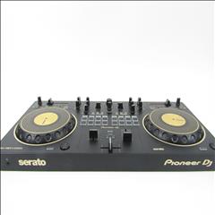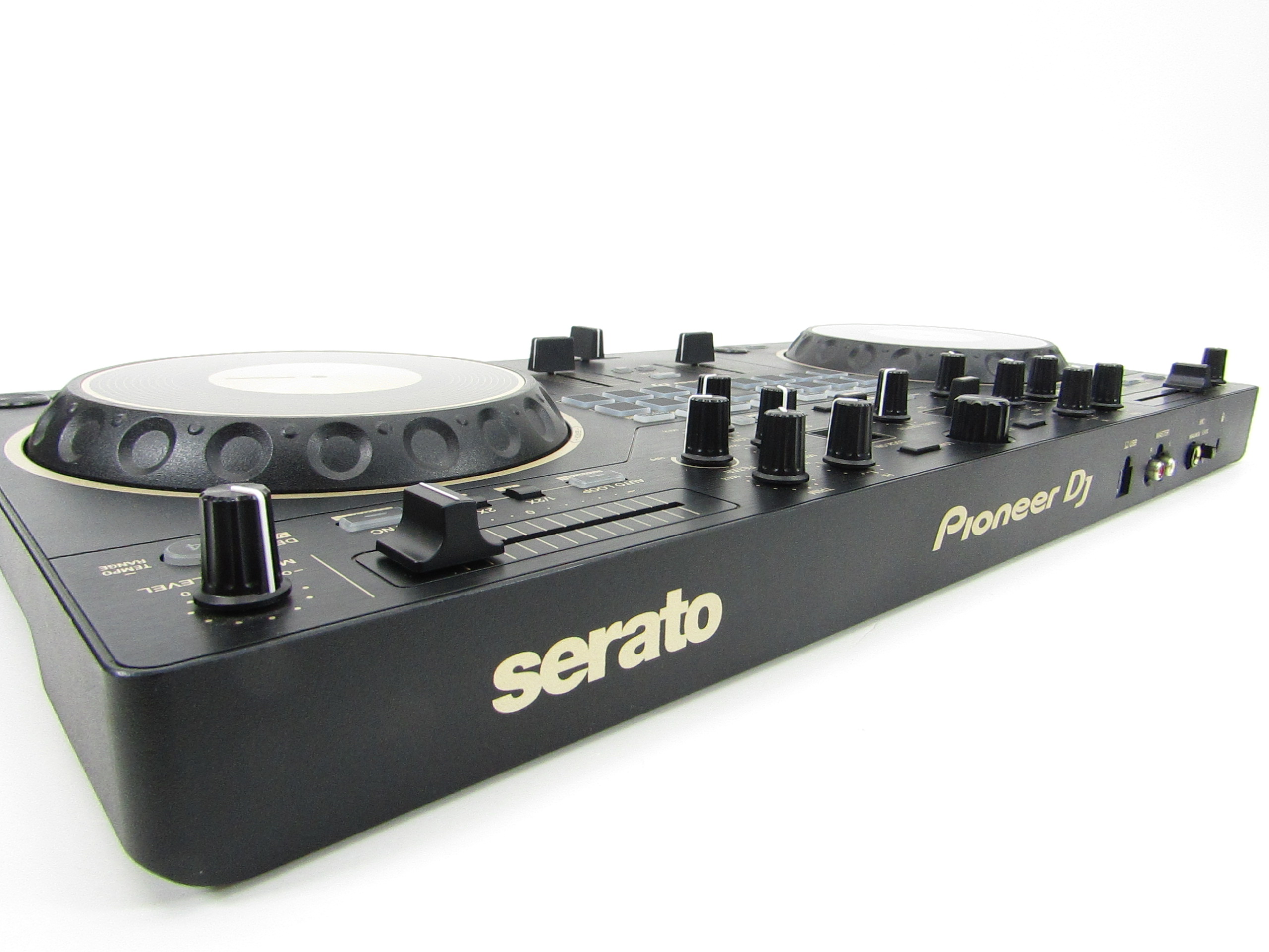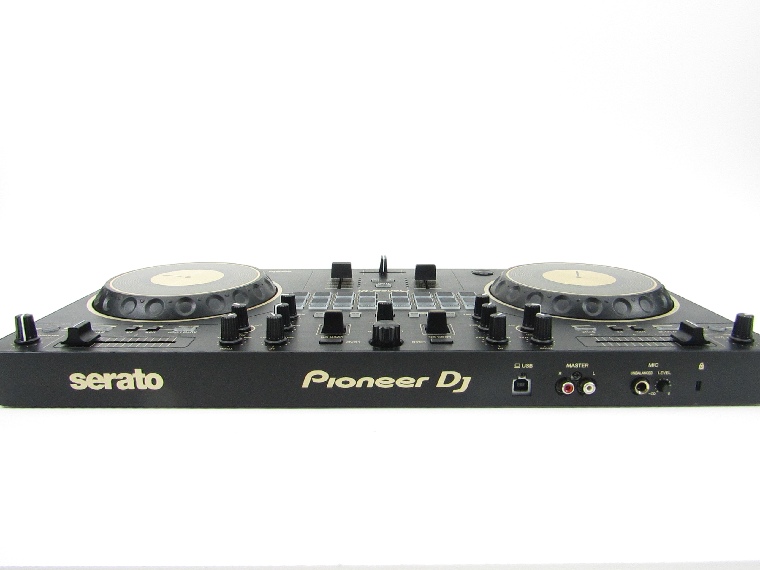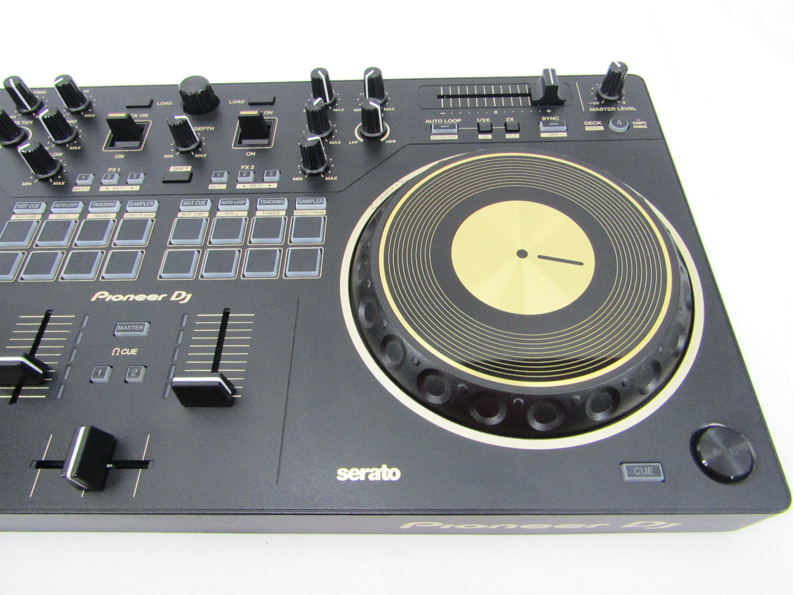 This Pioneer DDJ-REV1-N Serato Performance DJ controller in limited-edition gold is an ideal solution for open-format and scratch DJs as it emulates a professional DJM-S mixer and PLX turntable setup. For the first time on a Pioneer DJ controller, the tempo sliders sit horizontally on top of the deck sections to mirror PLX turntables in a battle configuration, while the performance pads and Lever FX paddles sit in the mixer section to parallel the DJM-S Series mixer design. This professional DJ controller features a spacious layout to test new mixing techniques and scratch-ready jog wheels, which are noticeably larger than jog wheels on previous beginner level controllers. This is an ideal starter kit for artists considering learning how to battle, scratch and stream their sets.