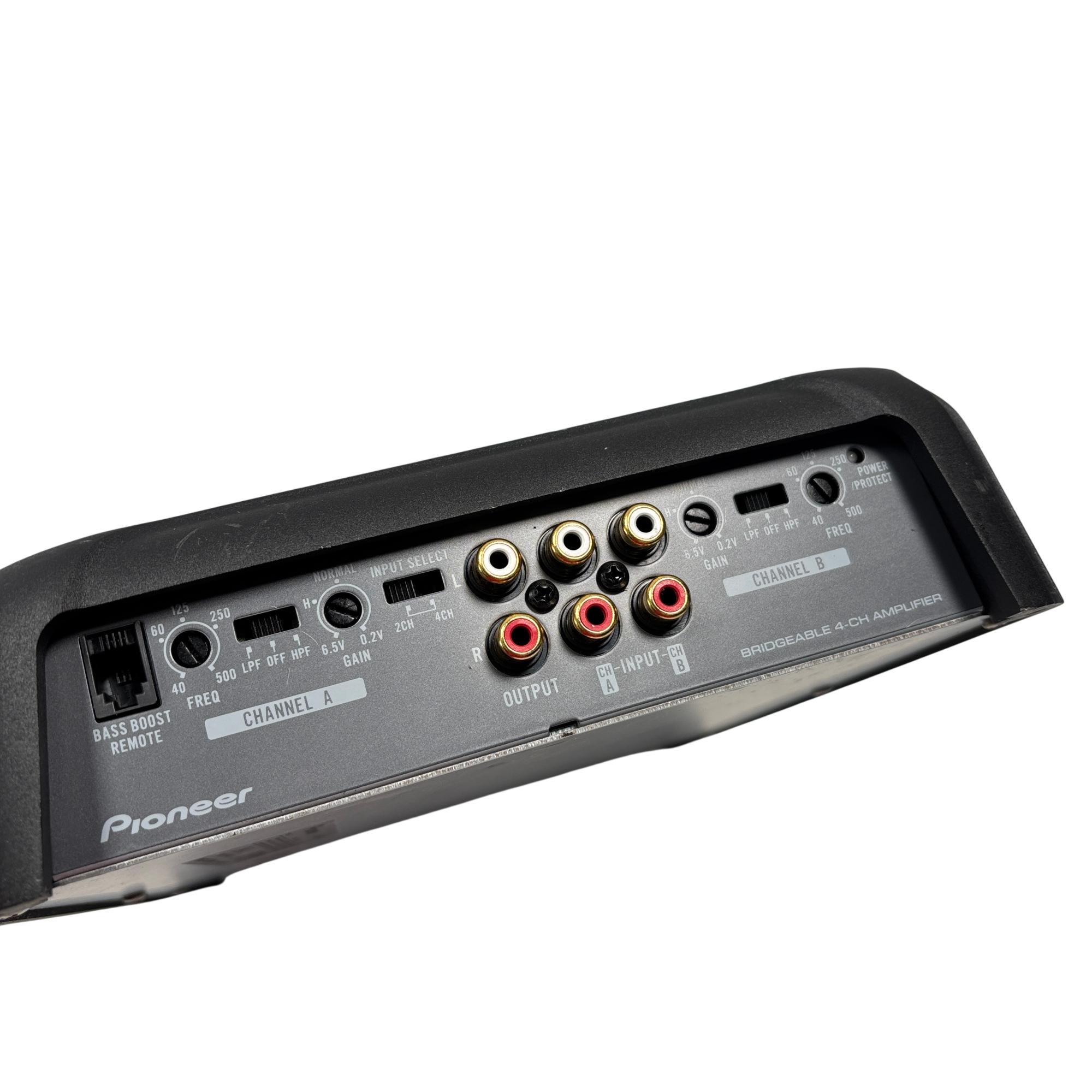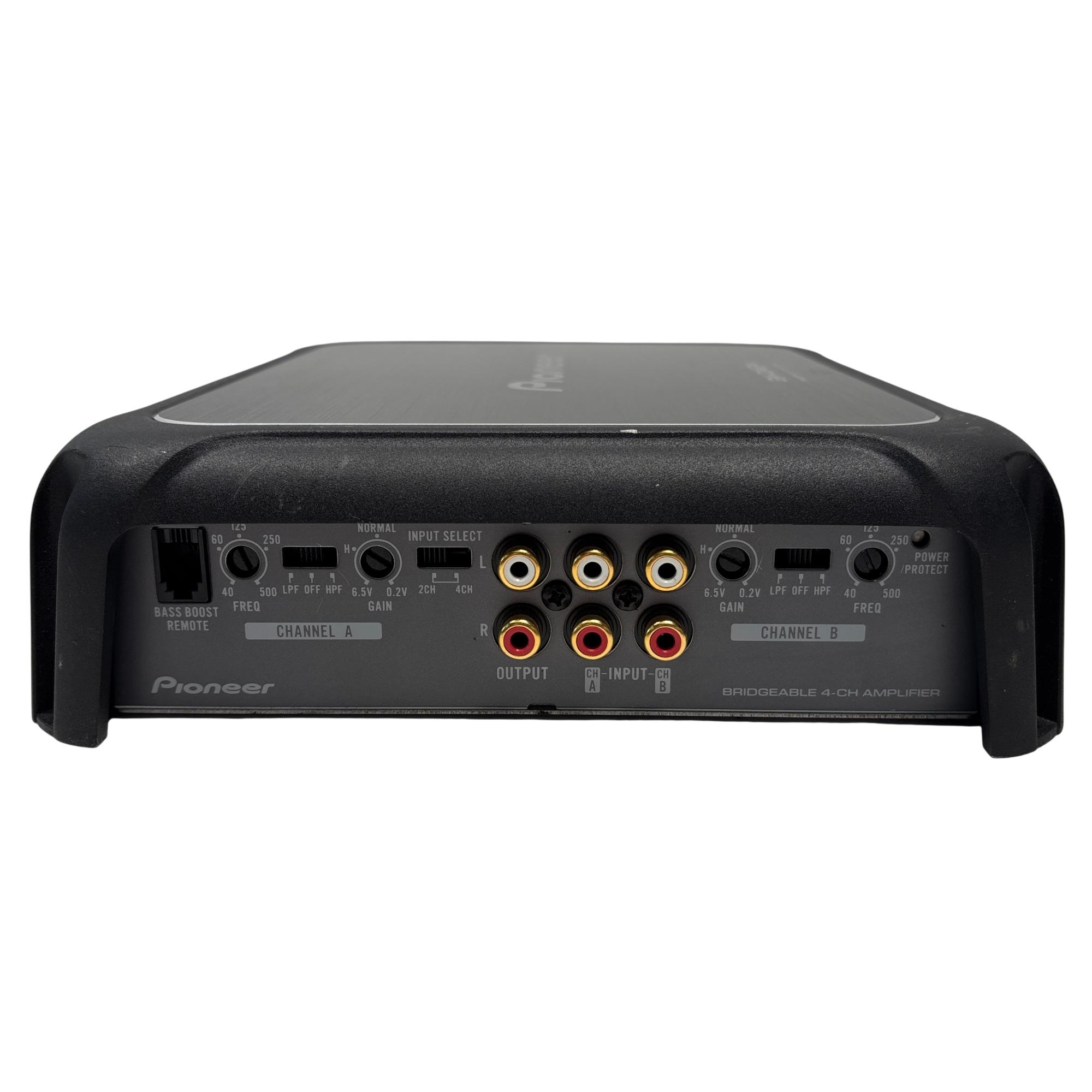The Pioneer GM-DX874 Bridgeable 4-Channel Car Amplifier delivers powerful and efficient audio performance with a sleek black design. This compact amplifier supports bridgeable channels and is engineered for high wattage output, making it ideal for enhancing car audio systems with clear and dynamic sound quality.