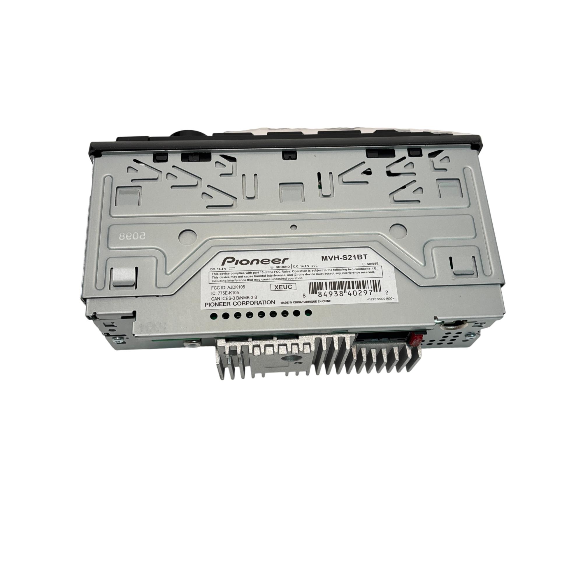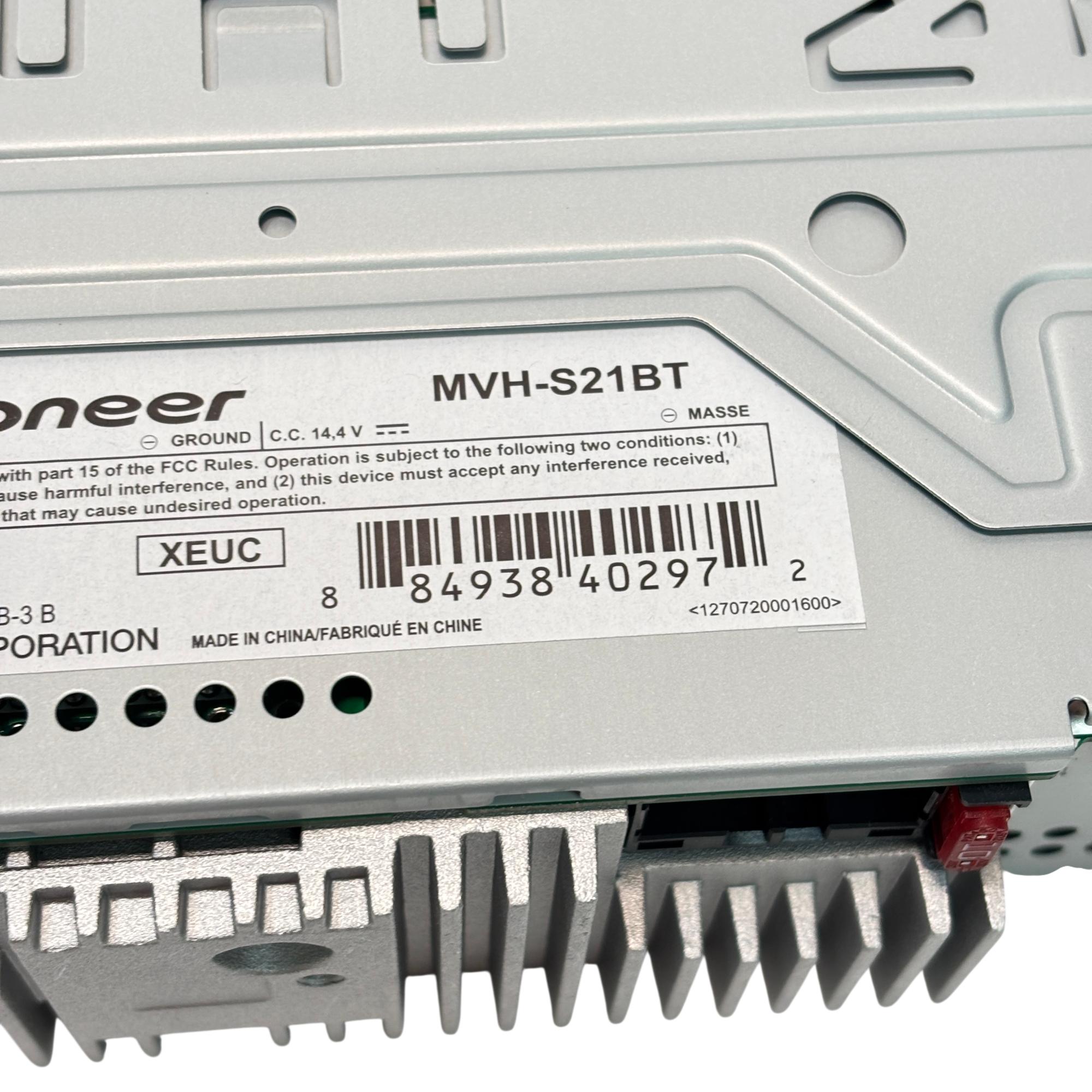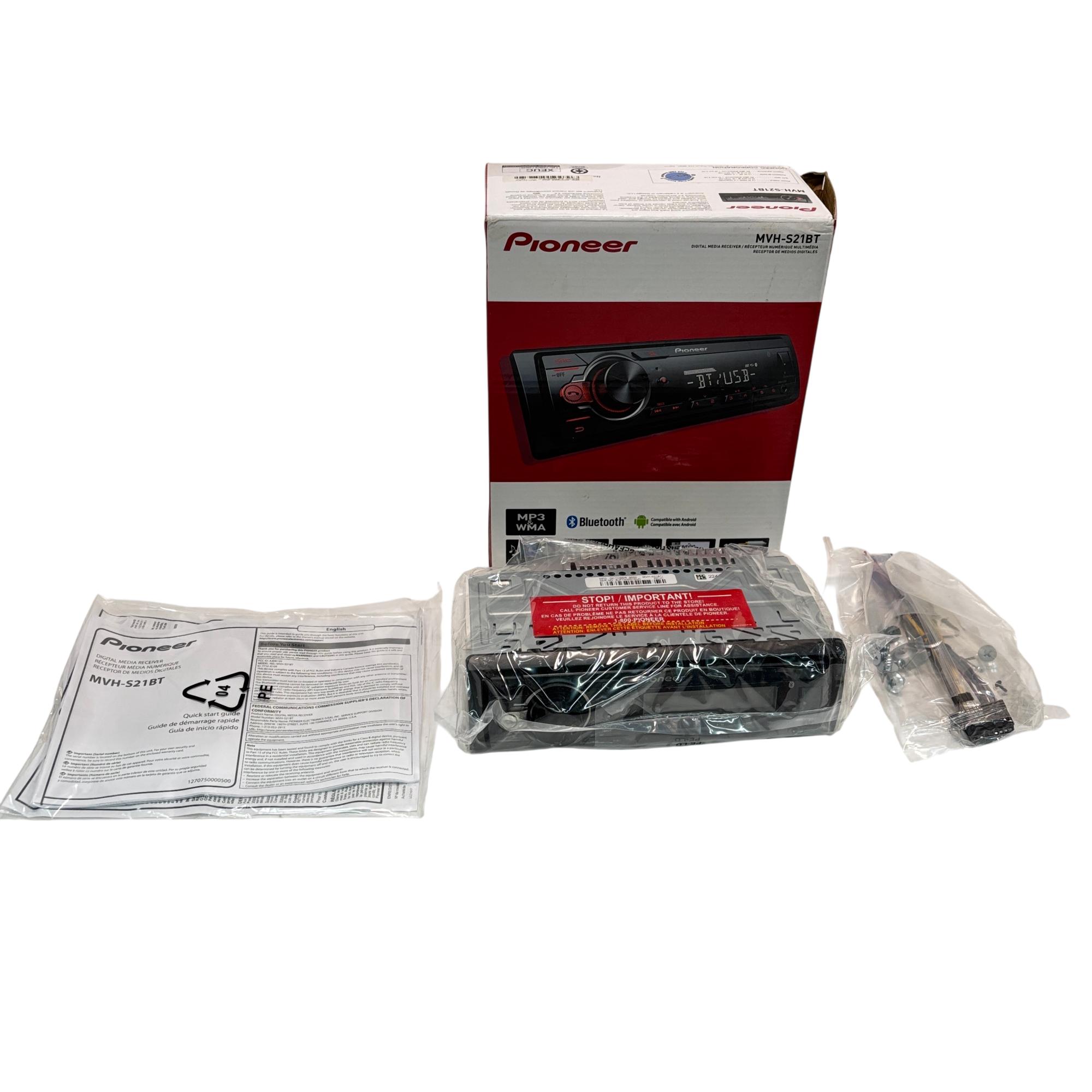 The Pioneer MVH-S21BT single-DIN digital media car audio receiver offers Bluetooth for hands-free calling and wireless audio streaming. It also supports music playback from Android devices or USB flash drives through the front USB port, while a built-in MOSFET amplifier delivers powerful sound with up to 50 watts per speaker for clear and dynamic audio on the road.